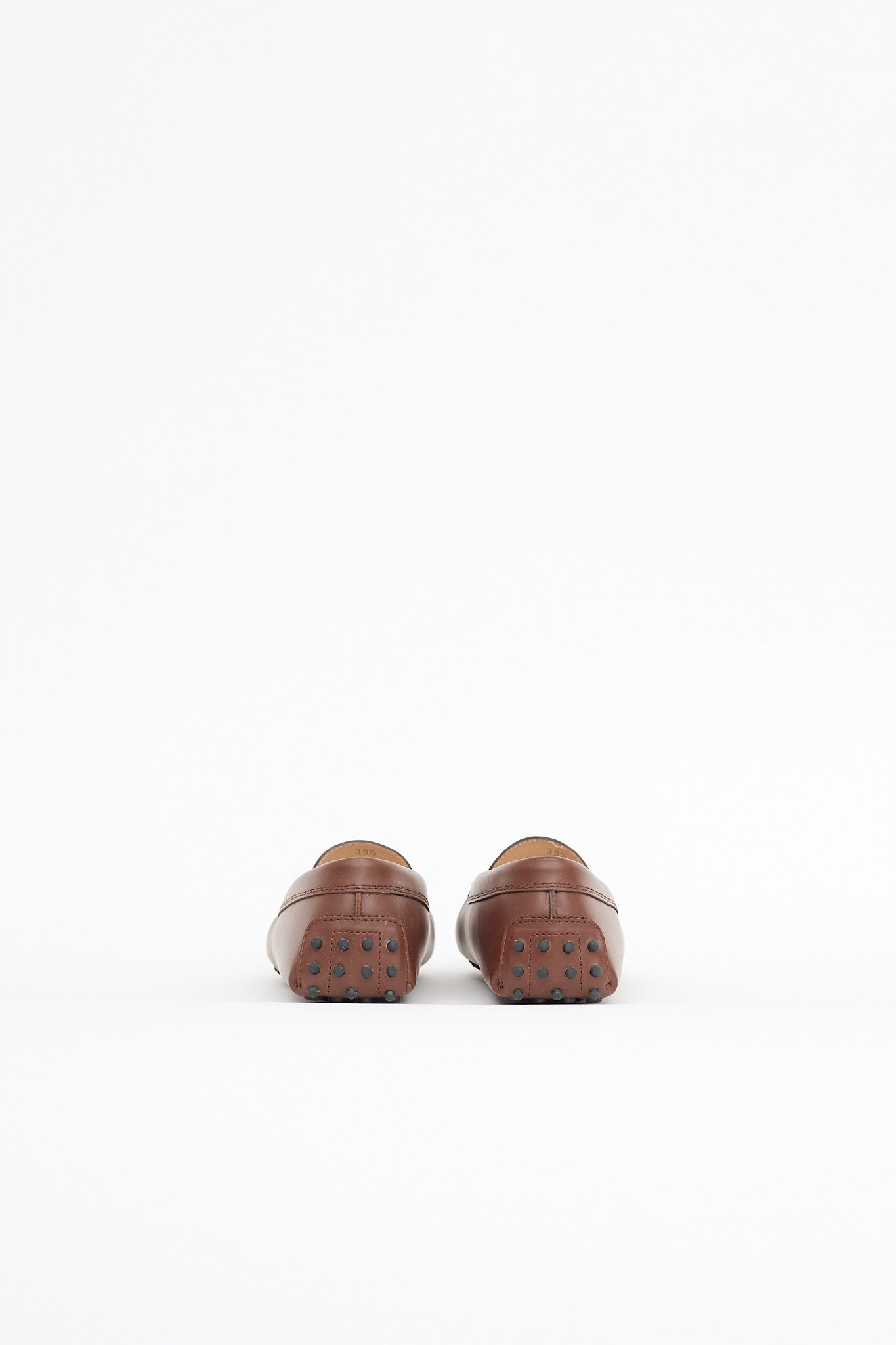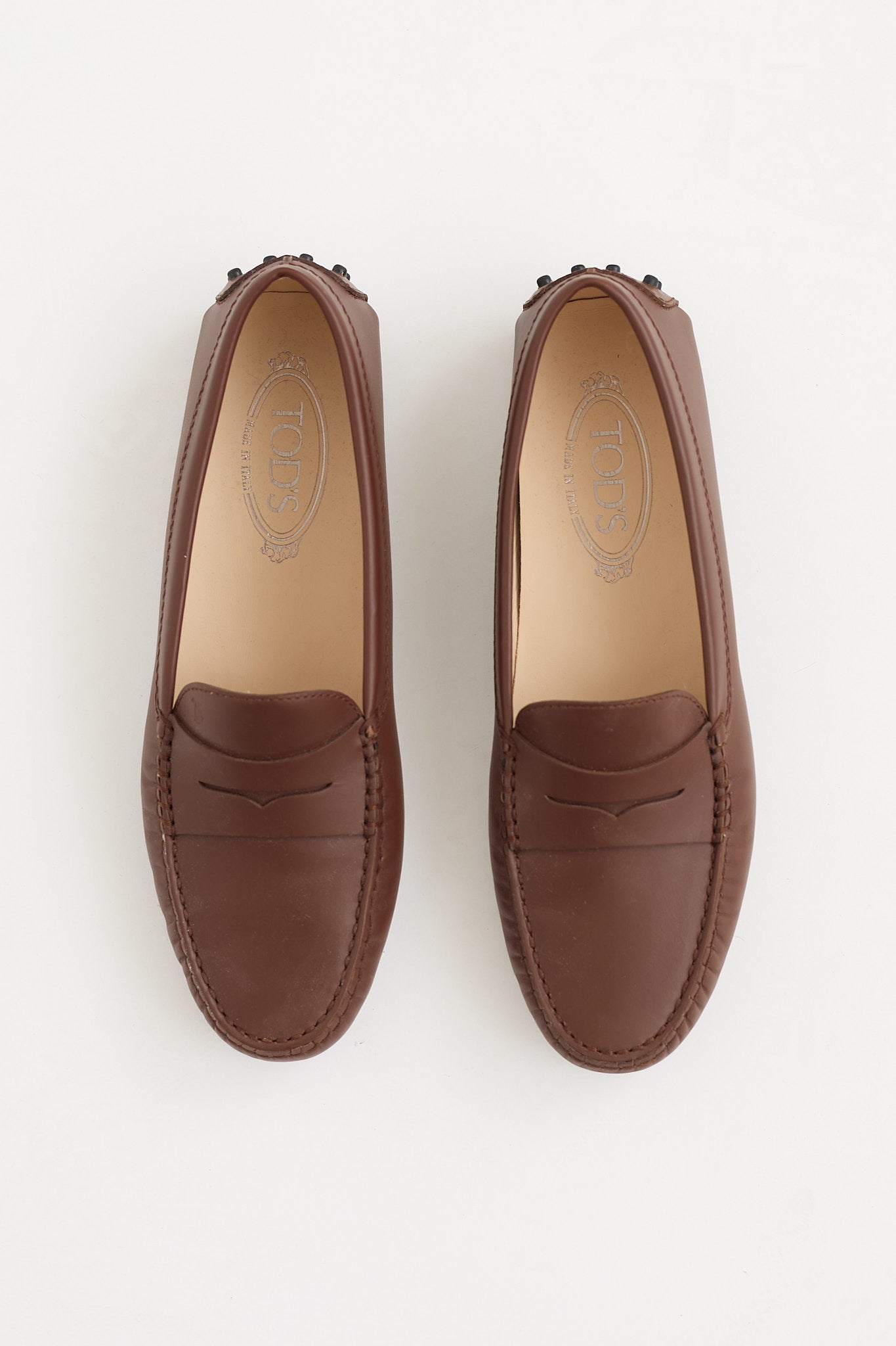 Pre-owned Tod's brown leather Driving loafers featuring round toe, loafer styling with strap detail on tongue and rubber treaded outsole.