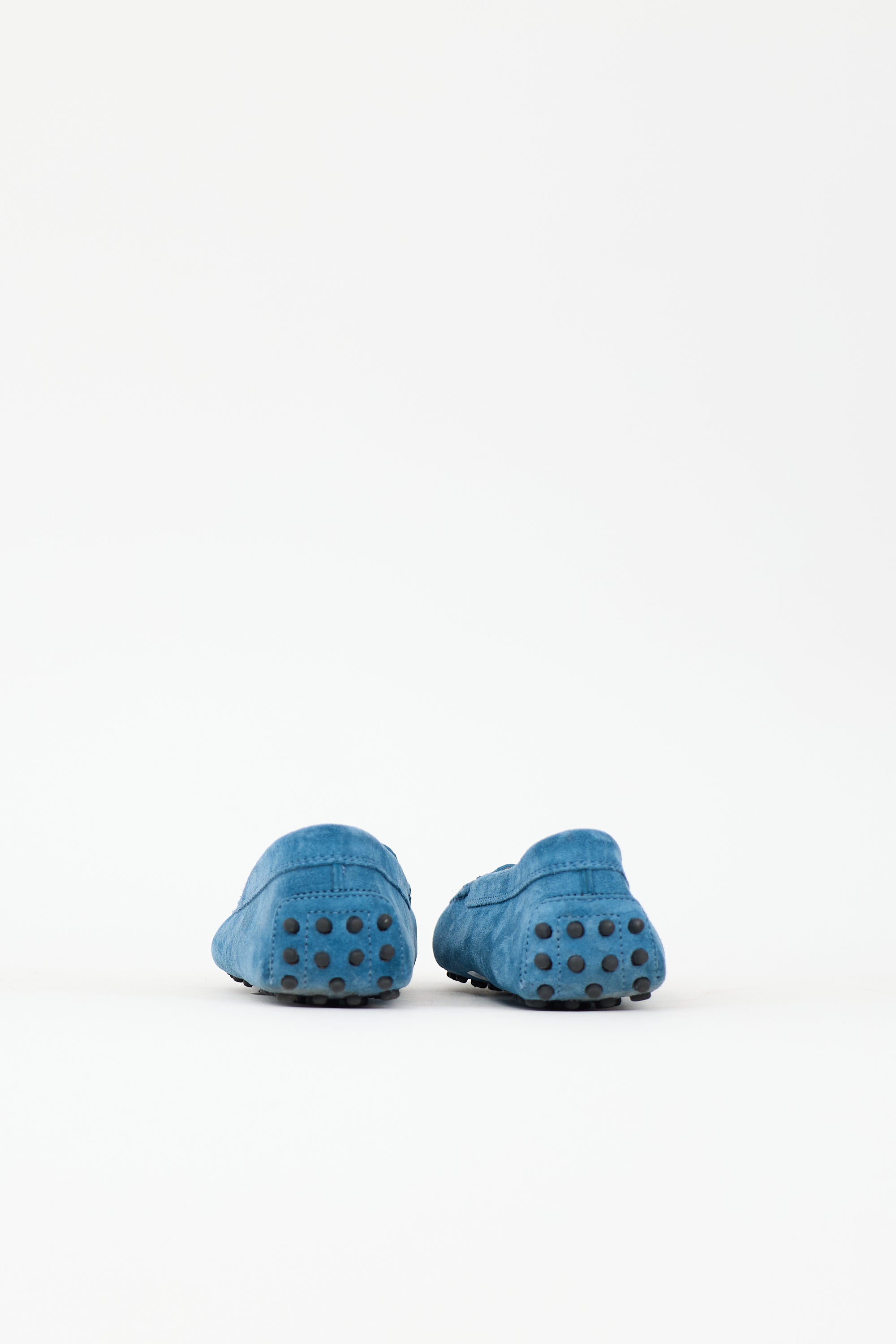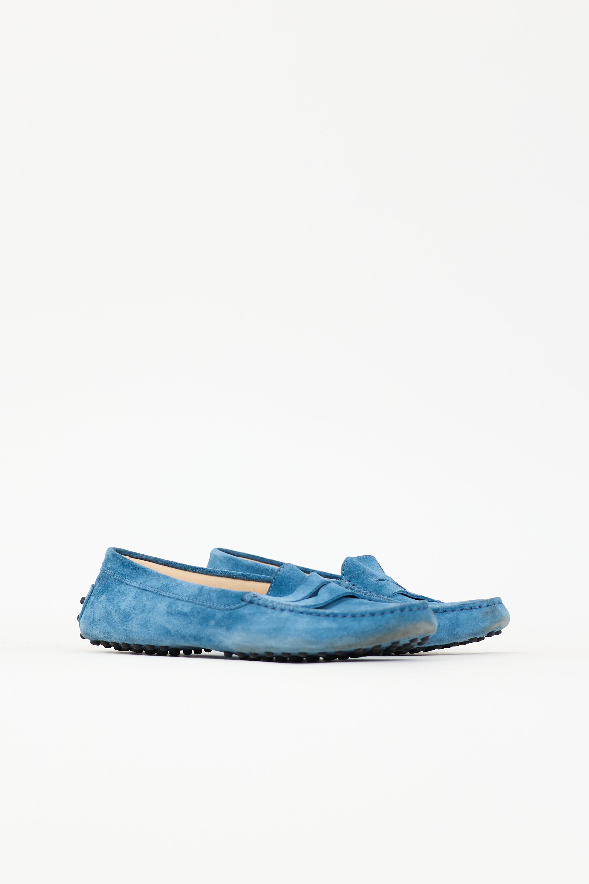 Pre-owned Tod's blue suede Gommino loafers featuring almond toe, slip on entry, and rubber dotted outsole.