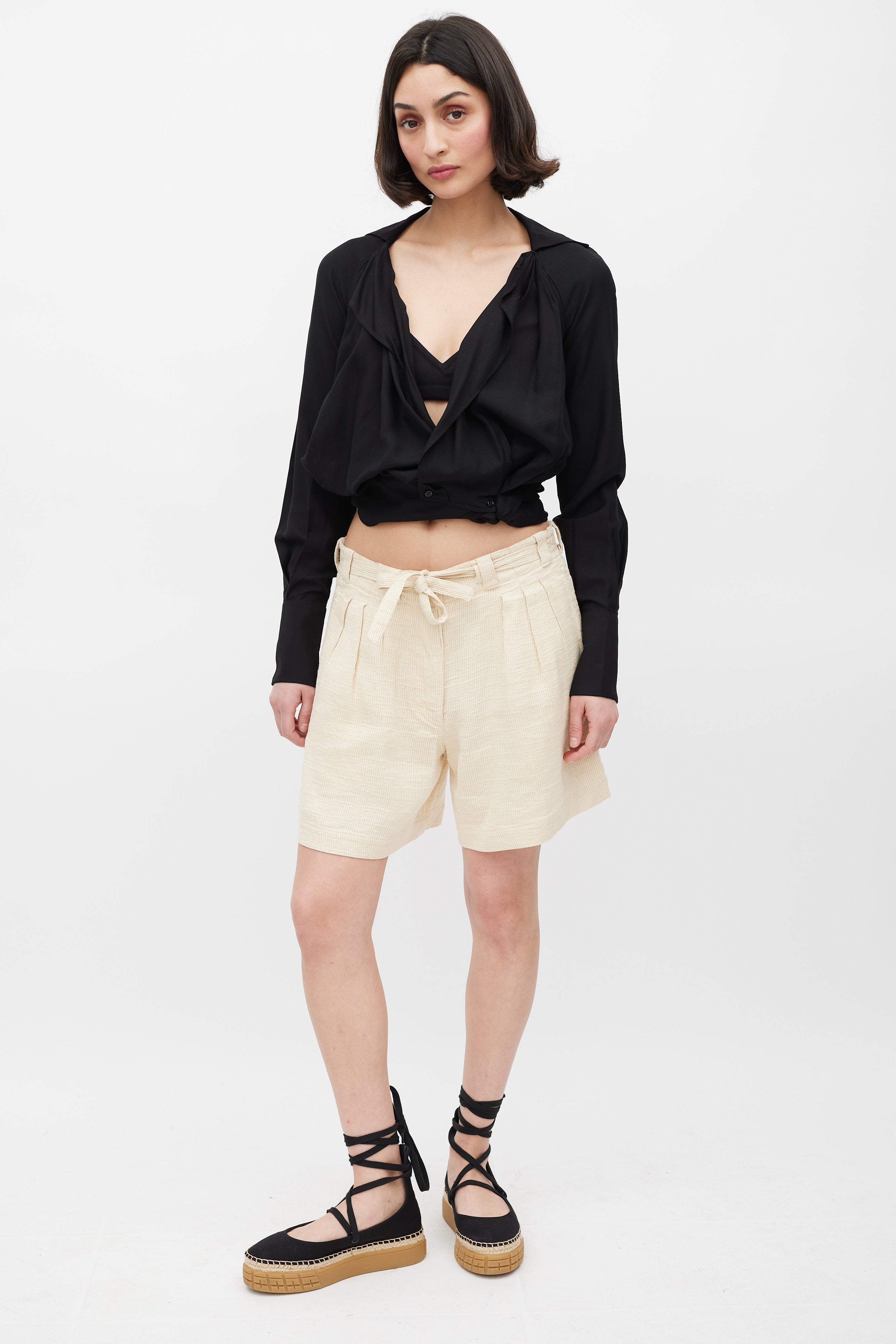 Pre-owned Dries Van Noten beige linen cotton, and silk blend shorts featuring a tie waist with pleating, in seam pockets, and concealed button front.
