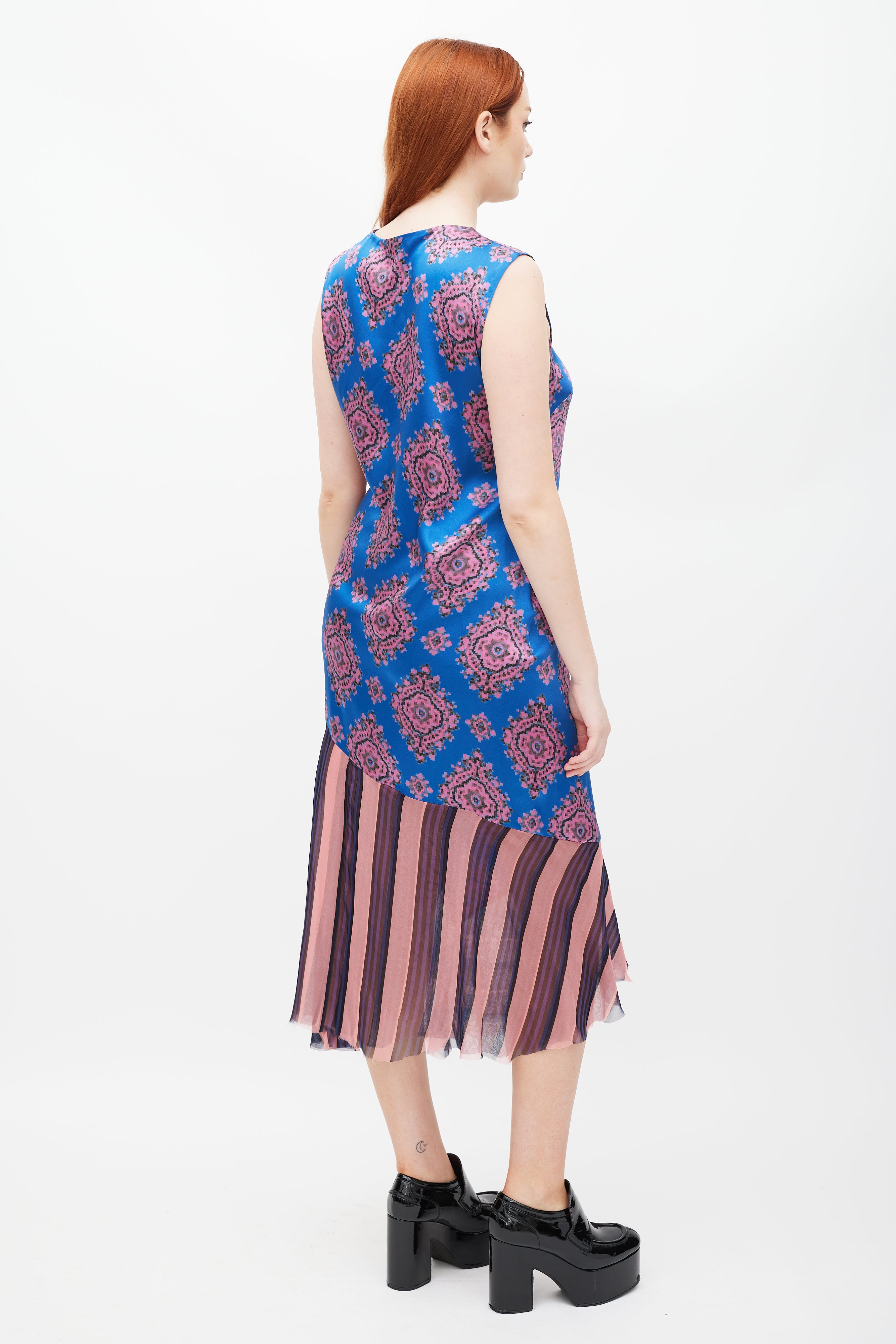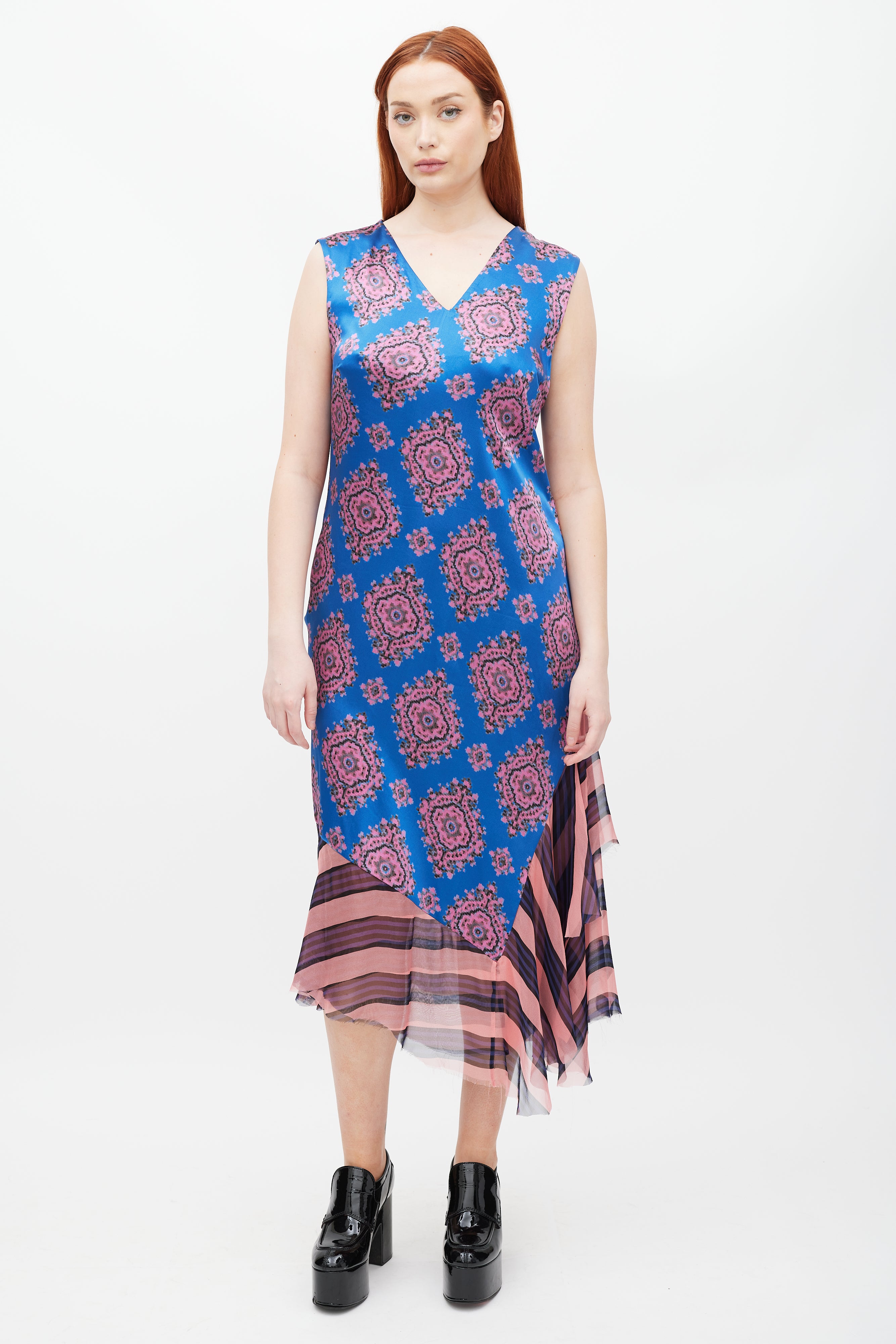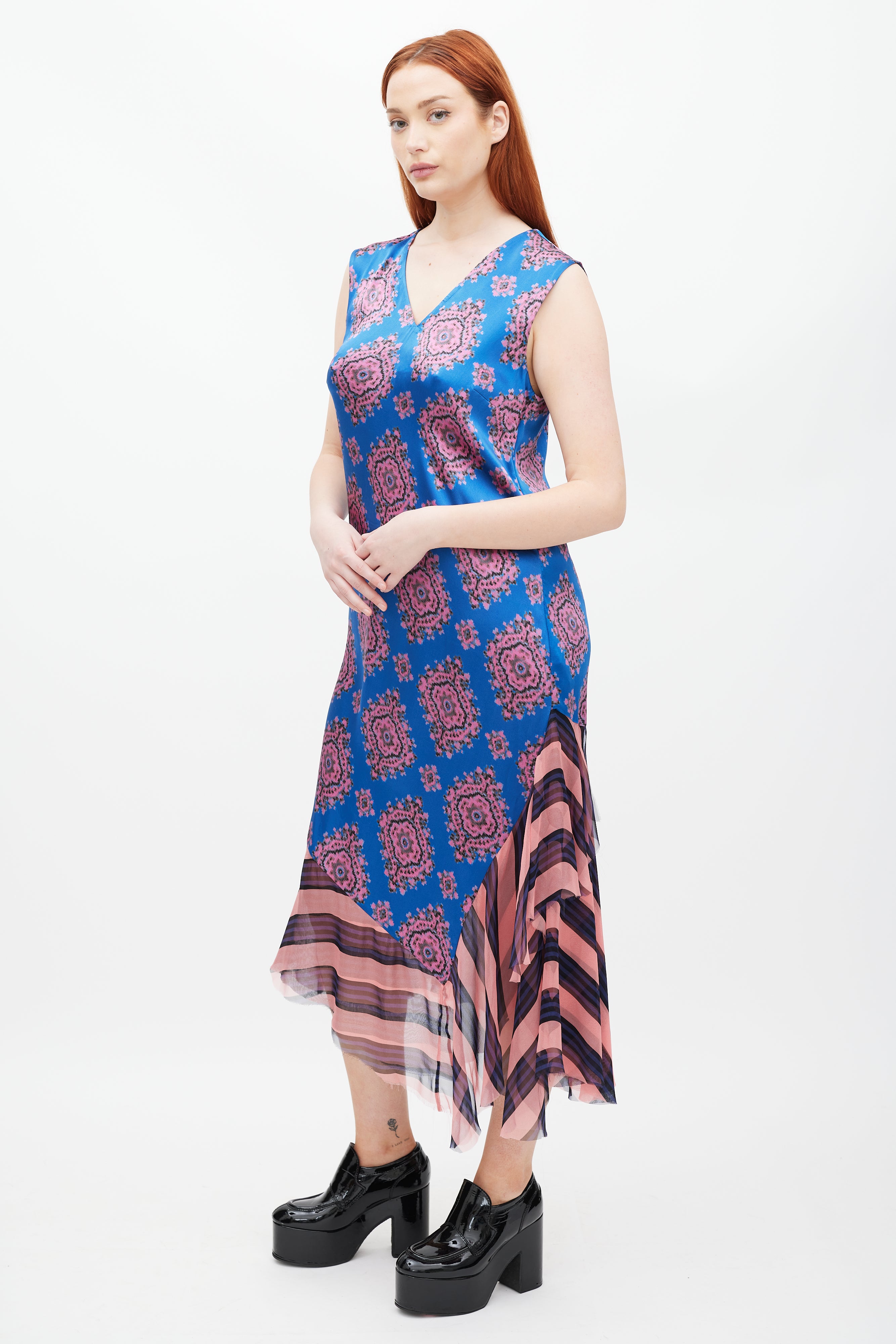 Pre-owned Dries Van Noten Spring/Summer 2015 blue silk dress featuring a pink pixelated paisley pattern throughout, V-neckline, sleeveless styling, darted bust, and layered striped pattern at hem.