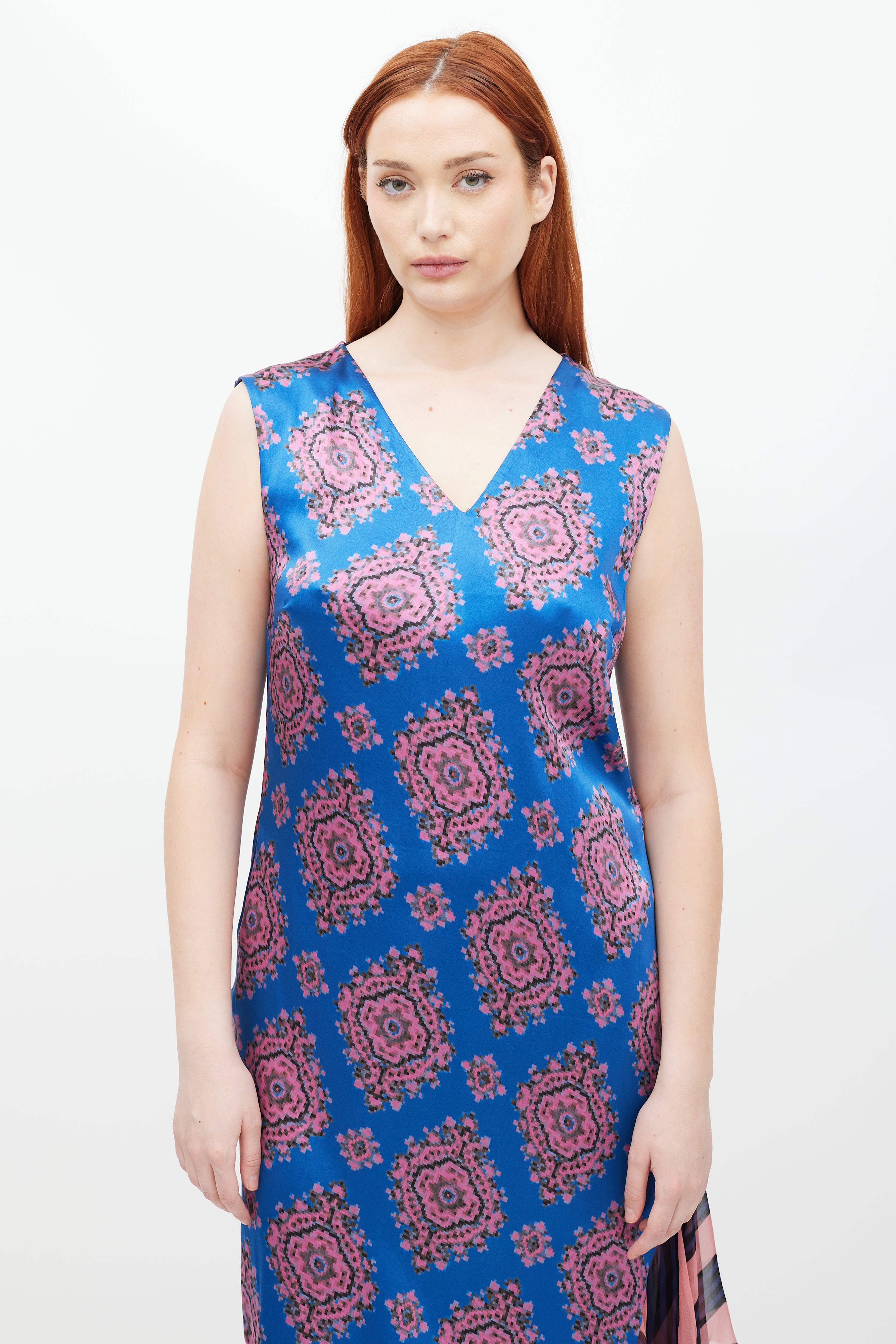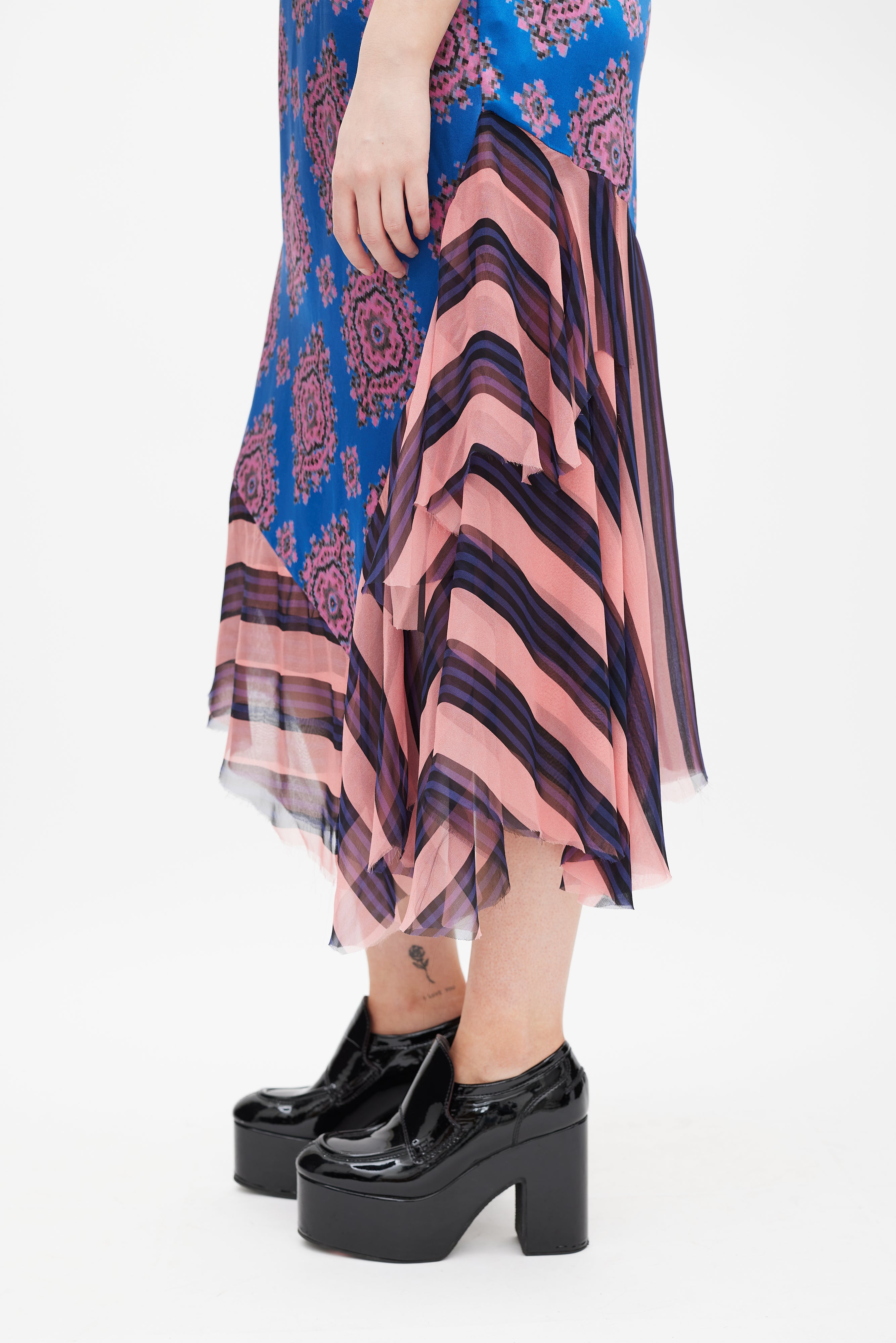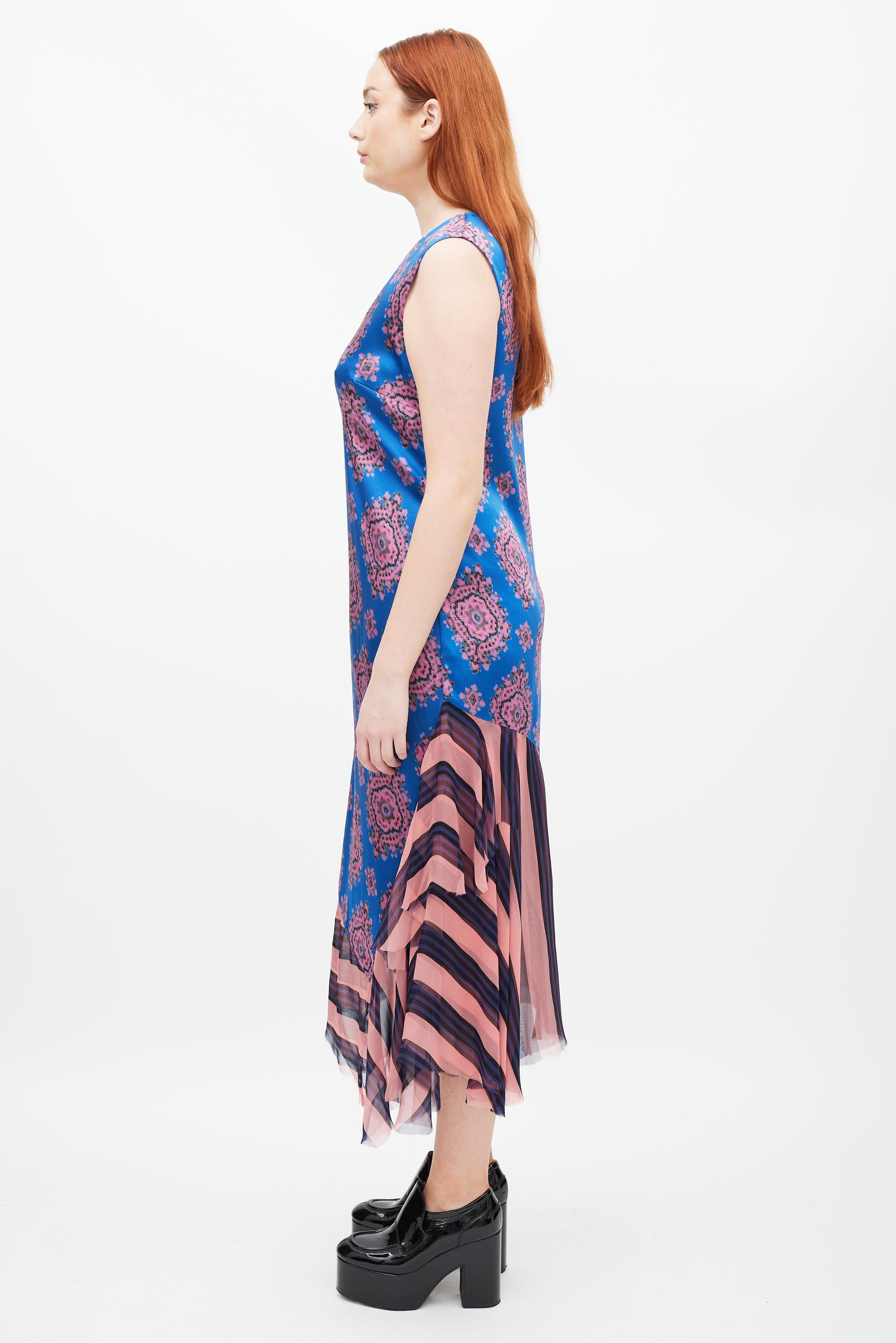 Pre-owned Dries Van Noten Spring/Summer 2015 blue silk dress featuring a pink pixelated paisley pattern throughout, V-neckline, sleeveless styling, darted bust, and layered striped pattern at hem.