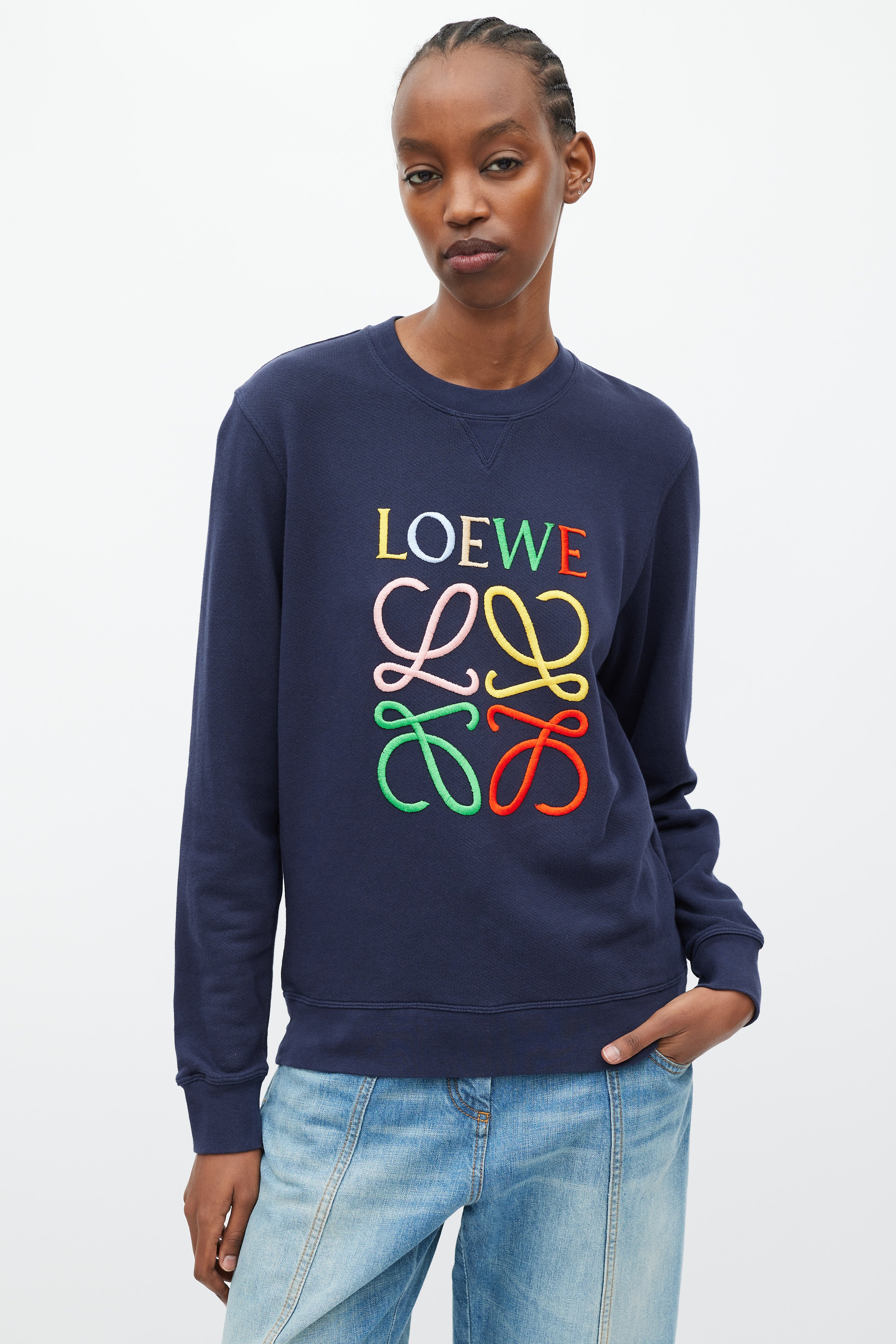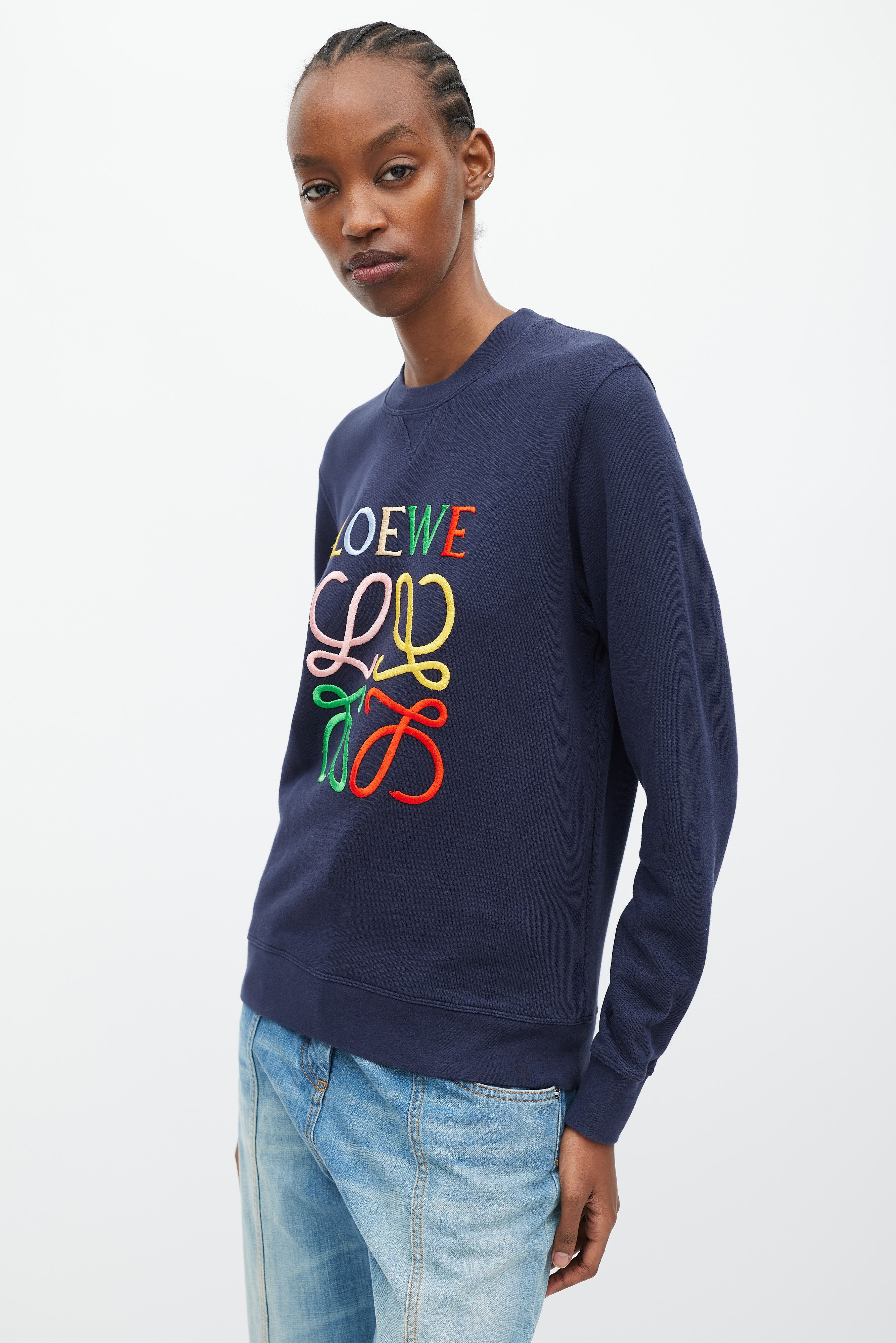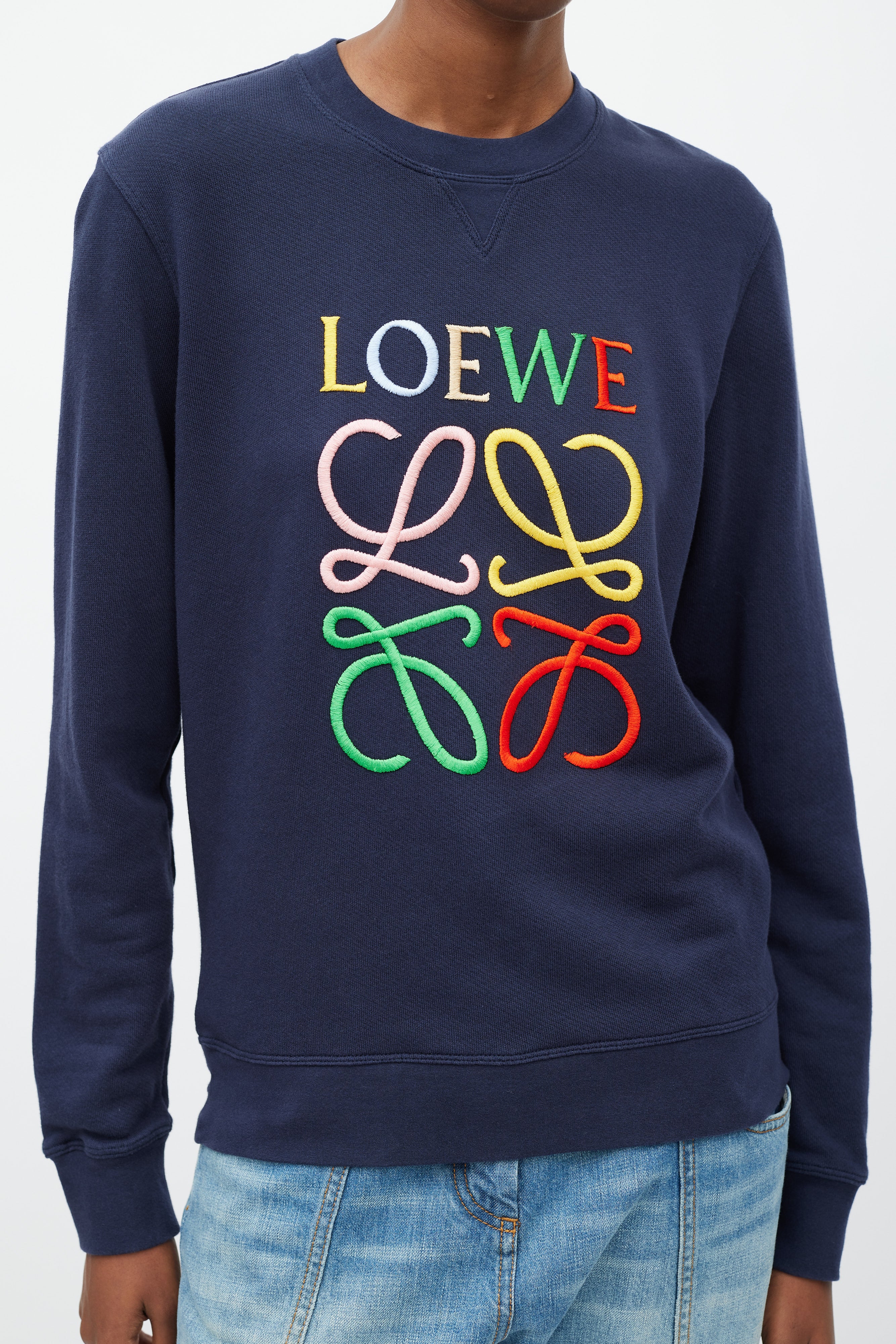 Pre-owned Loewe navy crewneck sweatshirt featuring a multicoloured embroidered Anagram logo on front, elastic cuffs, hem and collar and V-stitch on front collar.