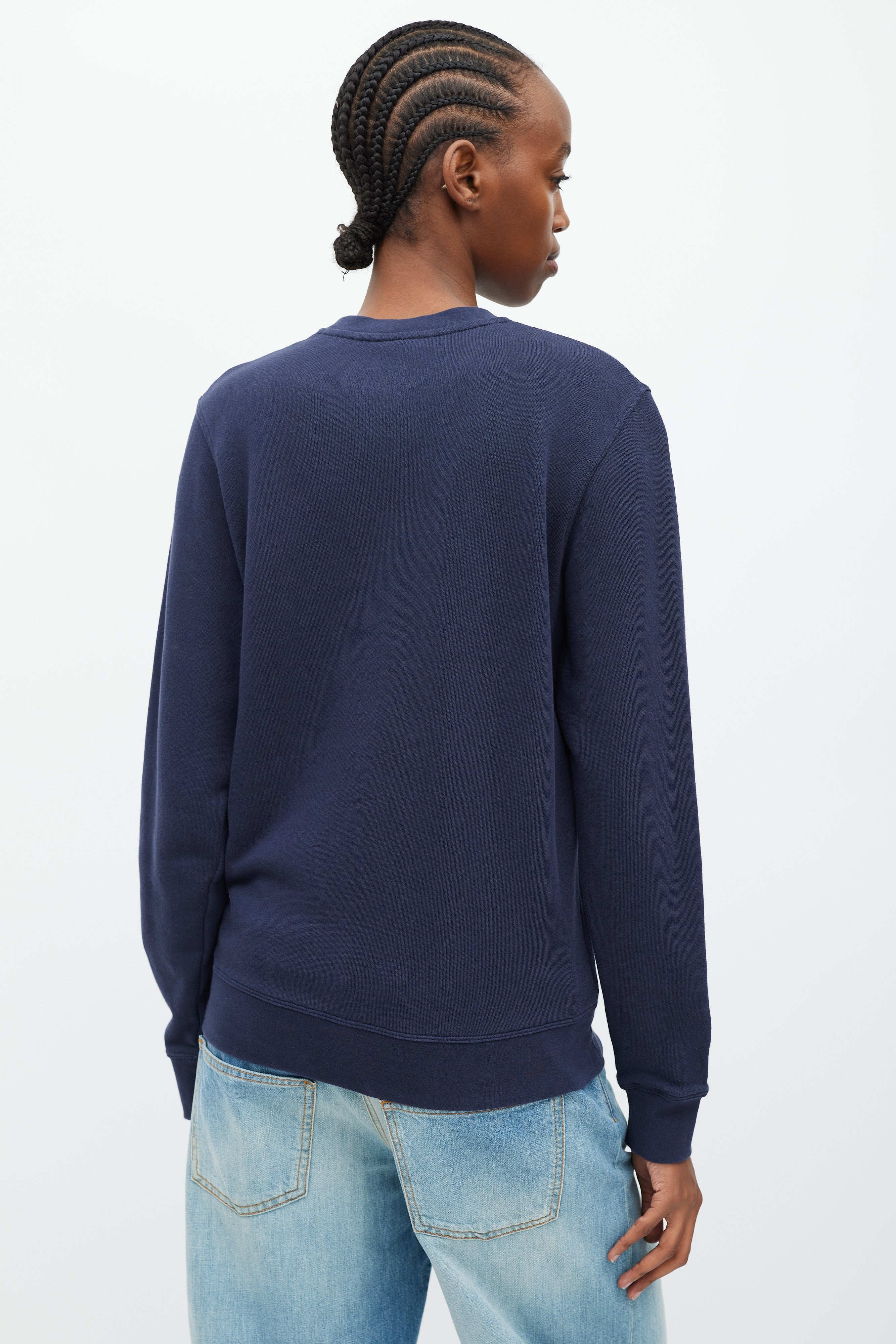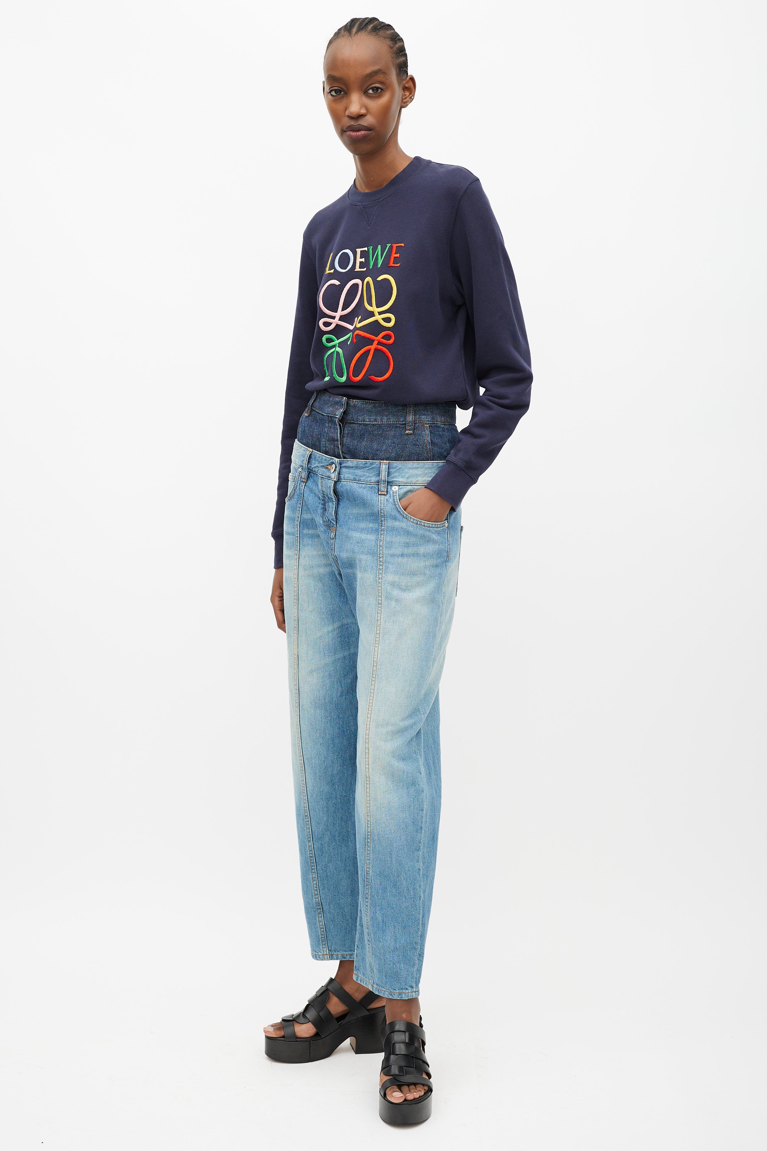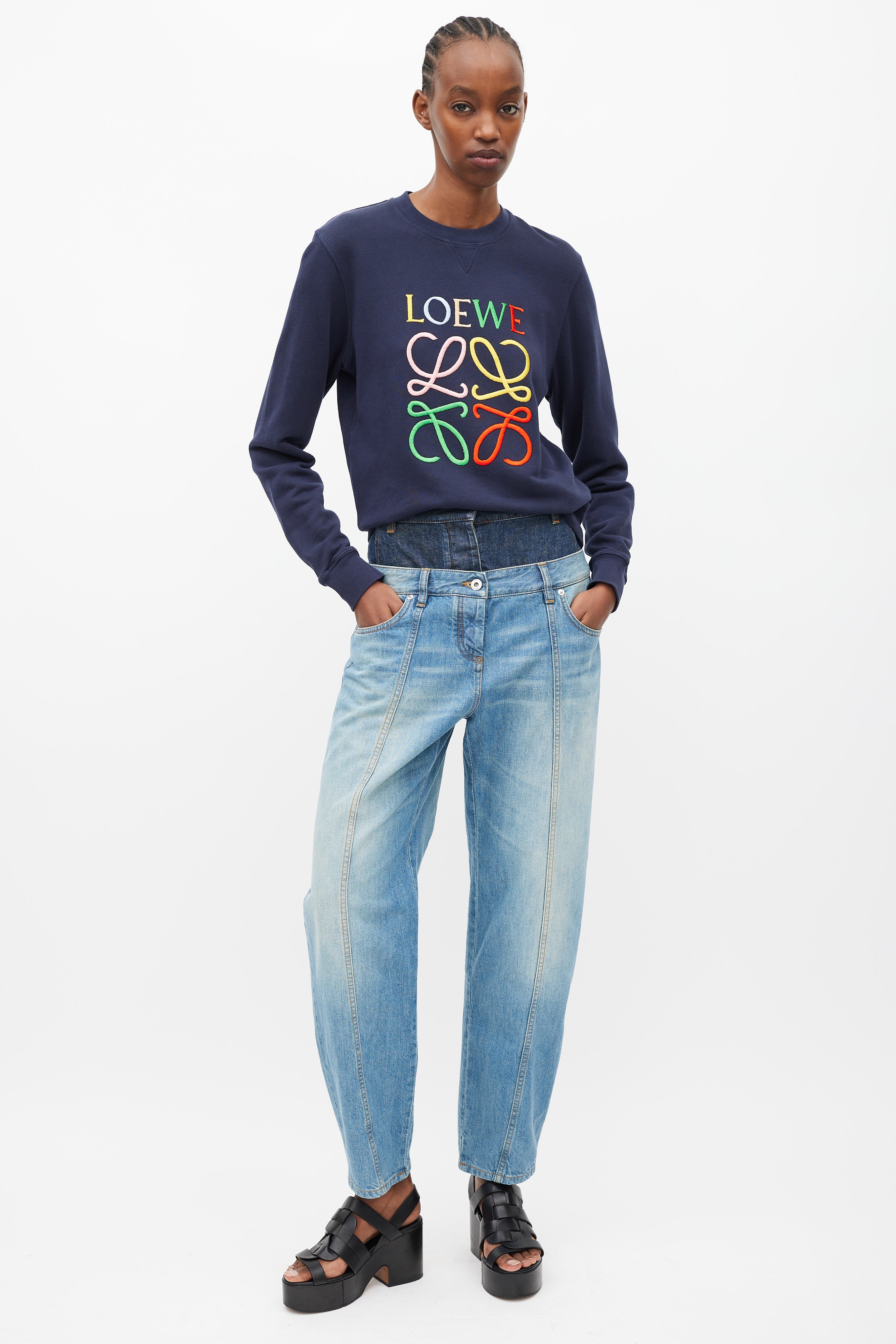 Pre-owned Loewe navy crewneck sweatshirt featuring a multicoloured embroidered Anagram logo on front, elastic cuffs, hem and collar and V-stitch on front collar.