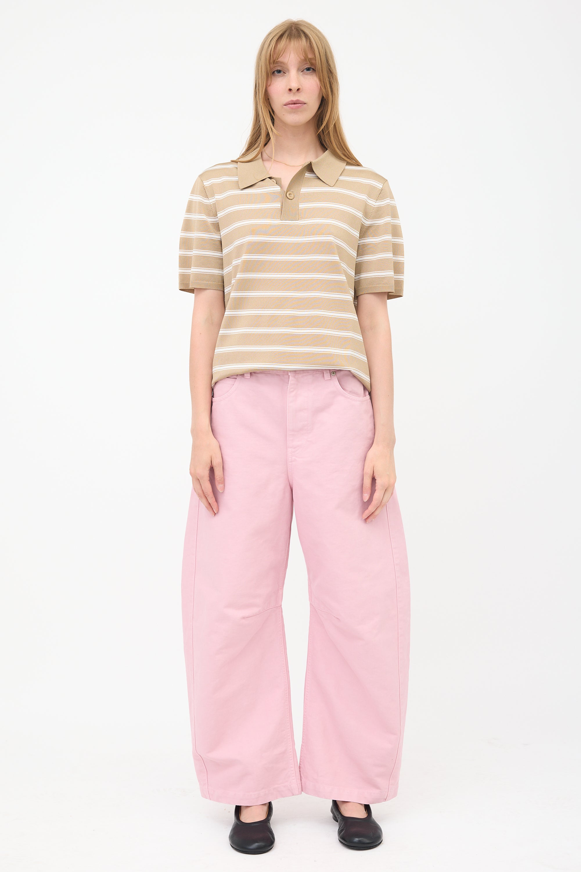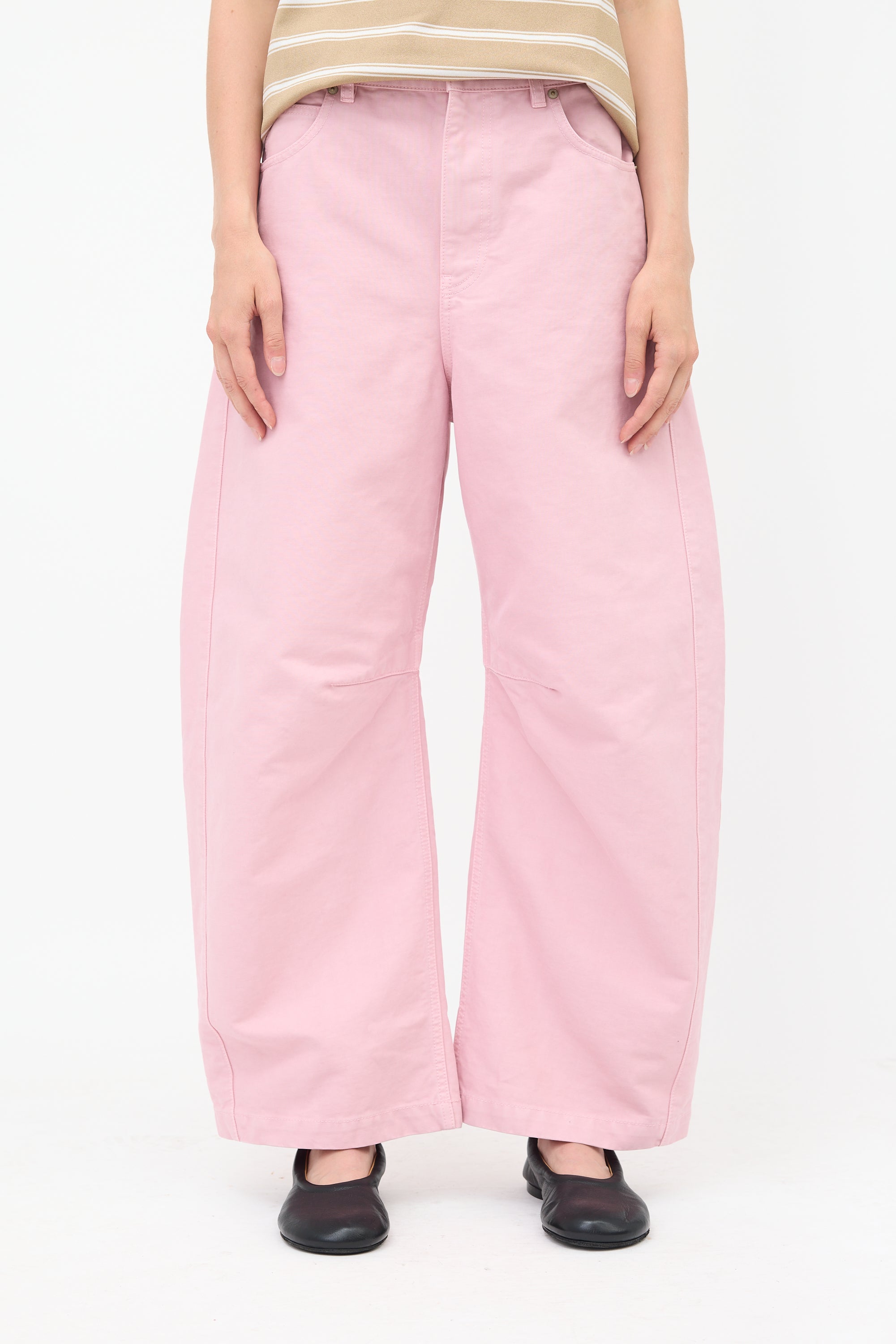 Pre-owned Loewe pink Barrel Trouser featuring a high rise, five pocket styling, black Jacron, zip fly with button fastening, and barrel leg. Clipped to fit model.