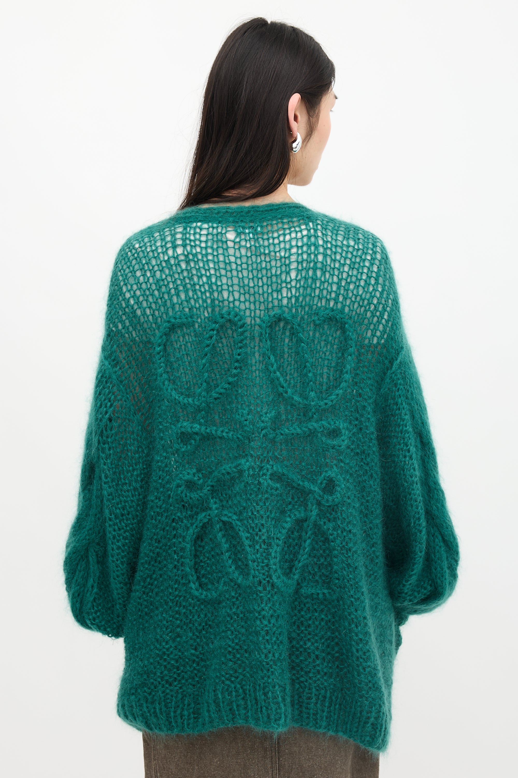Pre-owned Loewe green mohair blend oversized cardigan featuring a V-neckline, button front, two patch pockets with L intarsia, embroidered Anagram at back, balloon sleeves with ribbed cuffs, and a ribbed hem.