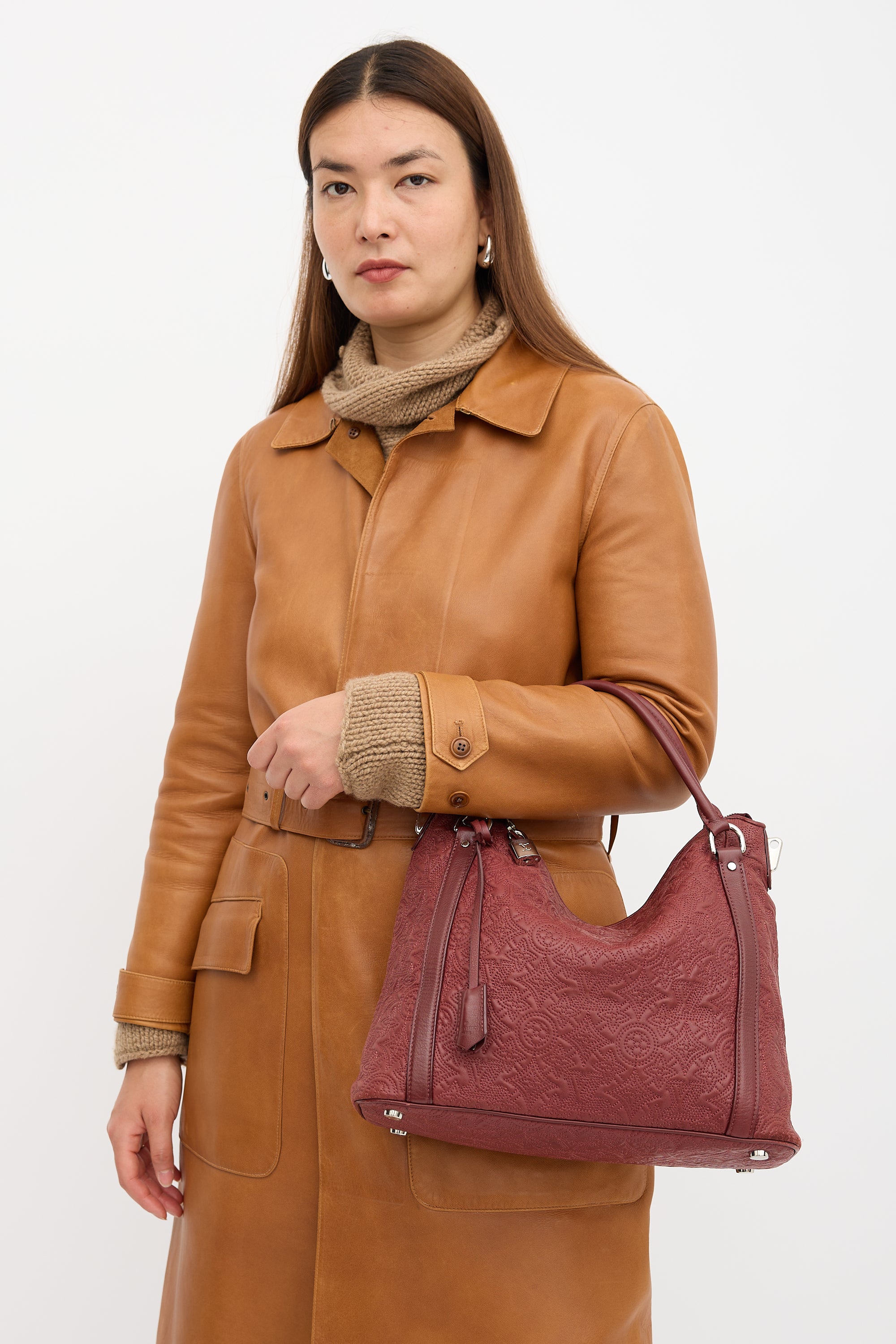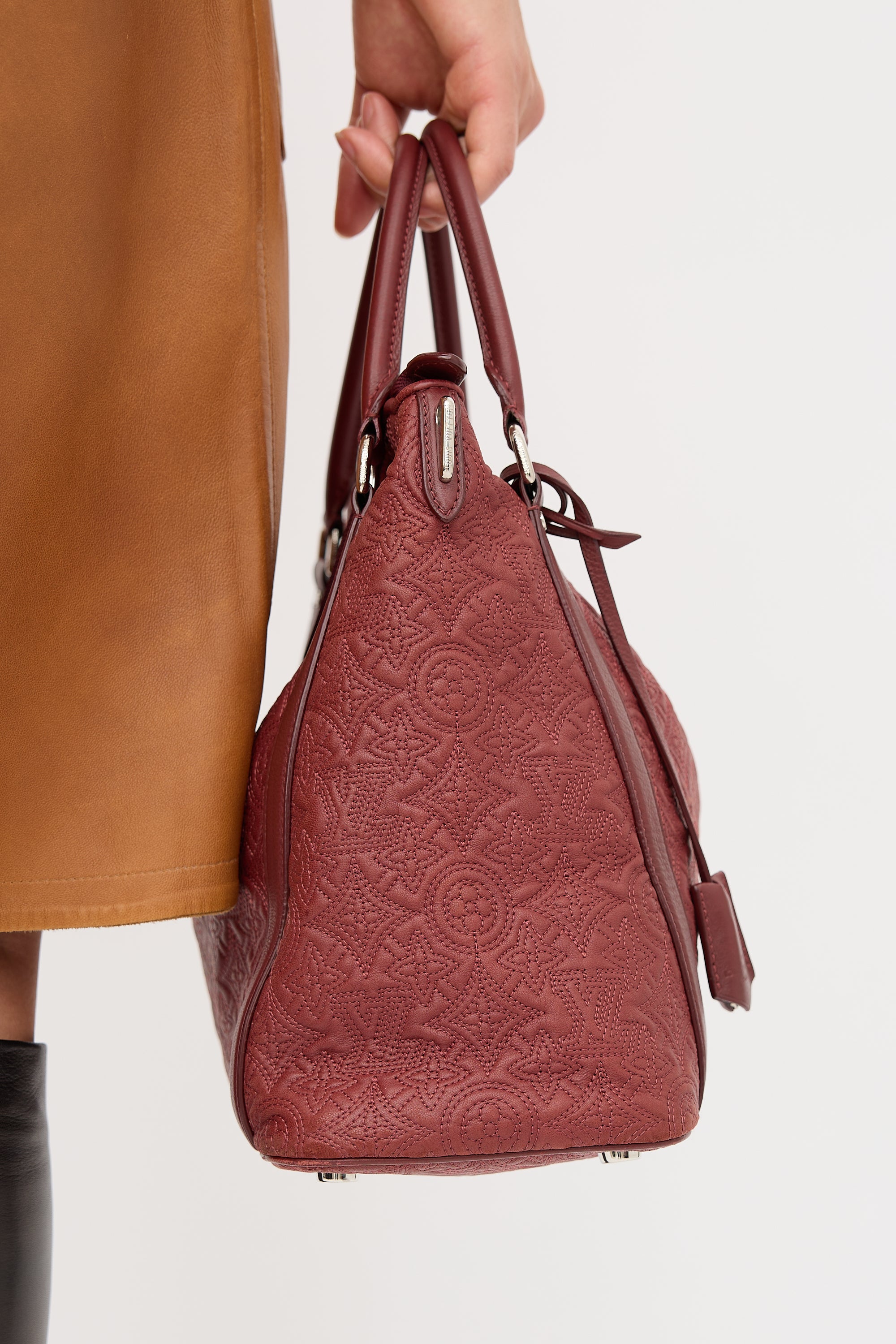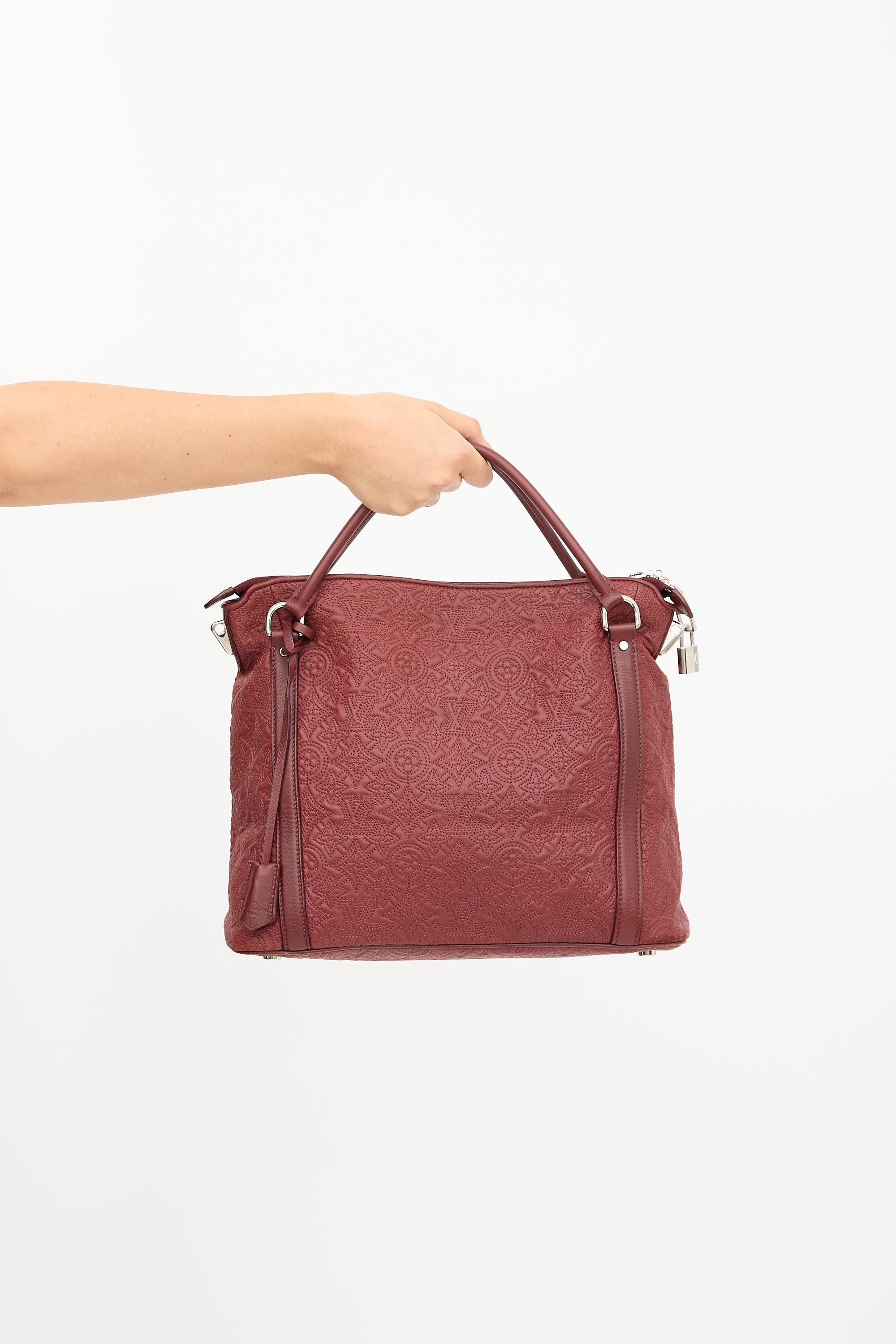 Pre-owned Louis Vuitton 2011 red Antheia Ixia PM shoulder bag featuring tonal embroidered monogram, silver tone hardware, four feet, dual rolled top handles, removable shoulder strap, top double zip closure, padlock charm, removable key and clochette, and one suede lined main compartment with one zip pocket and two slip pockets. Comes with original dust bag.