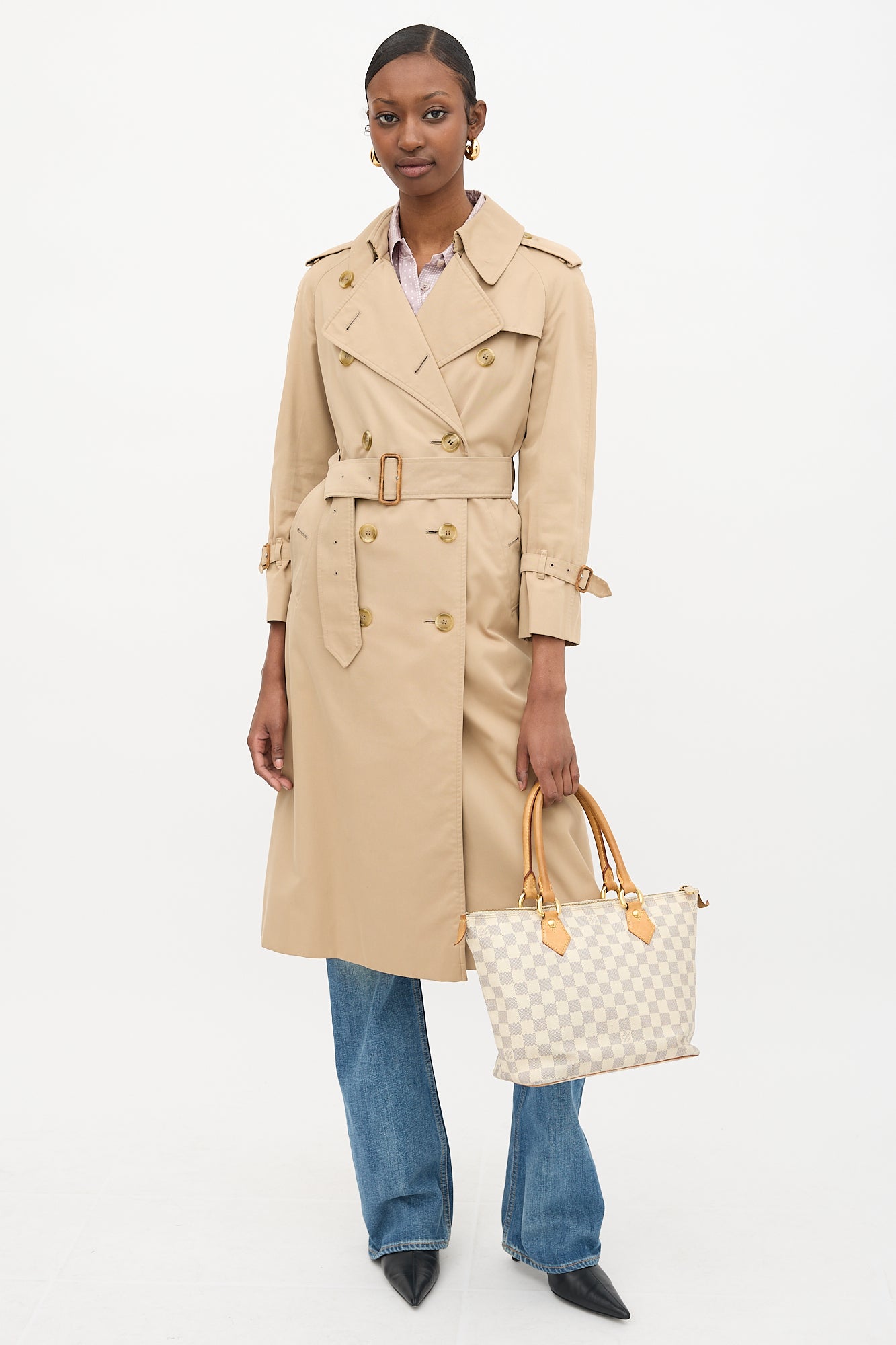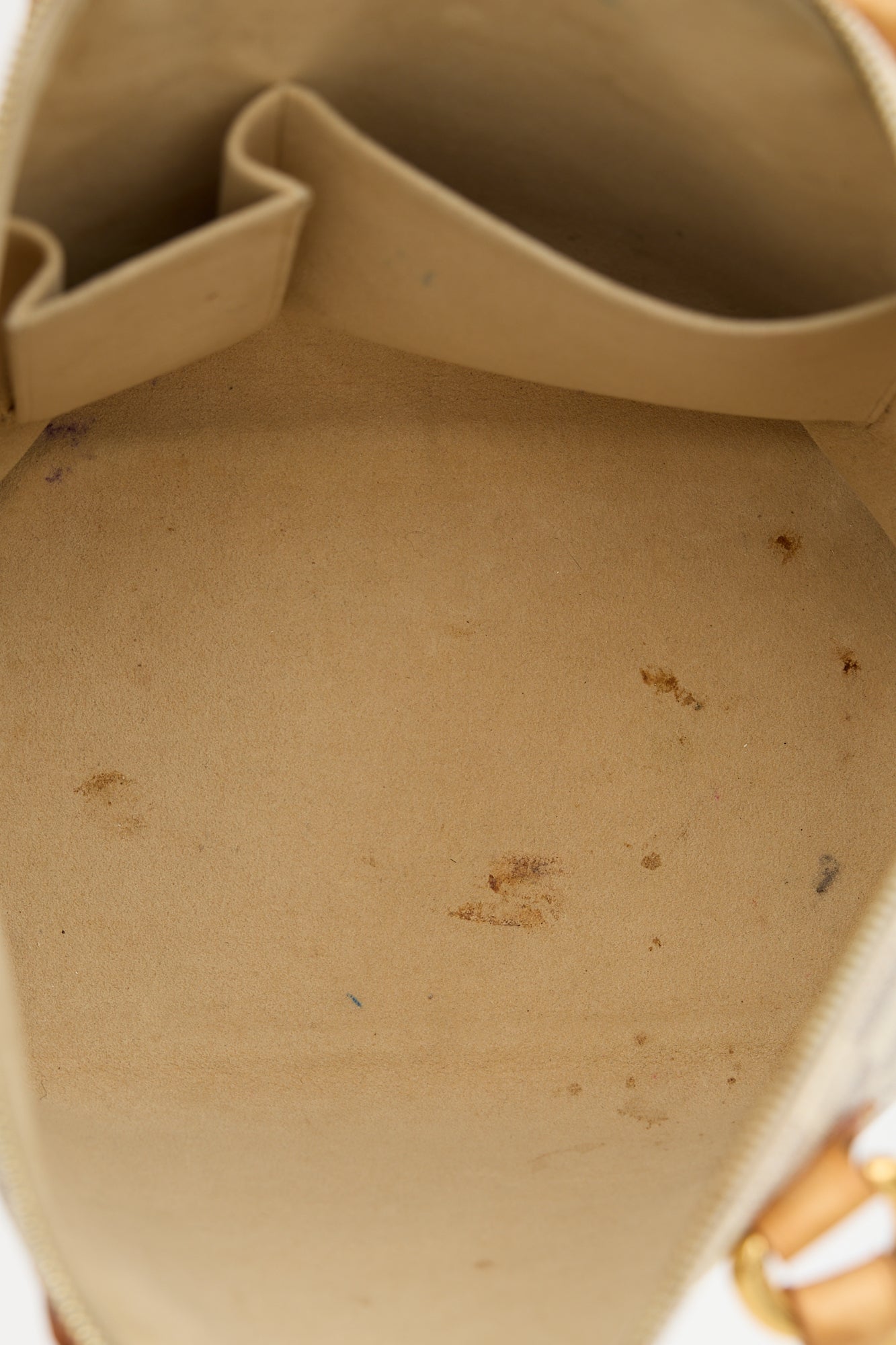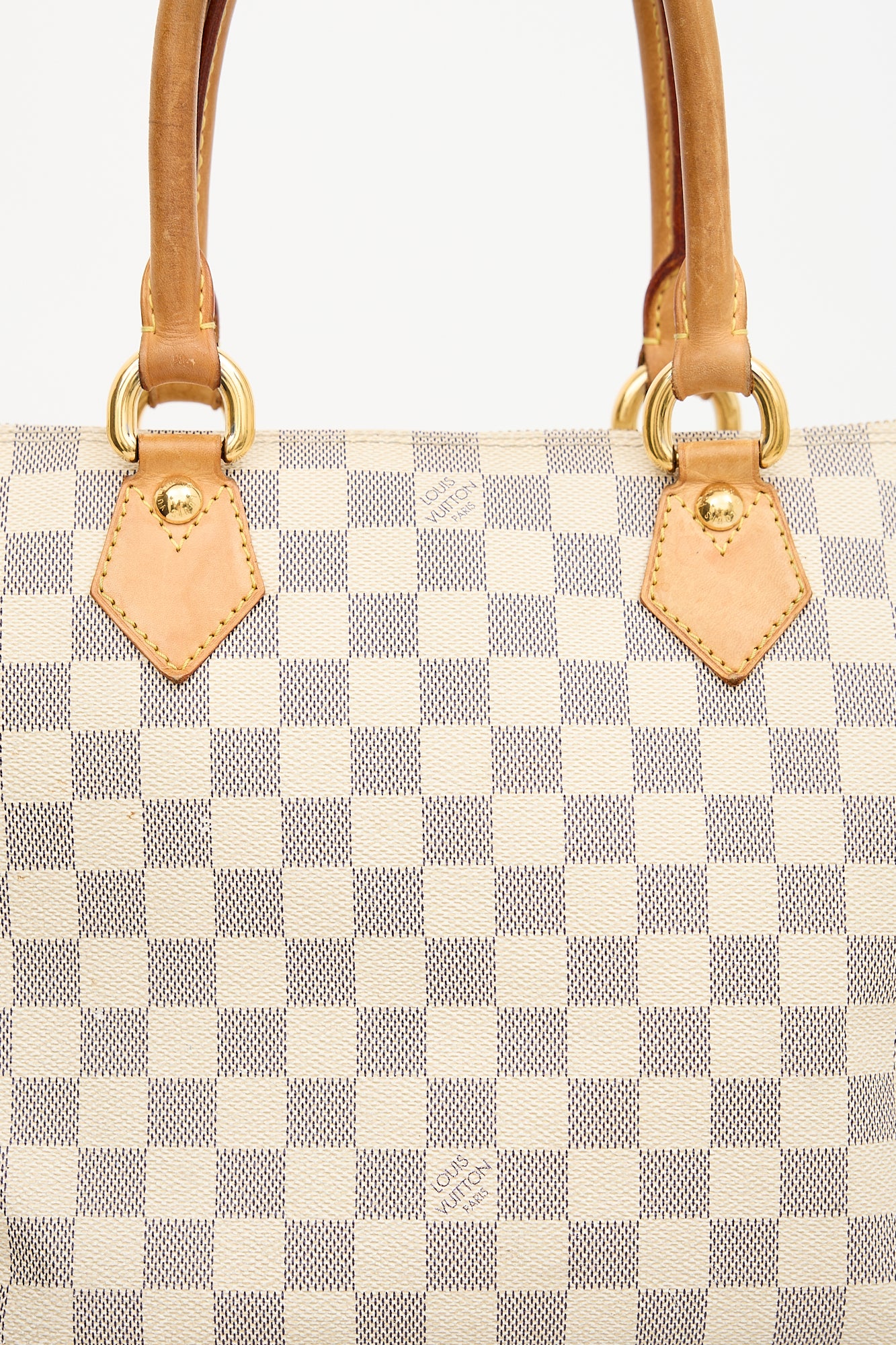Pre-owned Louis Vuitton cream Selaya bag featuring signature Damier Azur coated canvas, Vachetta leather trim, gold tone hardware, dual rolled top handles, top zip closure, and one lined main compartment with two slip pockets.