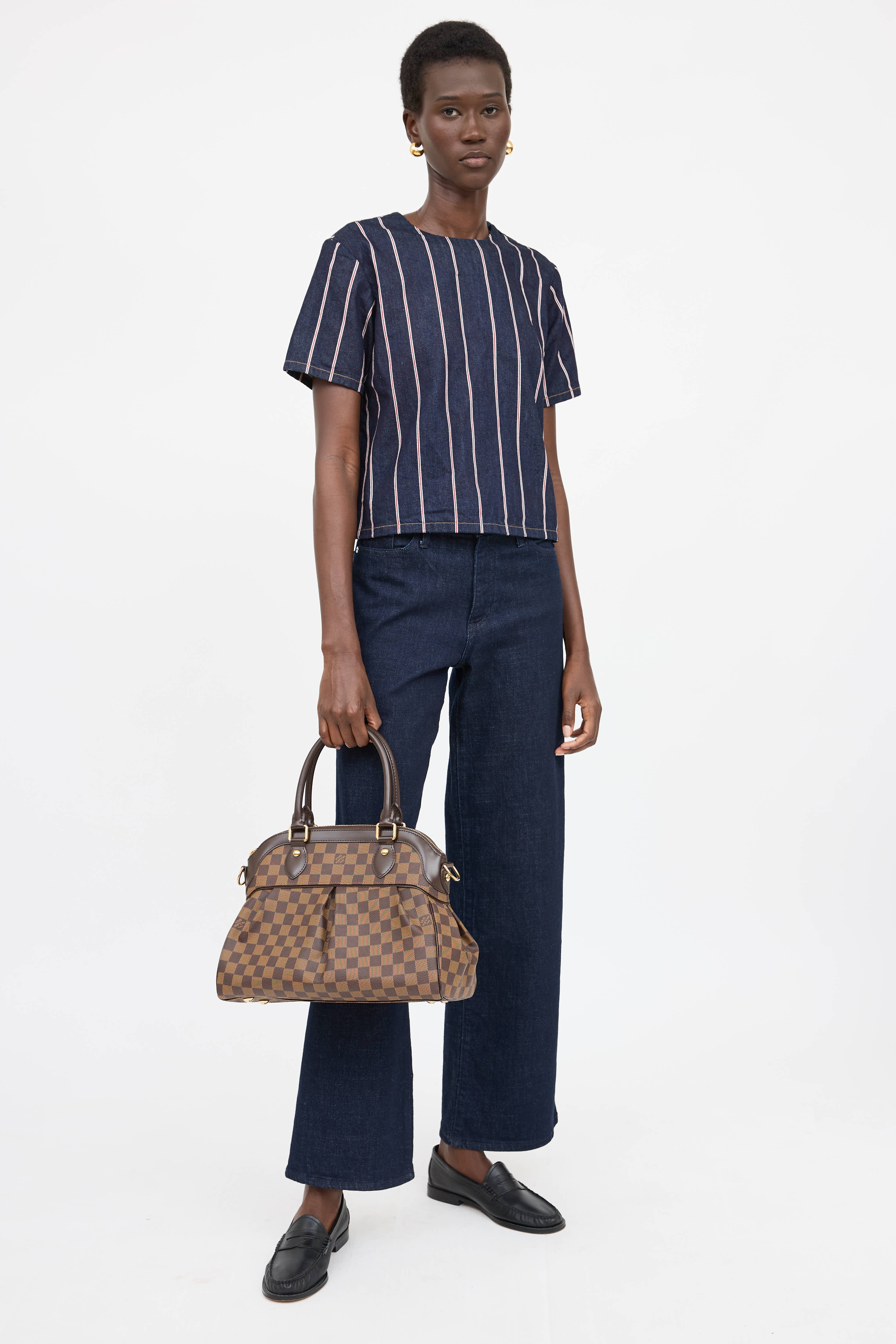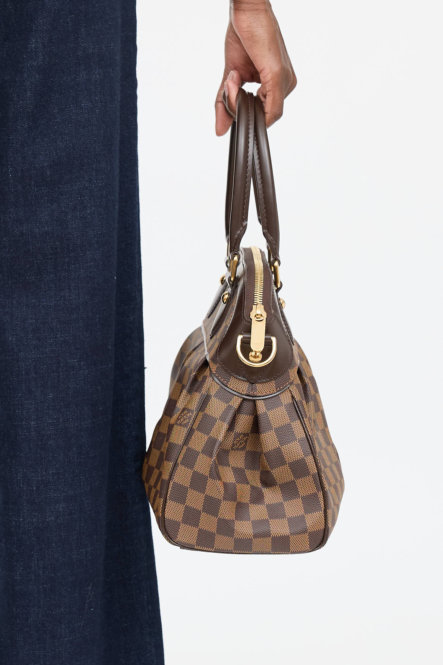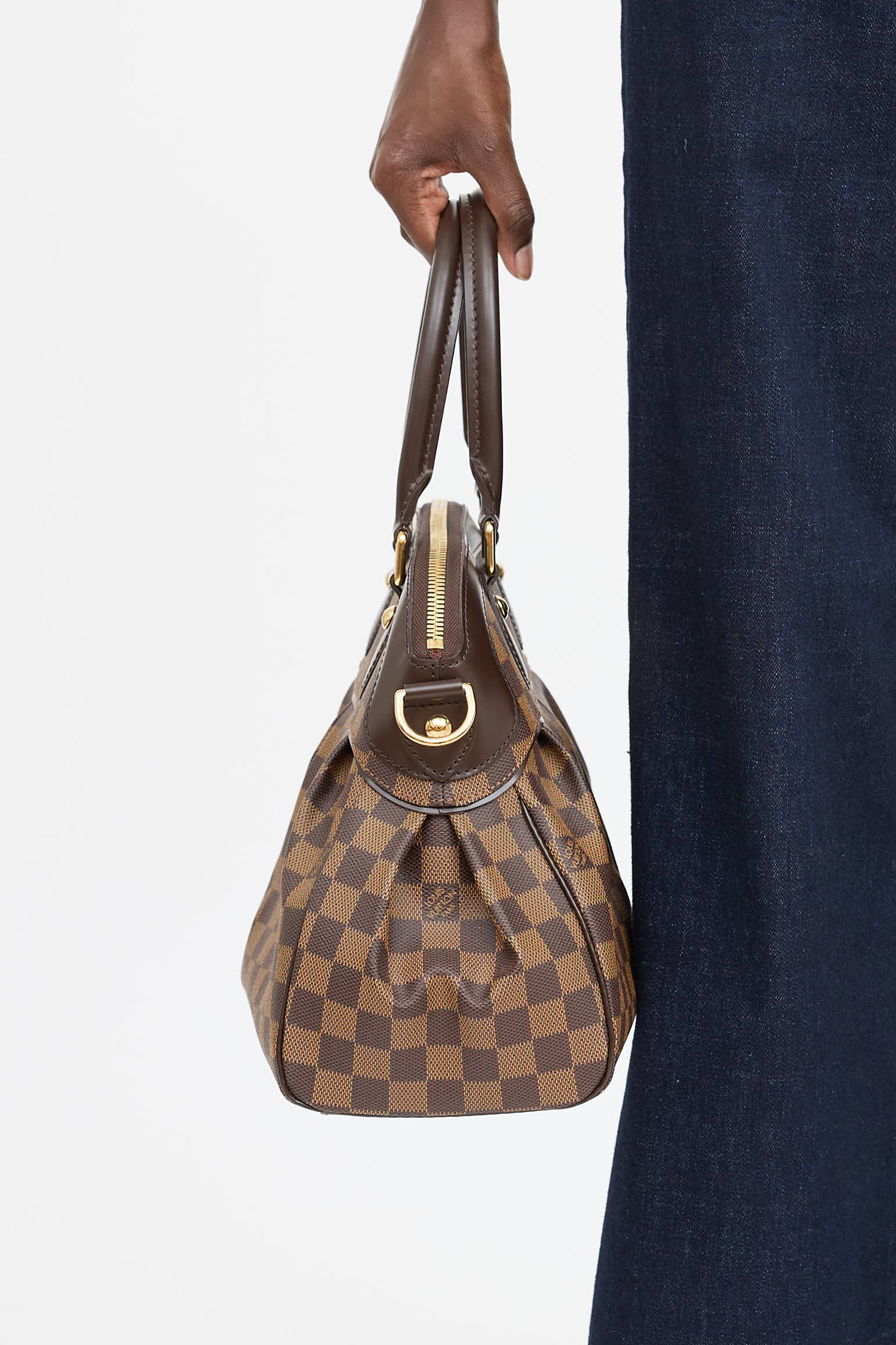 Pre-owned Louis Vuitton brown Trevi PM bag featuring signature Damier Ebene canvas body, brown leather paneling, gold tone hardware, four protective feet at base, dual rolled top handles, detachable and adjustable shoulder strap, top zip closure, and one lined main compartment with two slip pockets.
