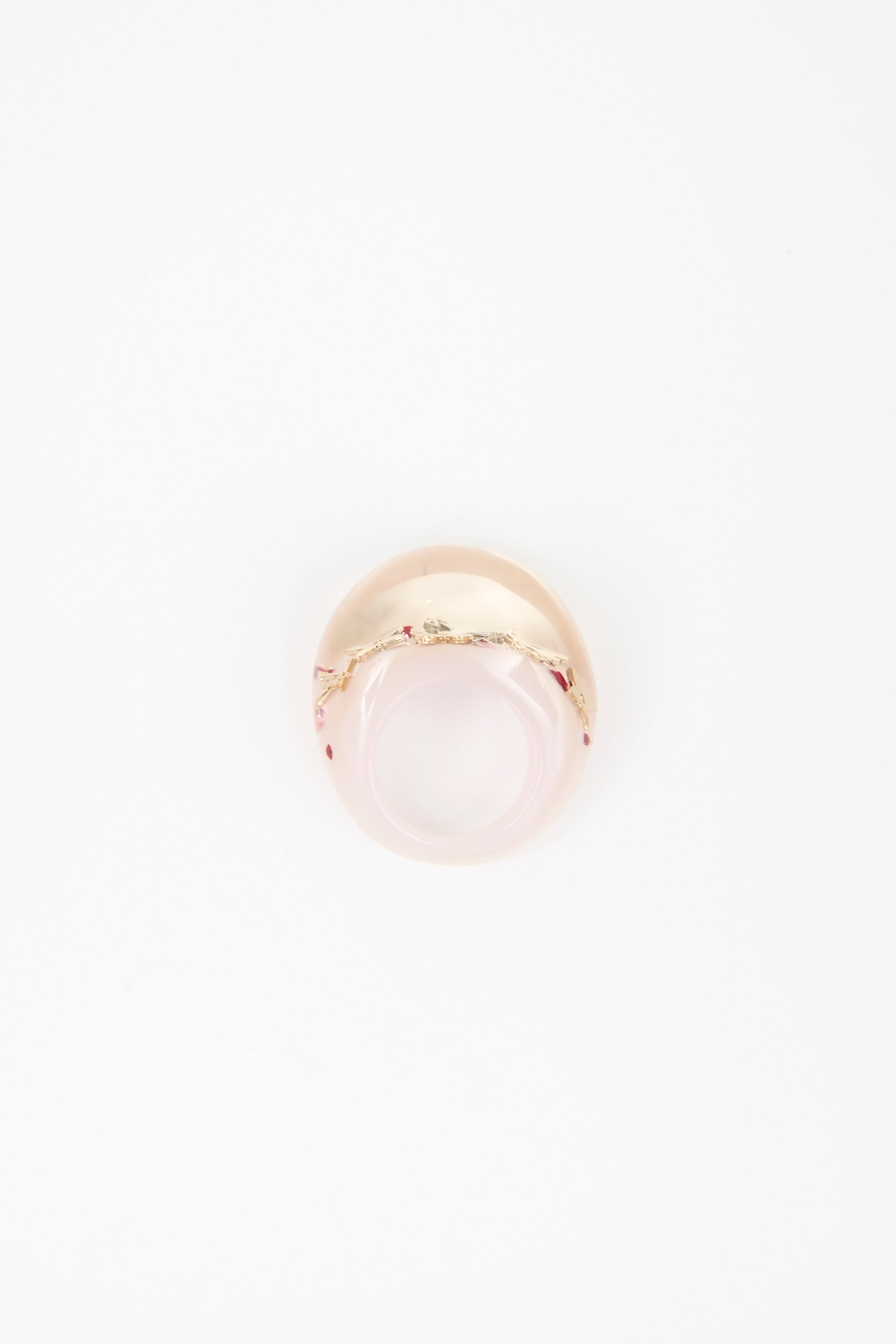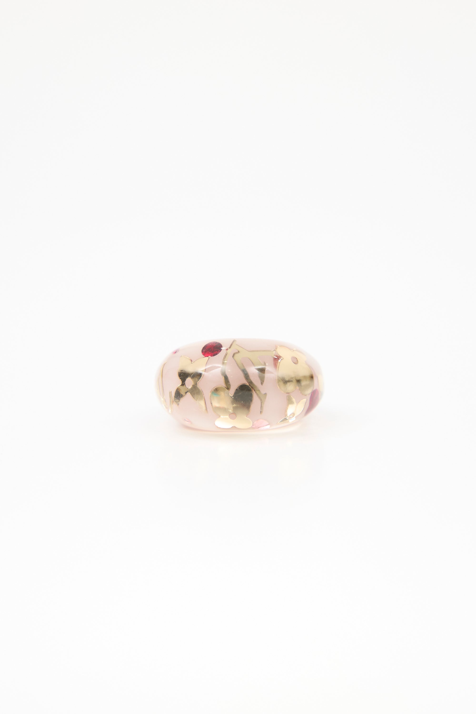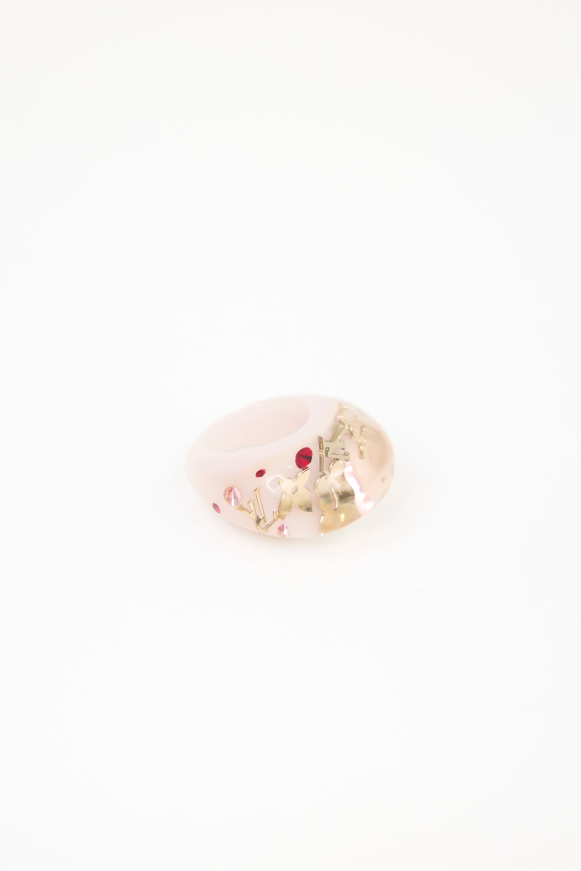 Pre-owned Louis Vuitton pink and gold Dome Inclusion ring featuring bulb front with signature monogram charm. Includes original dust bag.
