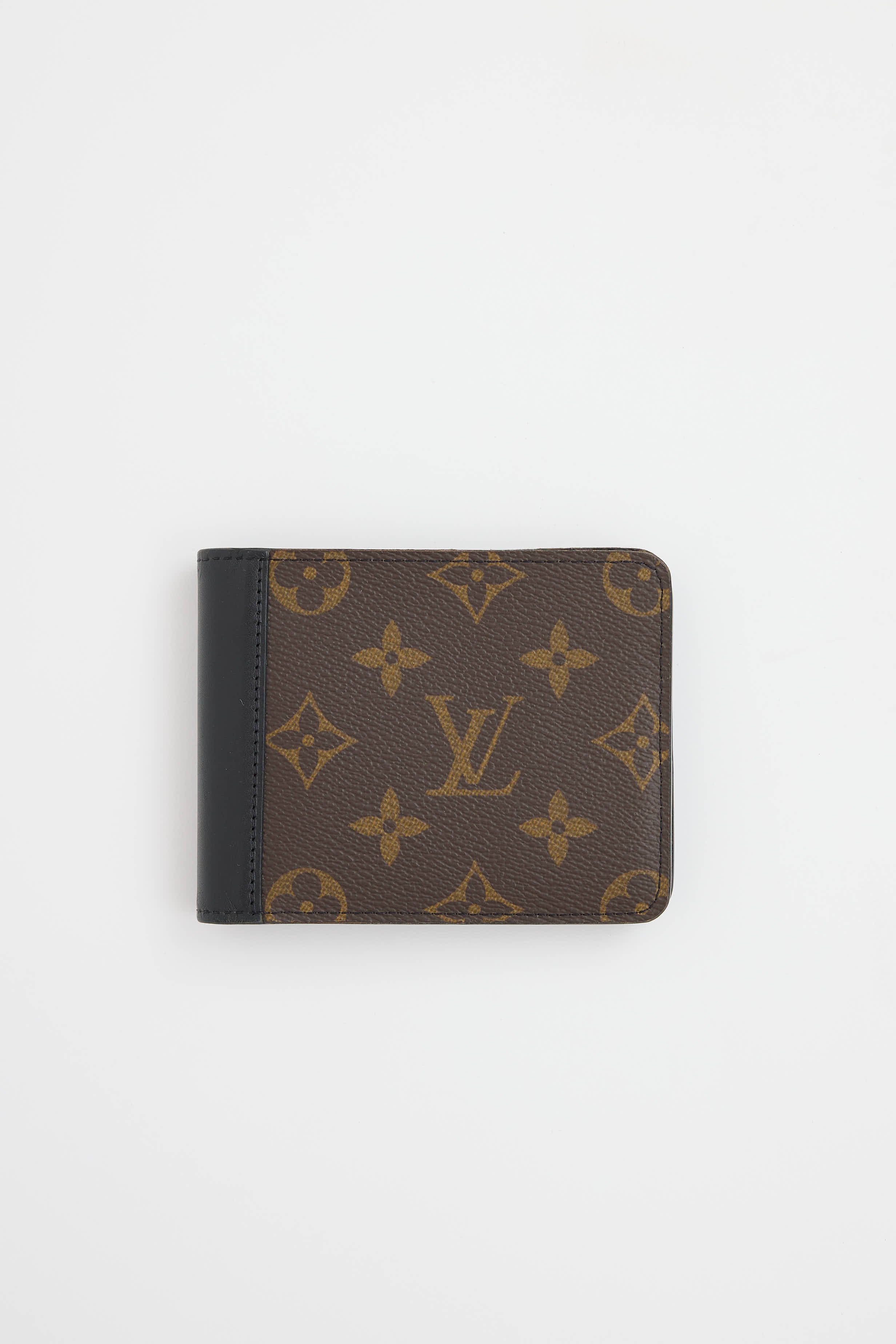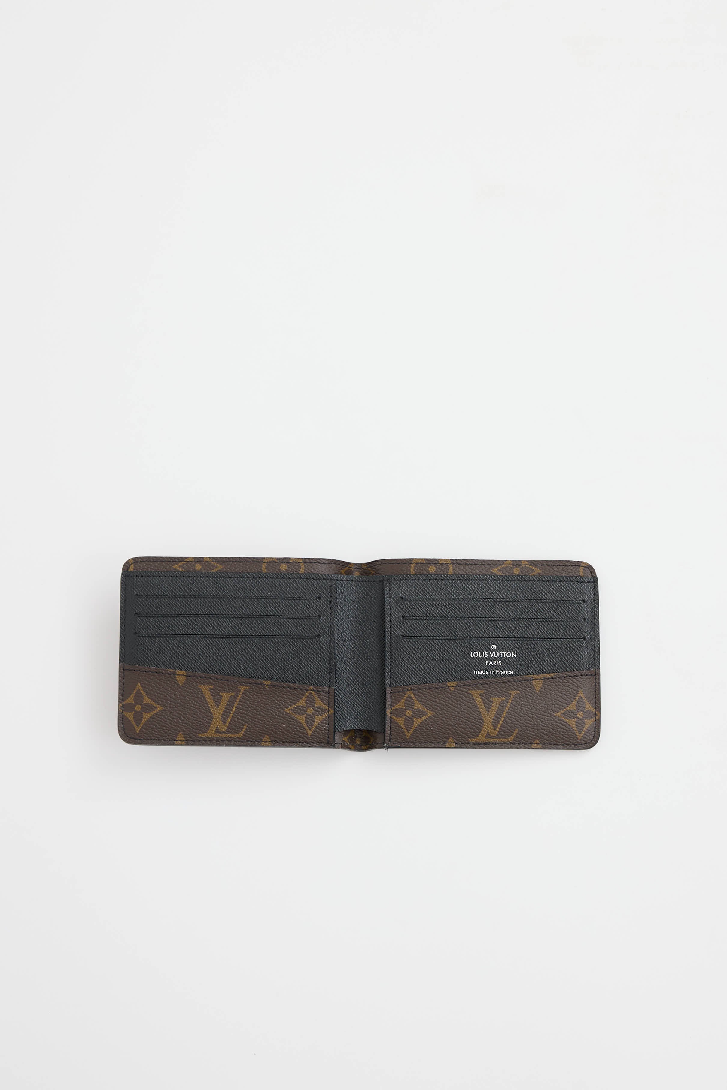 Pre-owned Louis Vuitton brown and black Macassar wallet featuring signature monogram print coated canvas and black leather panel. Interior features, six card slots, two slip pockets, and one bill slot.