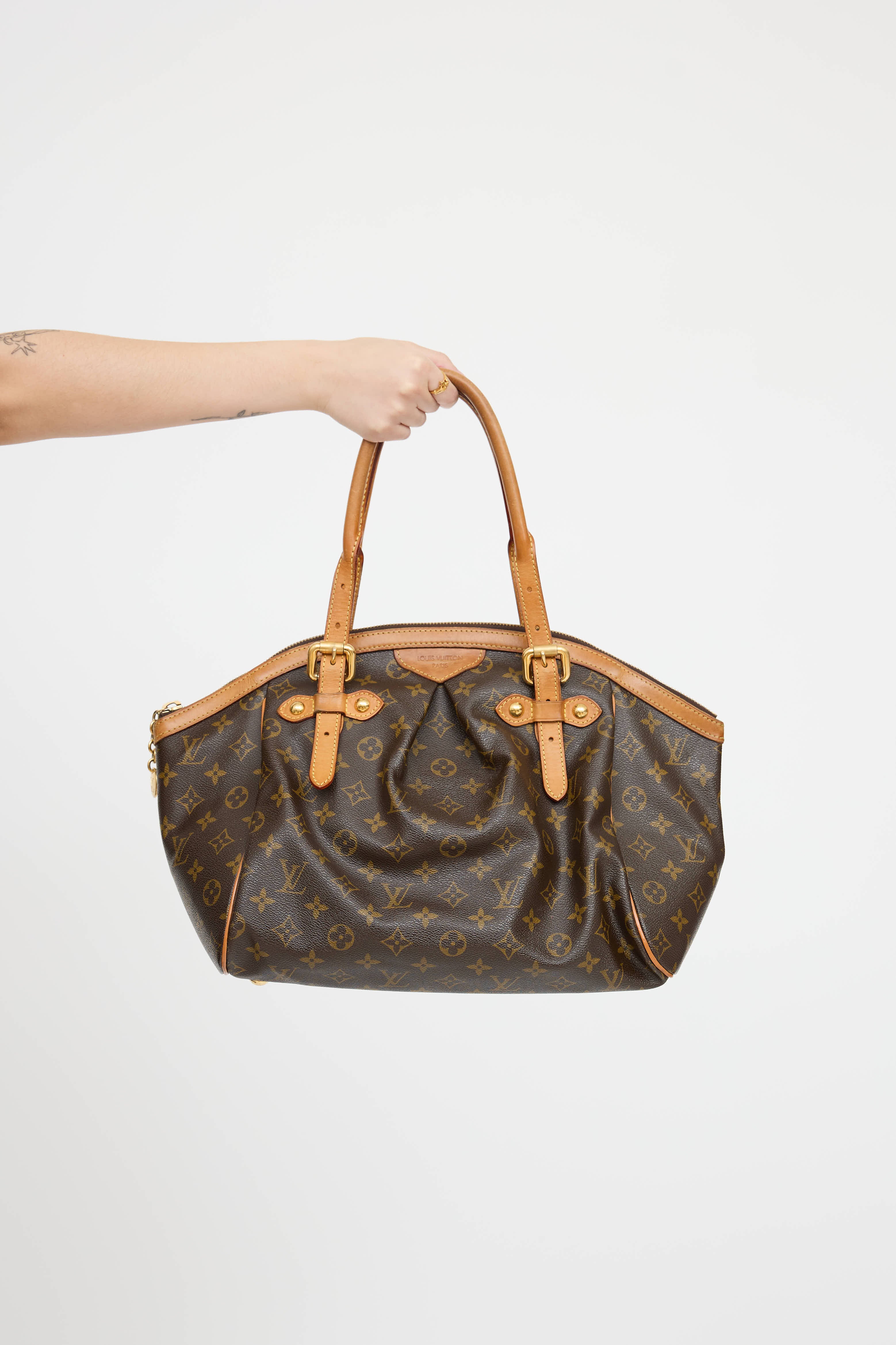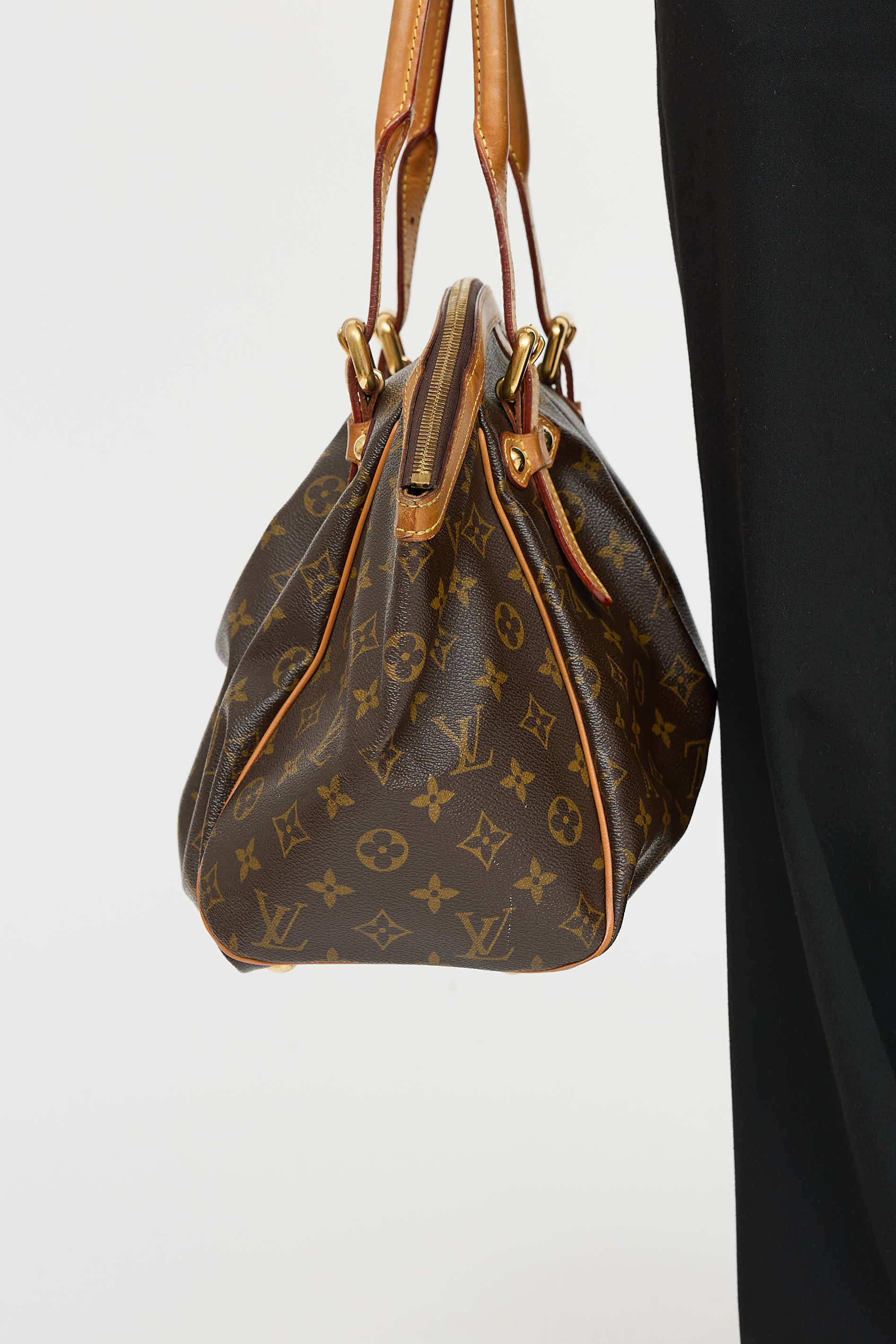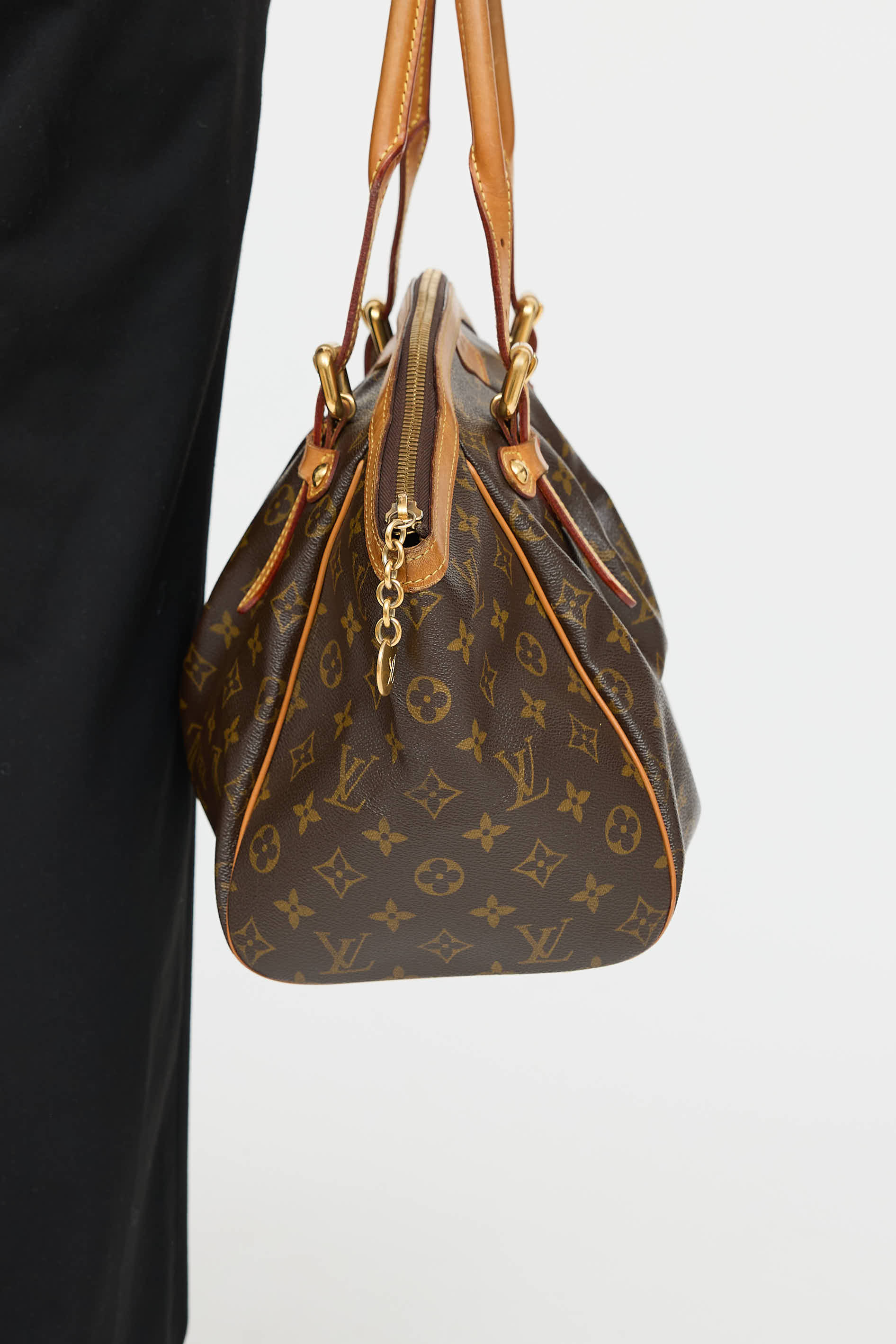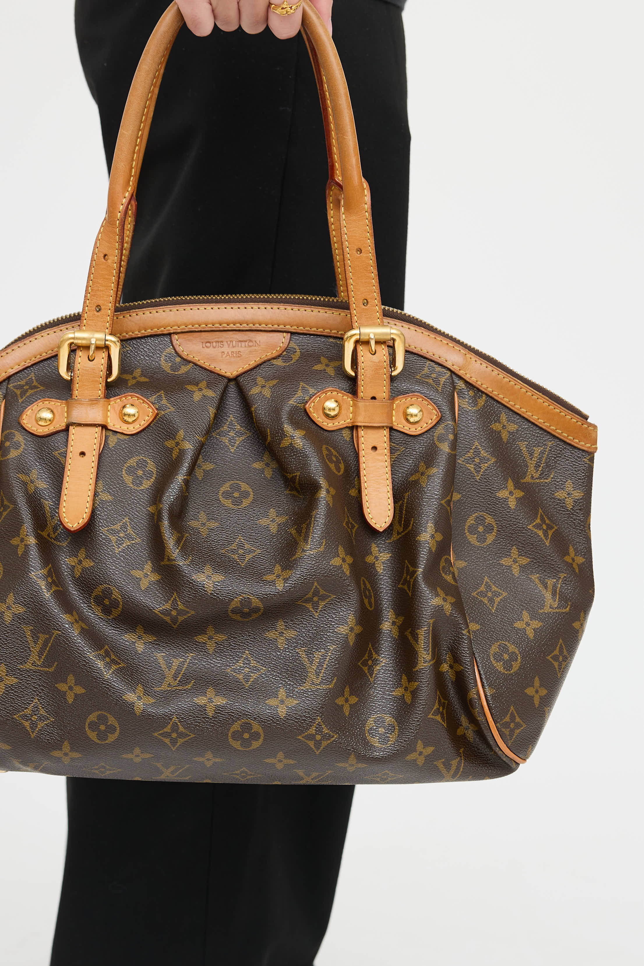 Pre-owned Louis Vuitton Monogram Tivoli bag featuring signature brown monogram coated canvas exterior, vachetta leather trim, dual rolled top handles, box pleat detail on front and back, zip closure at top, five protective metal feet at bottom and gold-tone hardware. Interior features one main compartment, three slip pockets and brown textile lining.