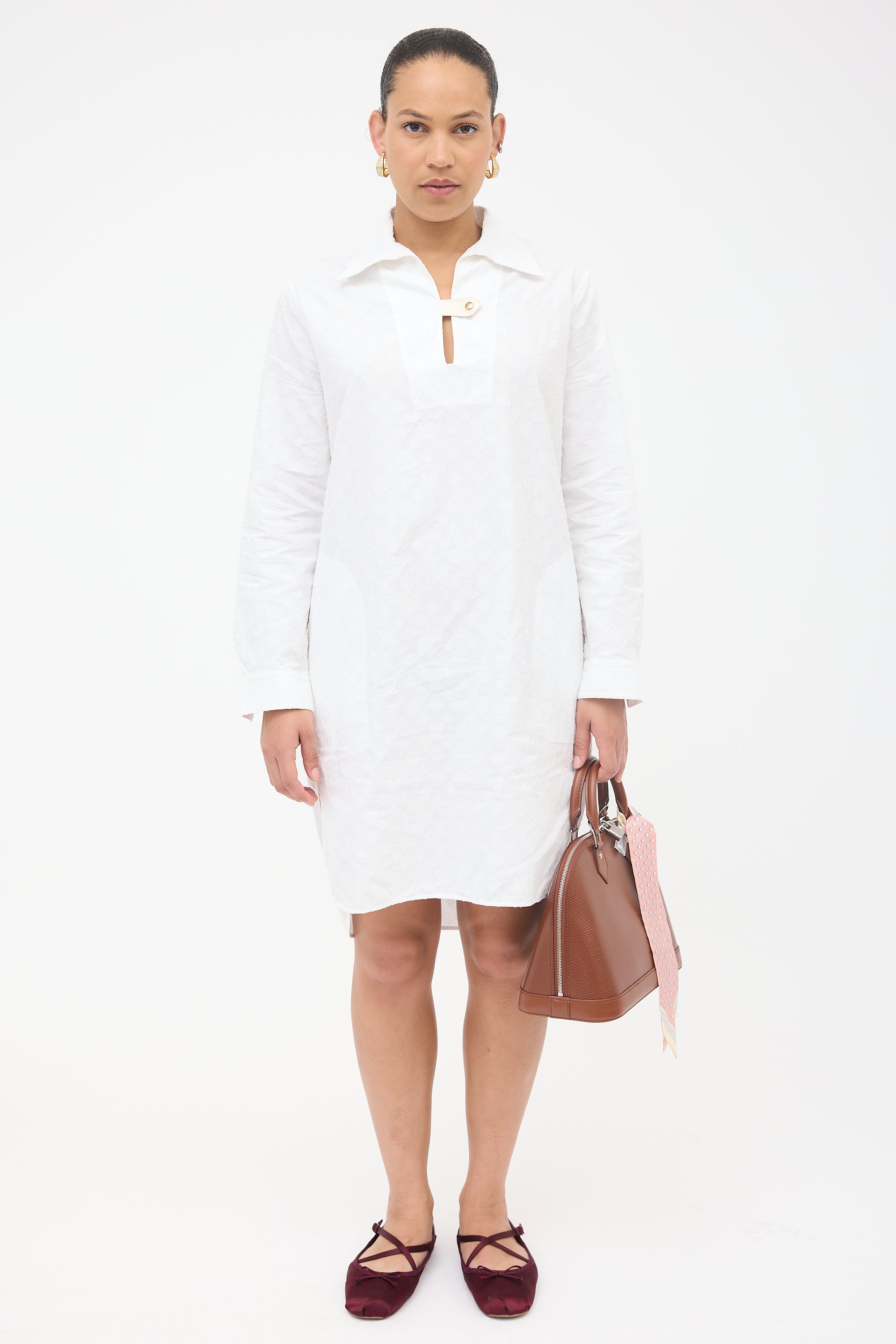 Pre-owned Louis Vuitton white poplin shirt dress featuring a fil coupé monogram embroidery throughout, point collar, V-neckline with leather strap and snap button detail, two slip pockets at hip, one buttoned patch pocket at back, and buttoned cuffs.