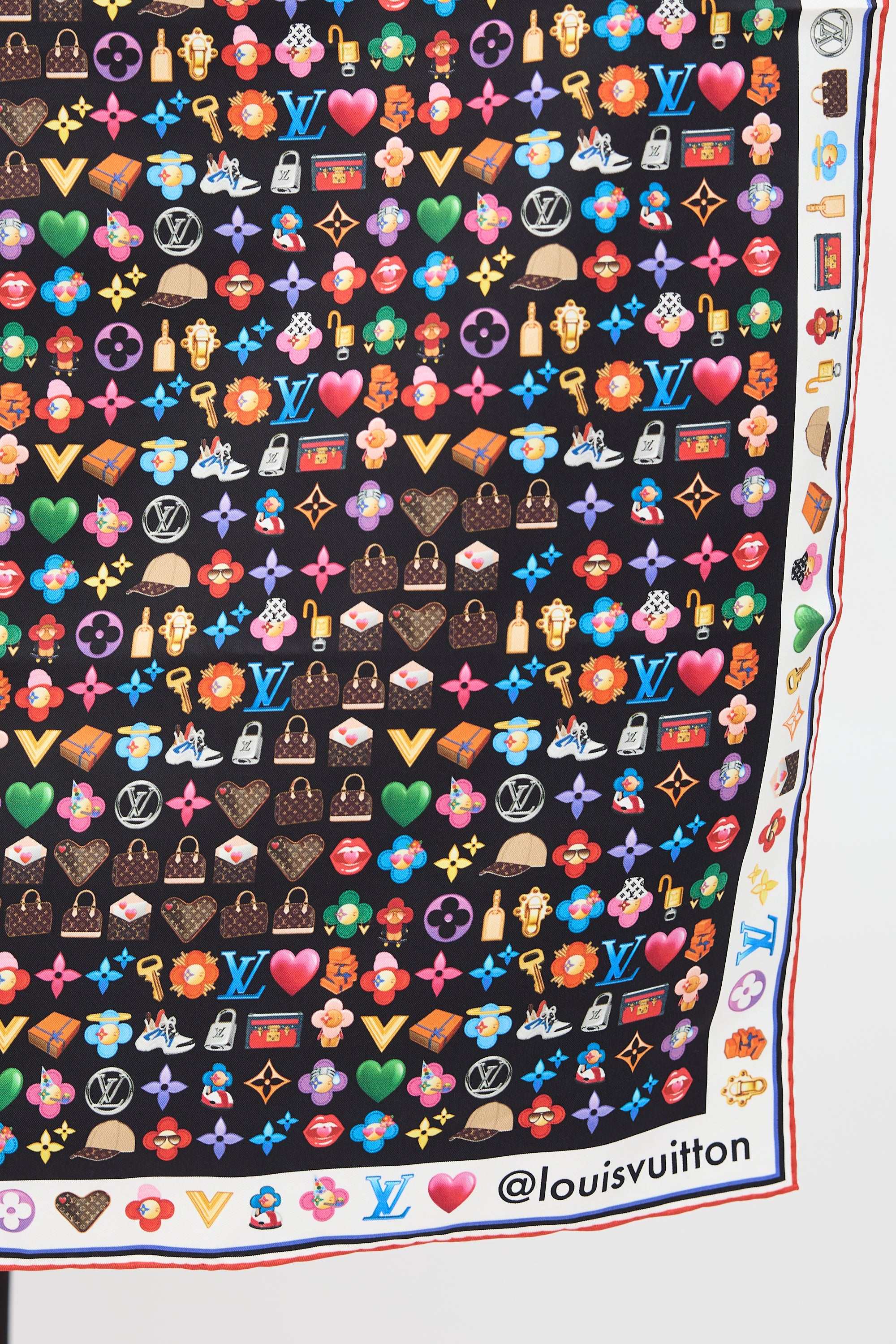 Pre-owned Louis Vuitton multicolour silk LVmoji scarf featuring mixed signature monogram, emoji, and luggage prints, logo handle at bottom right corner, and hand rolled edges.