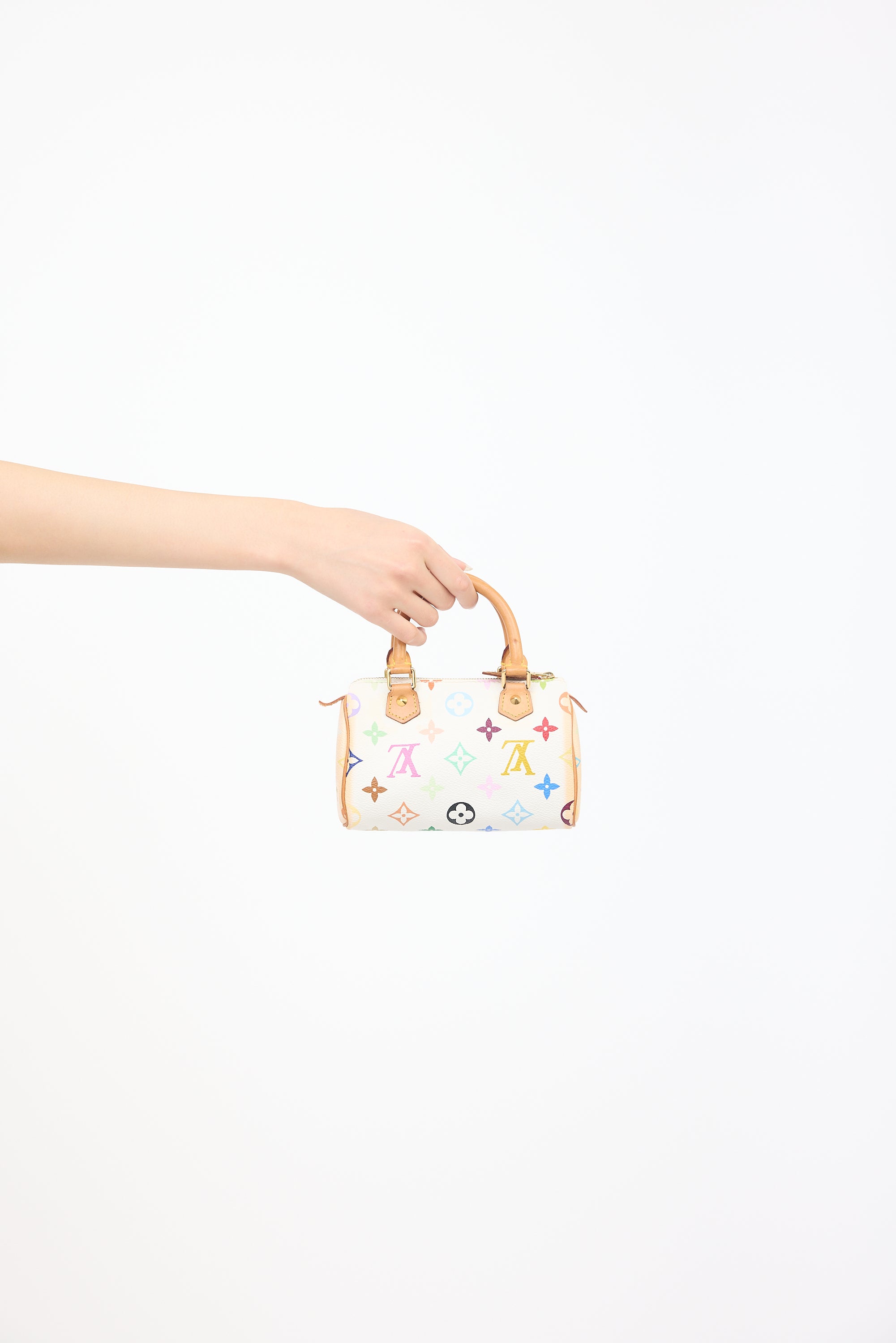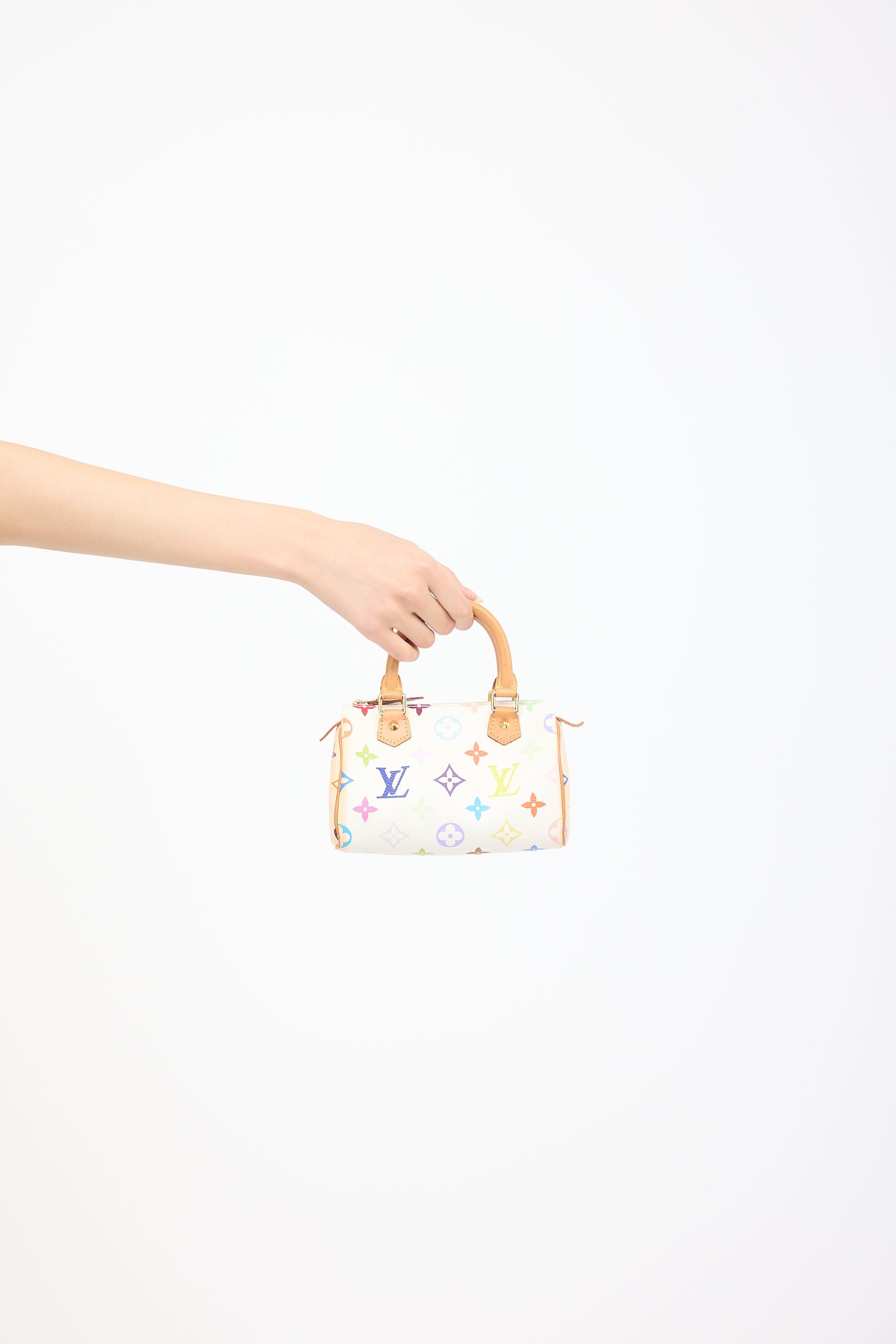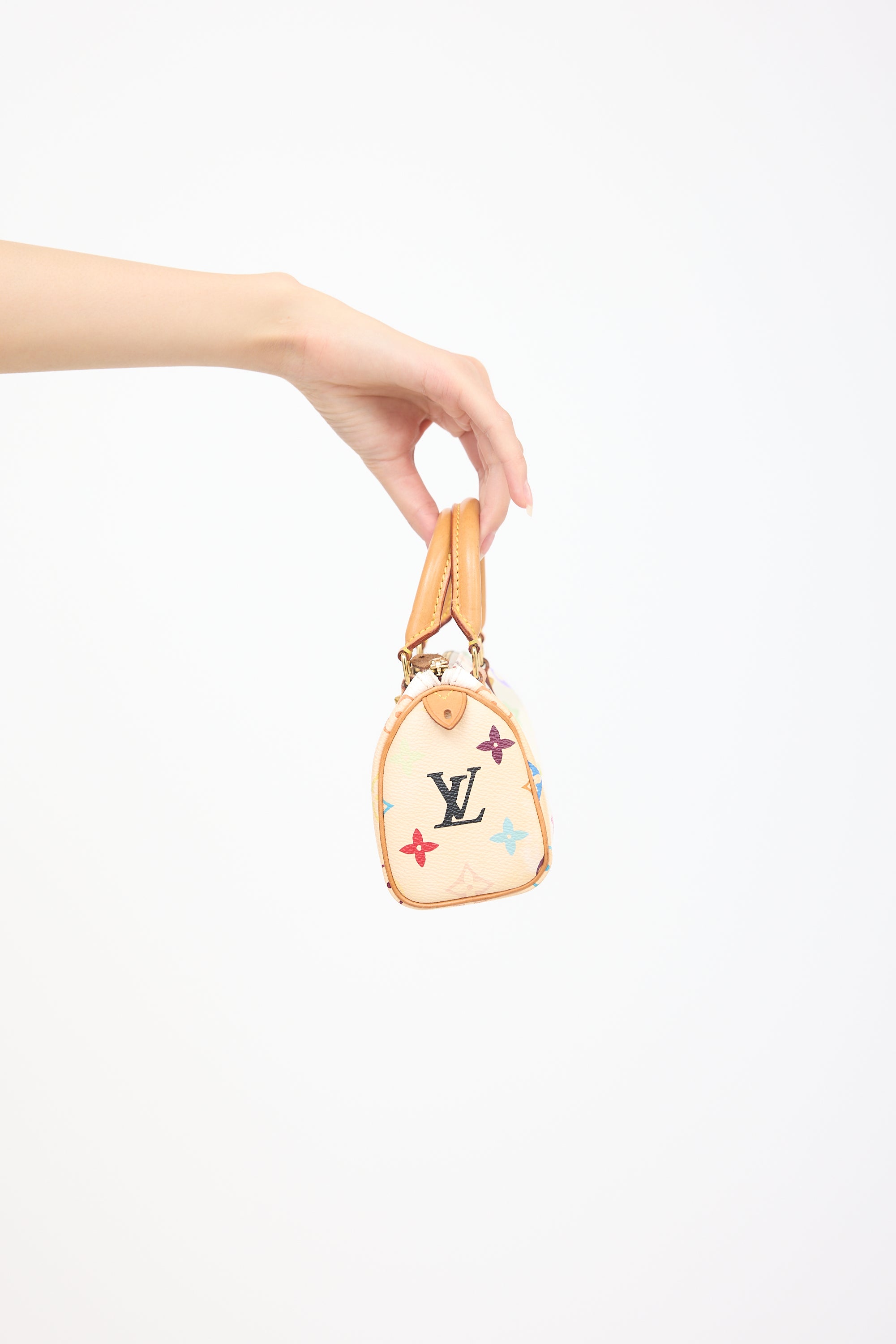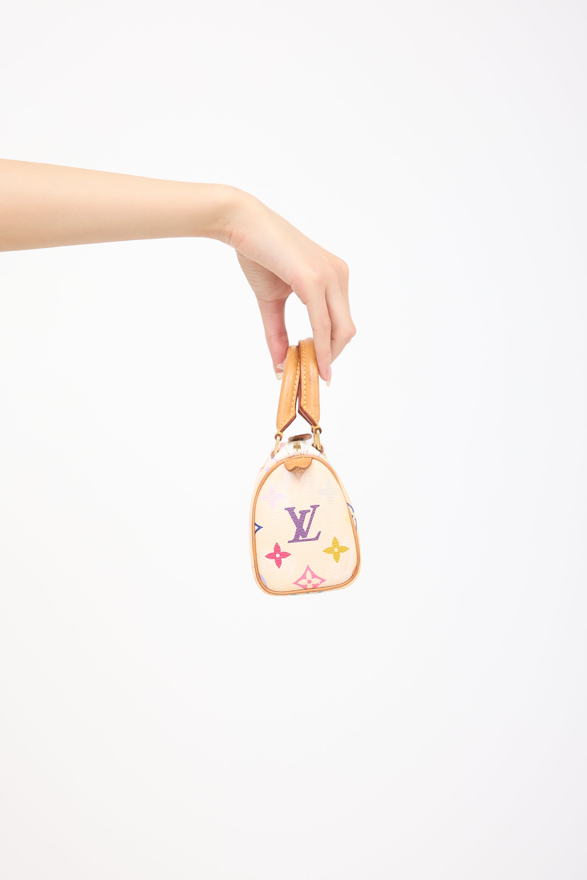Pre-owned Louis Vuitton x Murakami 2003 white Nano Speedy bag in multicolour monogram coated canvas featuring two rolled top handles, gold tone hardware, vachetta leather trim, top zip closure, and one suede red main compartment.