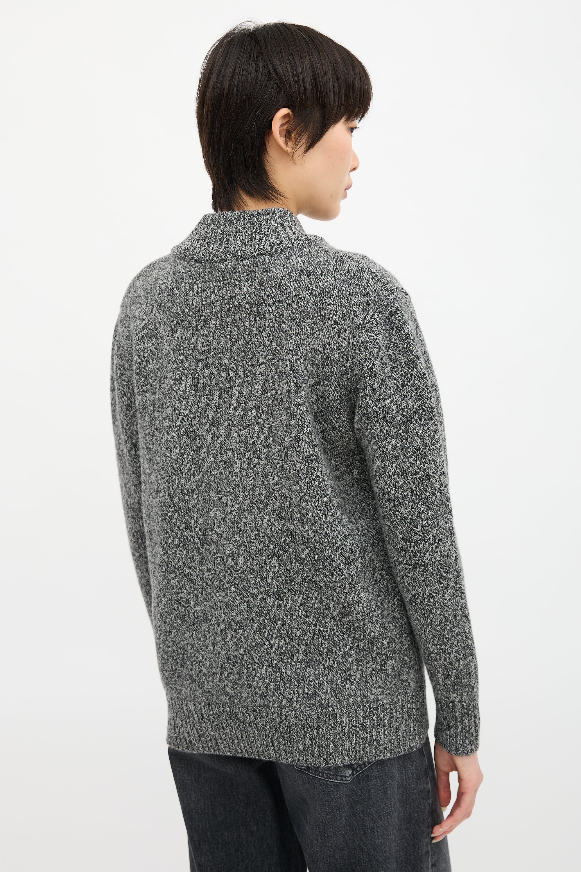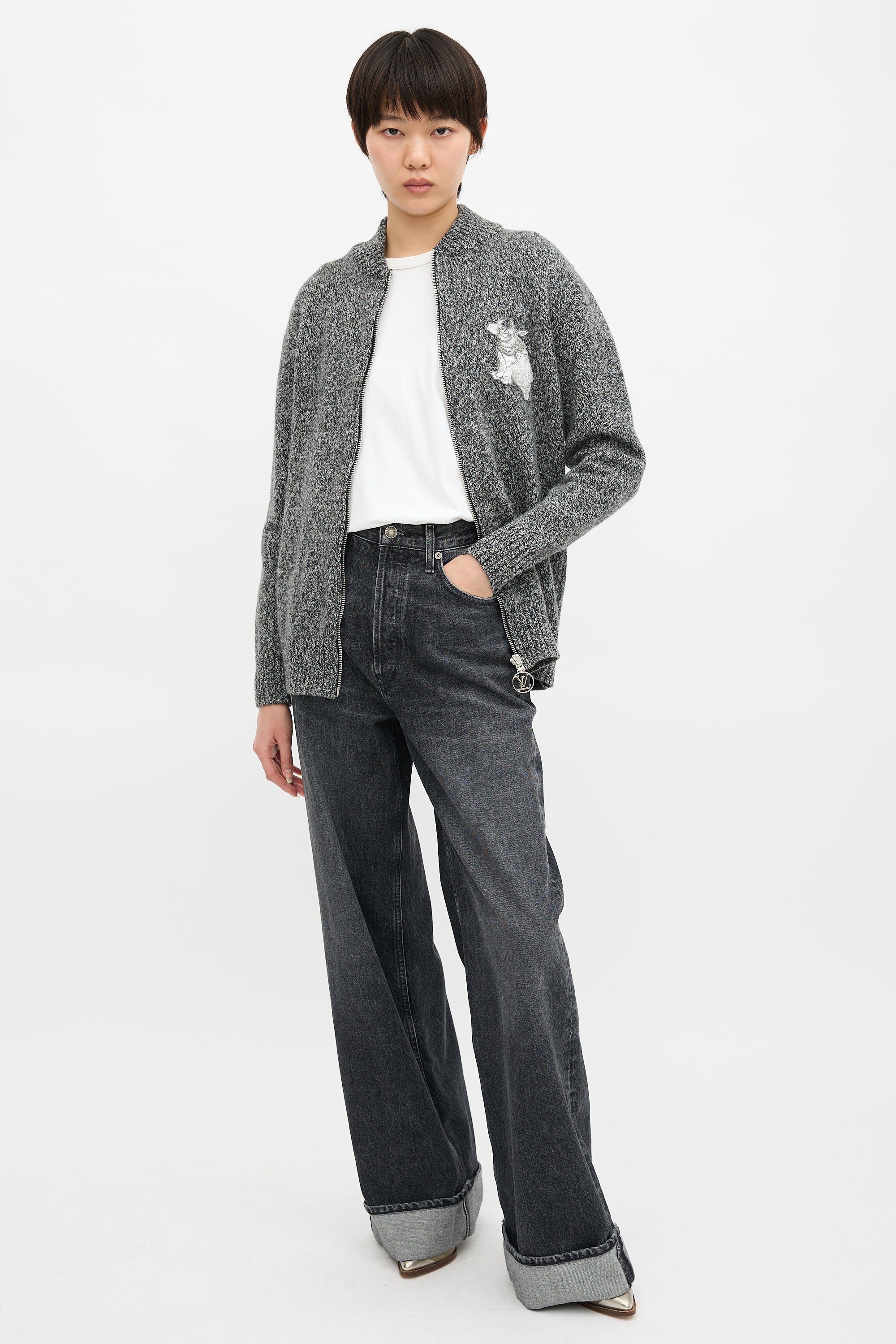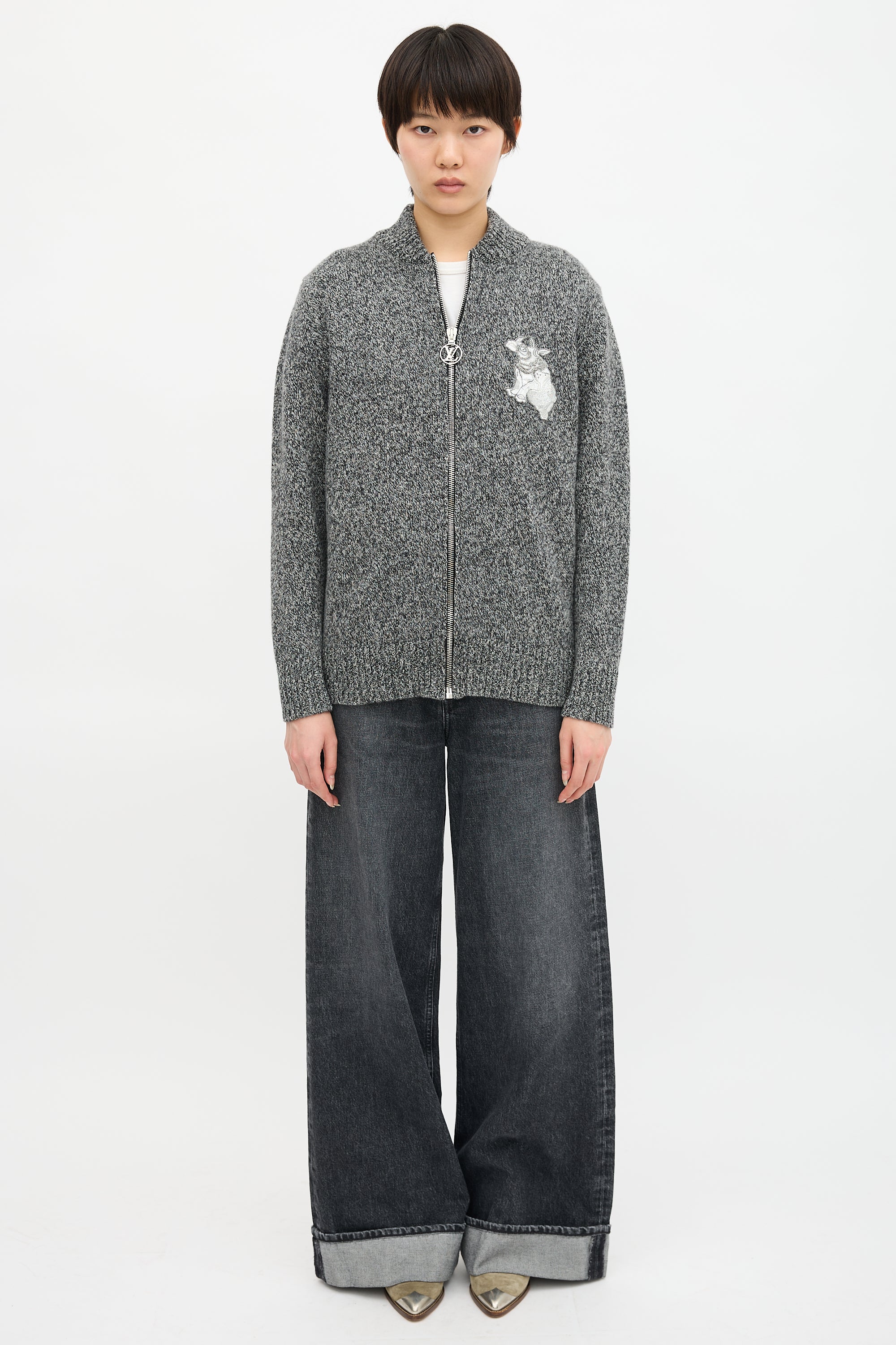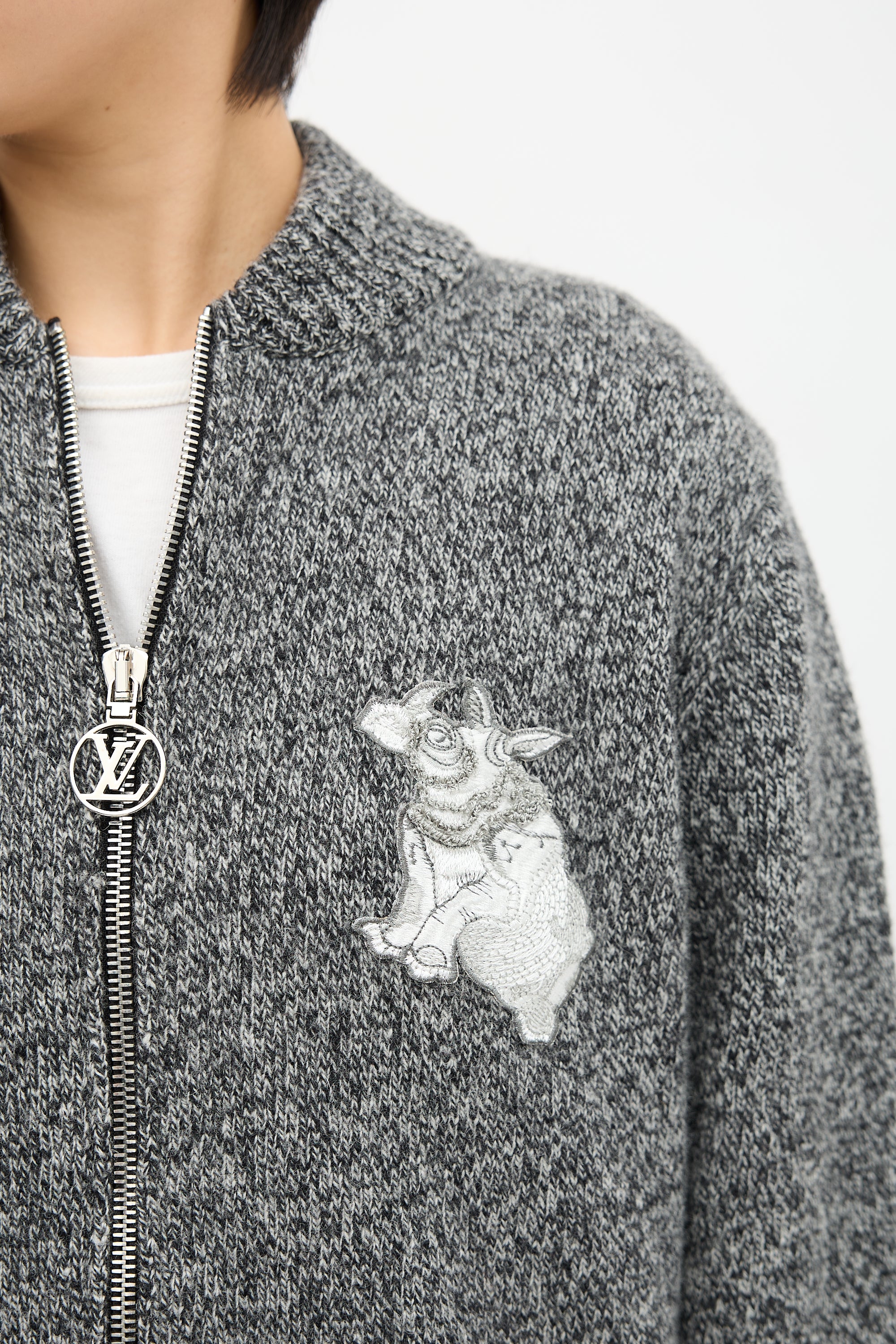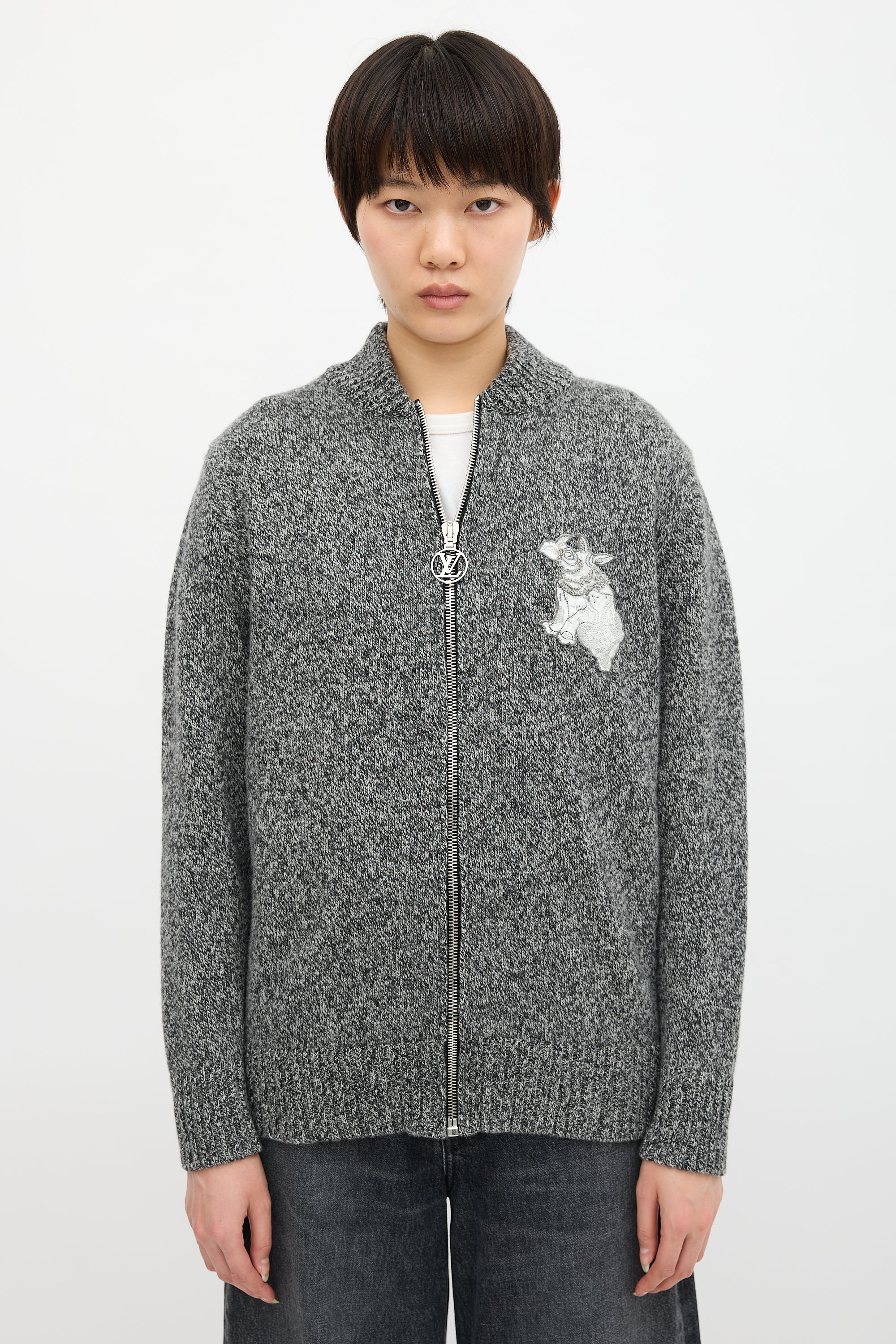 Pre-owned Louis Vuitton black and white cardigan featuring a ribbed collar, front zip with silver LV logo pull, and tonal rhinoceros patch at chest.