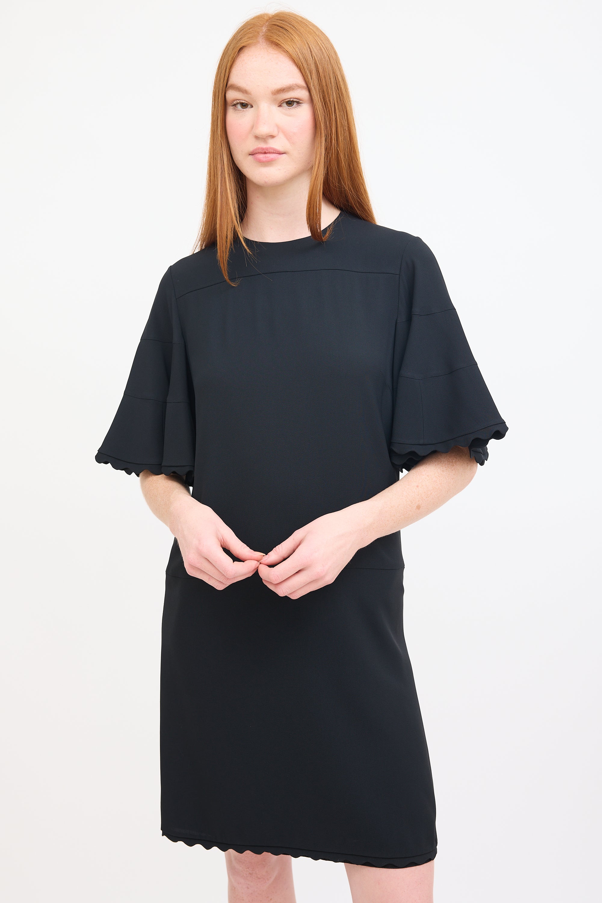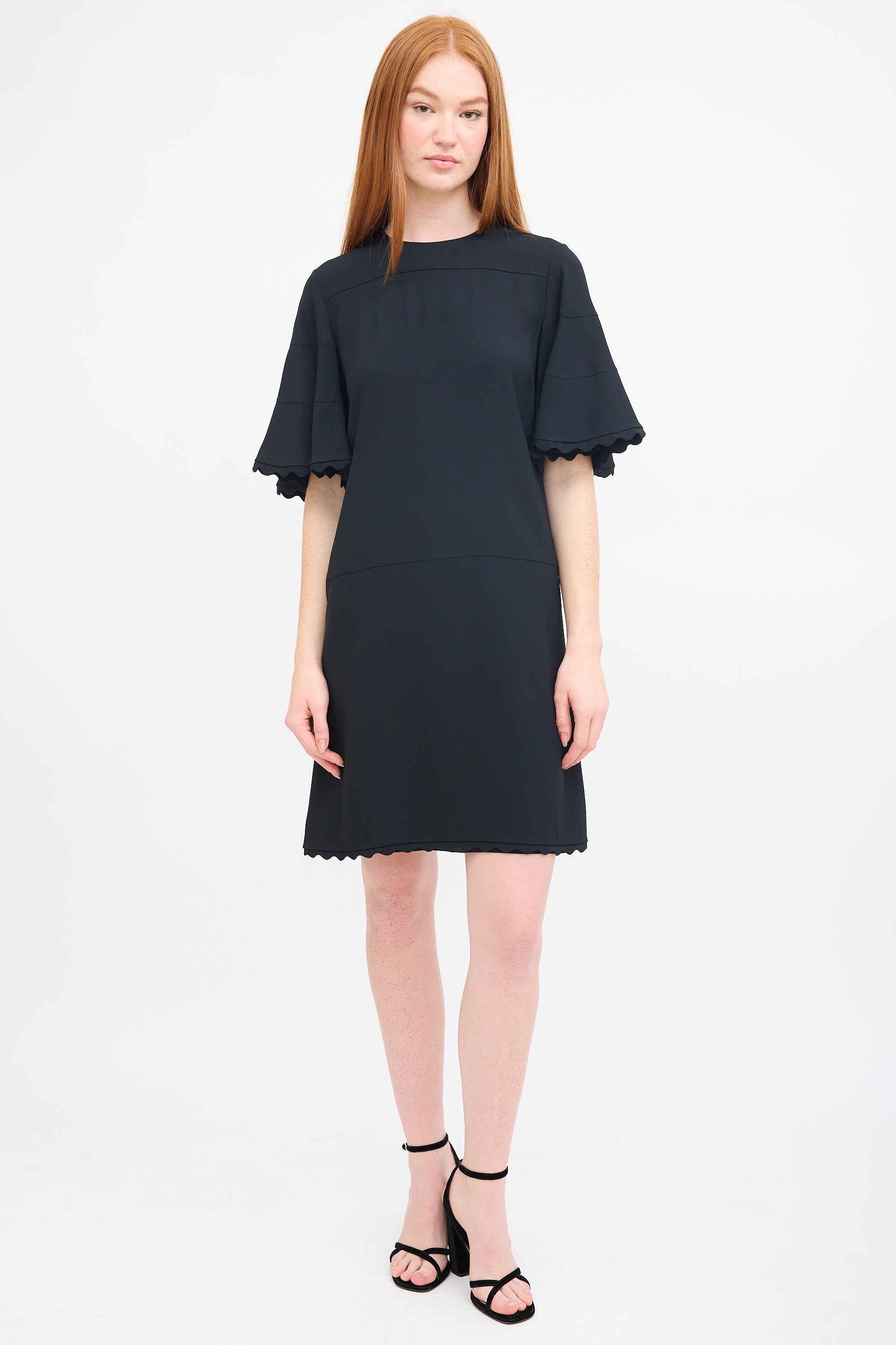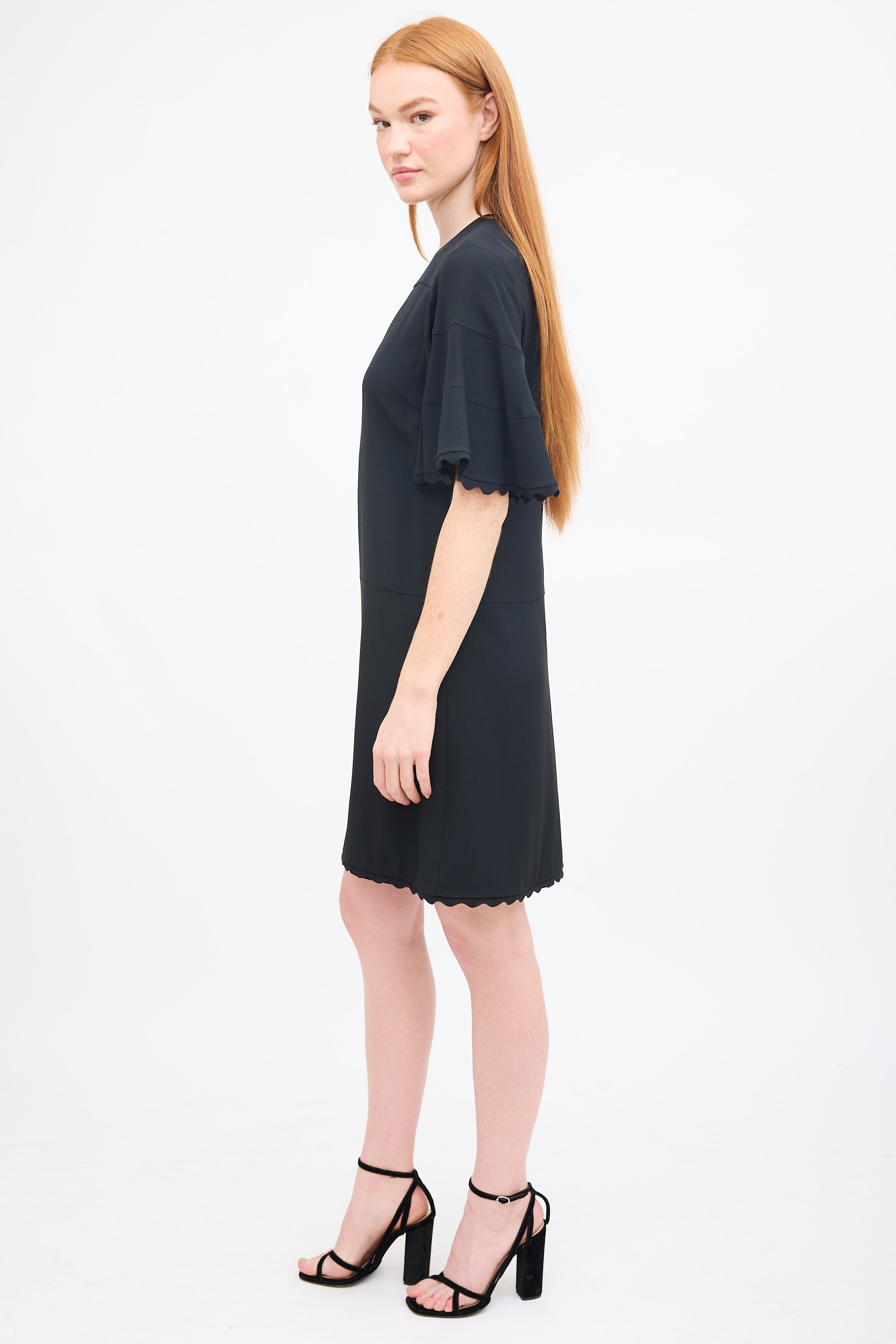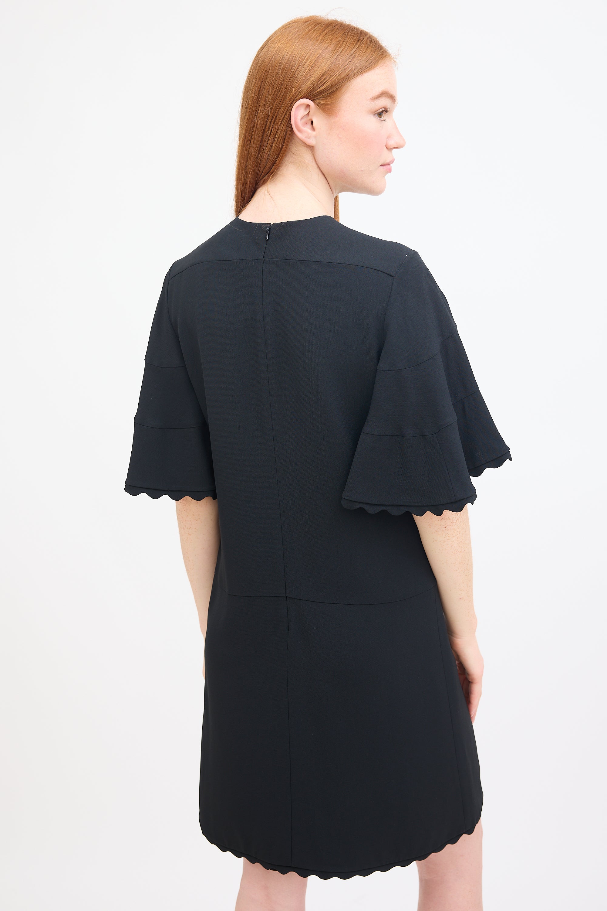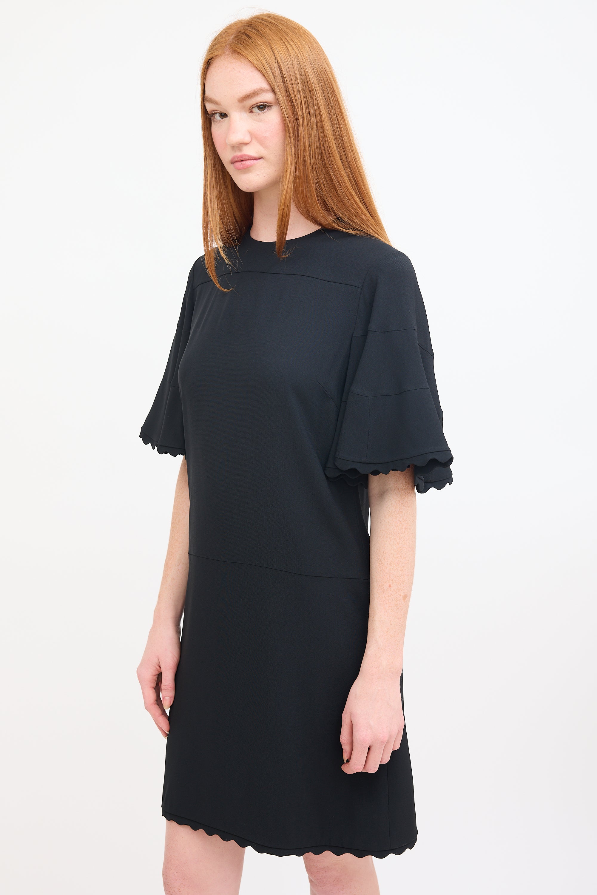 Pre-owned Chloé black mini dress featuring a round neckline, short flutter sleeves, scalloped trim at hem and cuffs, and concealed back zip closure. Lined.