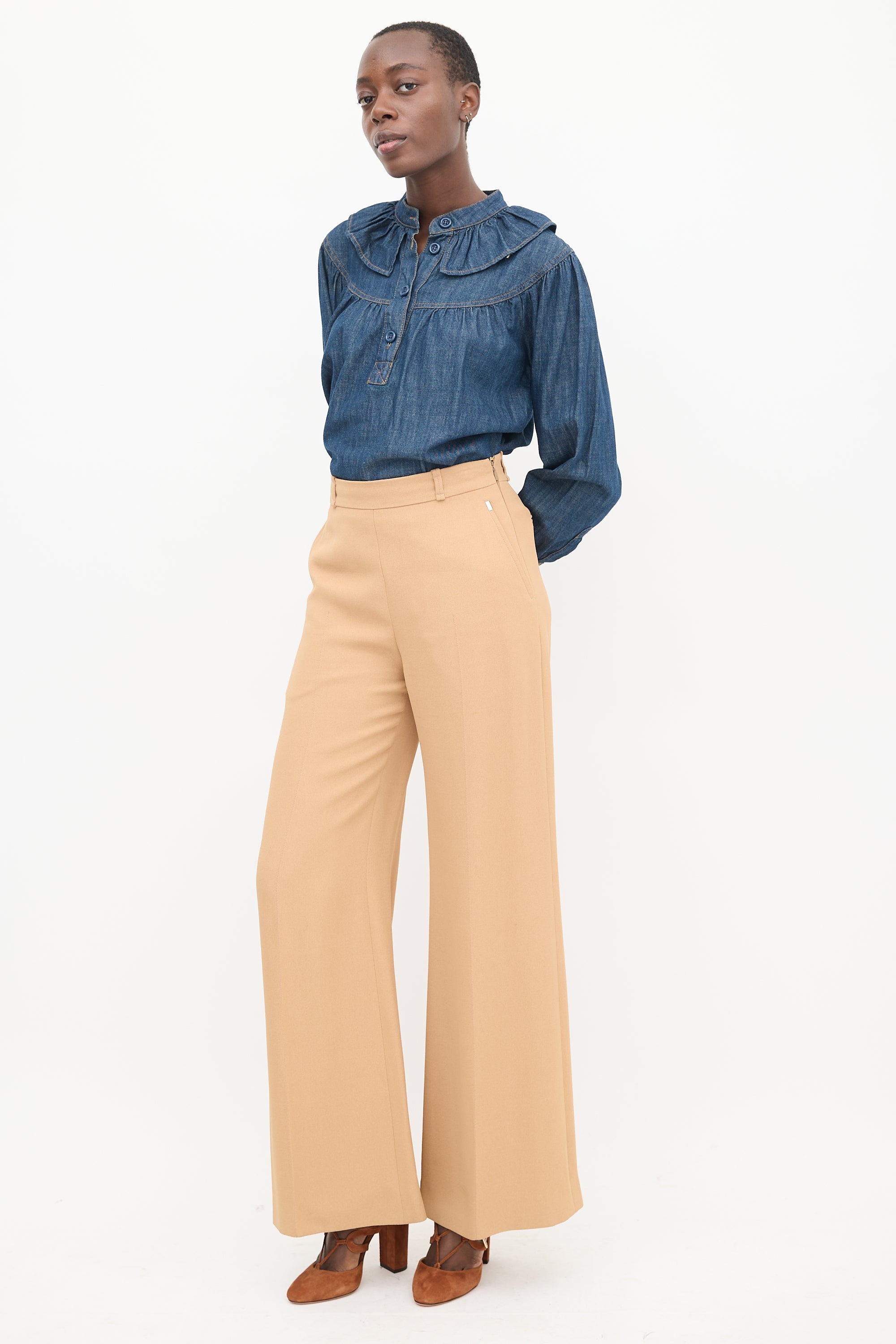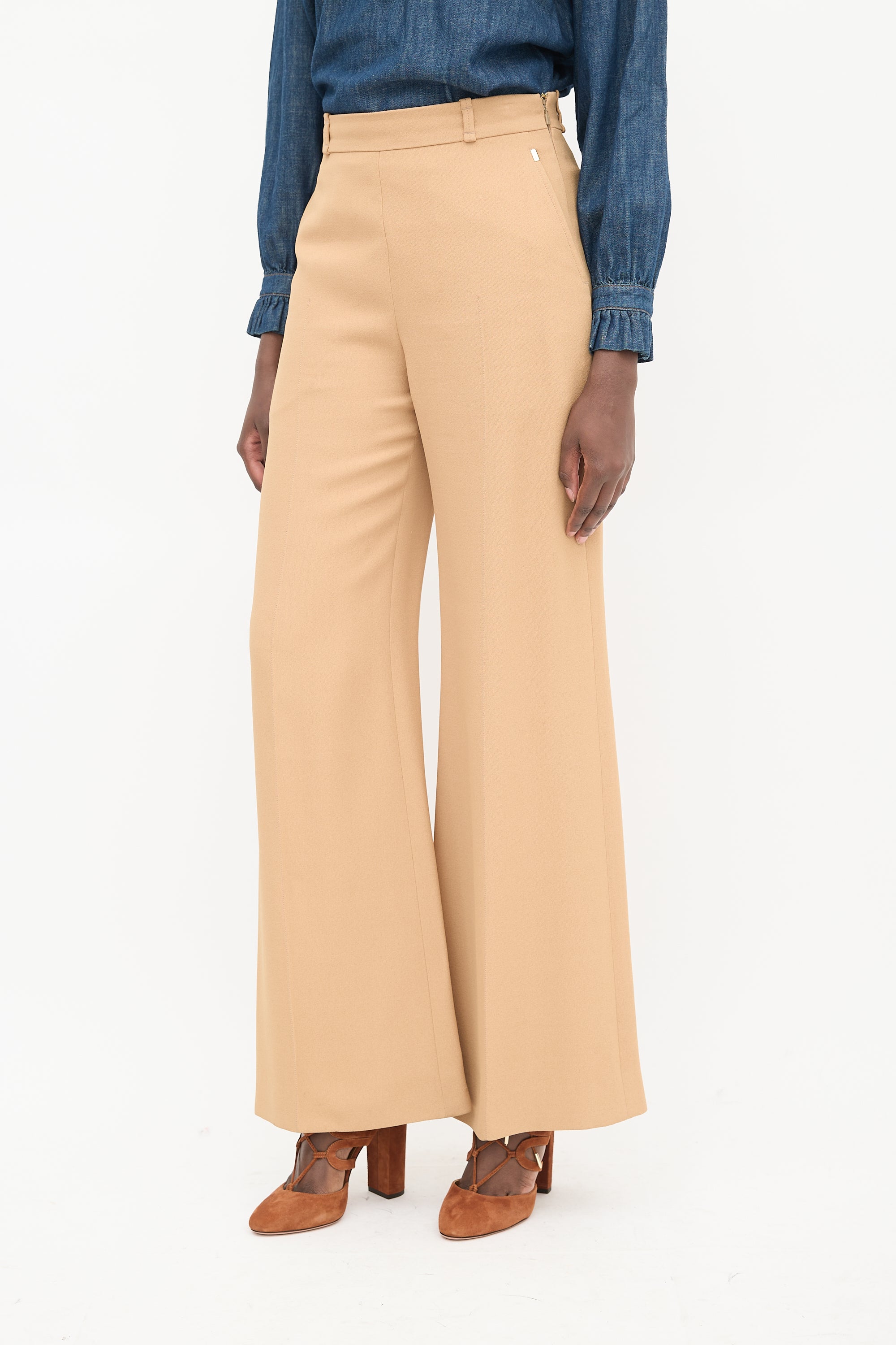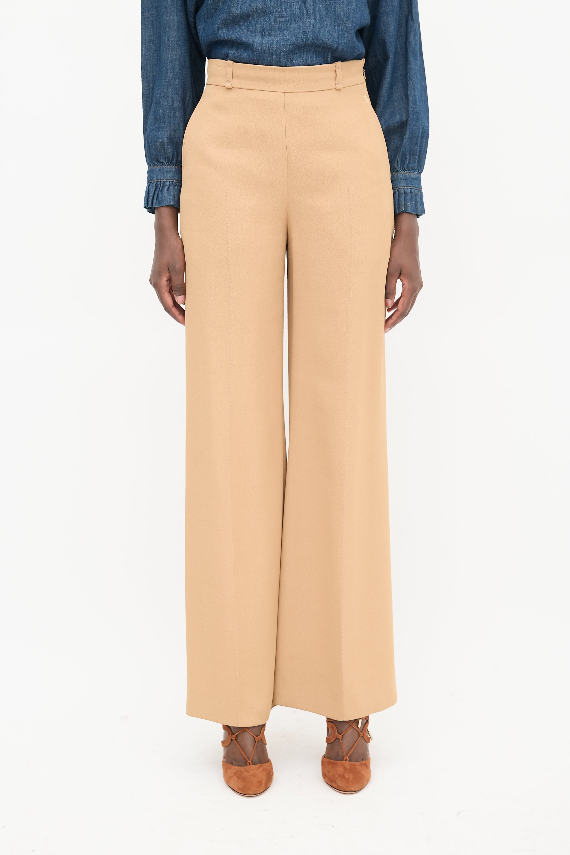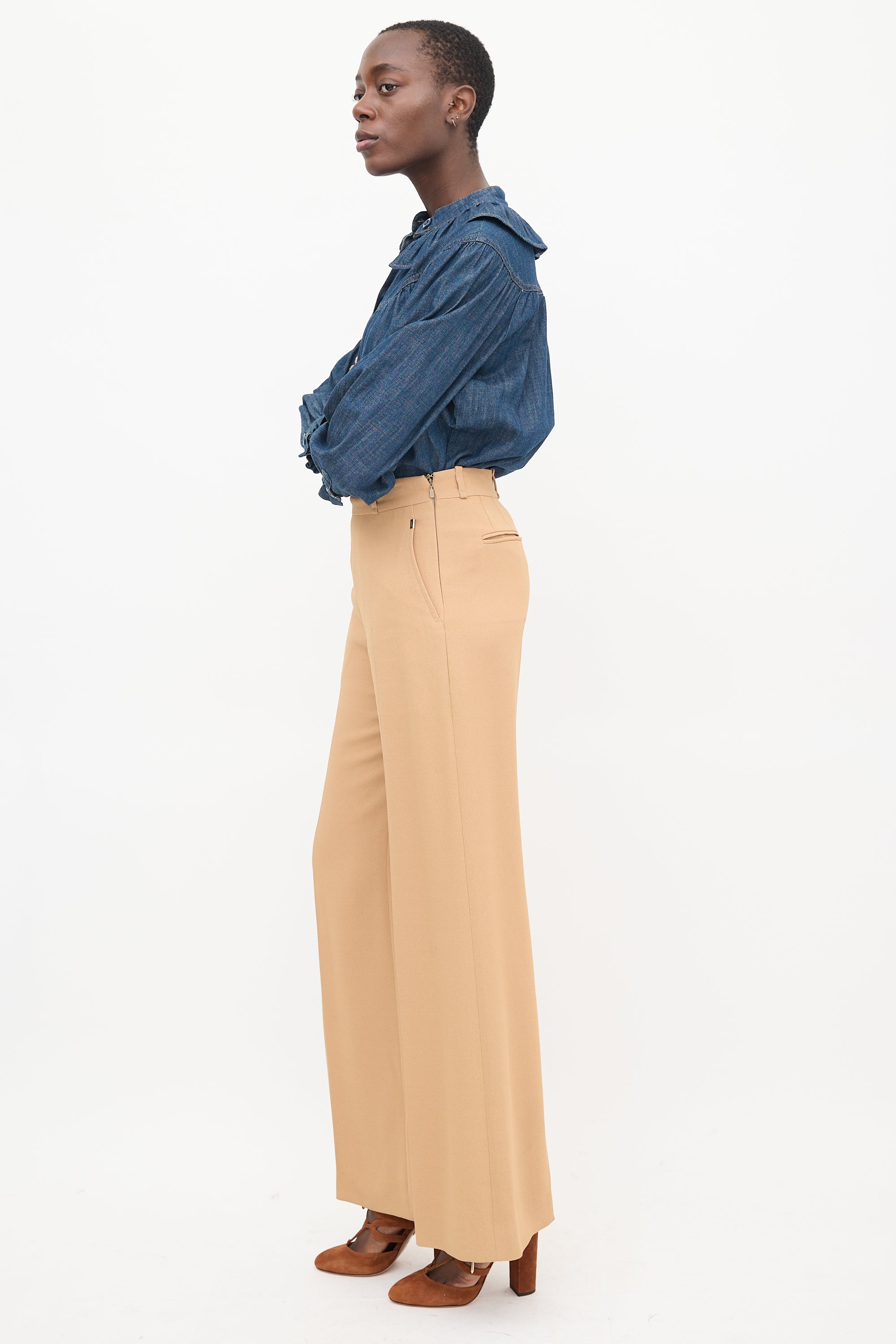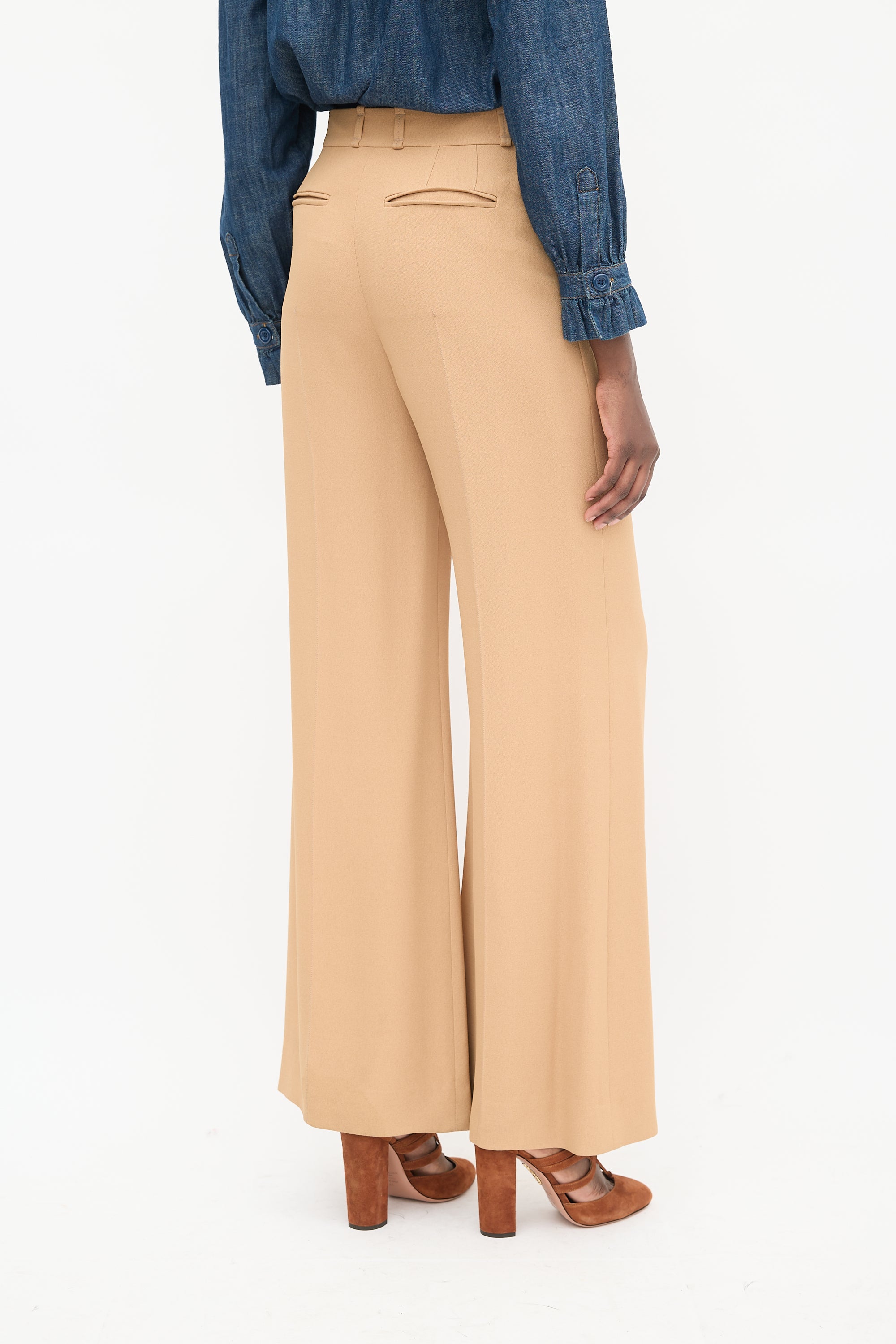 Pre-owned Chloé brown trousers featuring two slip pockets at hip, two welt pockets at back, centre pleat, wide leg, and zip at side with hook and eye closure. Lined.