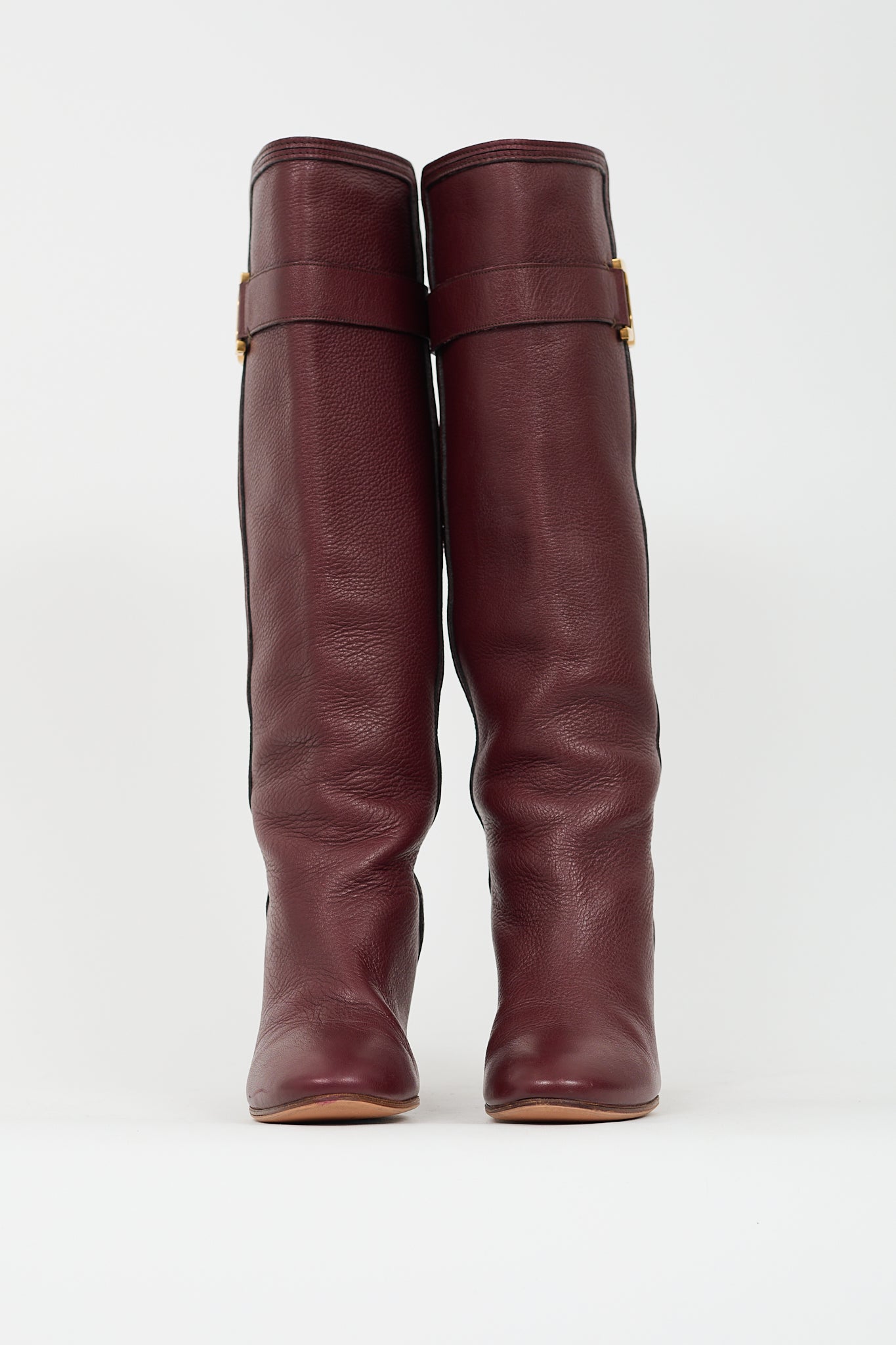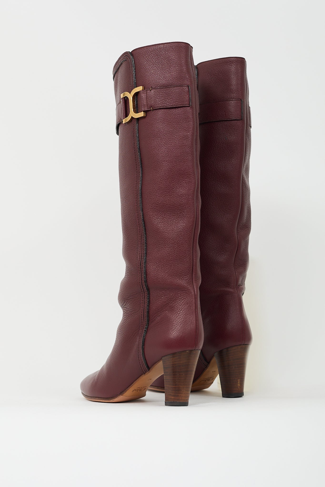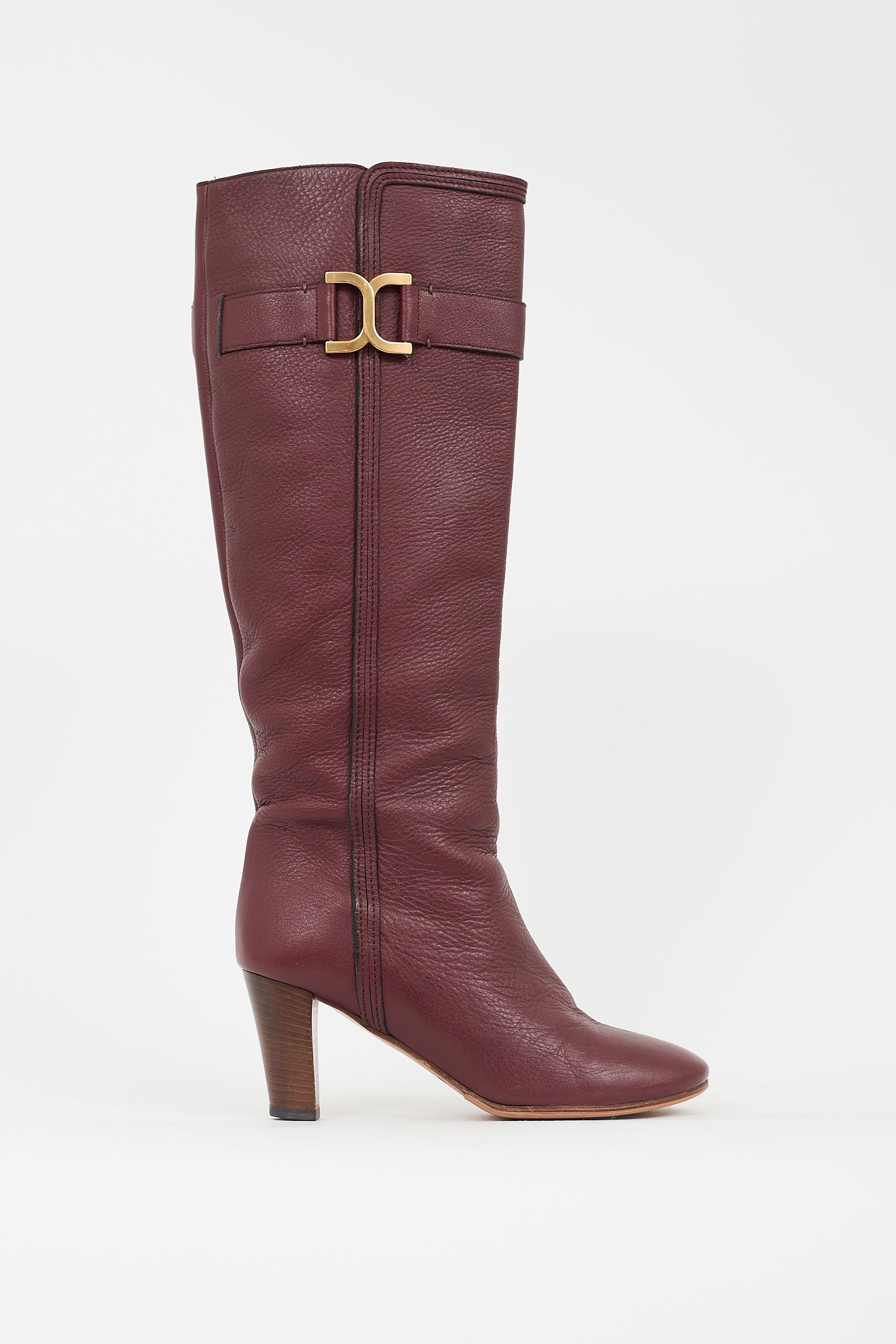 Pre-owned Chloé burgundy pebbled leather boots featuring rounded toe, gold tone decorative buckle at collar, pull on entry, and stacked block heel. Comes with original dust bag.