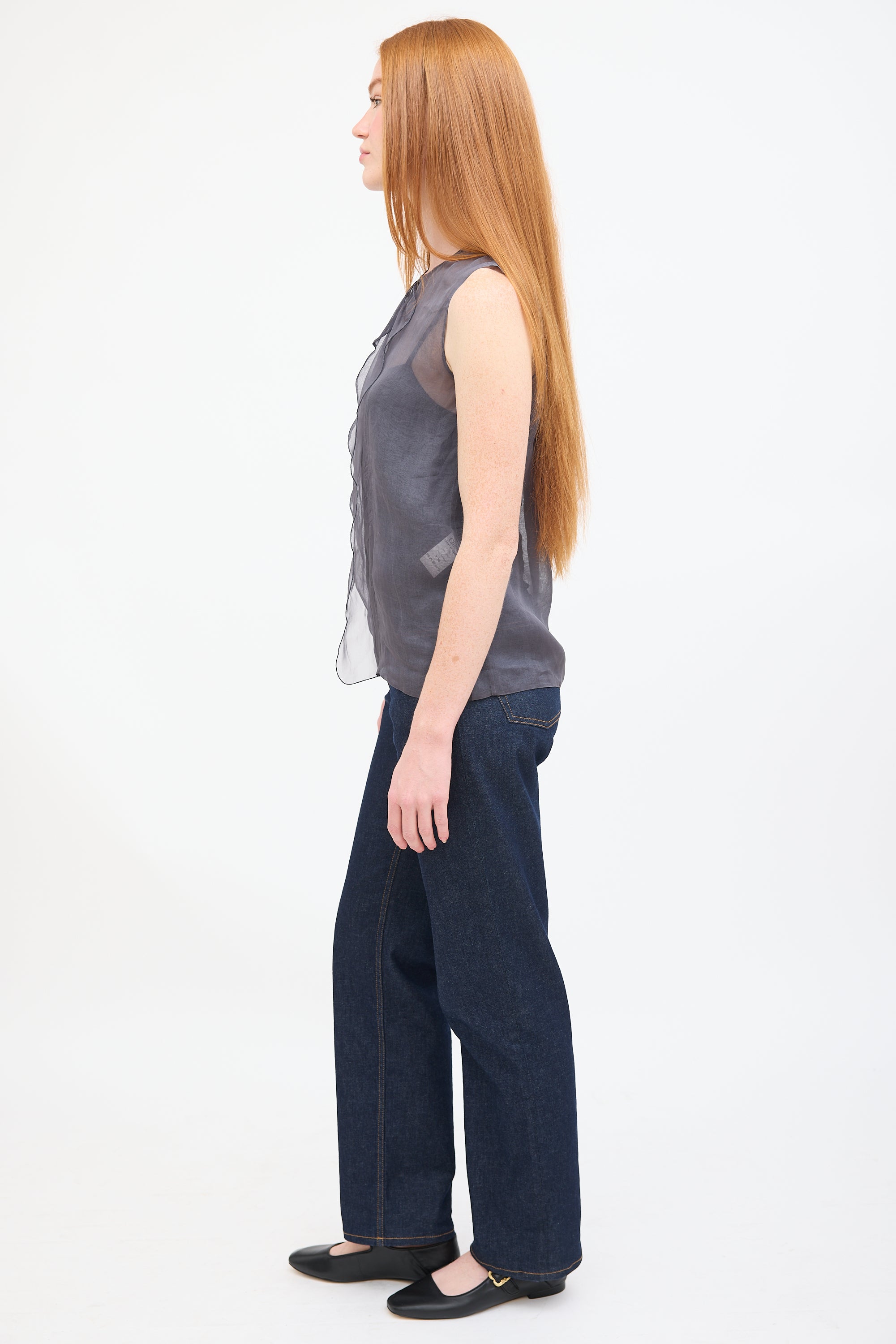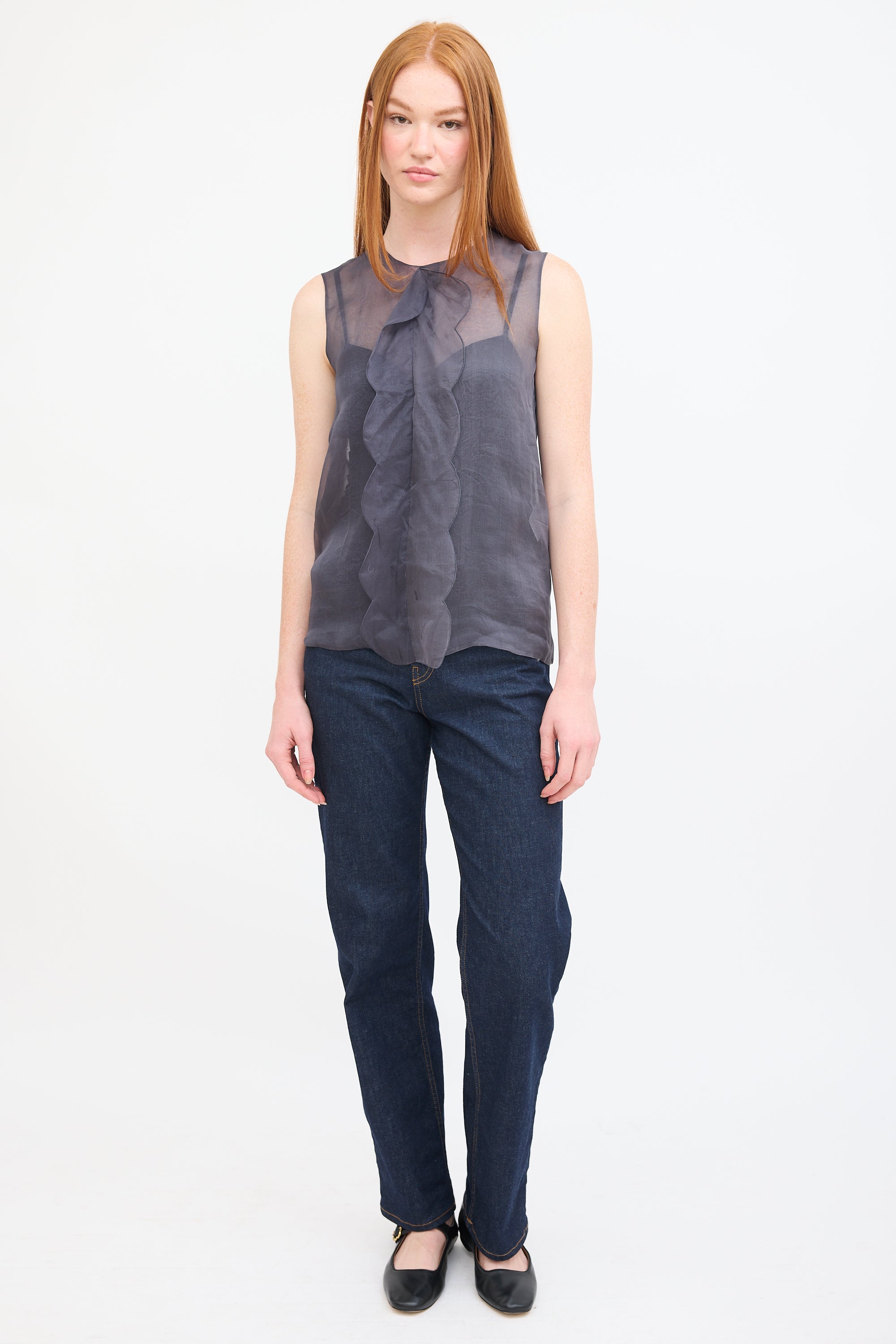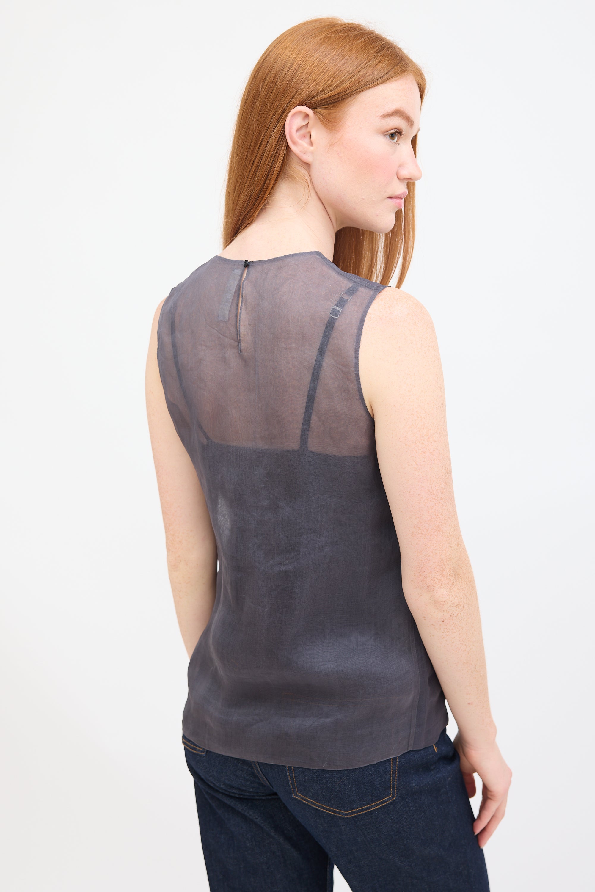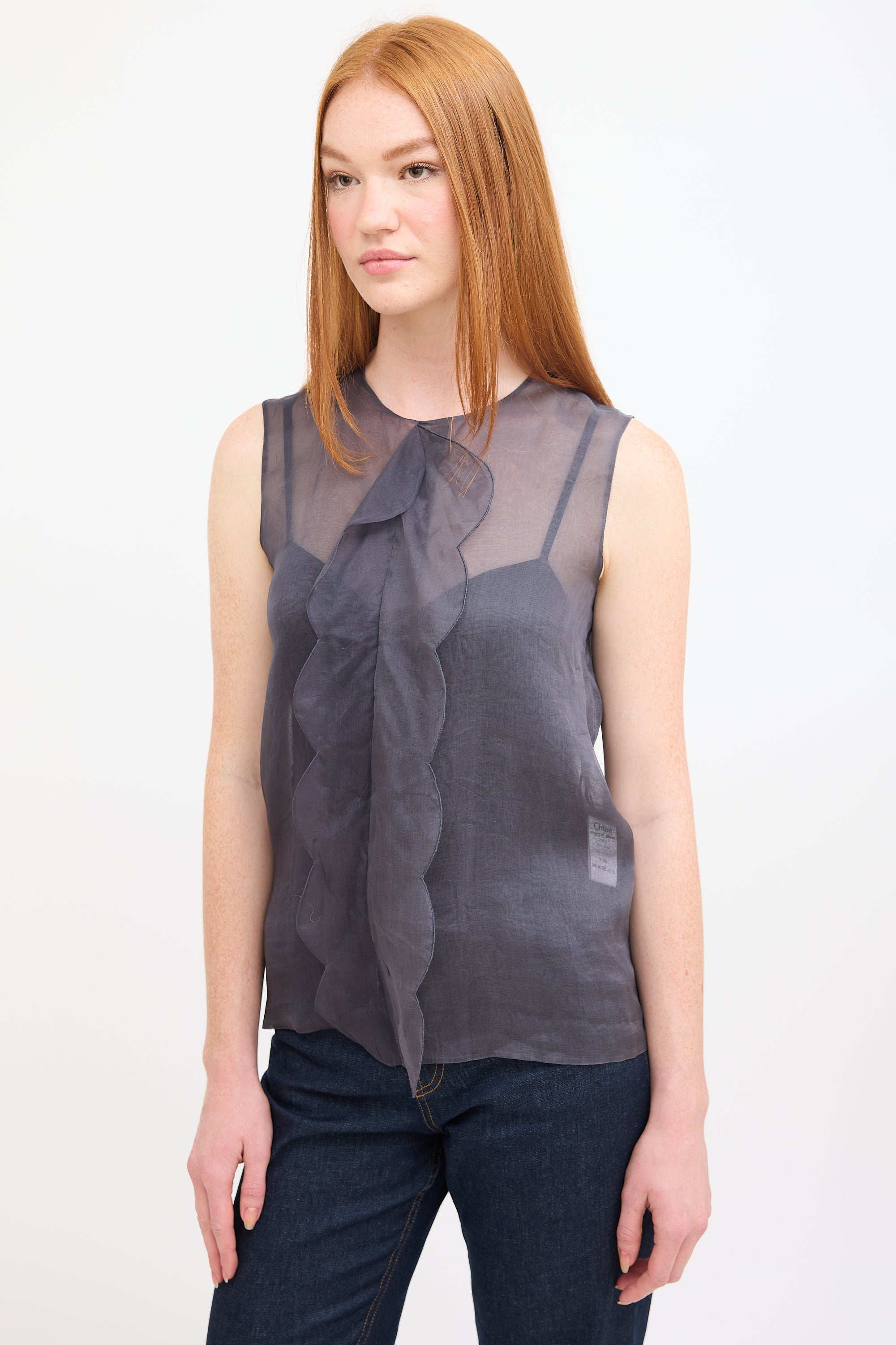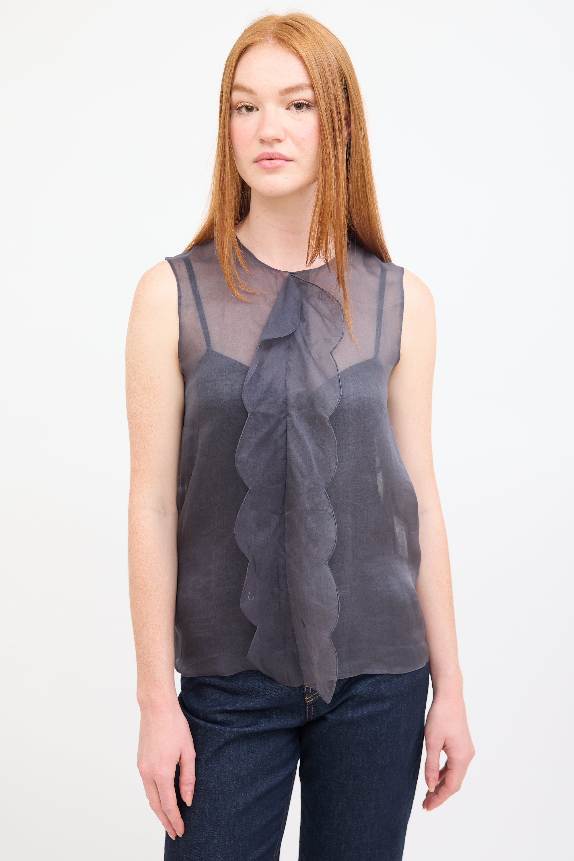 Pre-owned Chloé dark grey silk sheer sleeveless top featuring a round neckline, back single button neck fastening, and scalloped insert at centre front.