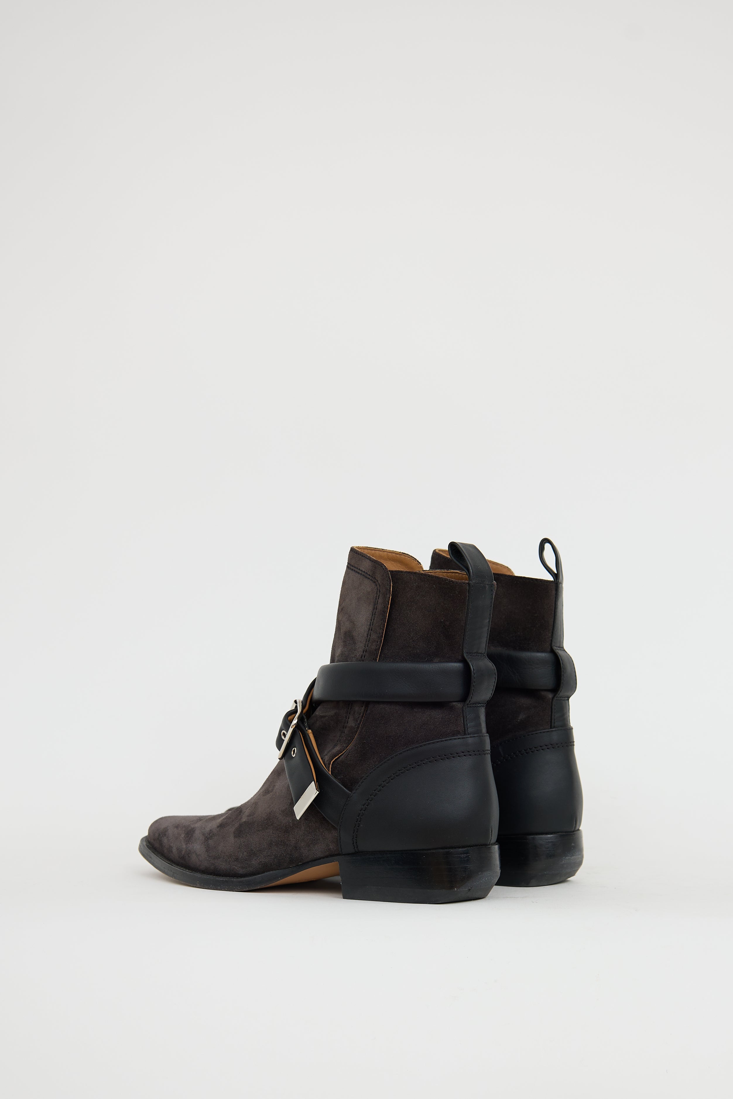 Pre-owned Chloé grey suede boots featuring a pointed toe, stacked block heel, pull tab at collar, and wrapped black buckle closure.