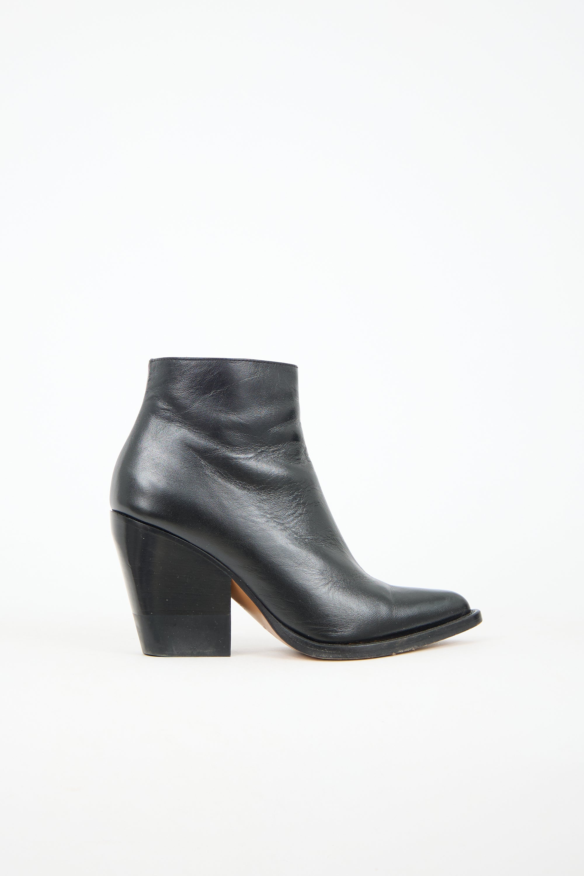 Pre-owned Chloé black leather Rylee ankle boots featuring pointed toe, inner side zip closure, silver tone zipper pull tab with debossed logo, and black block heel. Comes with original box and dust bags.