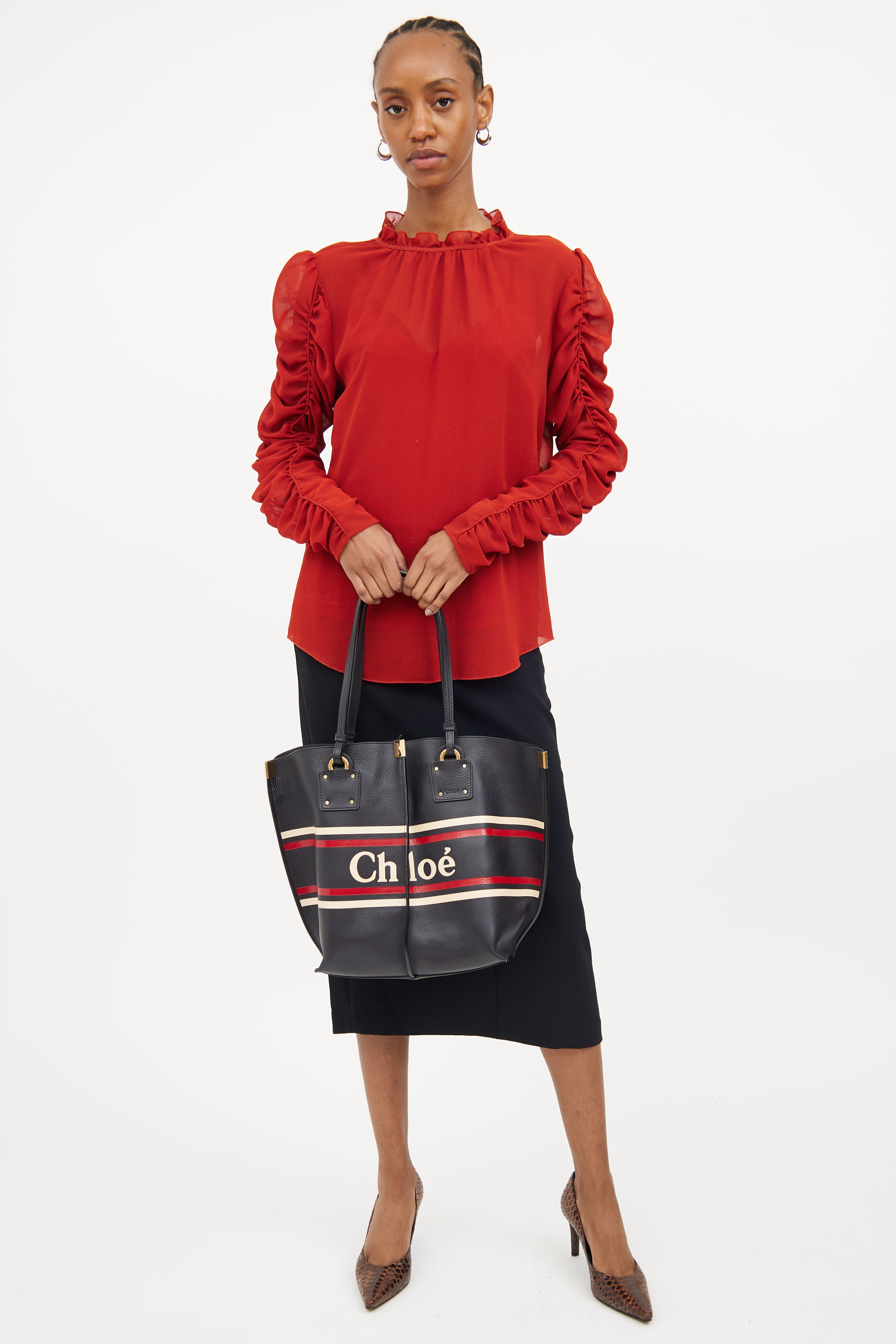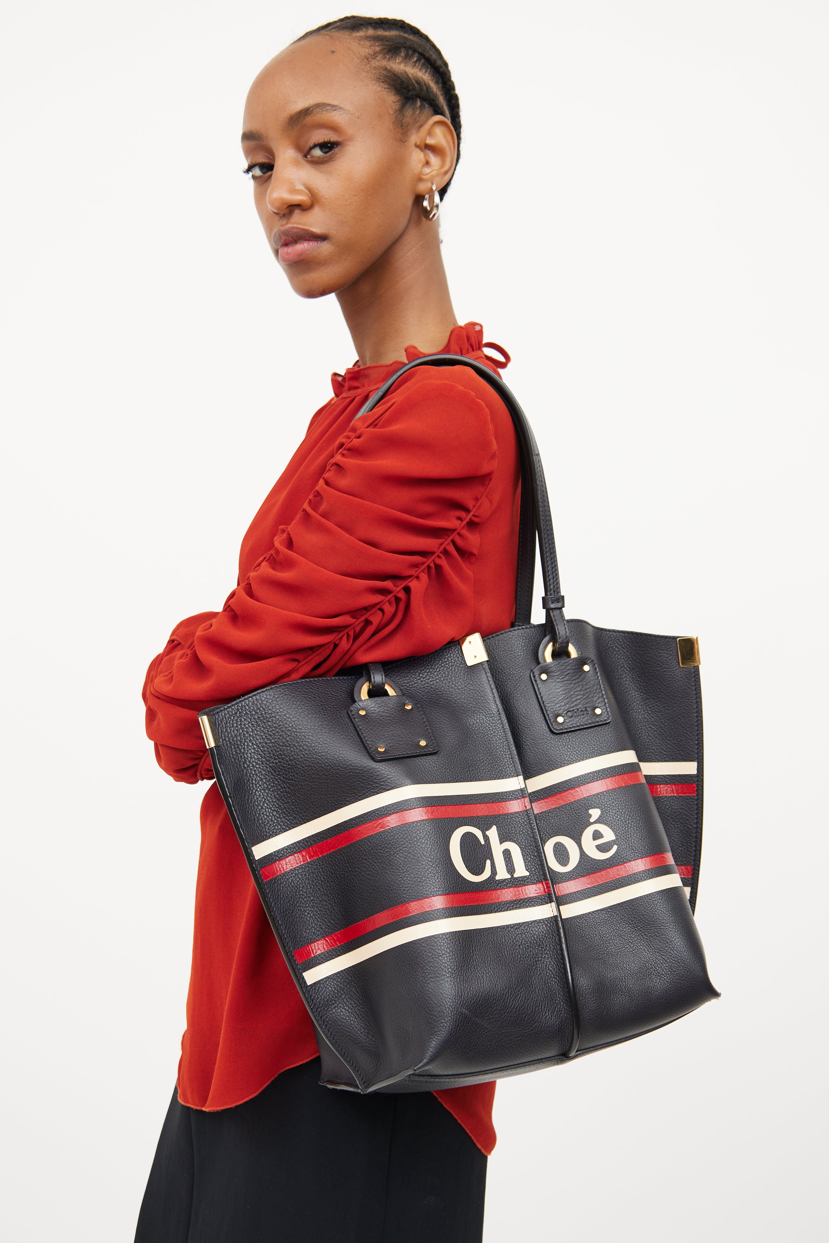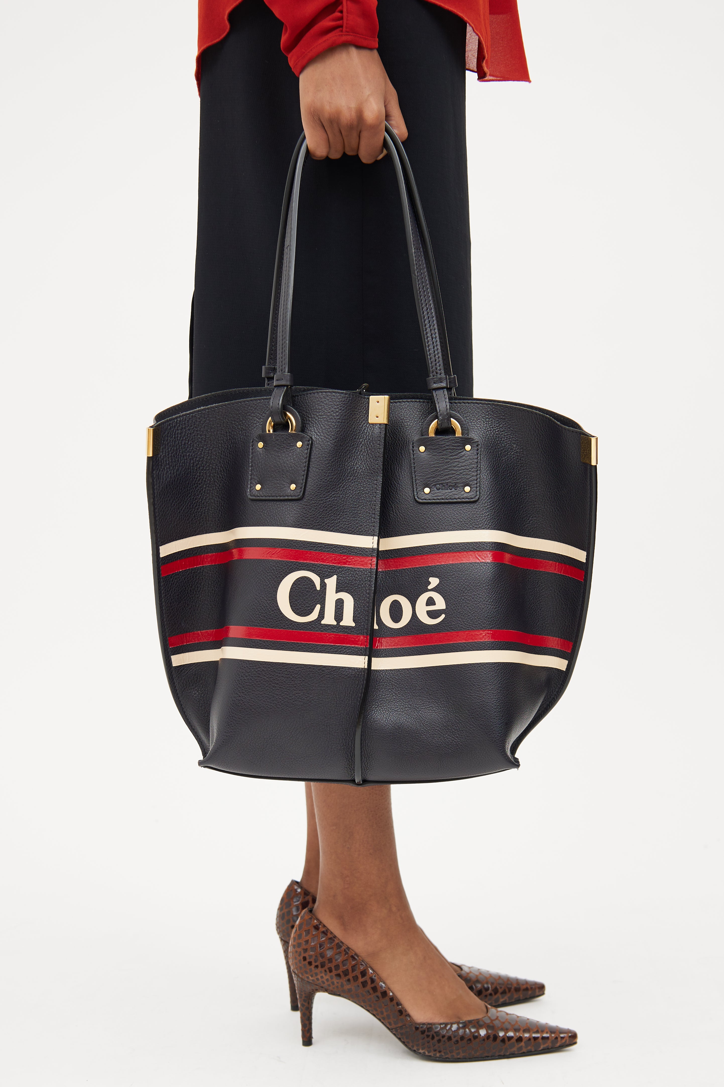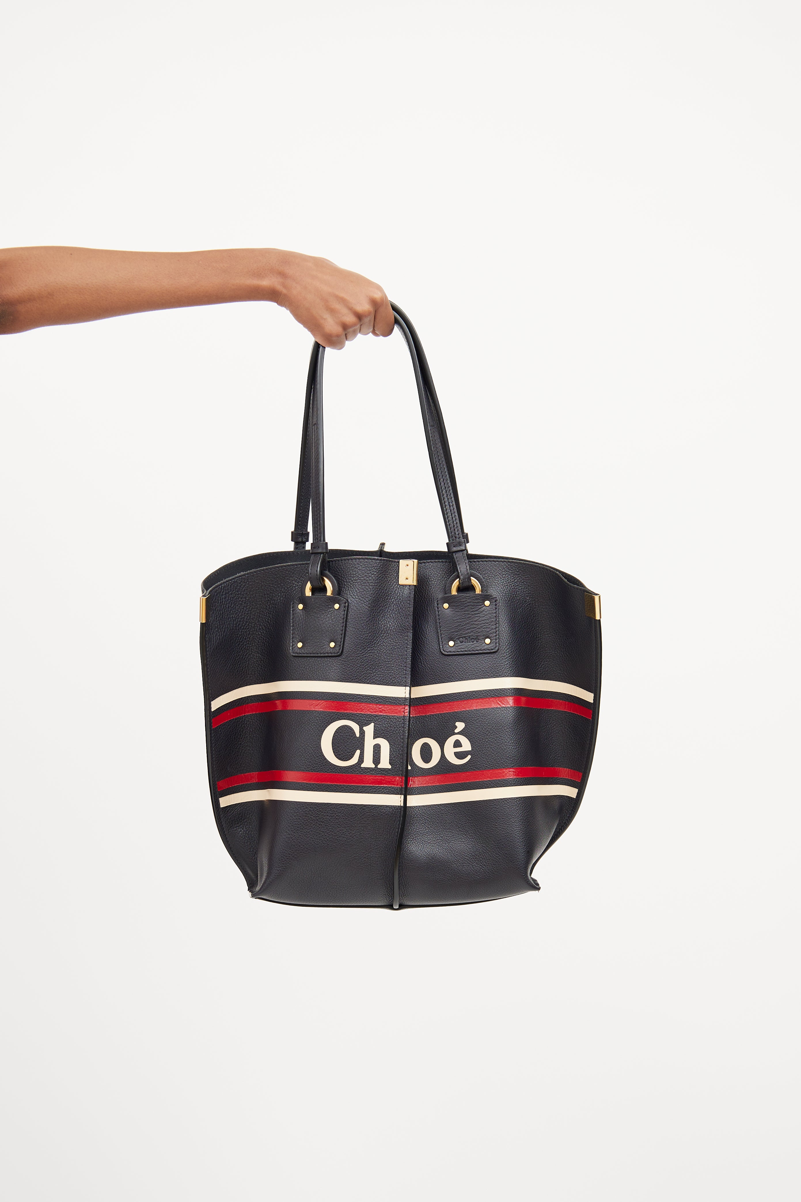 Pre-owned Chloé navy Vick tote bag featuring dual flat top handles, gold tone hardware, centre seam on front and back, logo text with white and red striping and snap button closure top. One main compartment and single zip closure pouch.