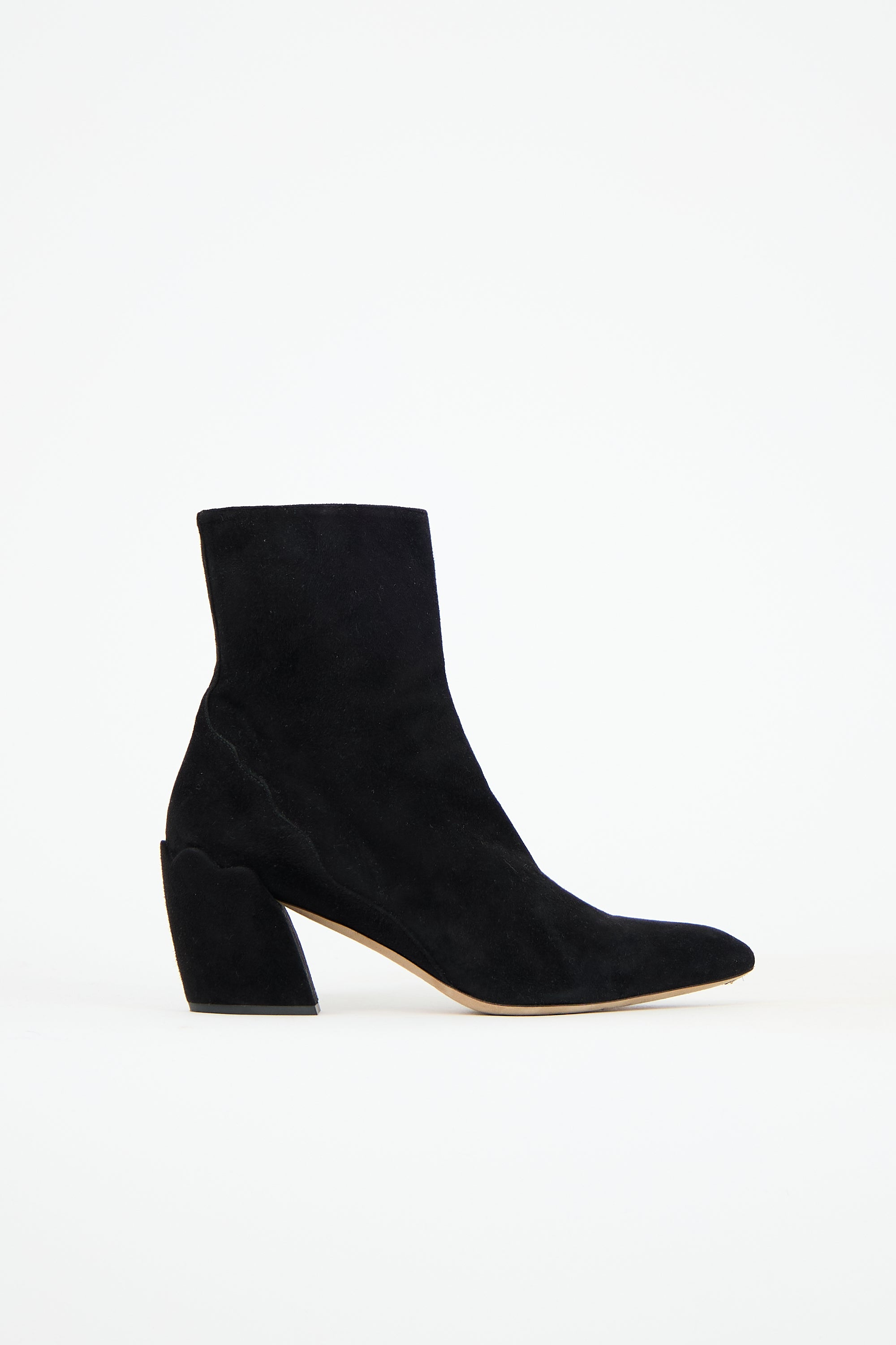 Pre-owned Chloé black suede boots featuring pointed toe, side zip closure, scalloped detail at counter, and block heel. Comes with original dust bag.