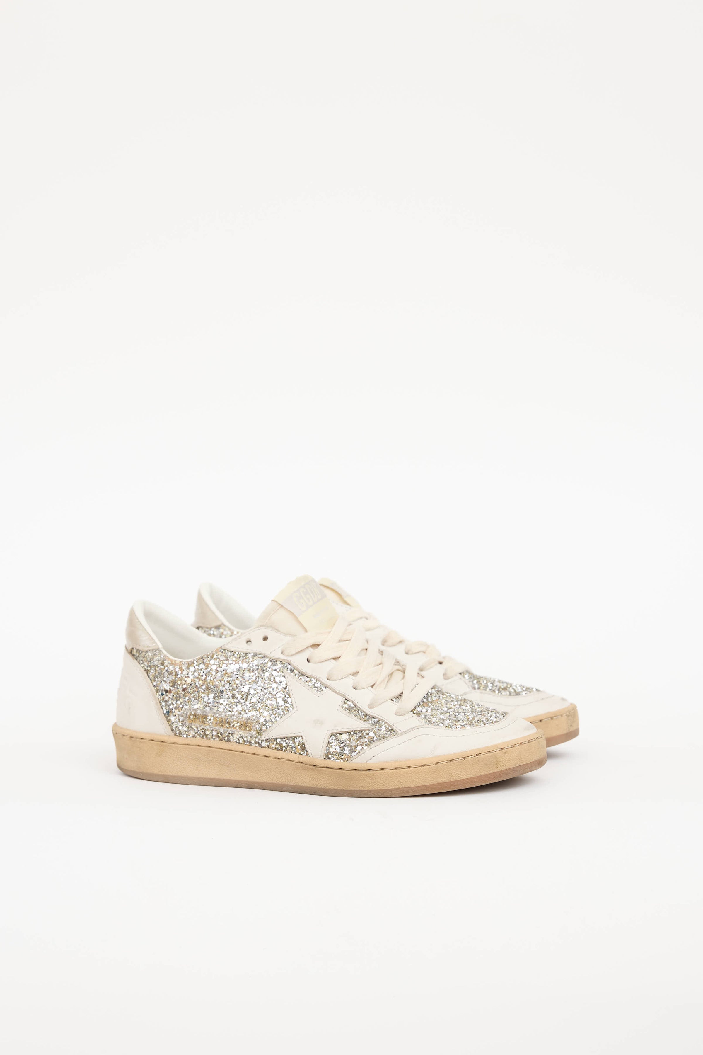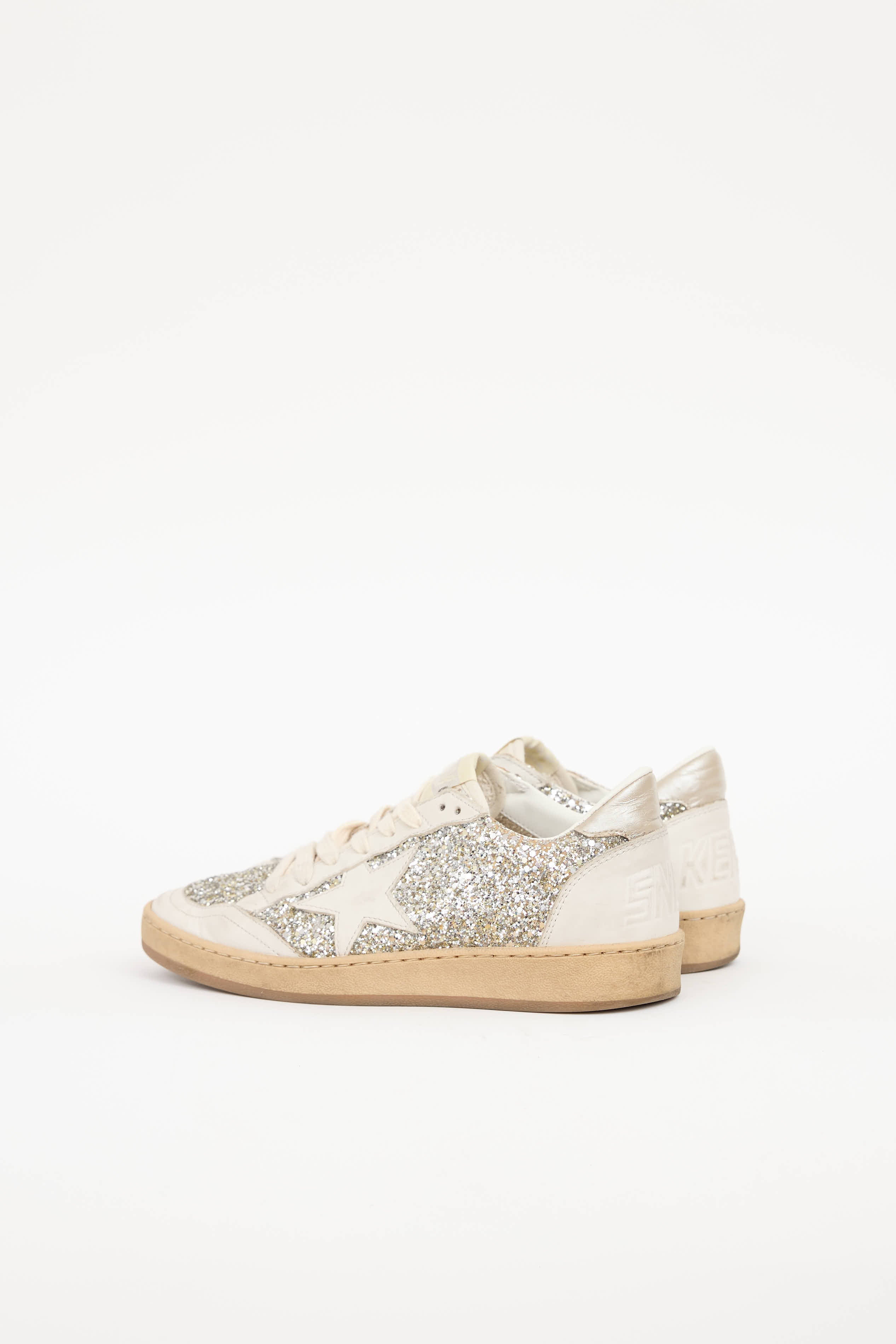 Pre-owned Golden Goose white and silver Ballstar sneaker featuring round toe, lace up front, leather star detail, and embossed "SNEA" AND "KERS" lettering at counter.