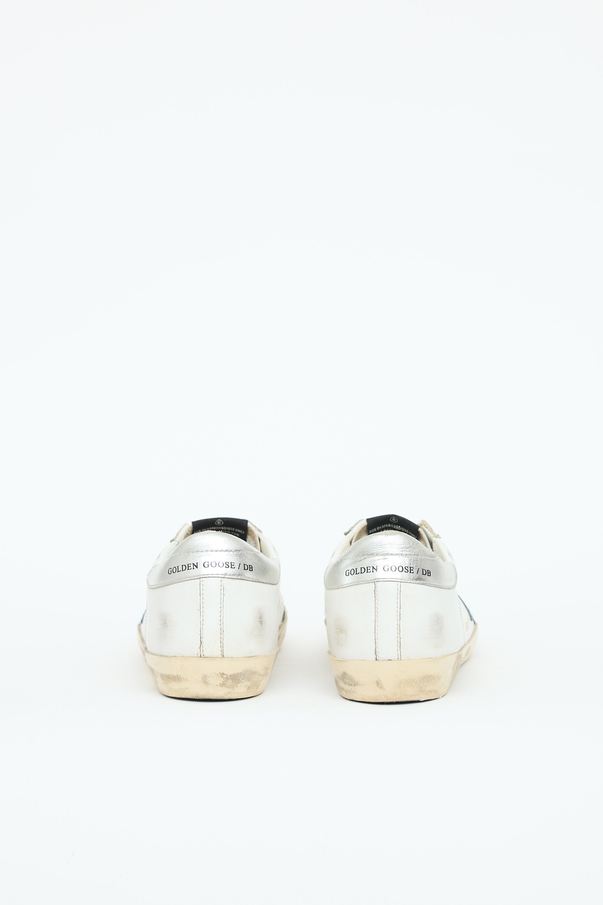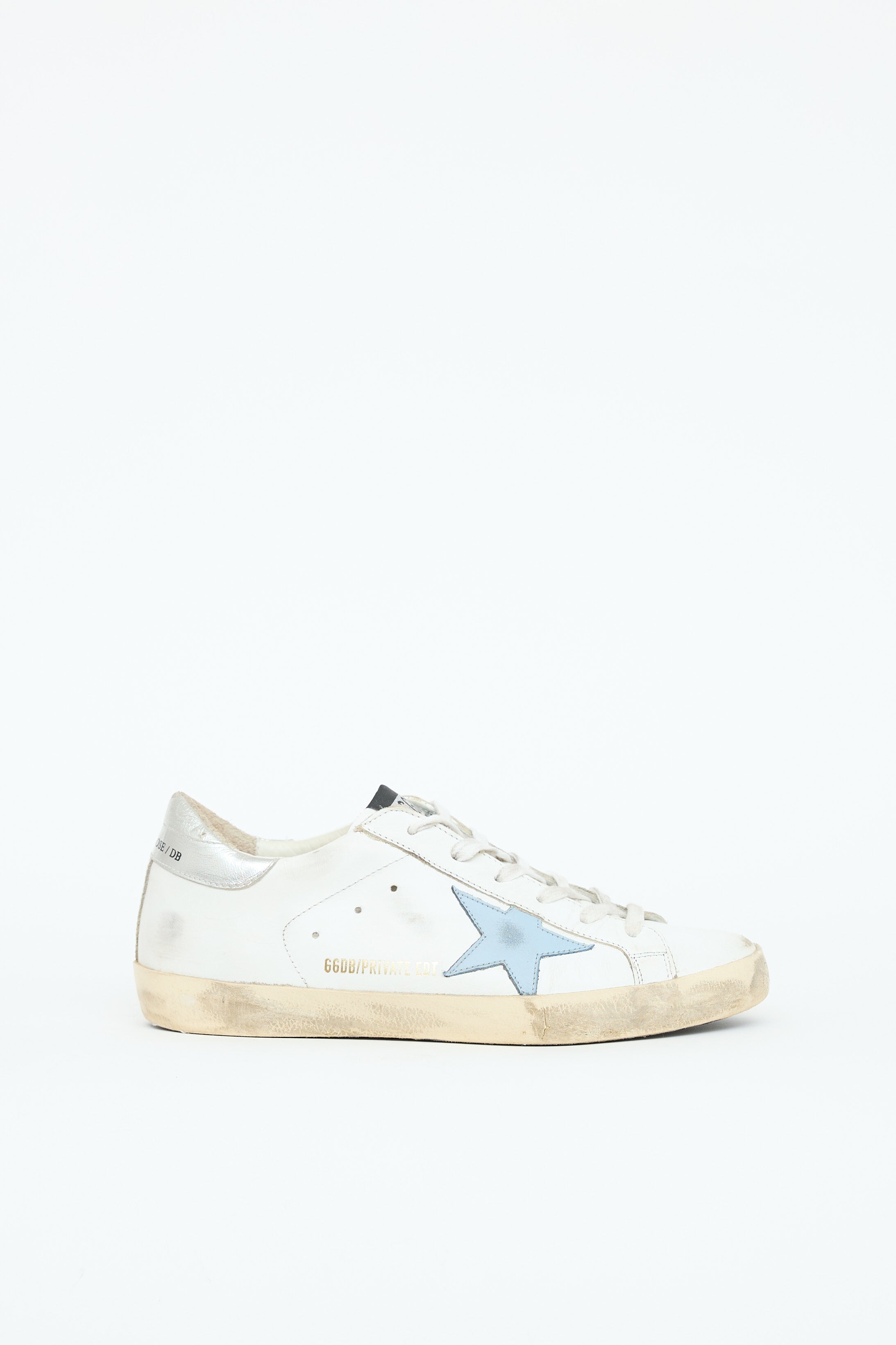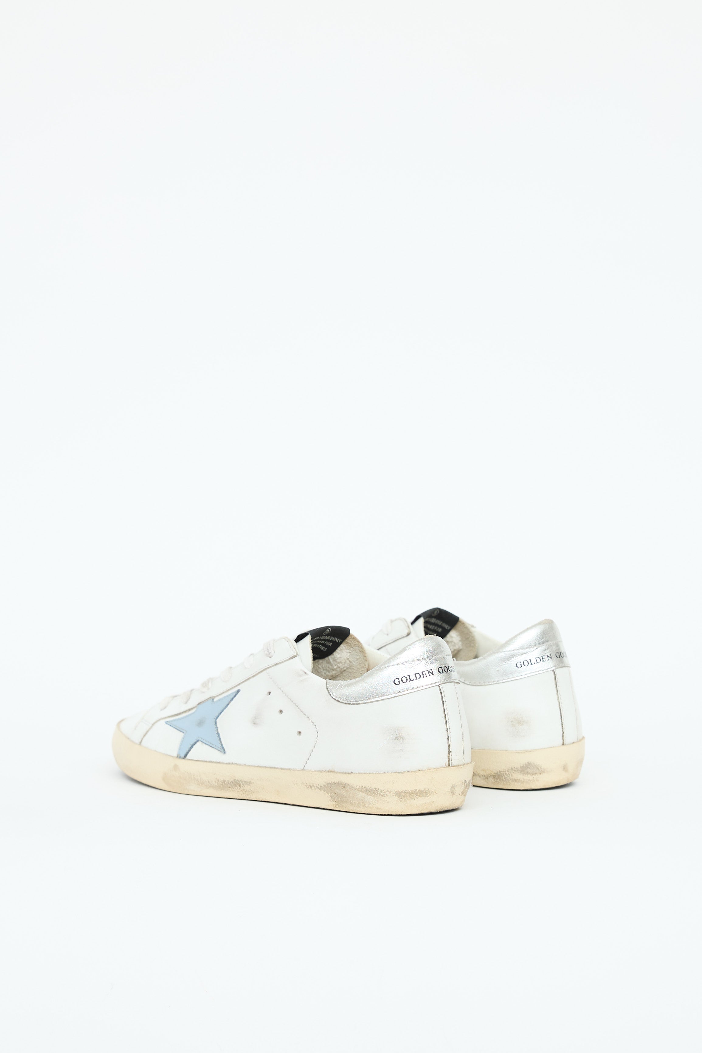 Pre-owned Golden Goose white and blue leather Superstar sneakers featuring intentional distressing throughout, rounded toe, white lace up vamp, blue star at sides, and silver heel counter.