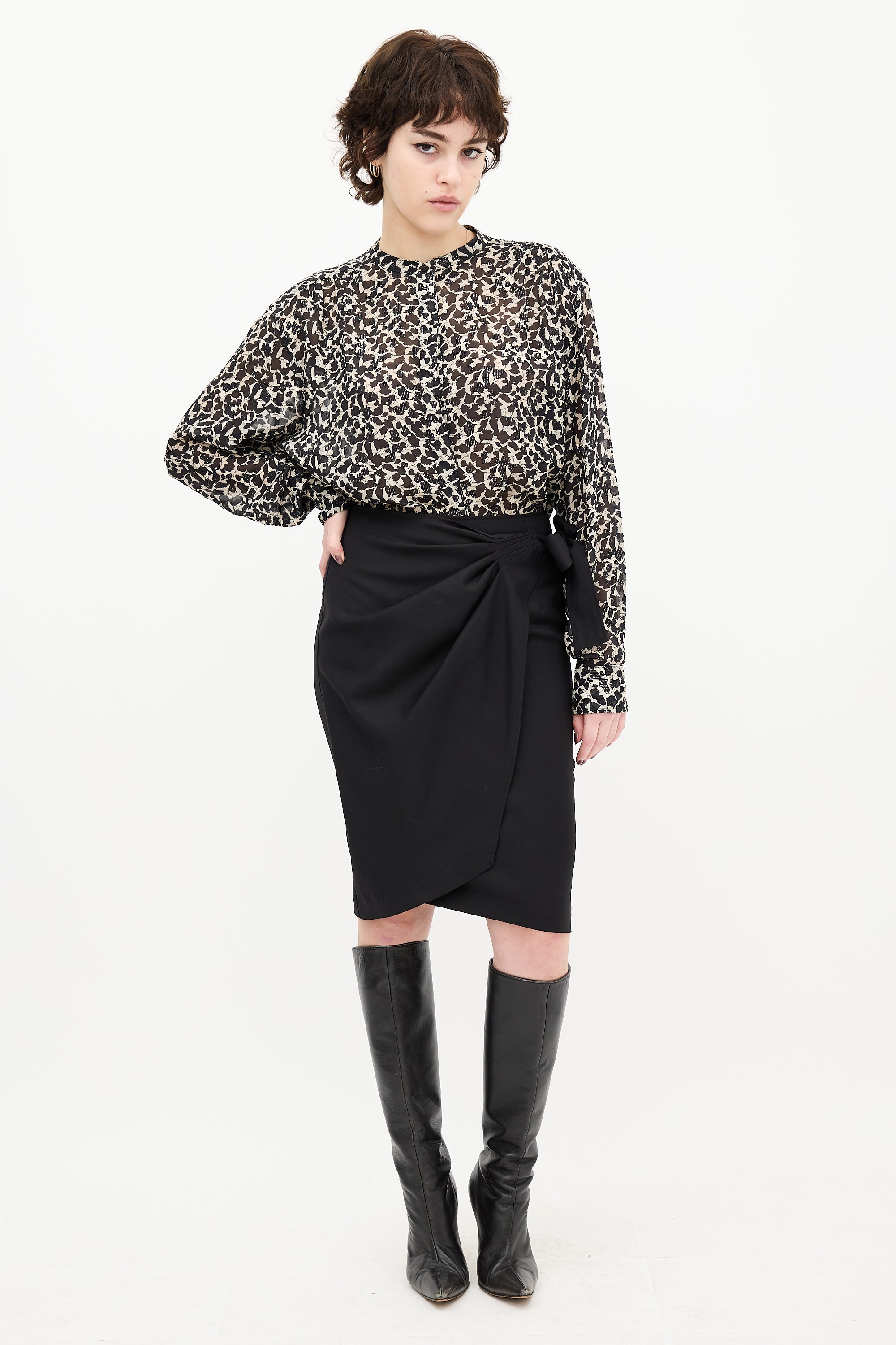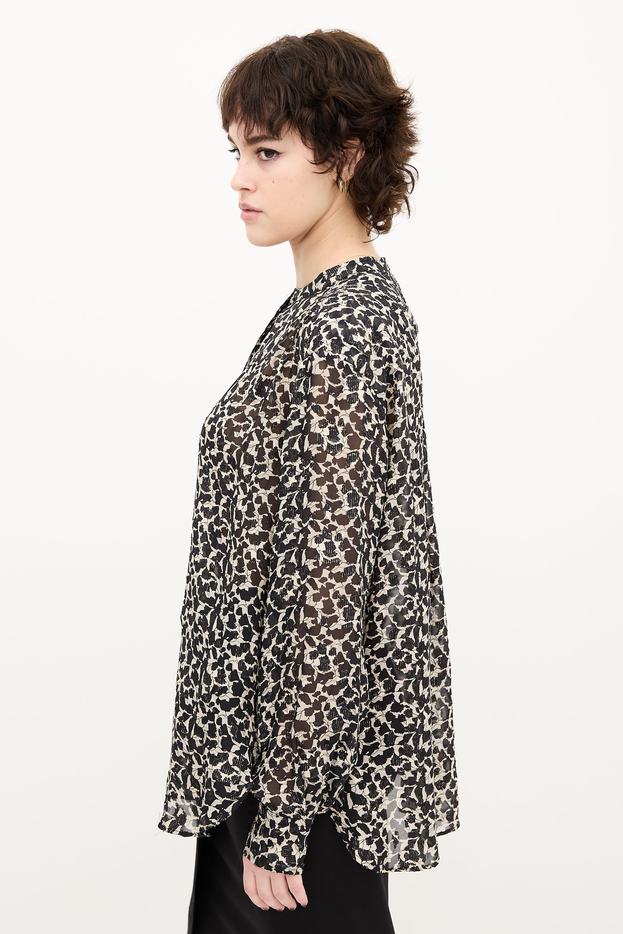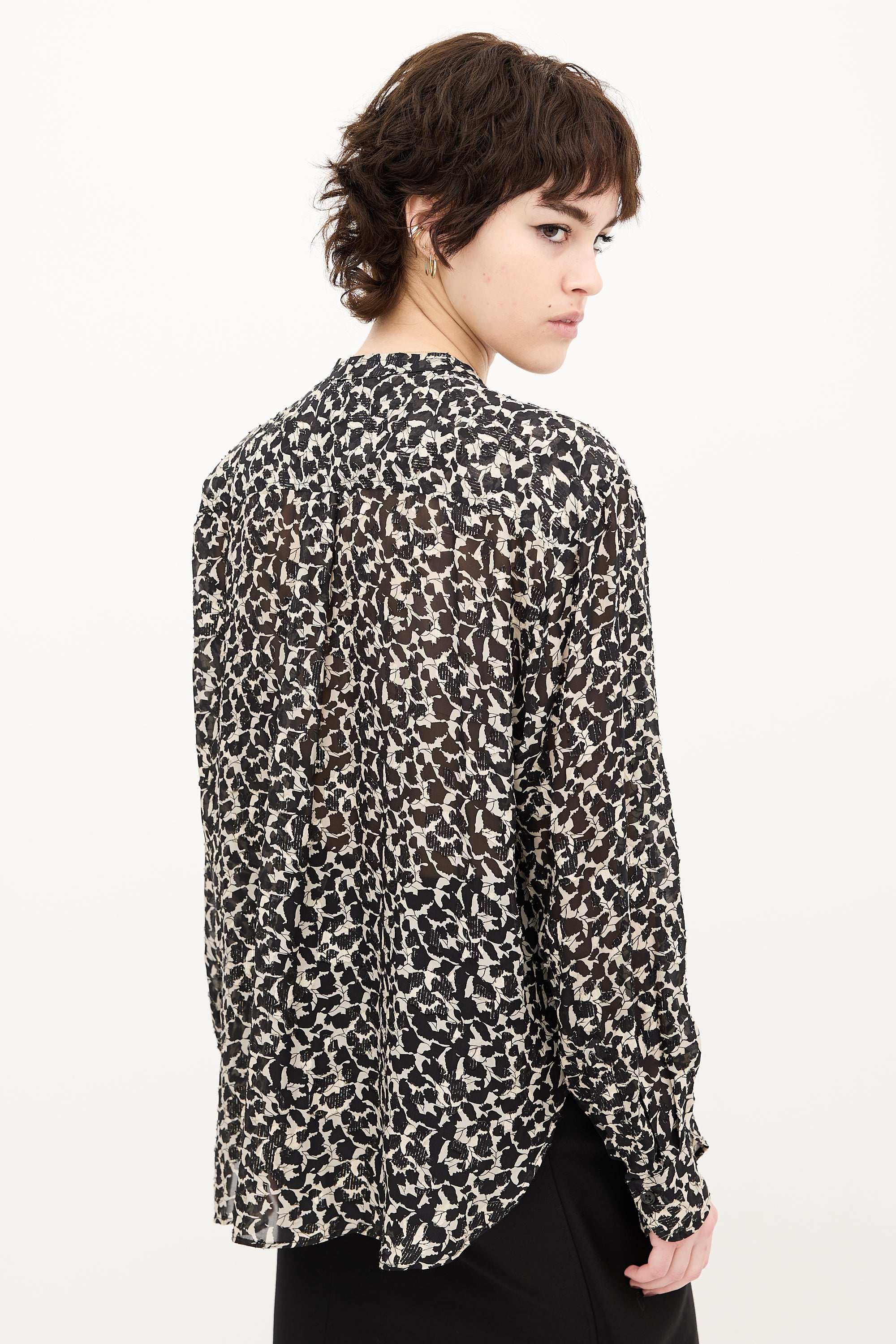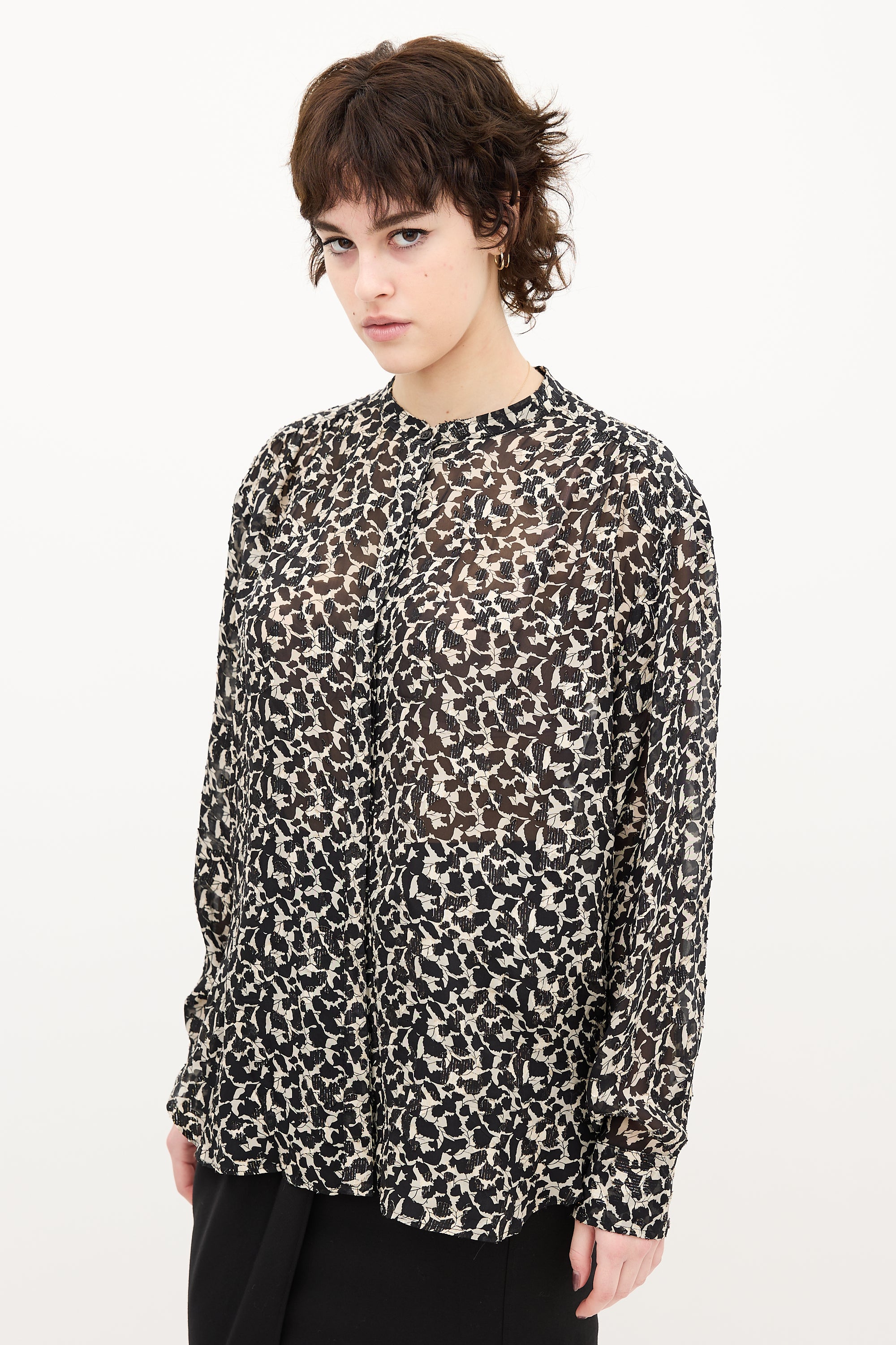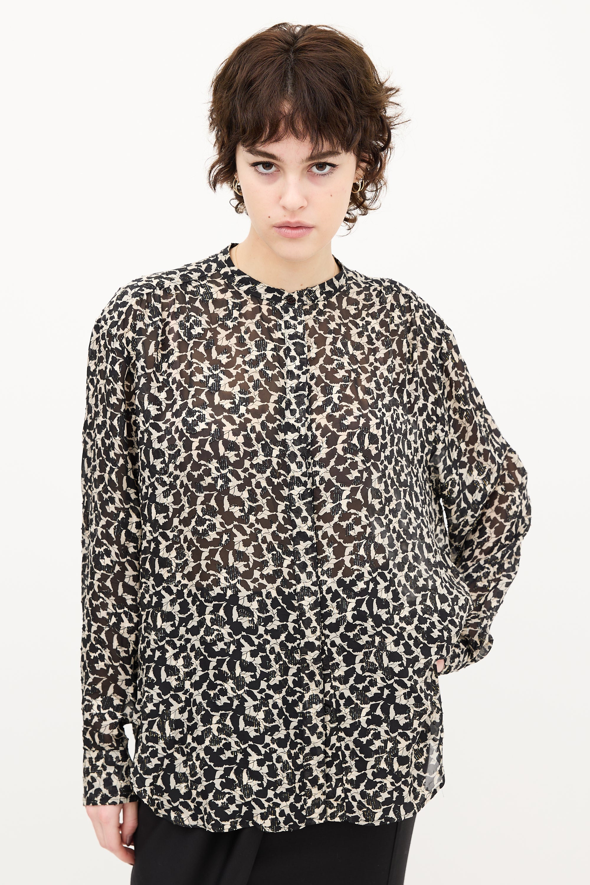 Pre-owned Isabel Marant black and beige sheer blouse featuring leaf print, stand collar, button up front, pleated shoulders, buttoned cuffs, and scoop hem.