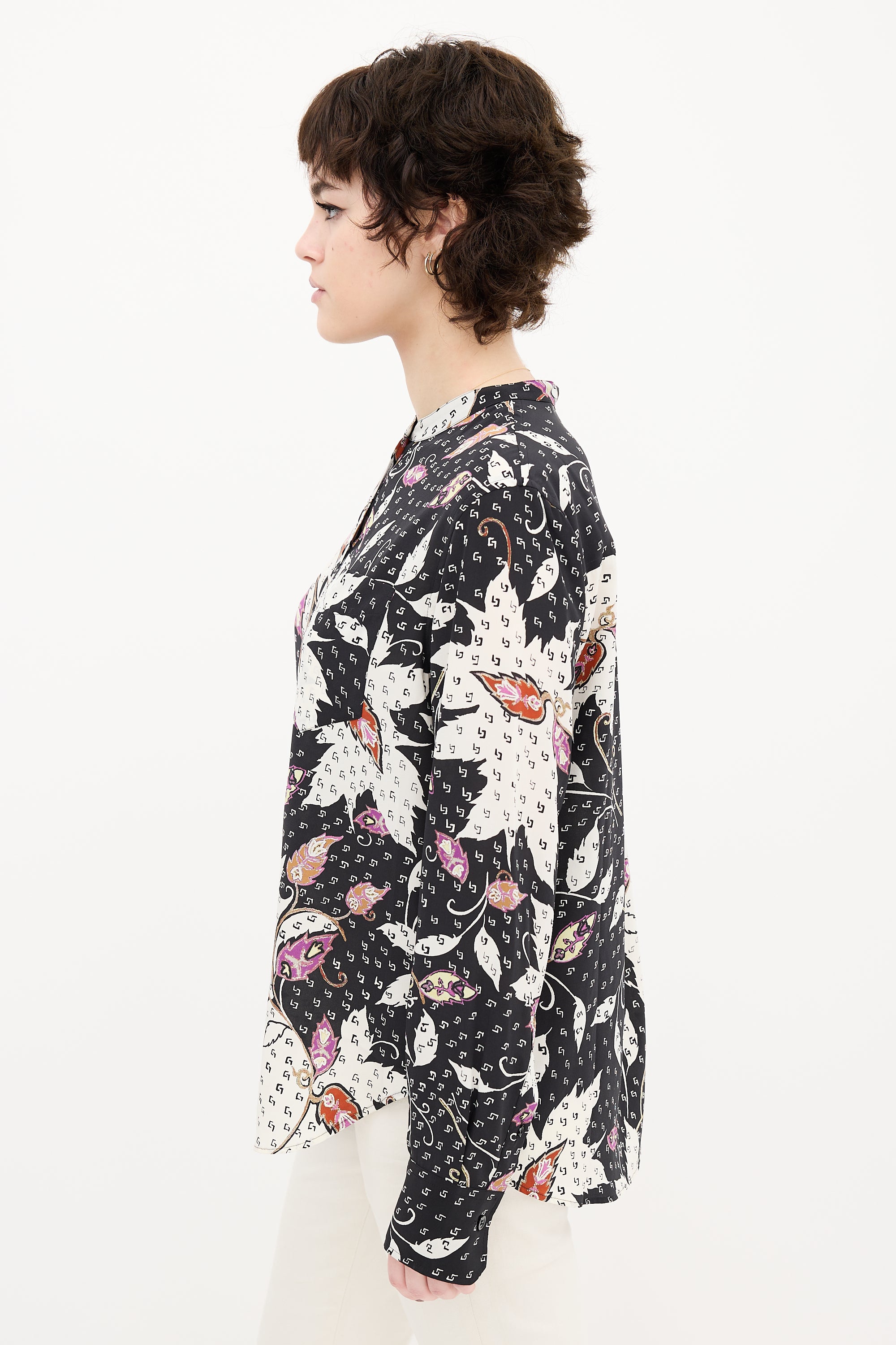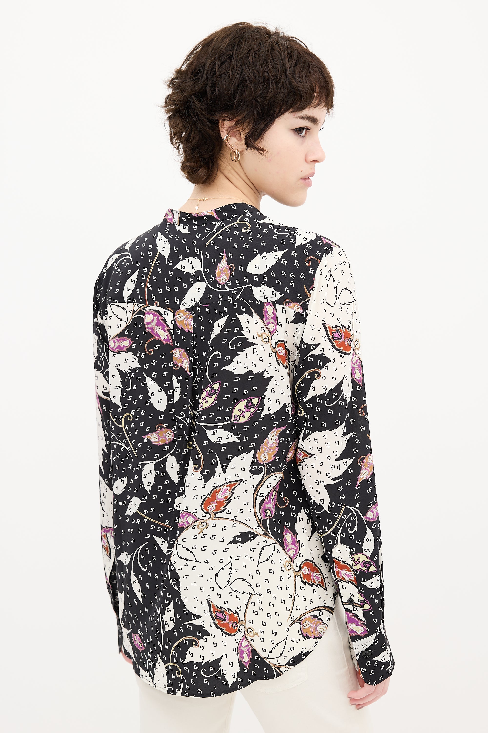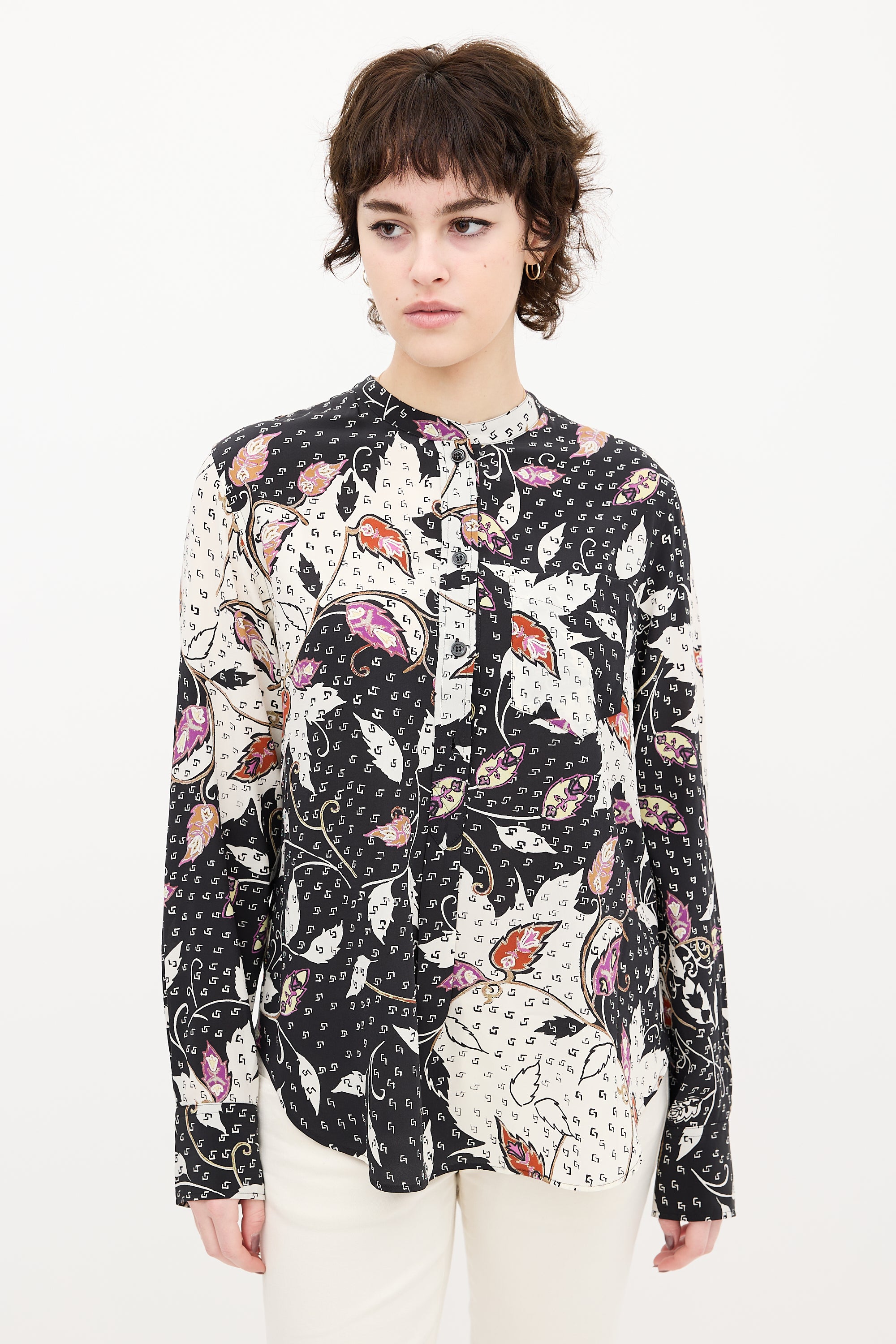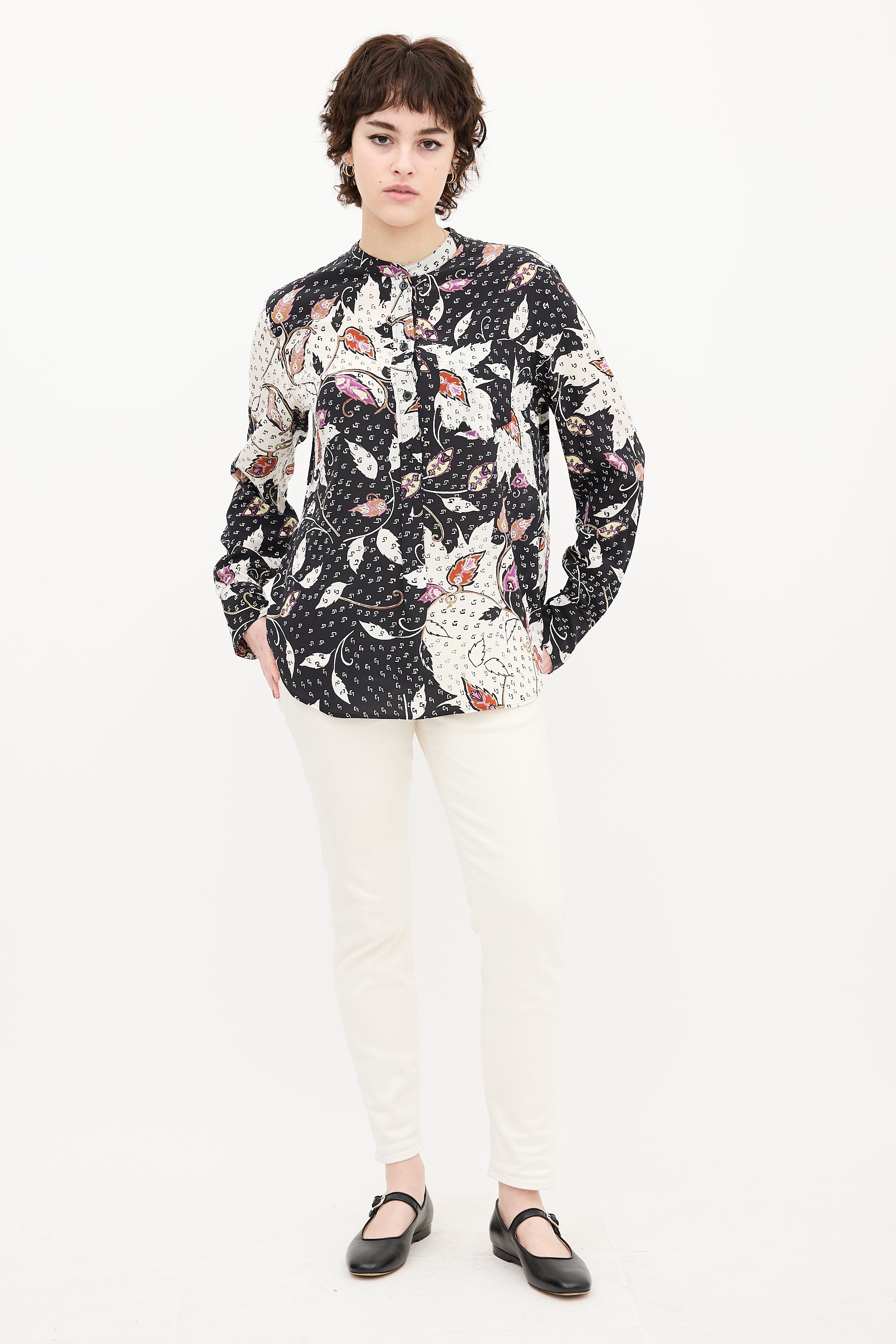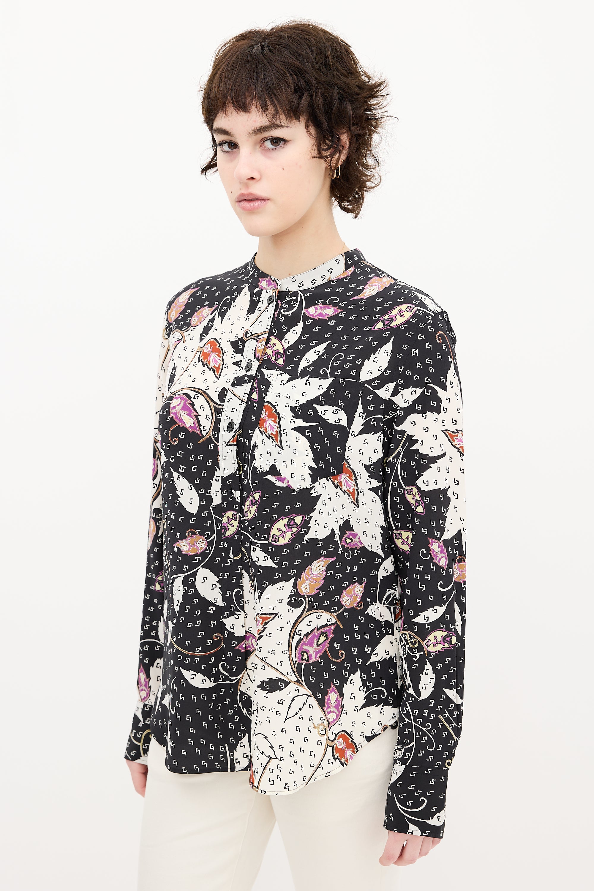 Pre-owned Isabel Marant black and multicolour silk shirt featuring stand collar, button up front, patch pocket at left chest, buttoned cuffs, back yoke pleat, and scoop hem.