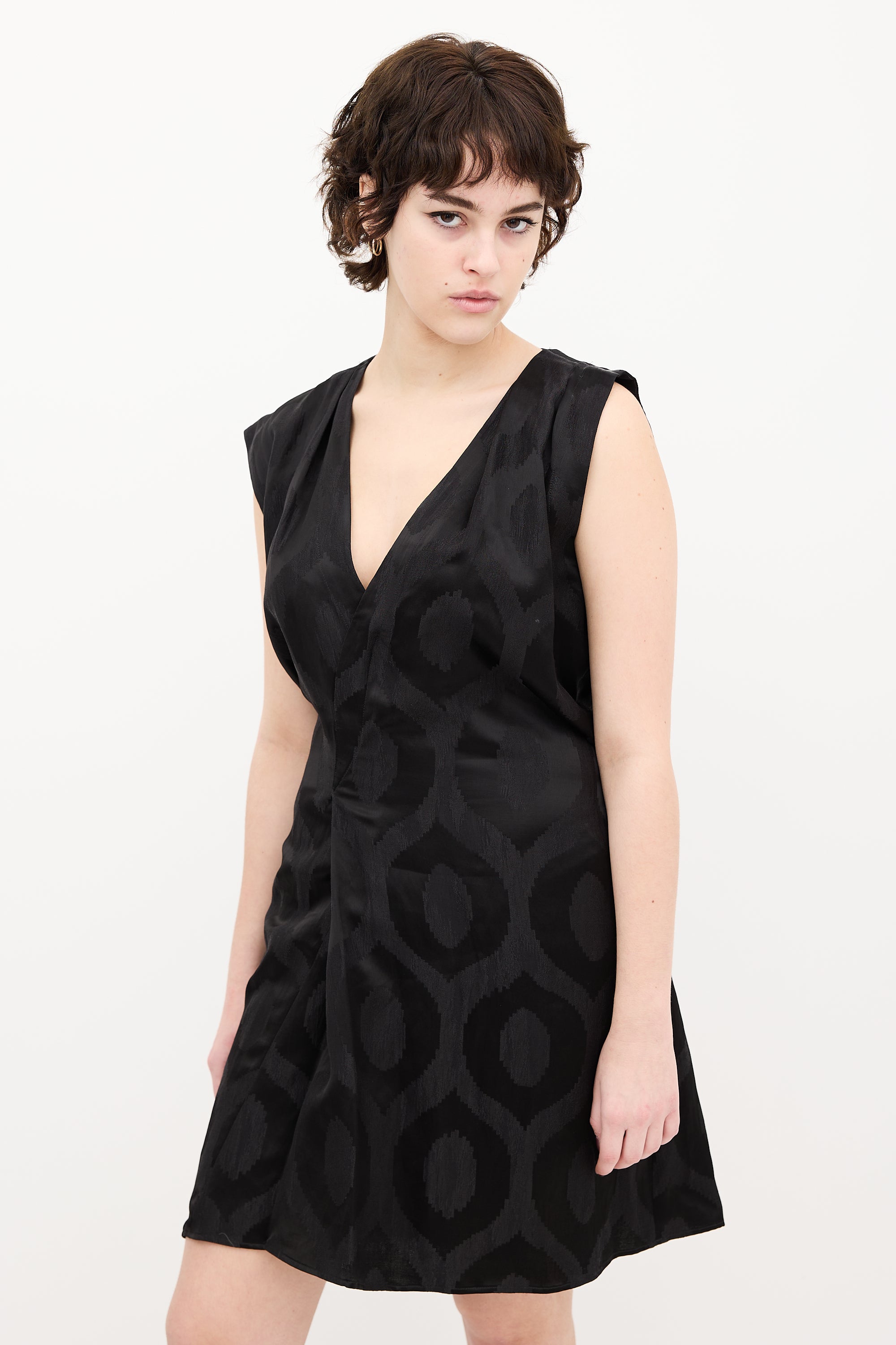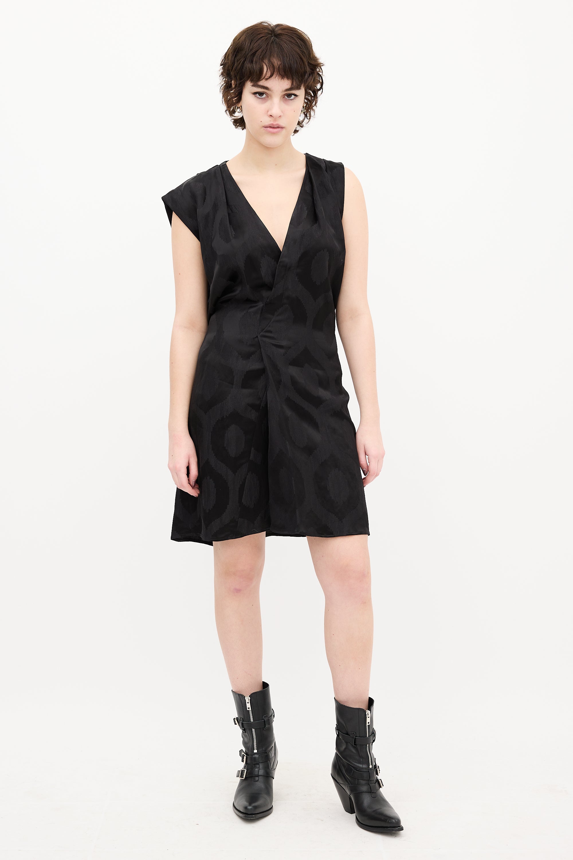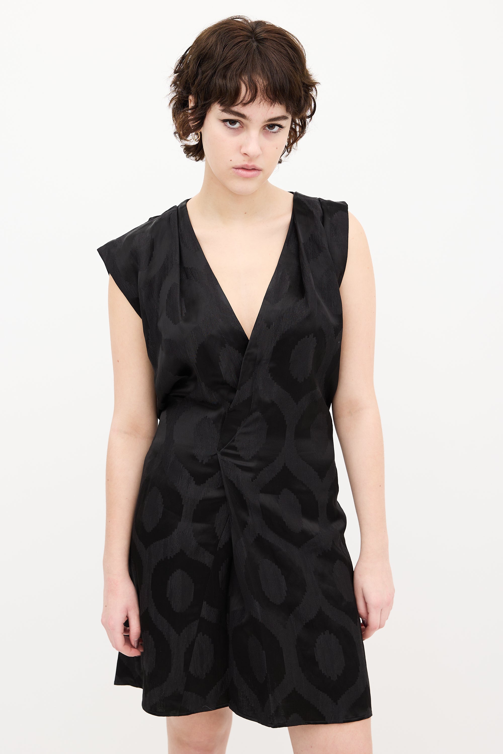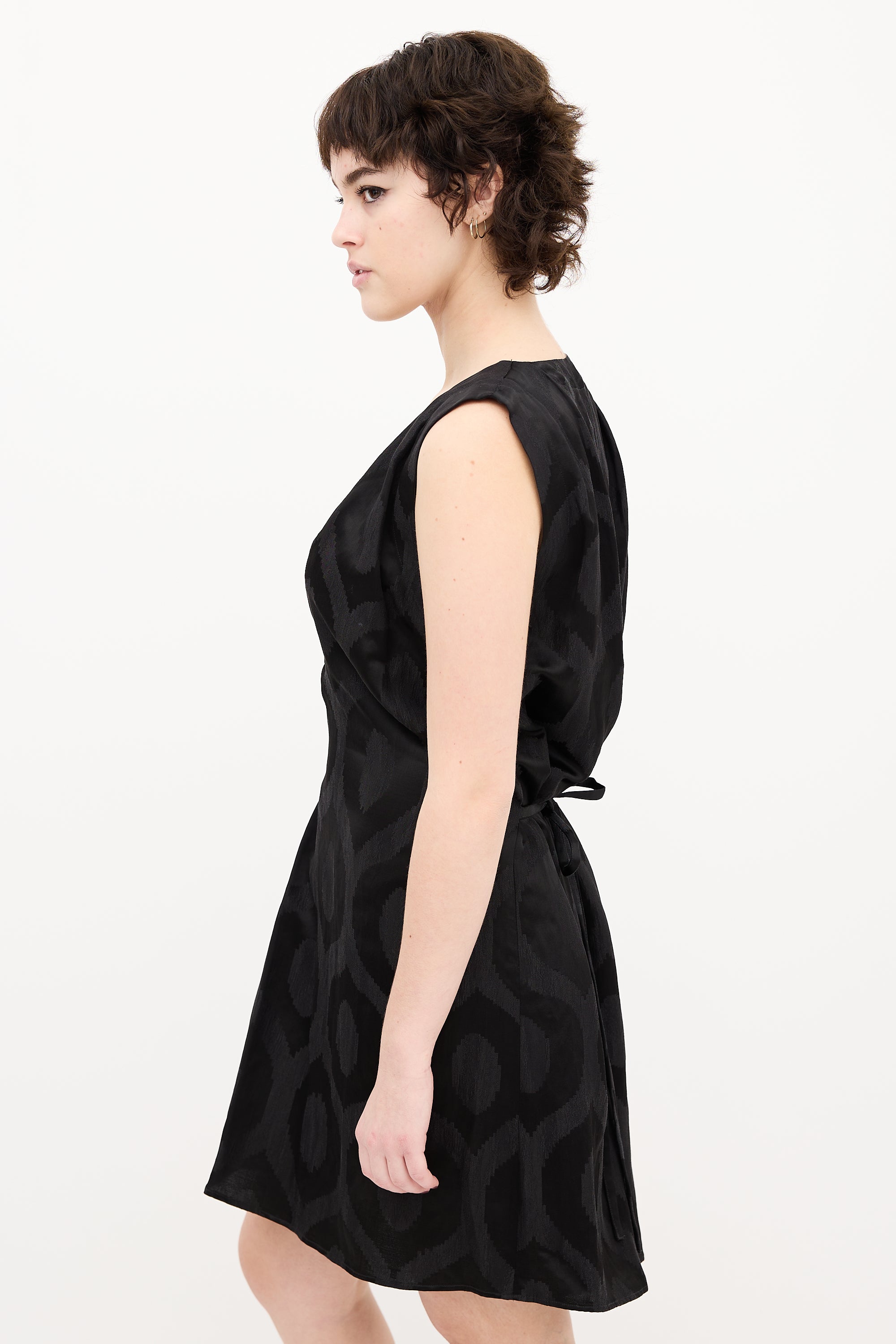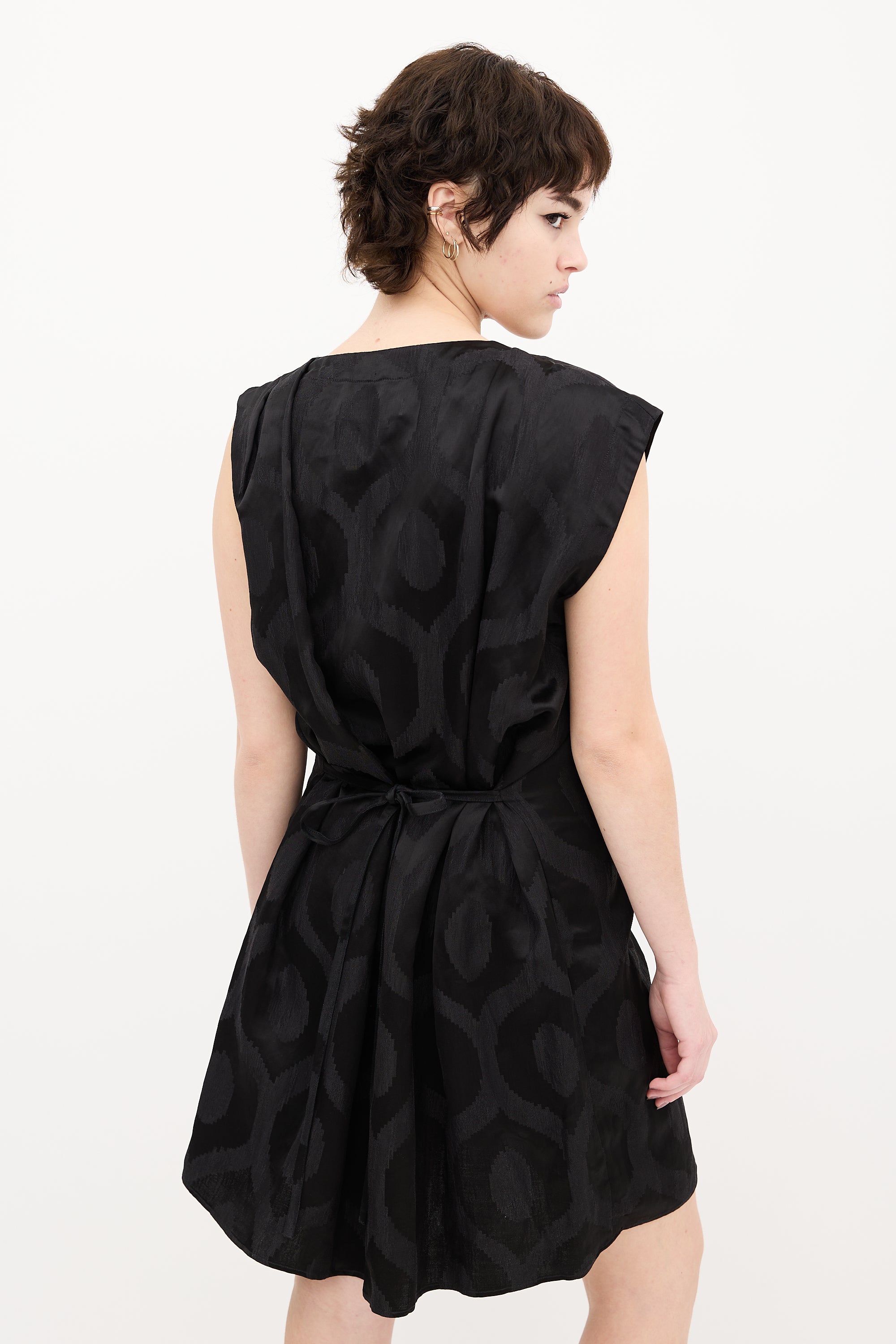 Pre-owned Isabel Marant black satin printed sleeveless dress featuring V-neckline, asymmetrical pleated shoulder, waist tie, and front pleat. Unlined.