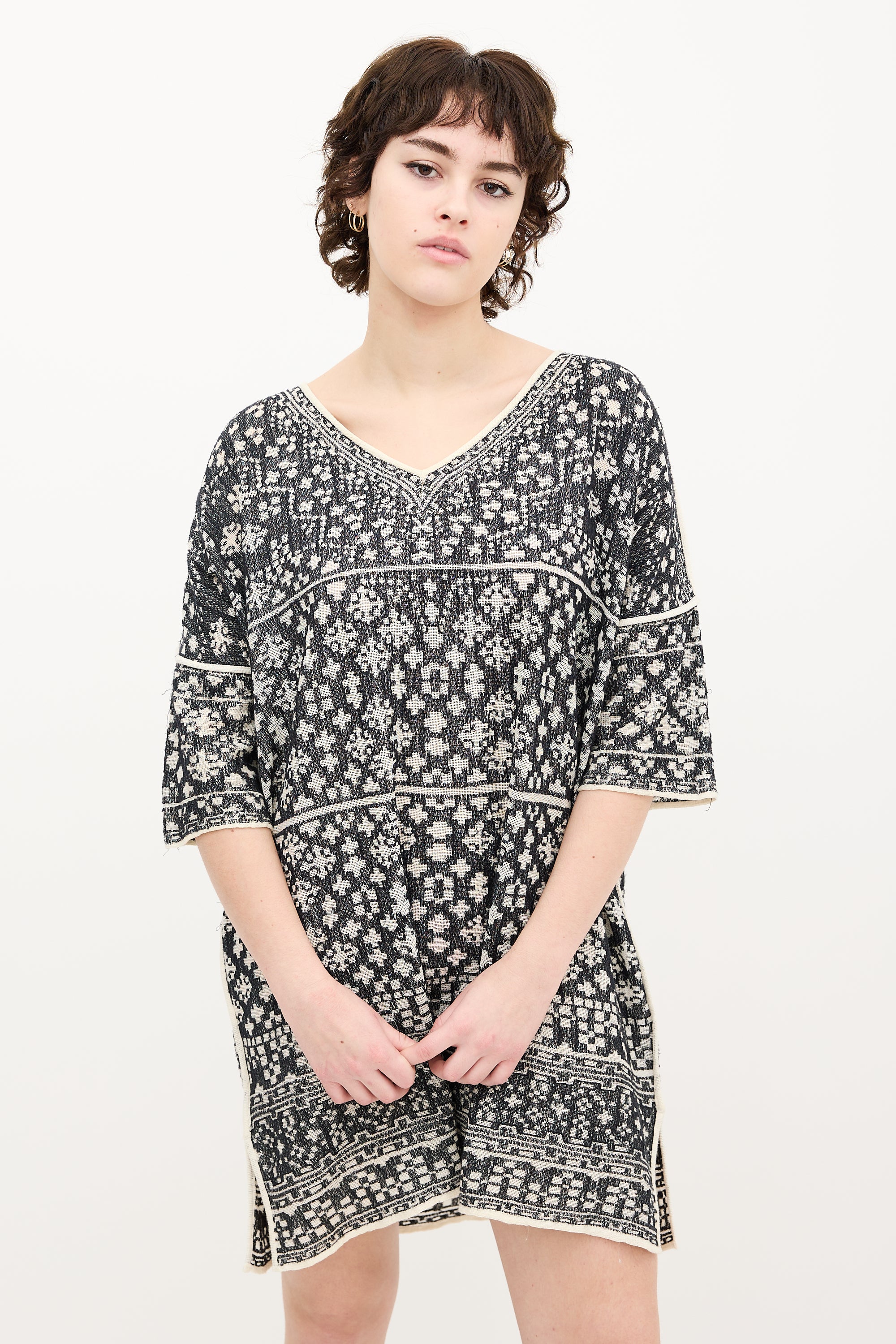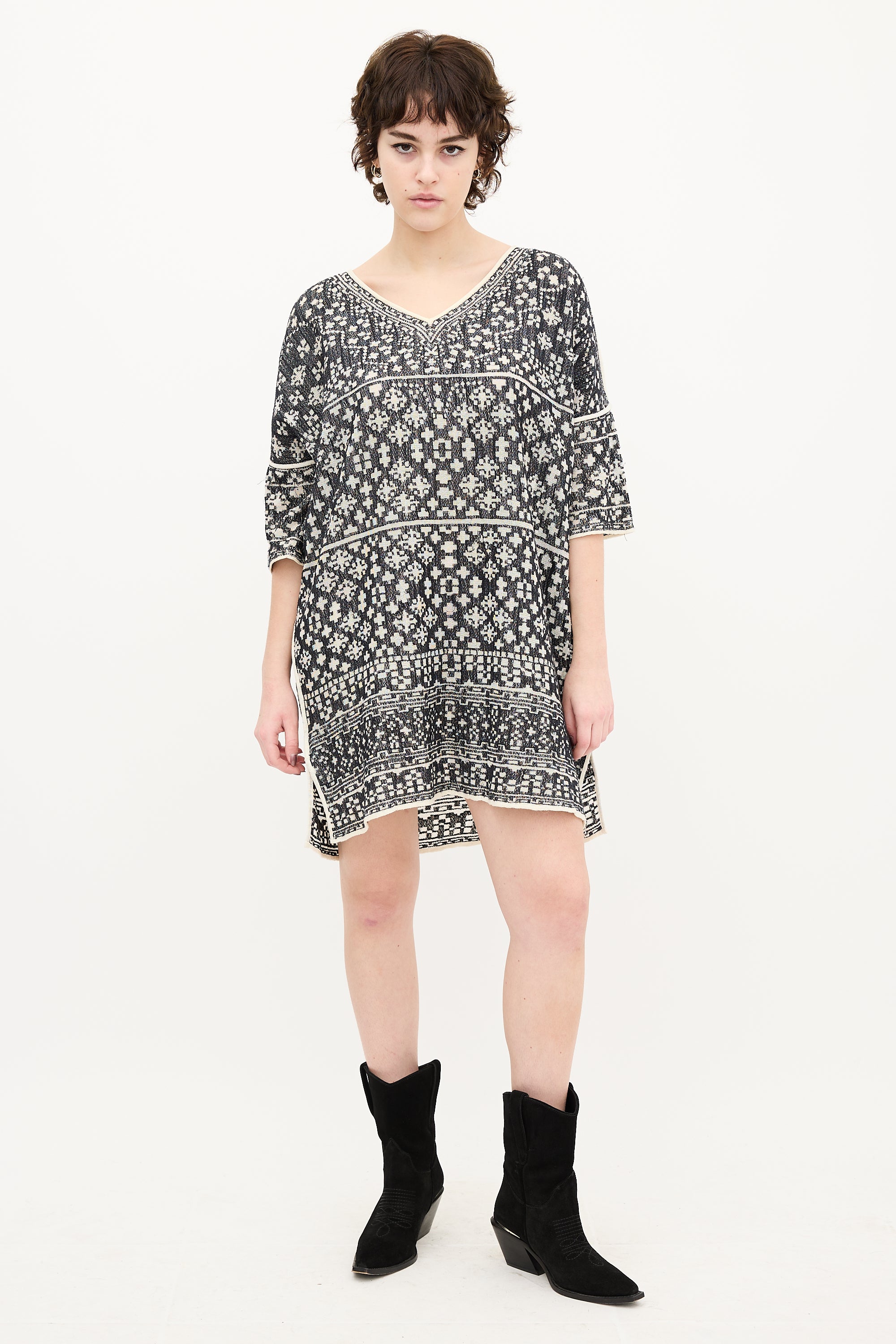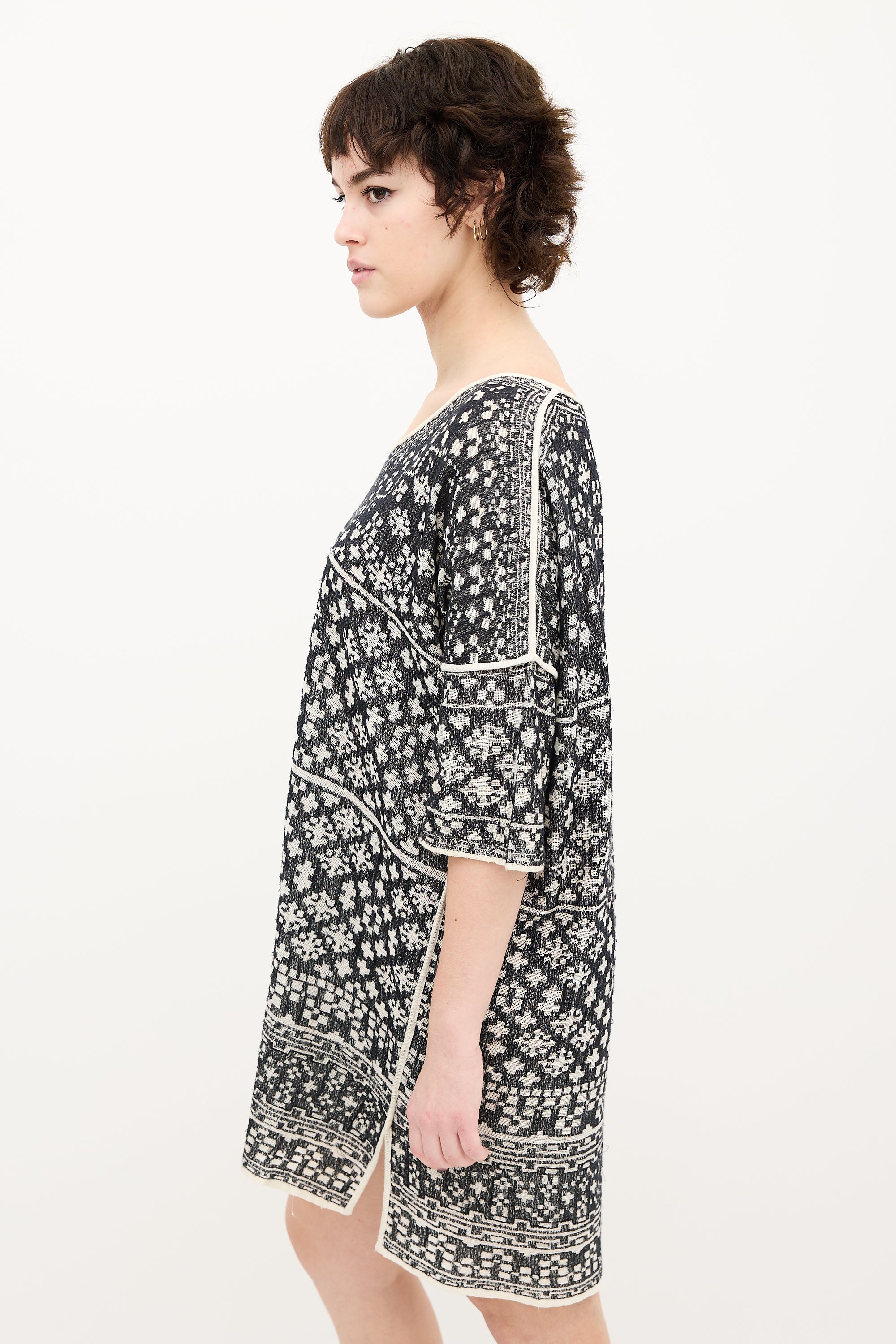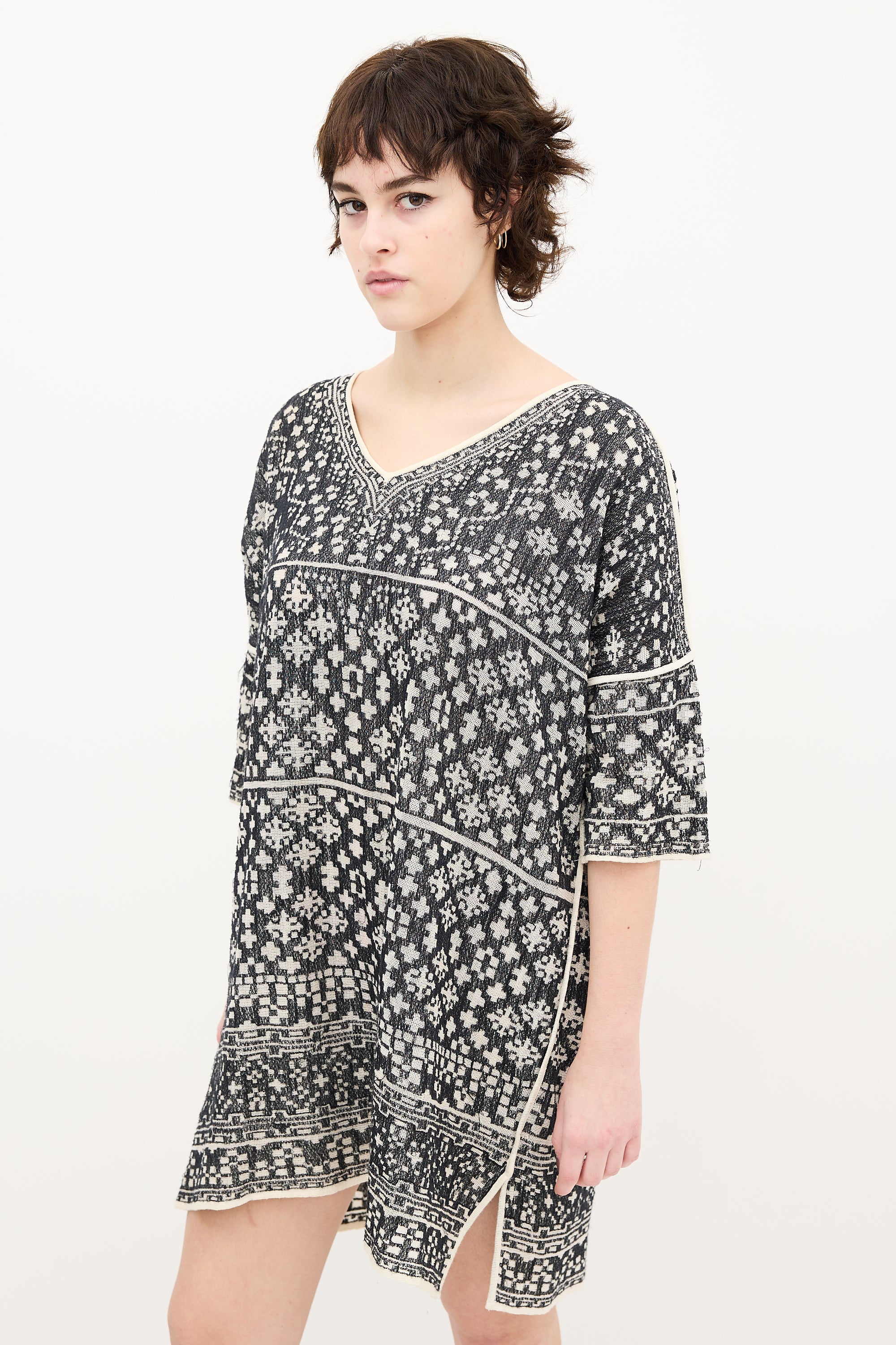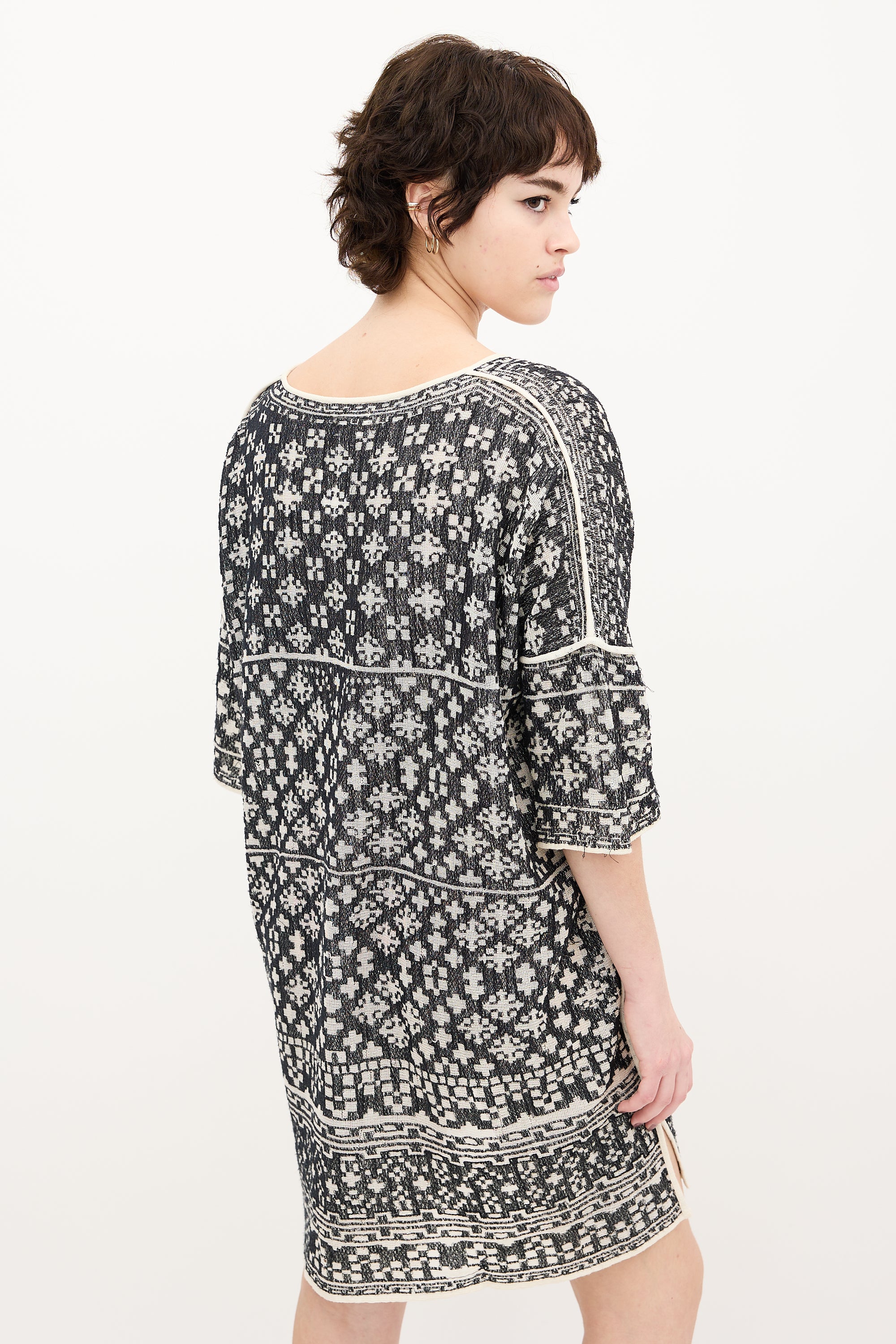 Pre-owned Isabel Marant Étoile black and cream knit tunic dress featuring V-neckline, dropped shoulder, geometric pattern intarsia, paneling throughout, and side slits at hem. Unlined.