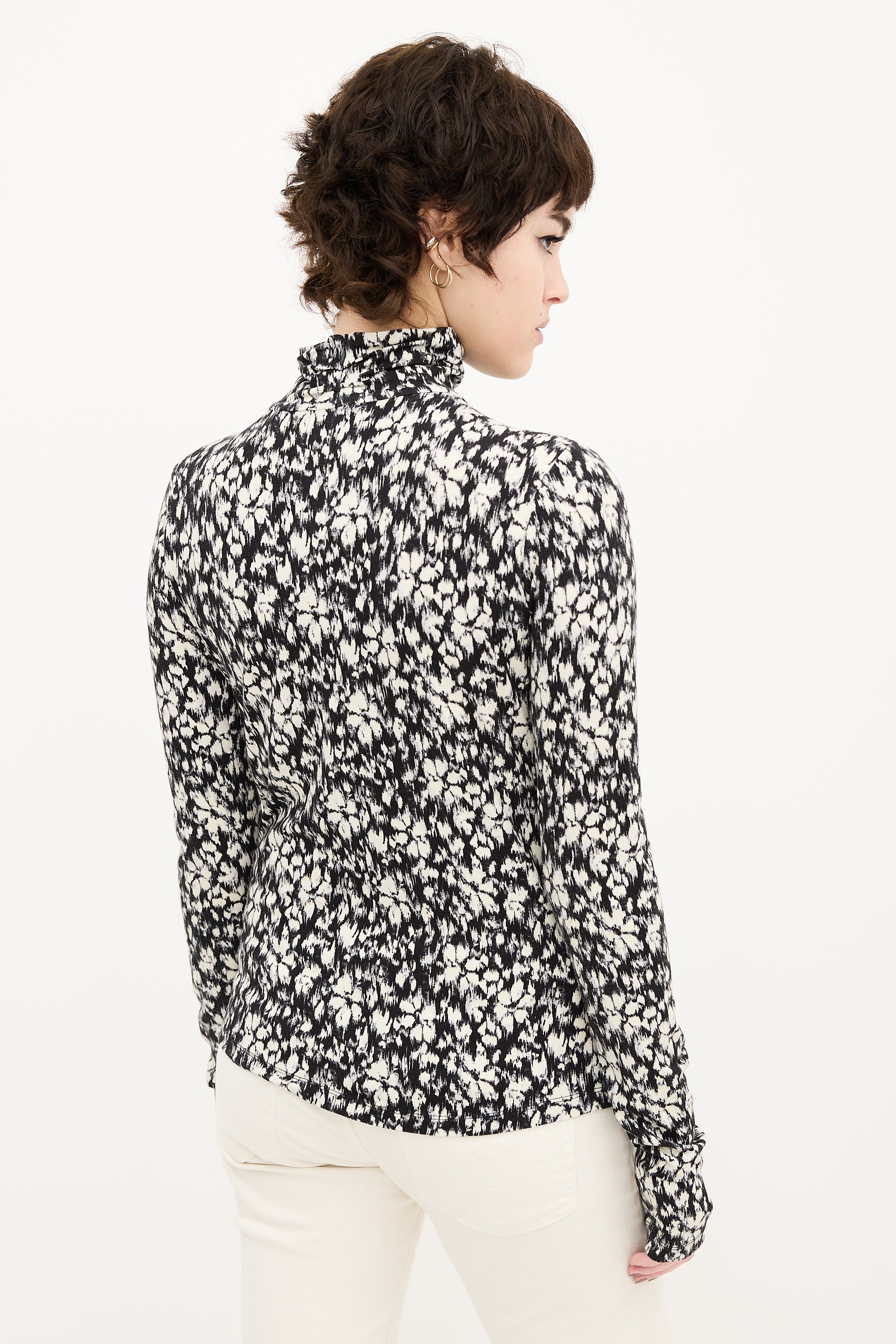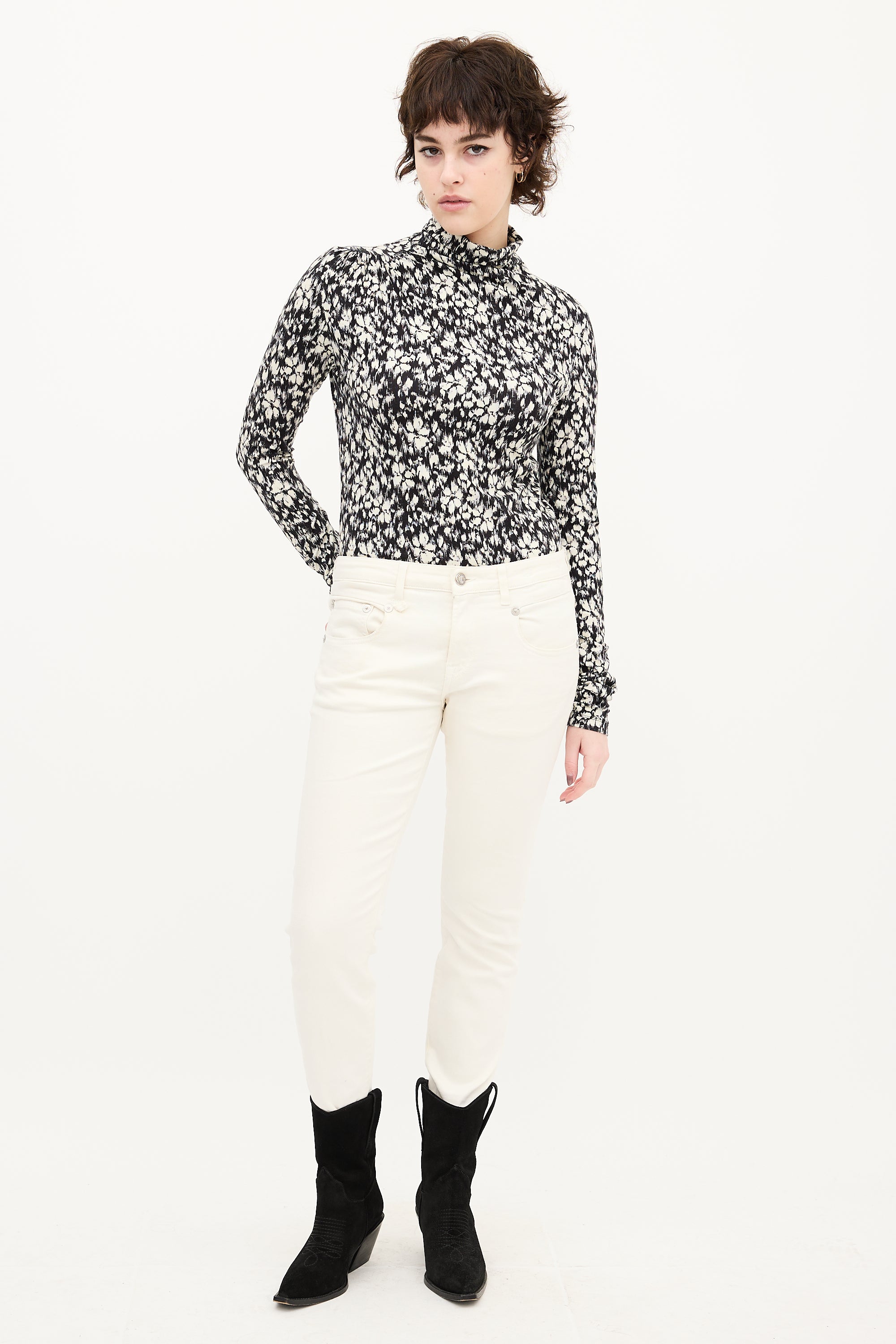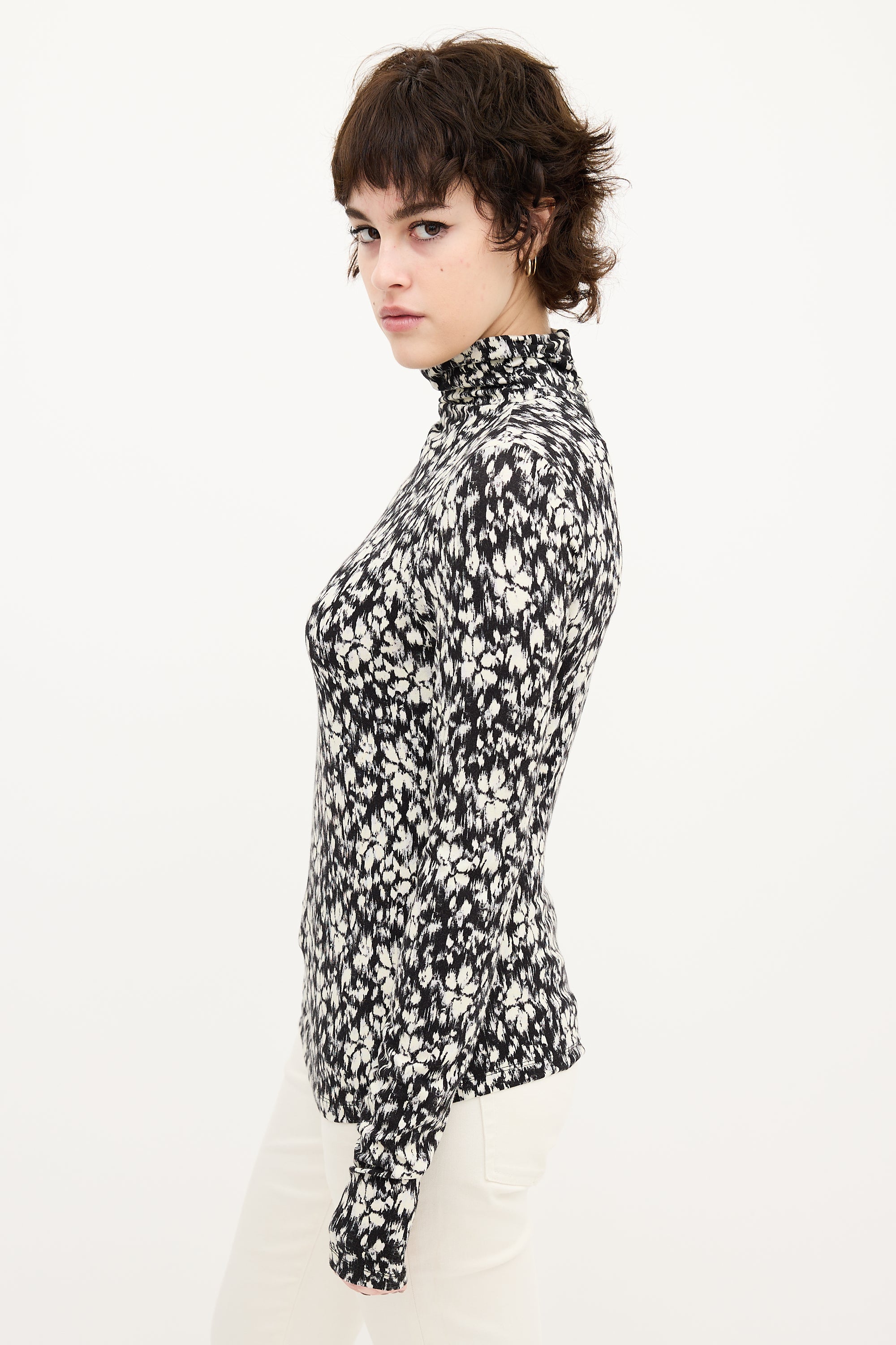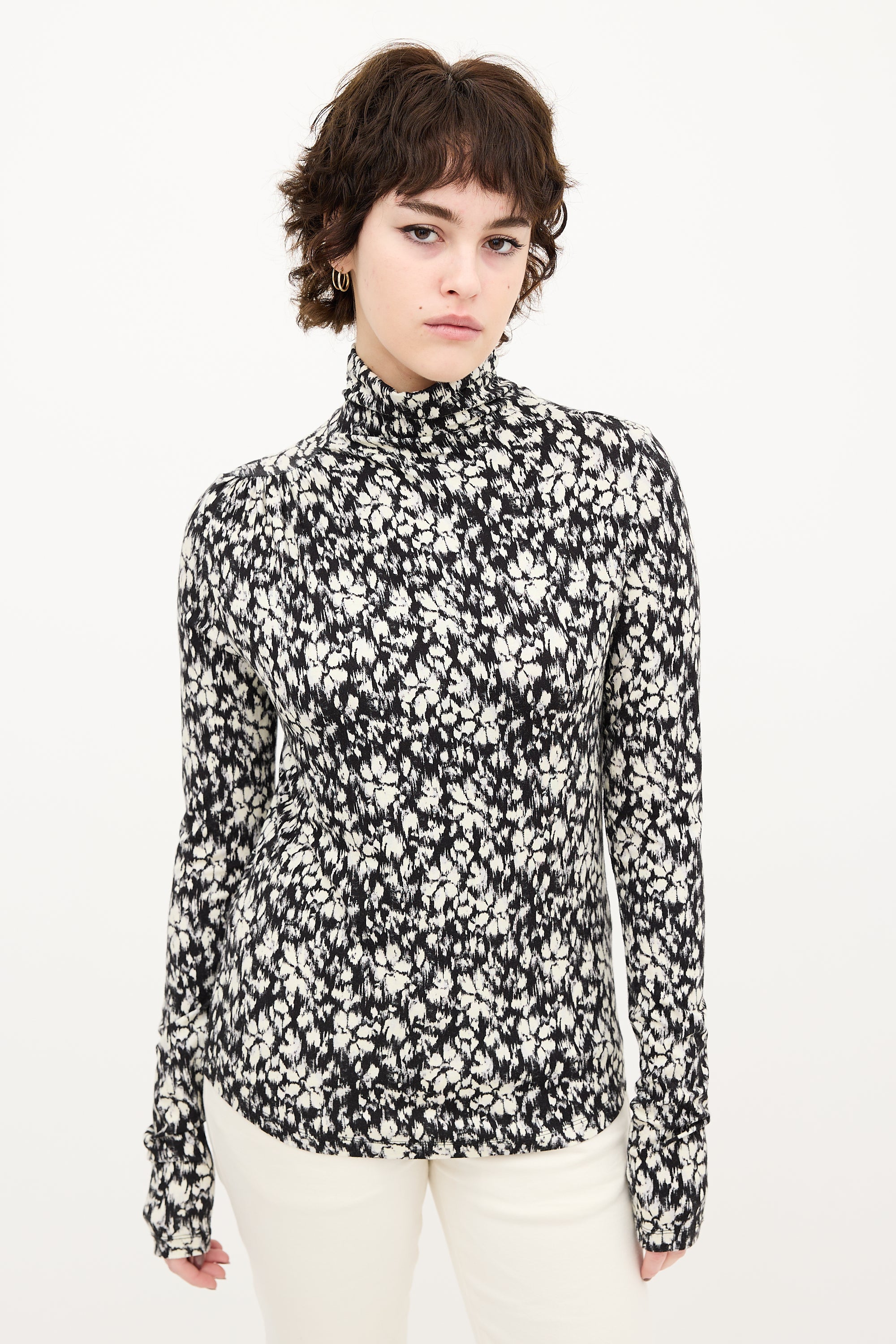 Pre-owned Isabel Marant Étoile black and cream printed Lou top featuring mock neckline, asymmetrical gathered shoulder, and back zip closure.