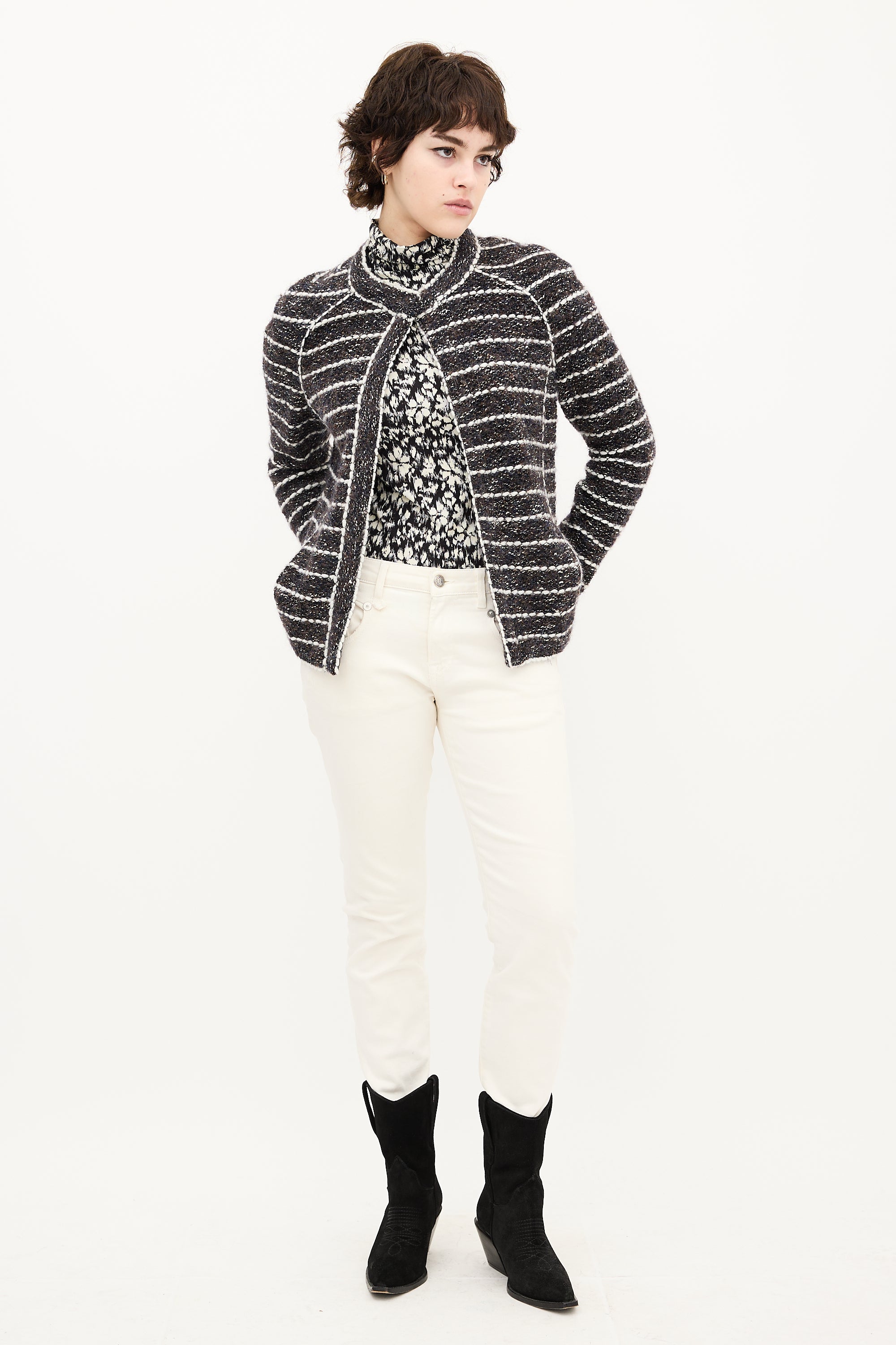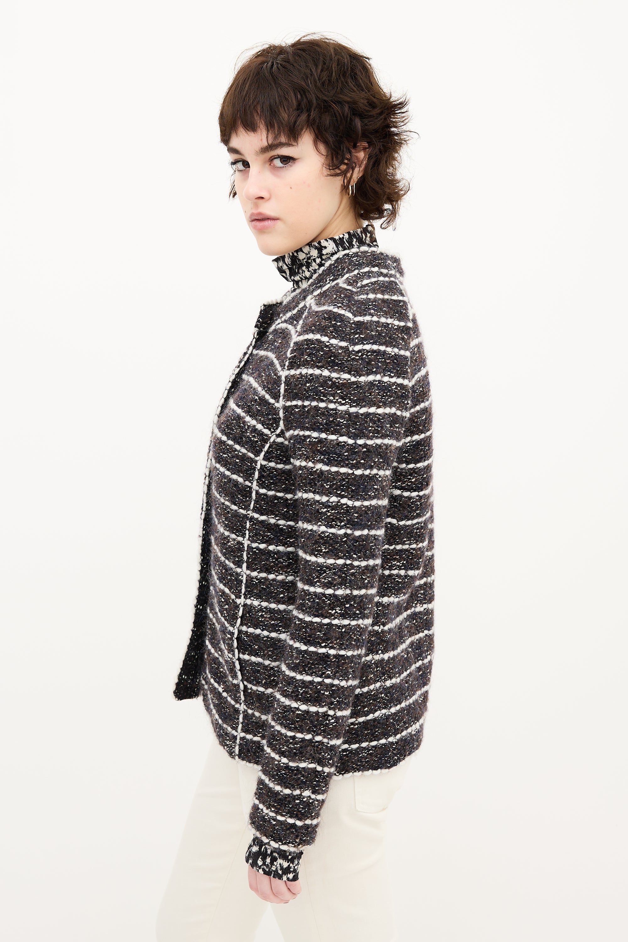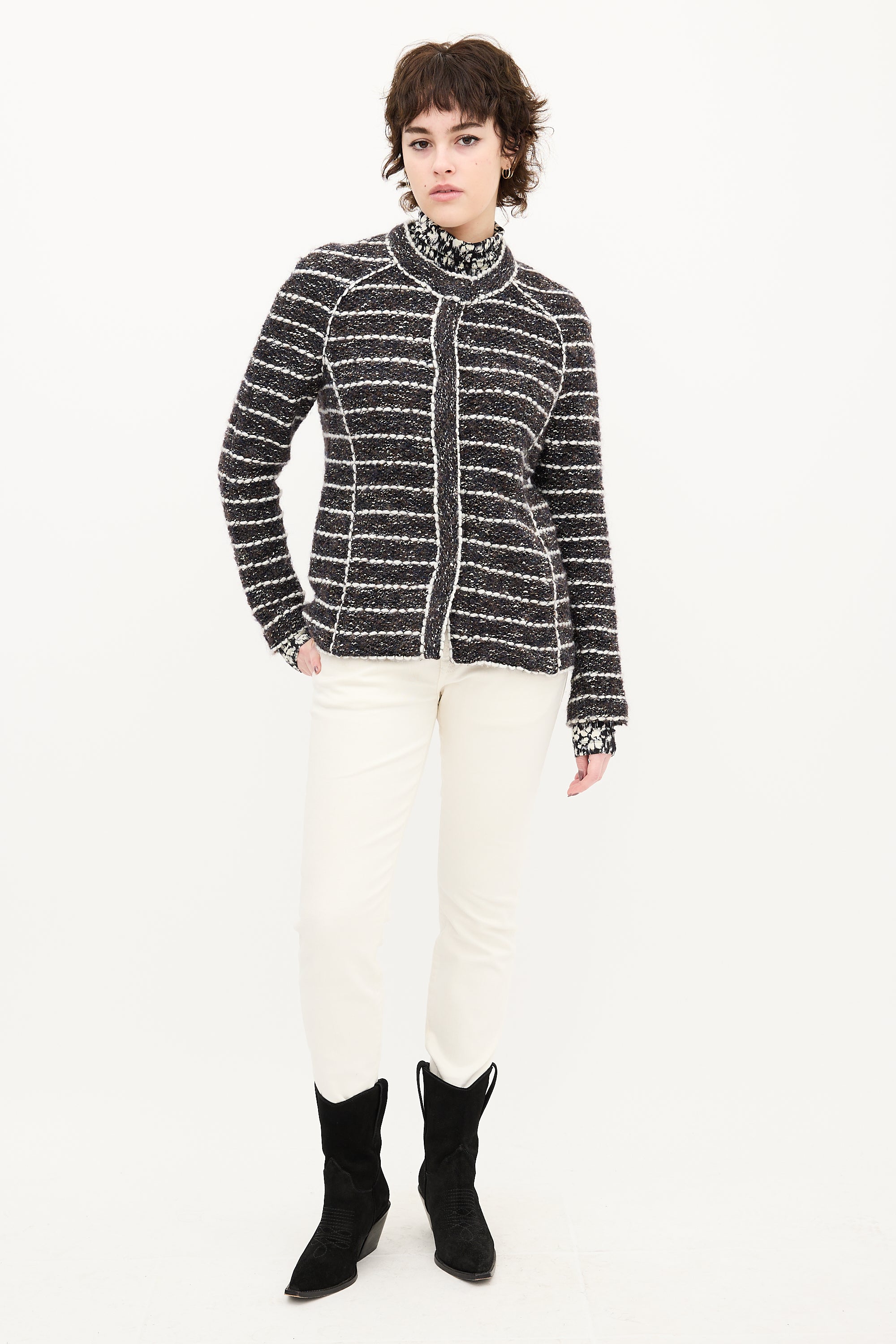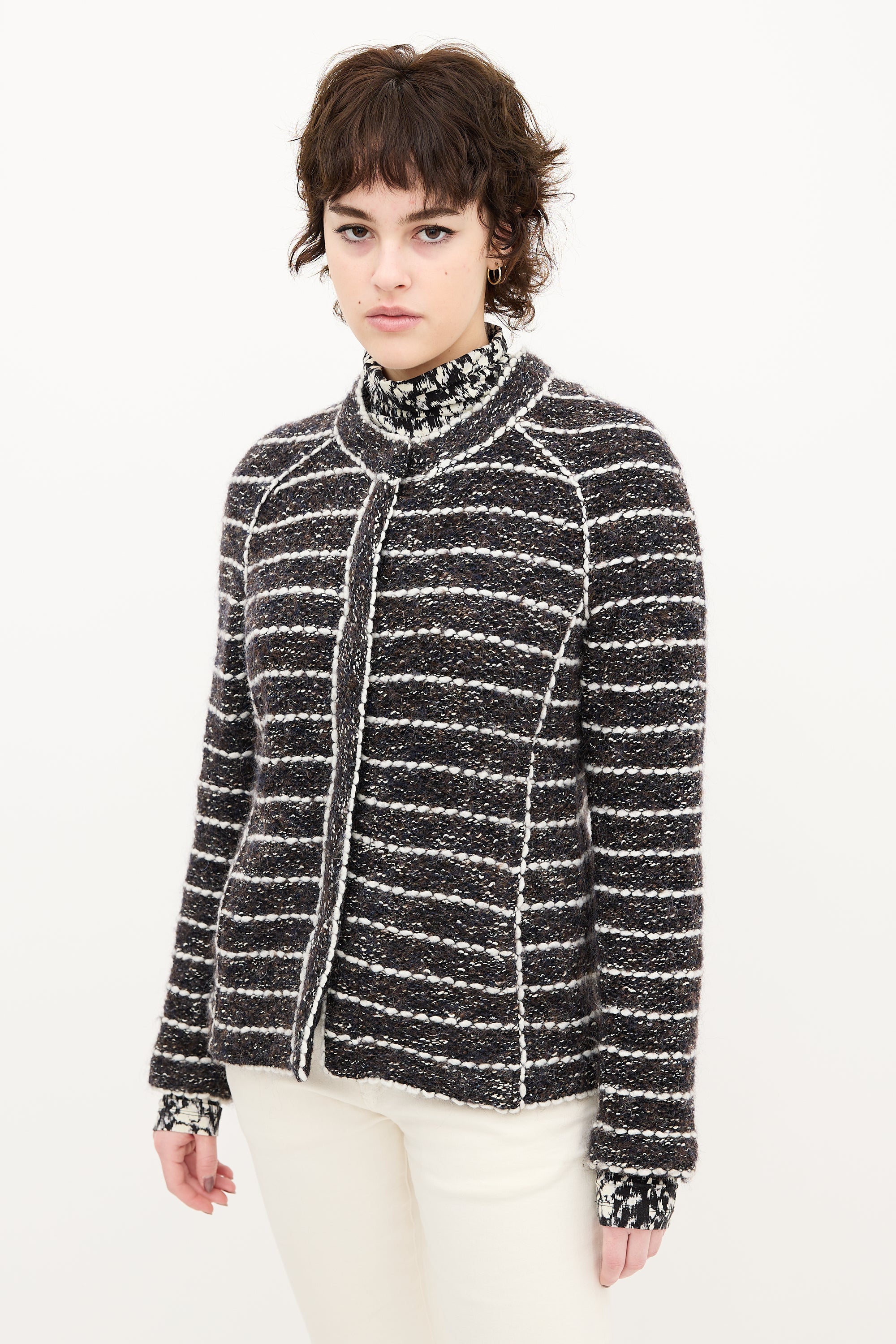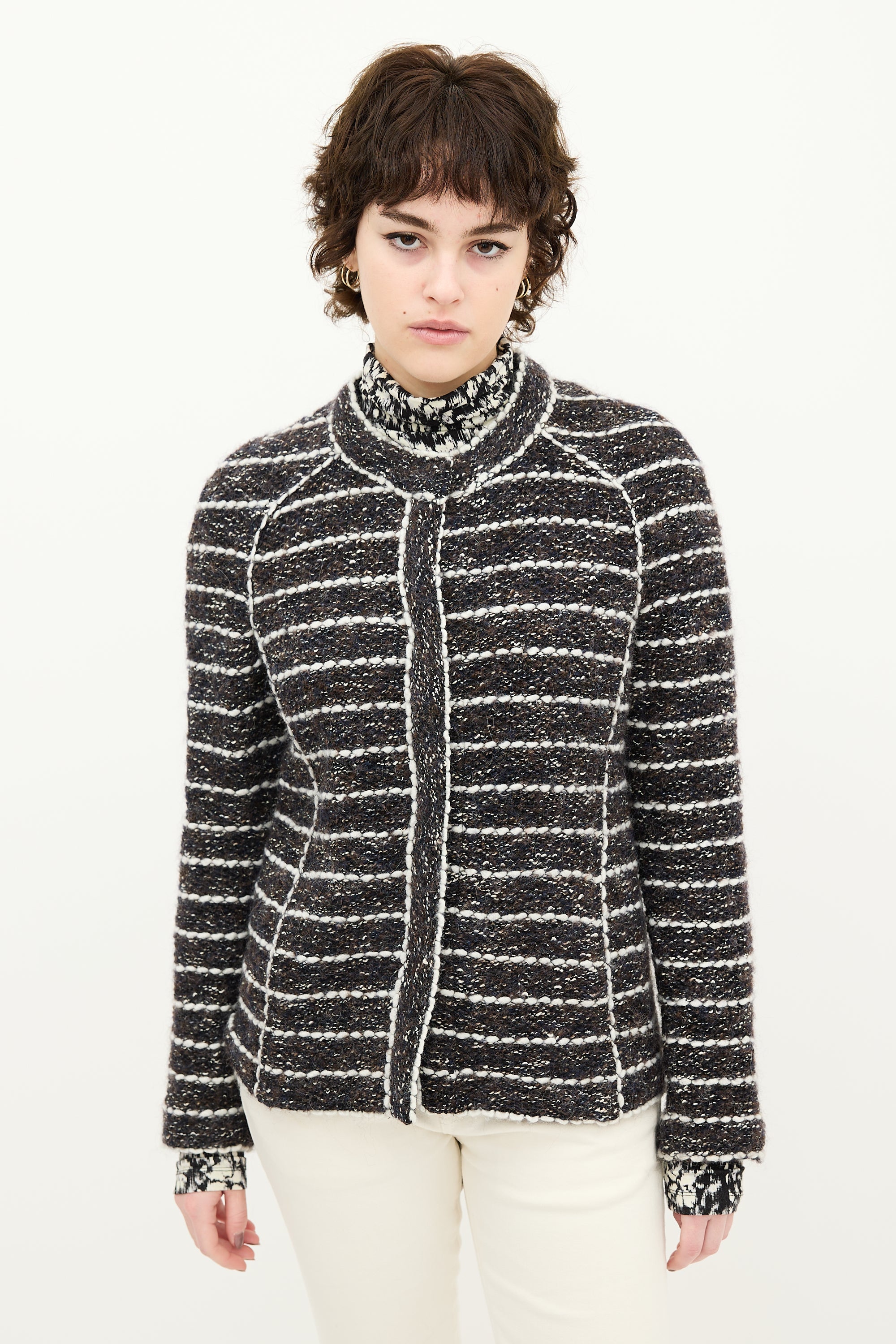 Pre-owned Isabel Marant Étoile brown and blue wool tweed jacket featuring white contrast stitch throughout, round neckline, hook and eye front closure, and two inseam pockets at waist.