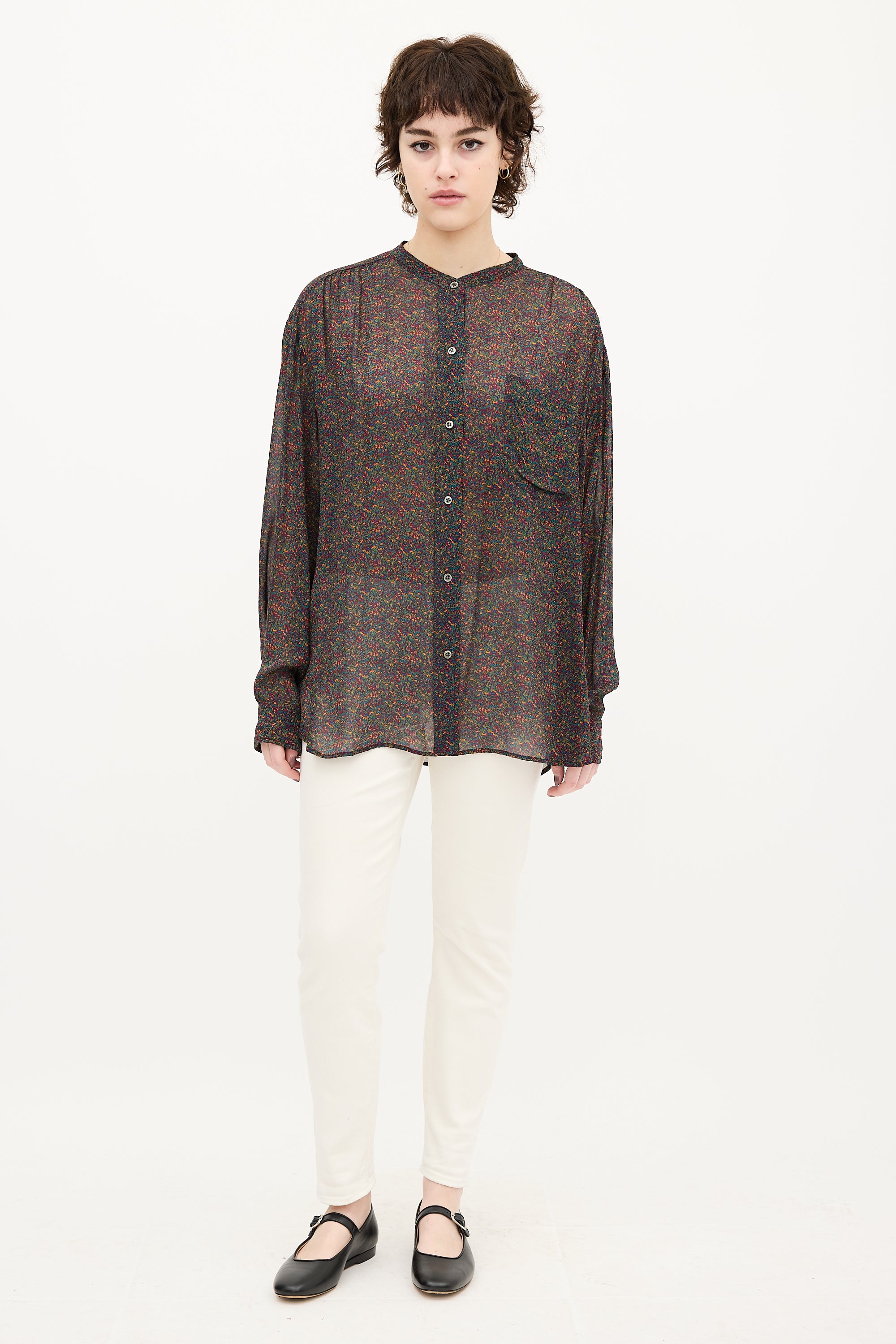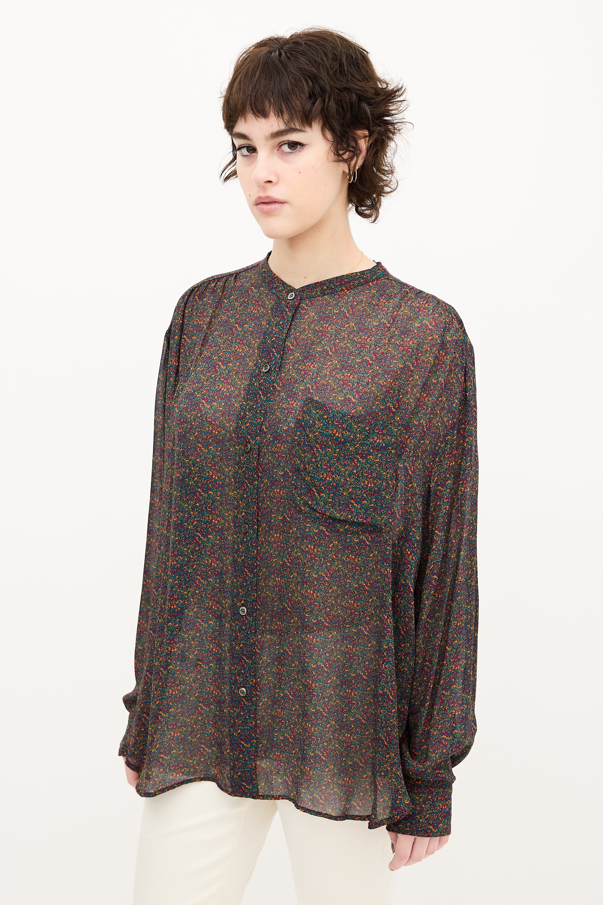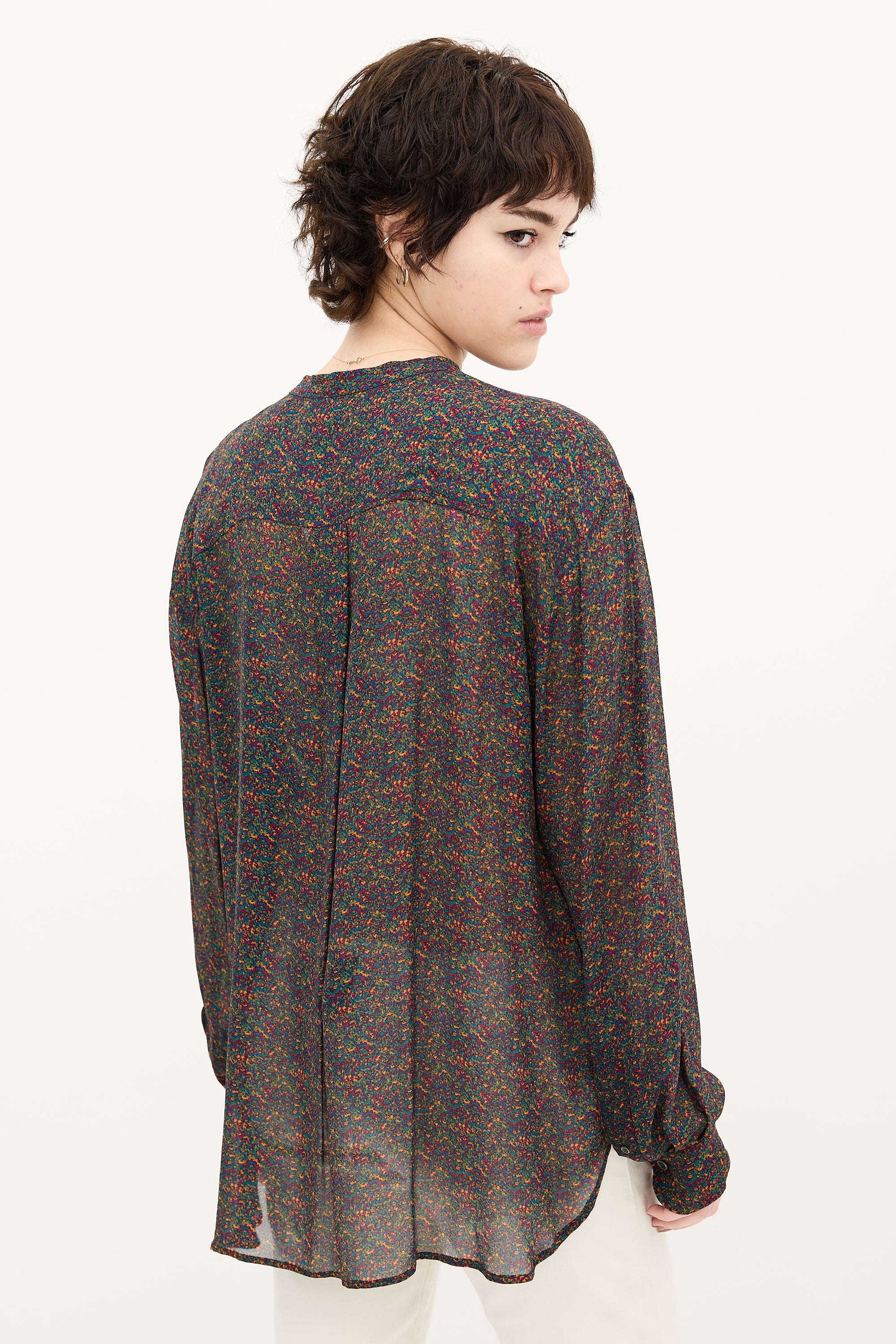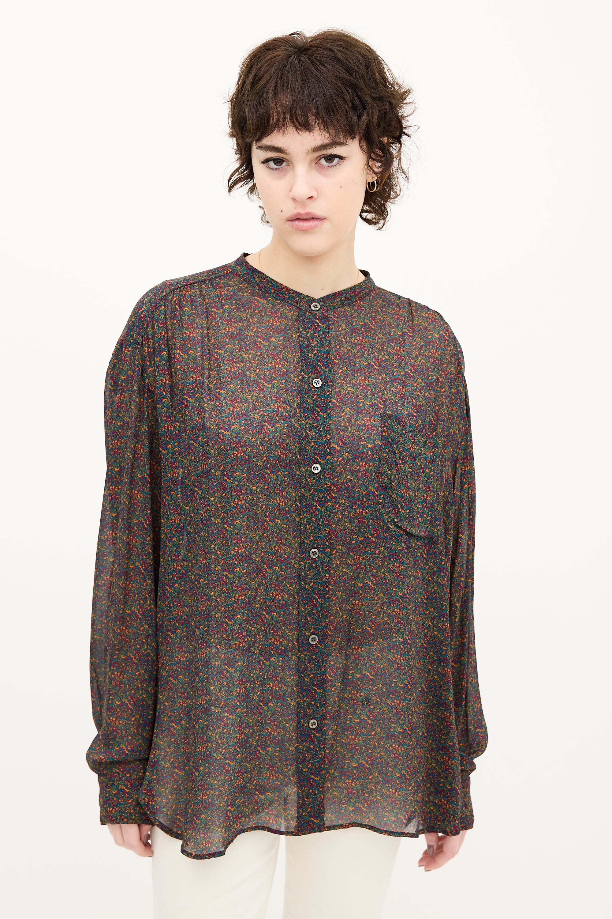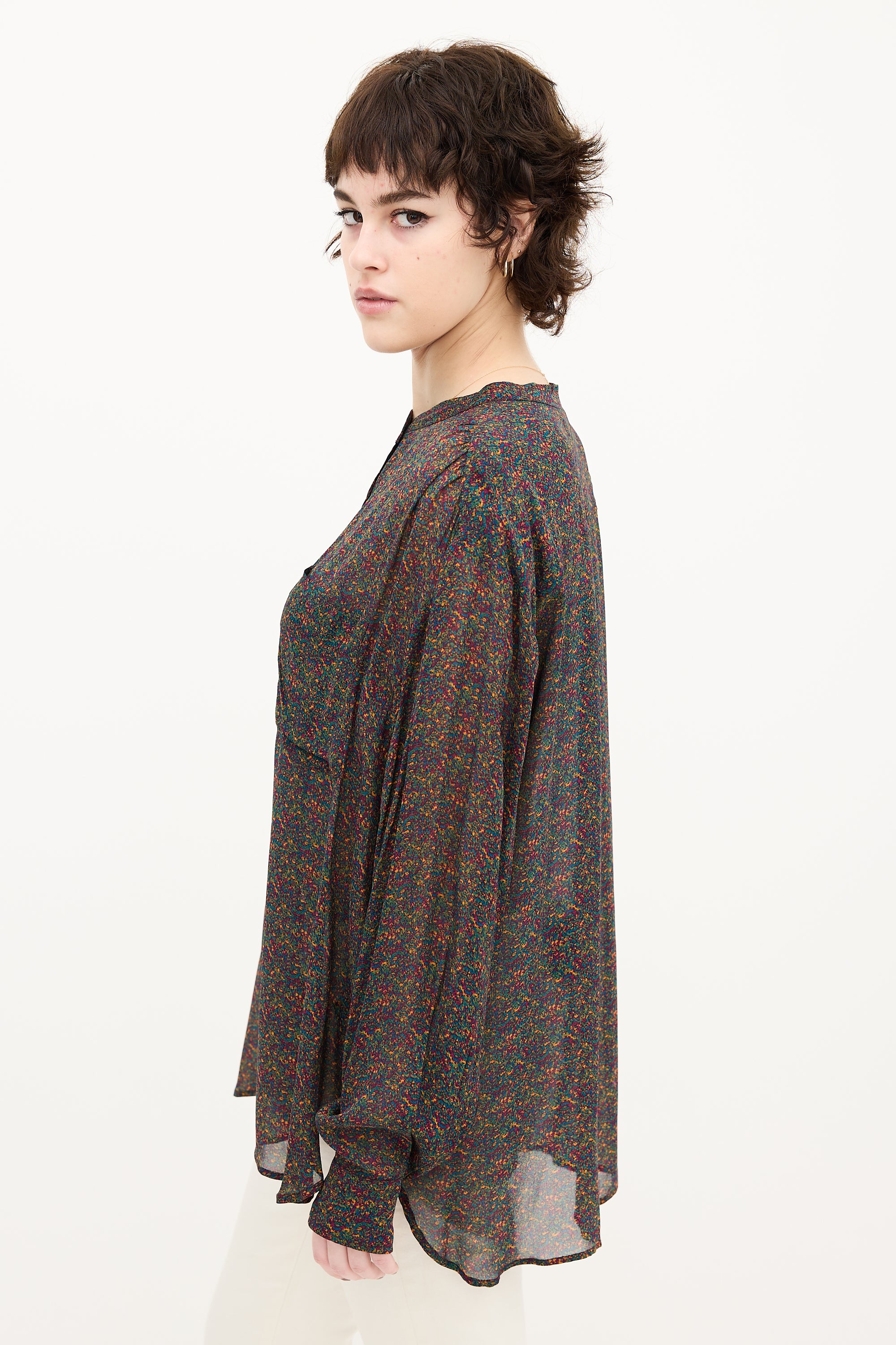 Pre-owned Isabel Marant Étoile green and multicolour speckle print shirt featuring stand collar, patch pocket at left chest, button up front, buttoned cuffs, back yoke pleat, and scoop hem.