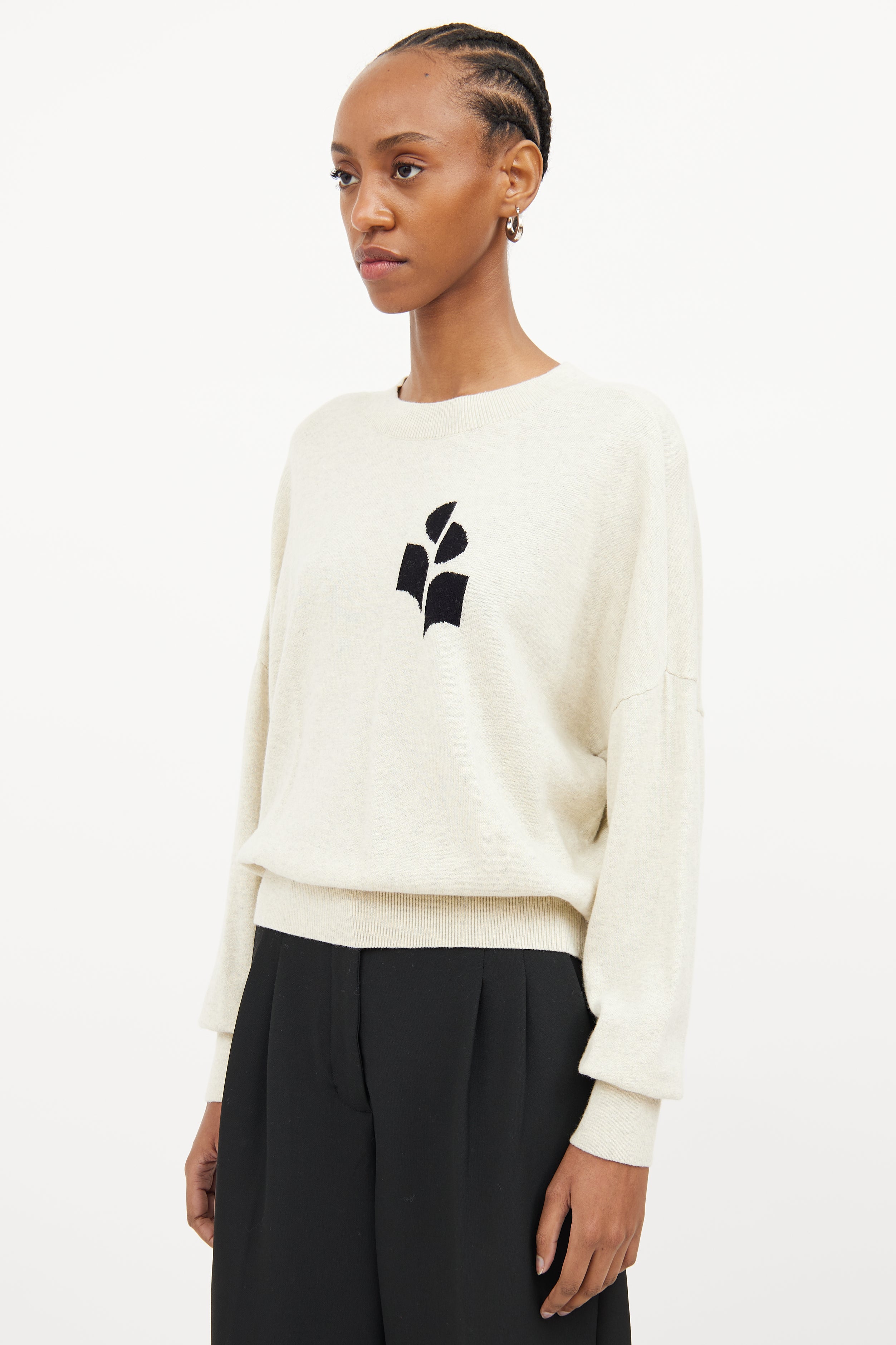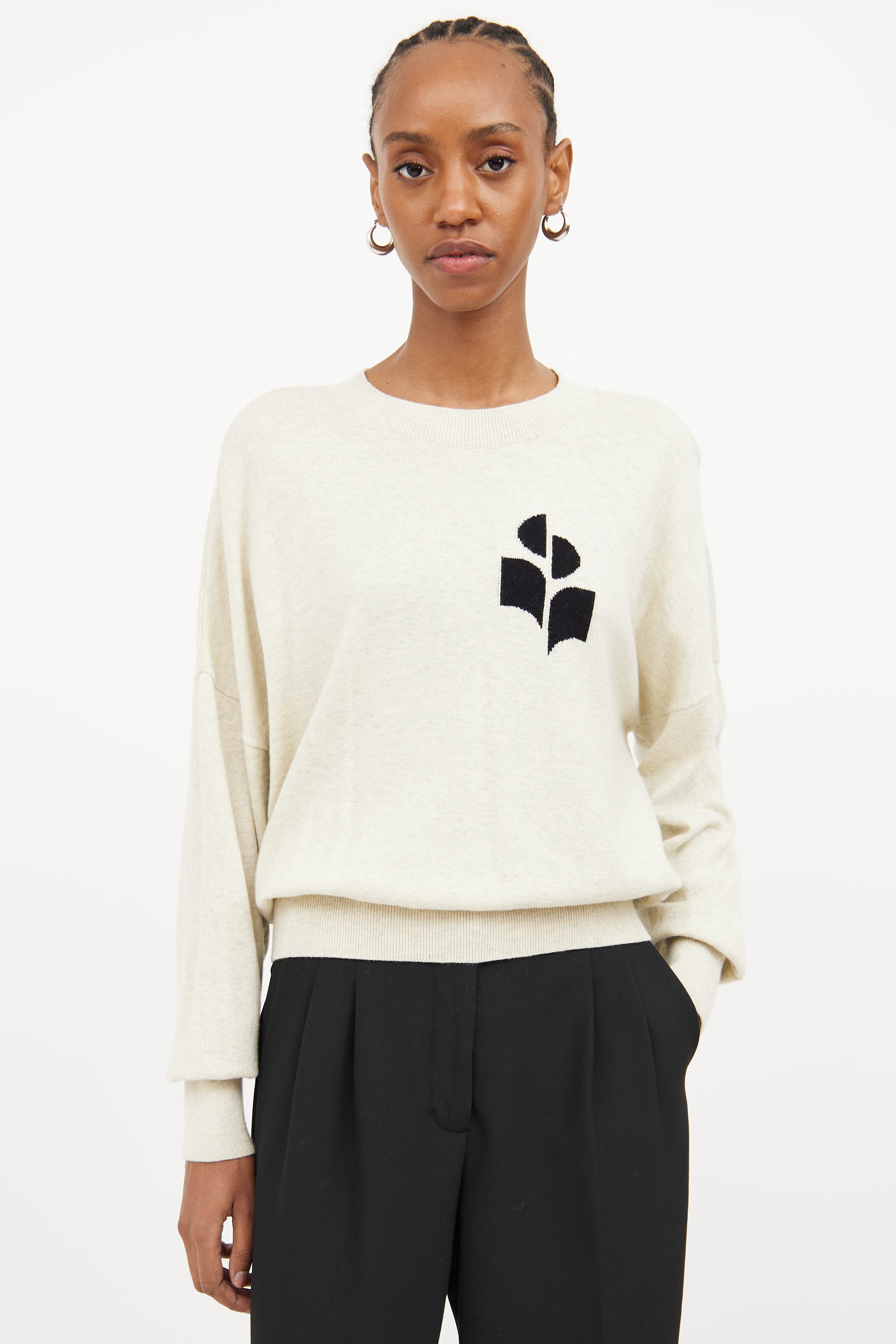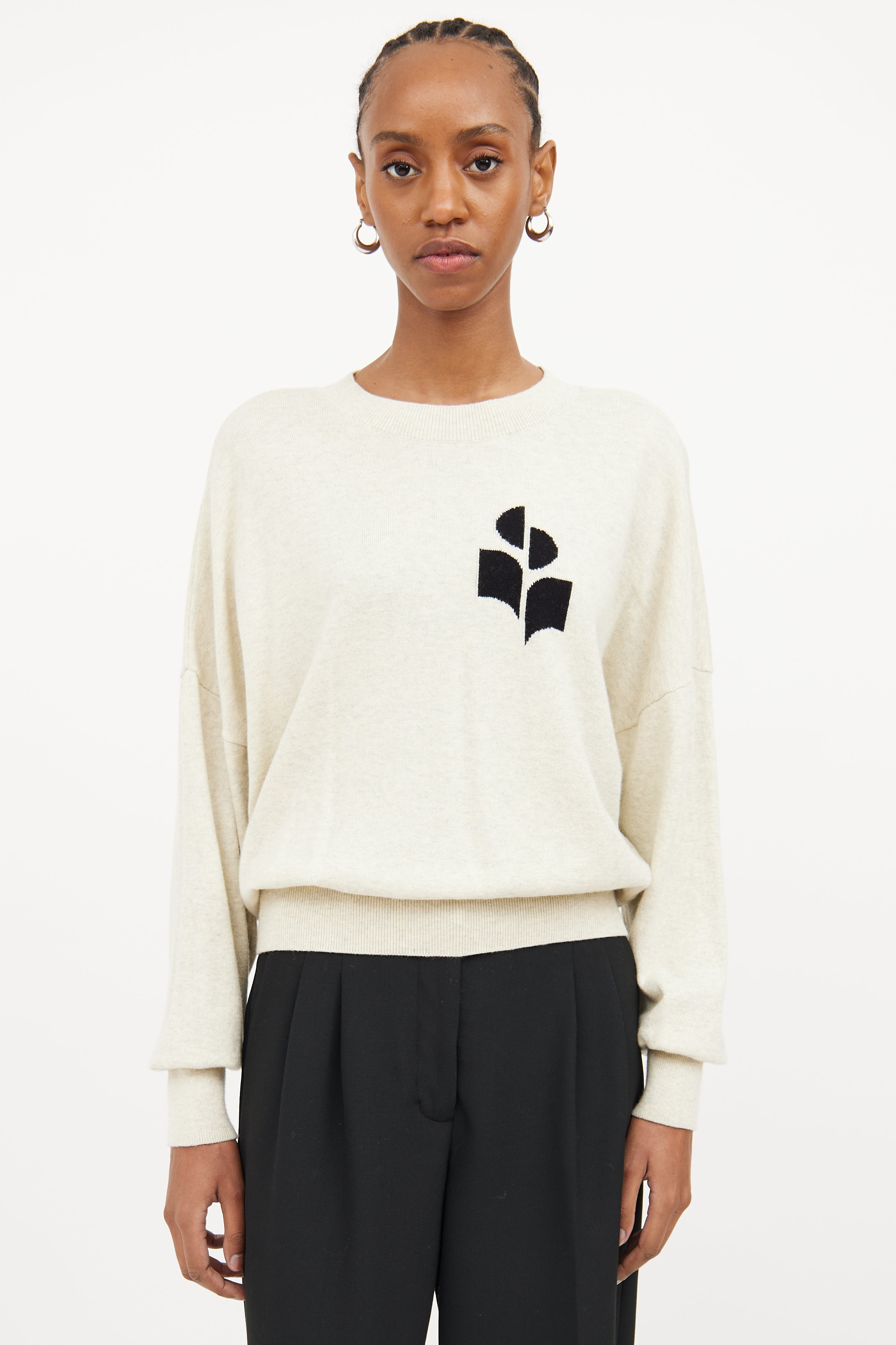 Pre-owned Isabel Marant Étoile cream long sleeve sweater featuring ribbed crew neckline, black logo patch on left chest and ribbed cuffs and hem.