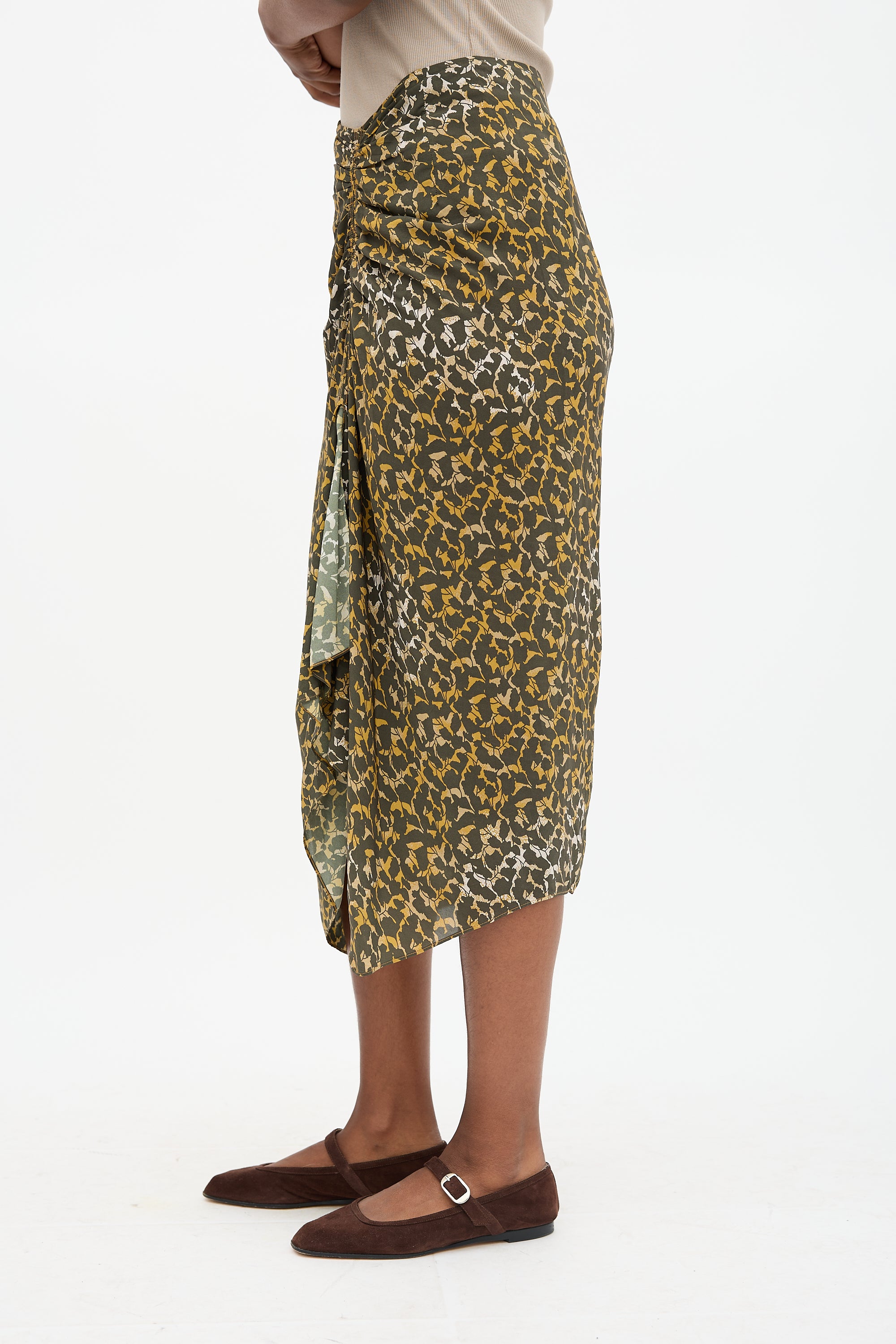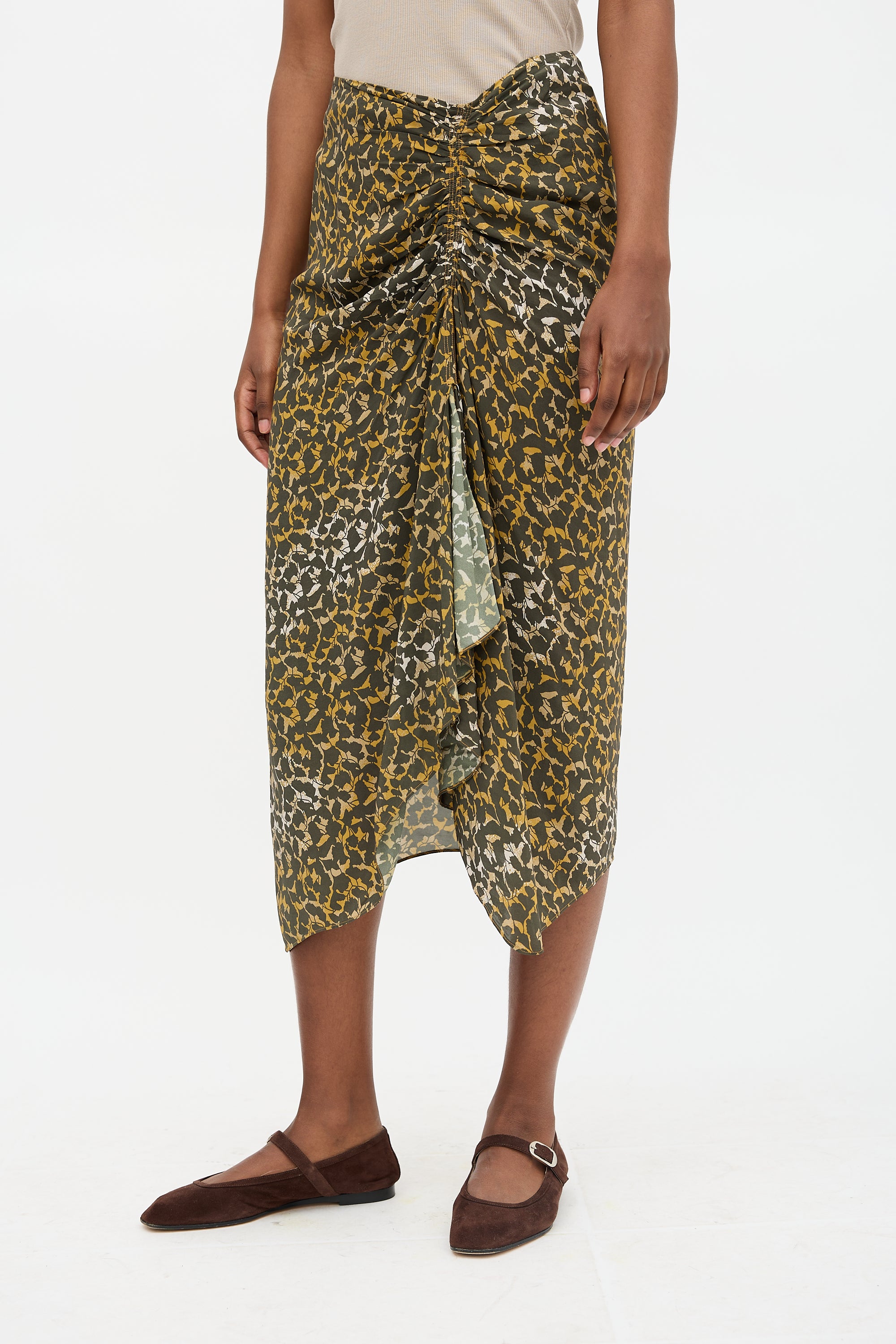 Pre-owned Isabel Marant Étoile yellow Azaria skirt featuring green floral print, ruched left hip, left vent, and concealed back zip. Unlined.