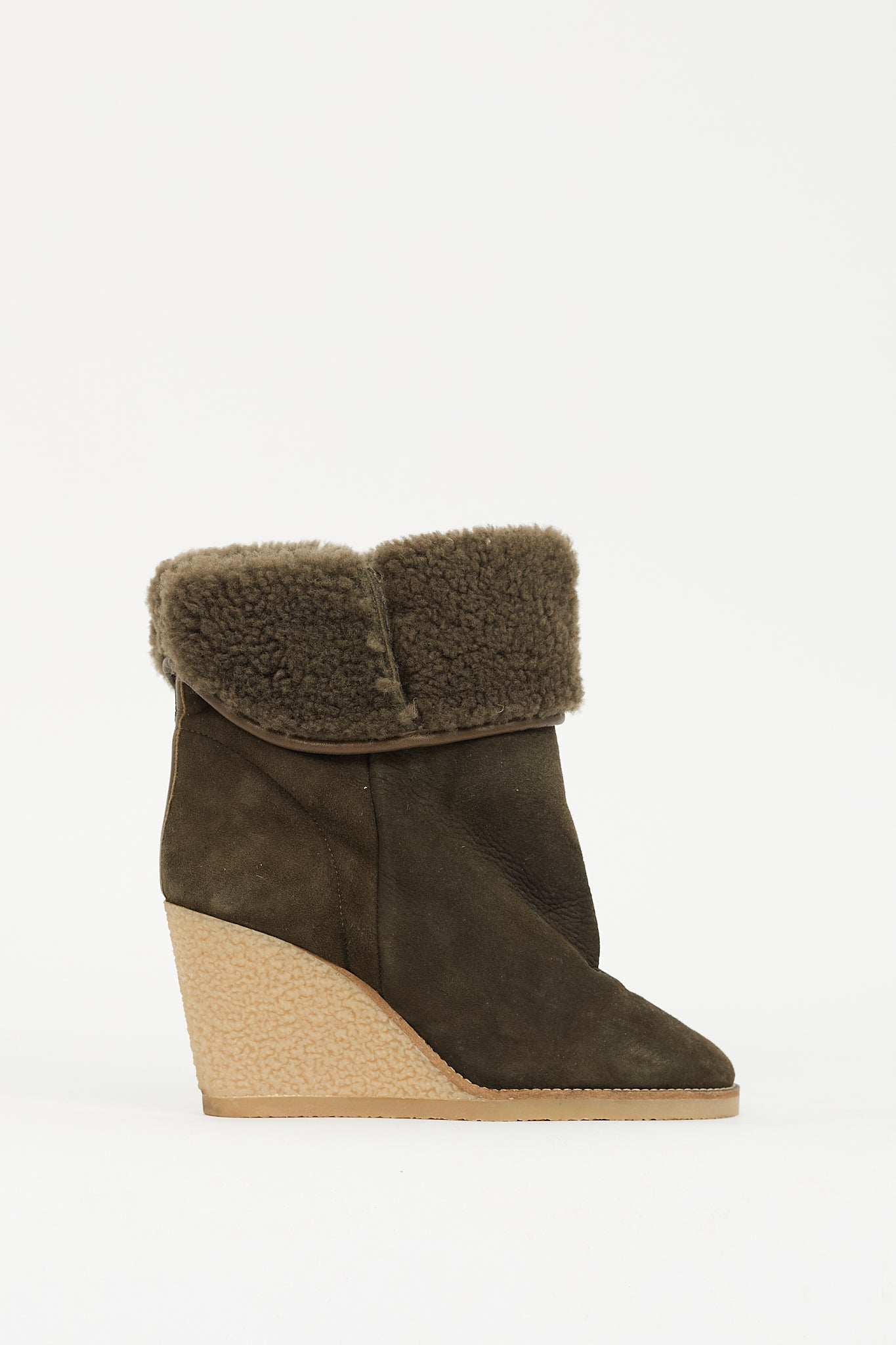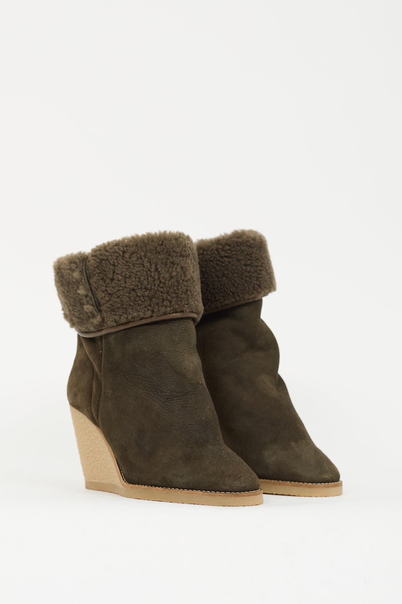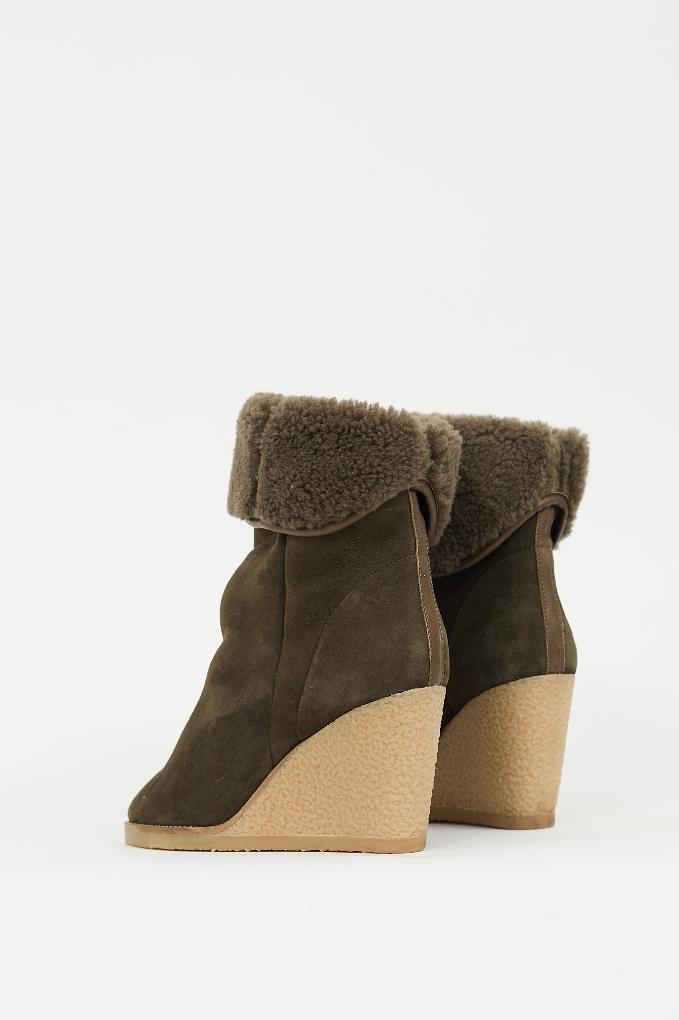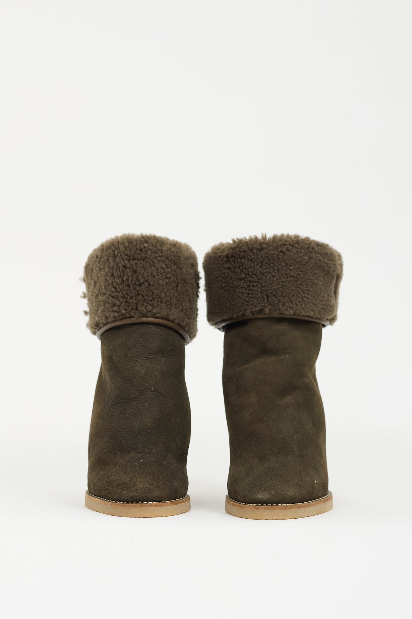 Pre-owned Isabel Marant Green suede Totam boots featuring rounded toe, shearling lined upper, leather trim counter, and gum wedge heel.
