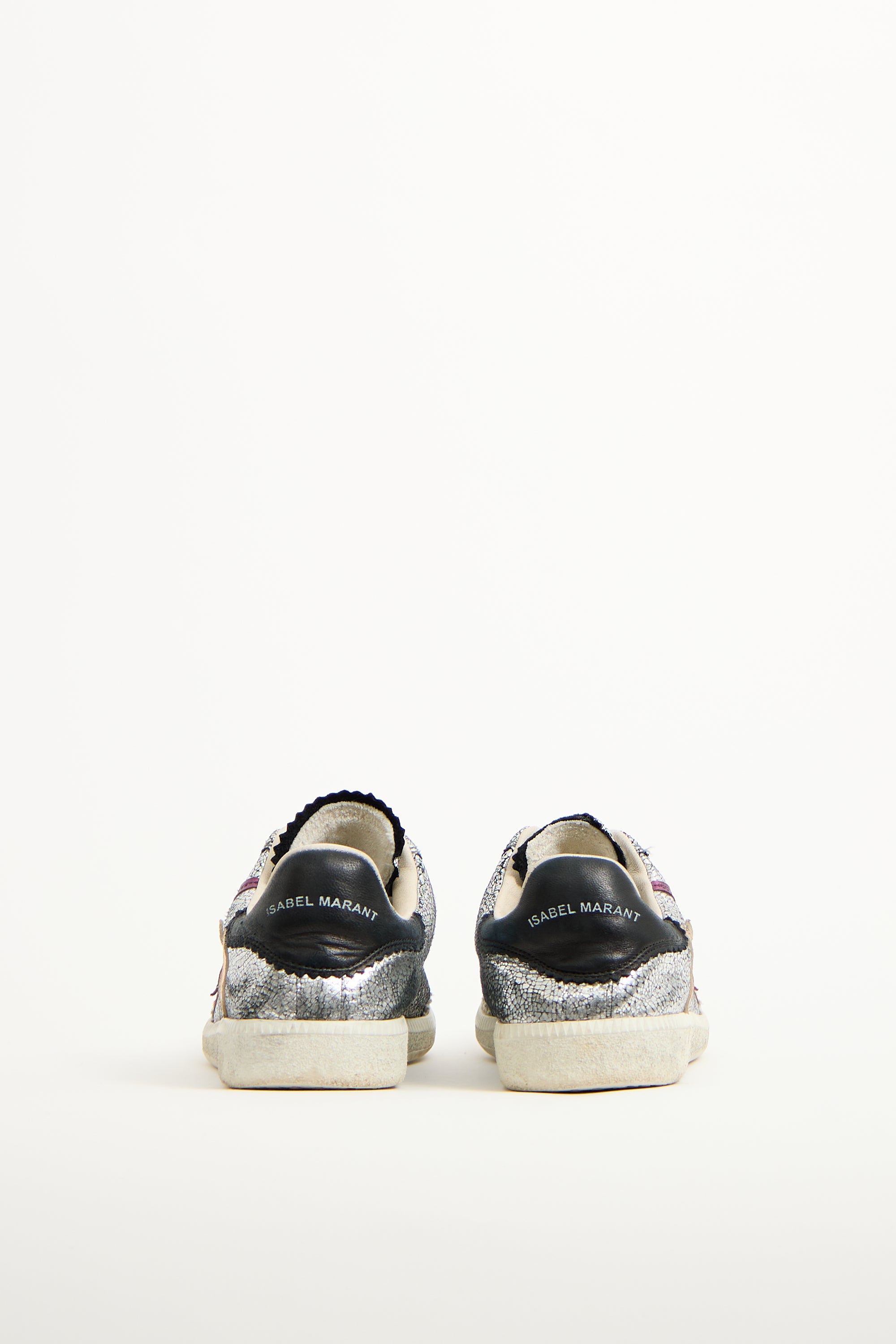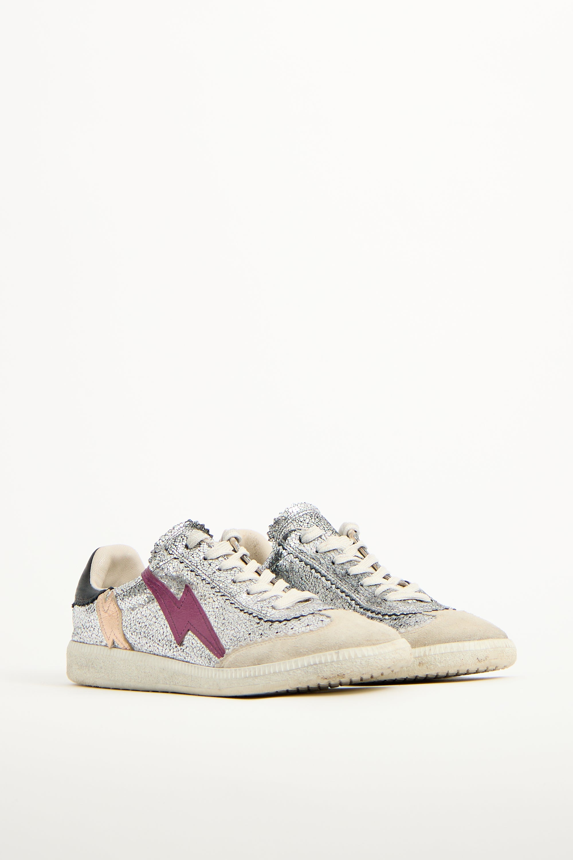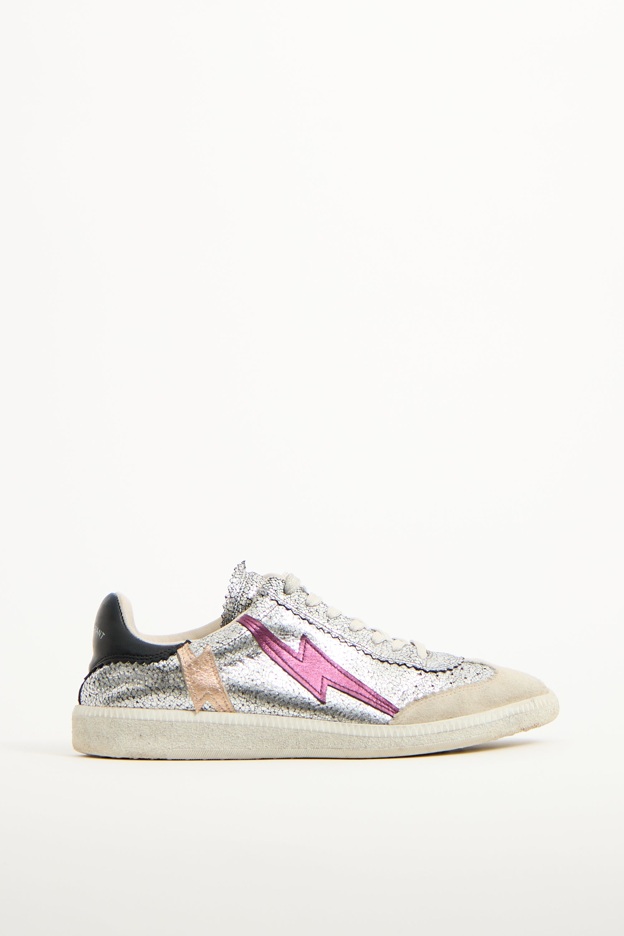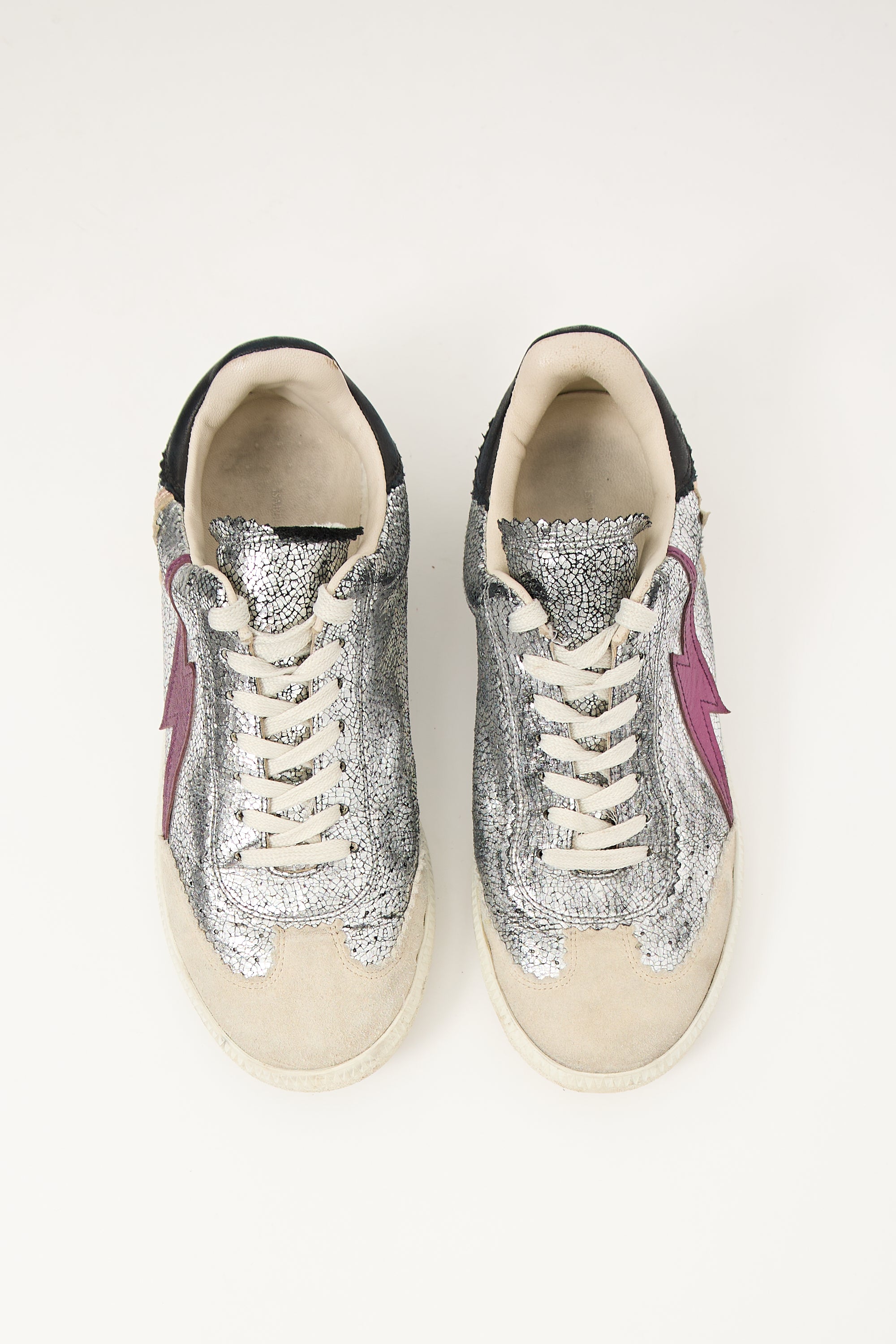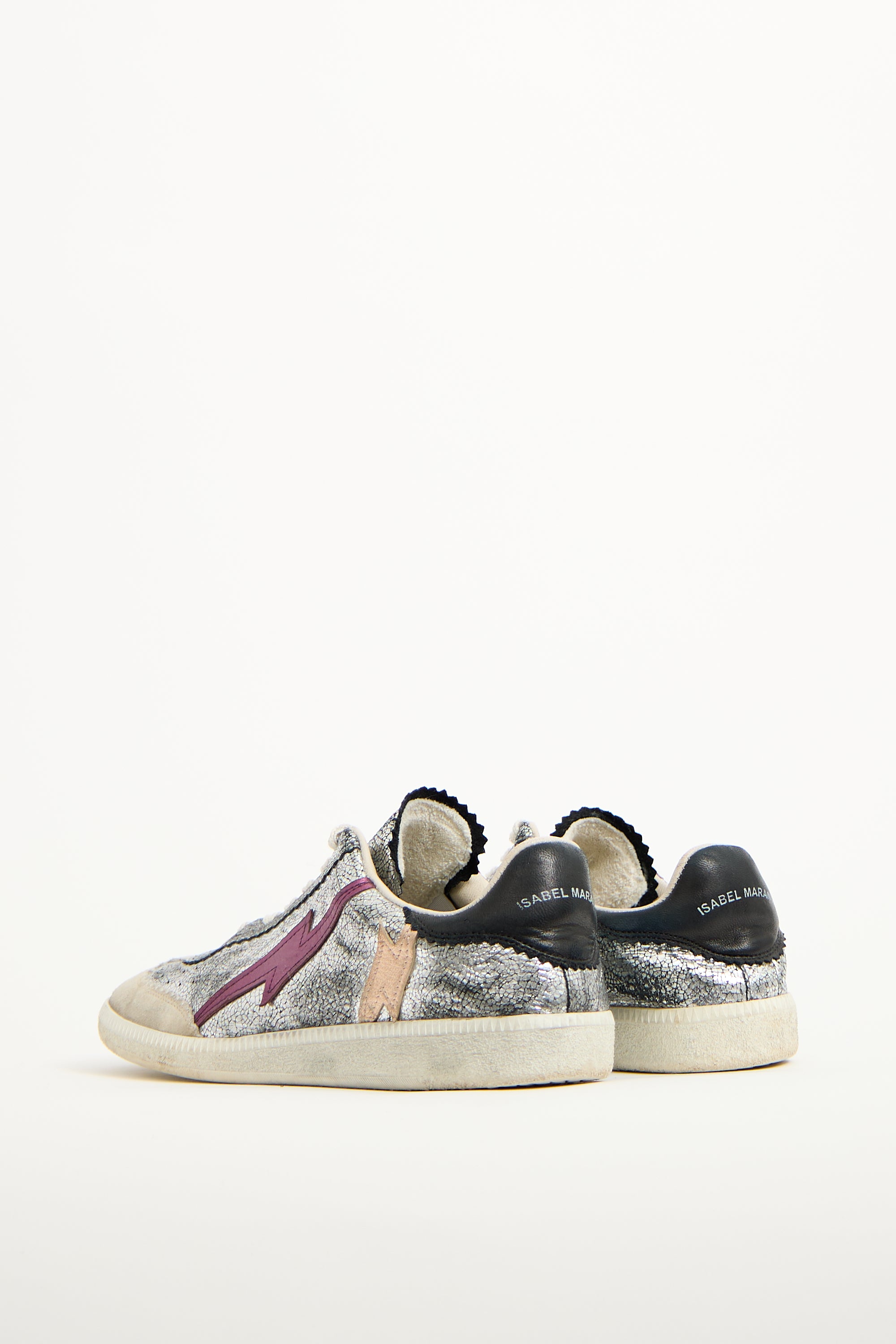 Pre-owned Isabel Marant silver cracked leather sneakers featuring rounded suede cap toe, lace up front, purple and pink lightning appliqué at outer sides, and black leather counter with stamped logo. Comes with original dust bag.