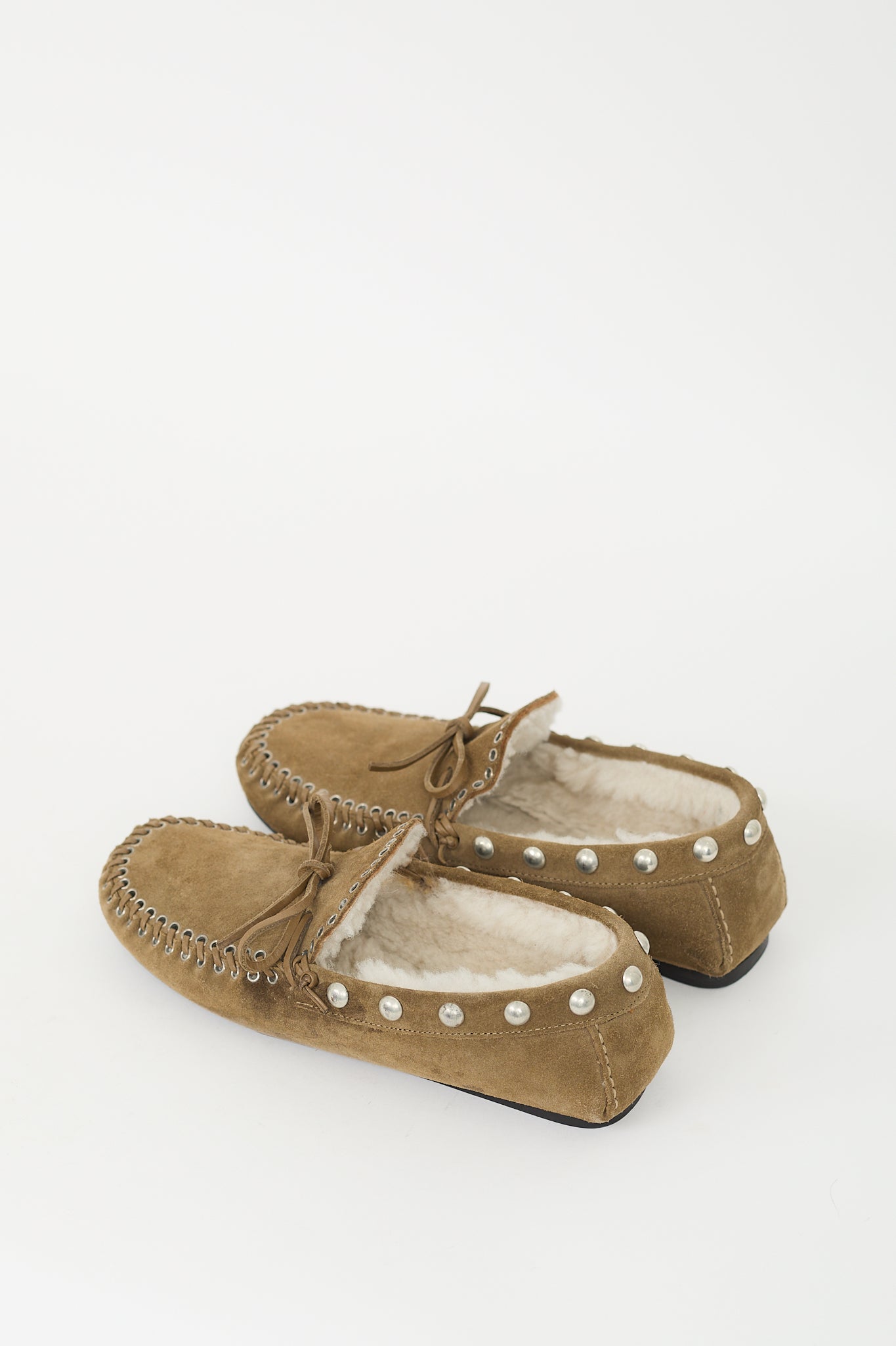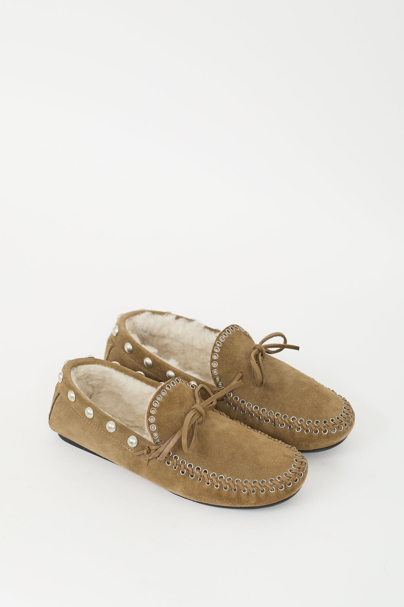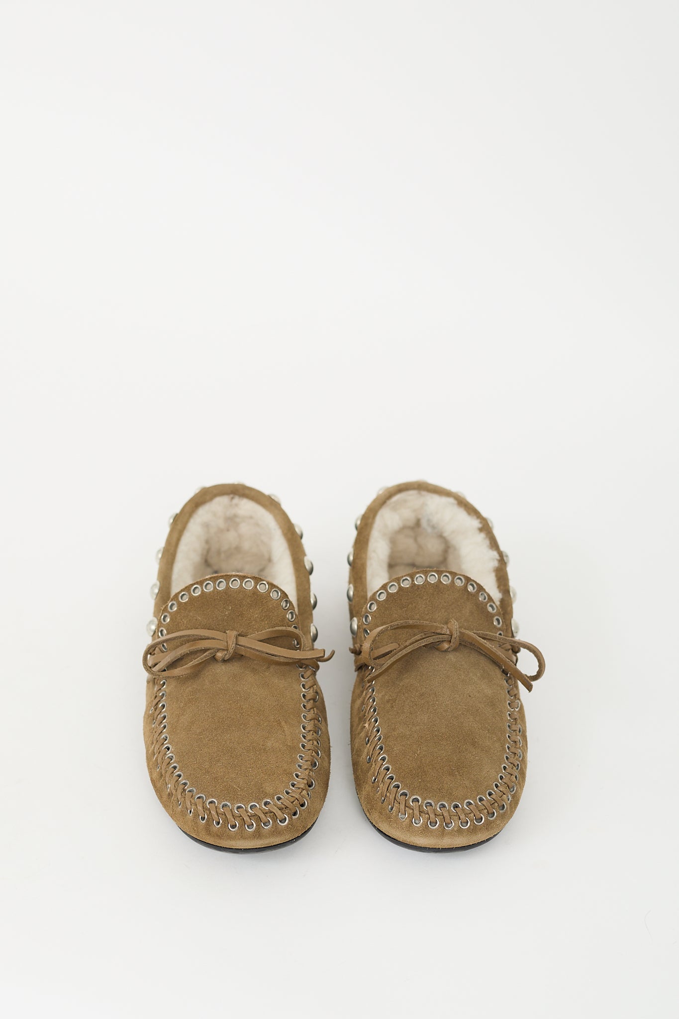 Pre-owned Isabel Marant taupe suede Fitza loafers featuring rounded toe, whipstitch trim, self tie bow at vamp, silver tone studded topline, shearling lining, and slip on entry.