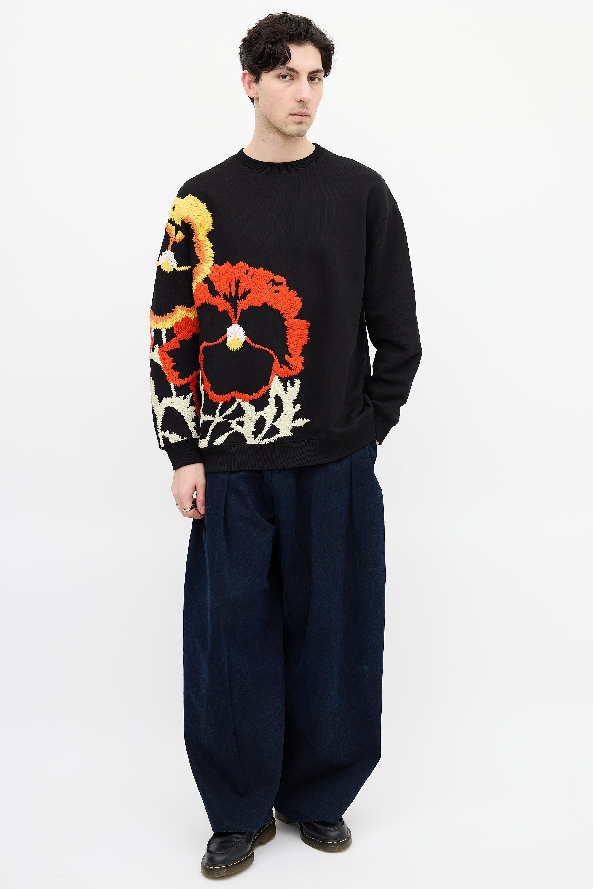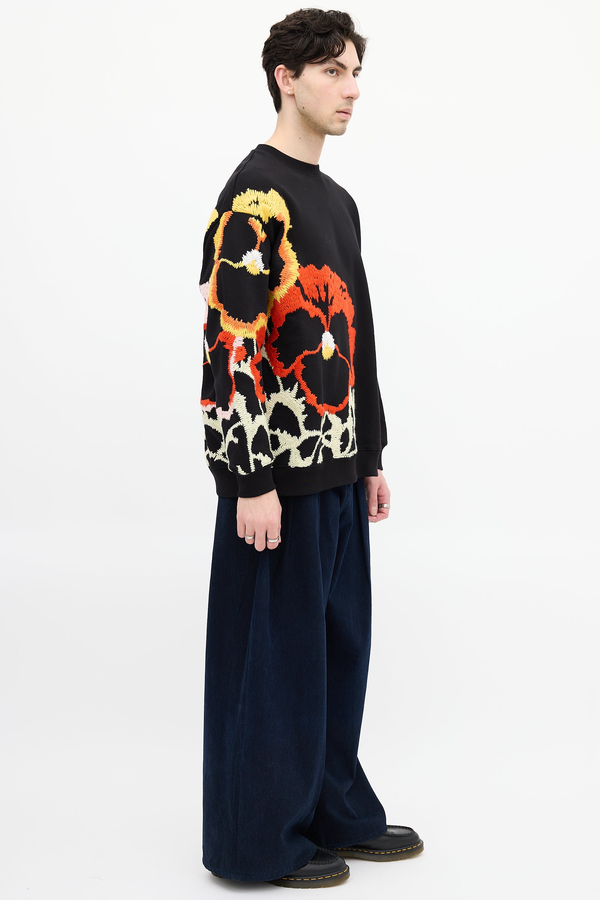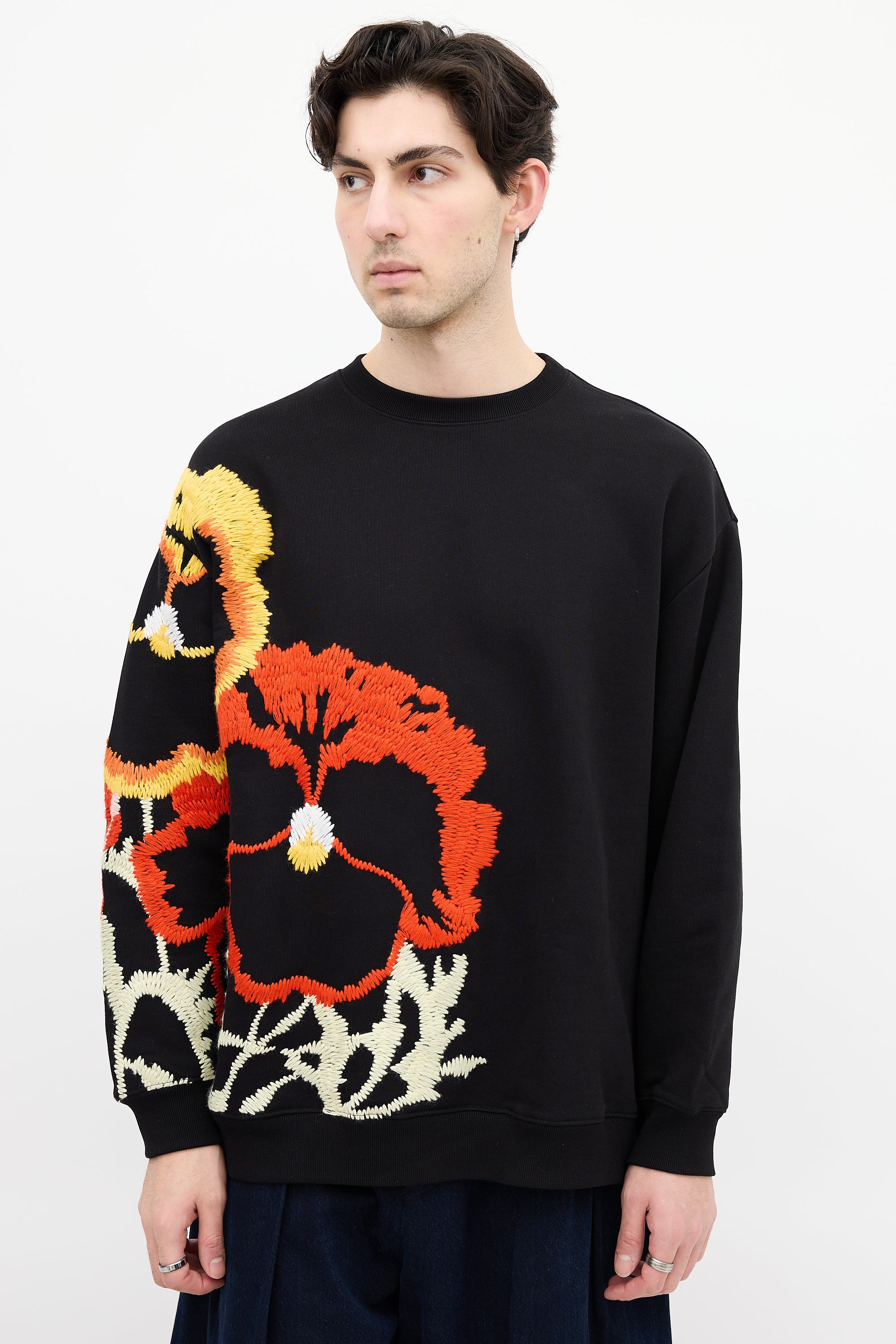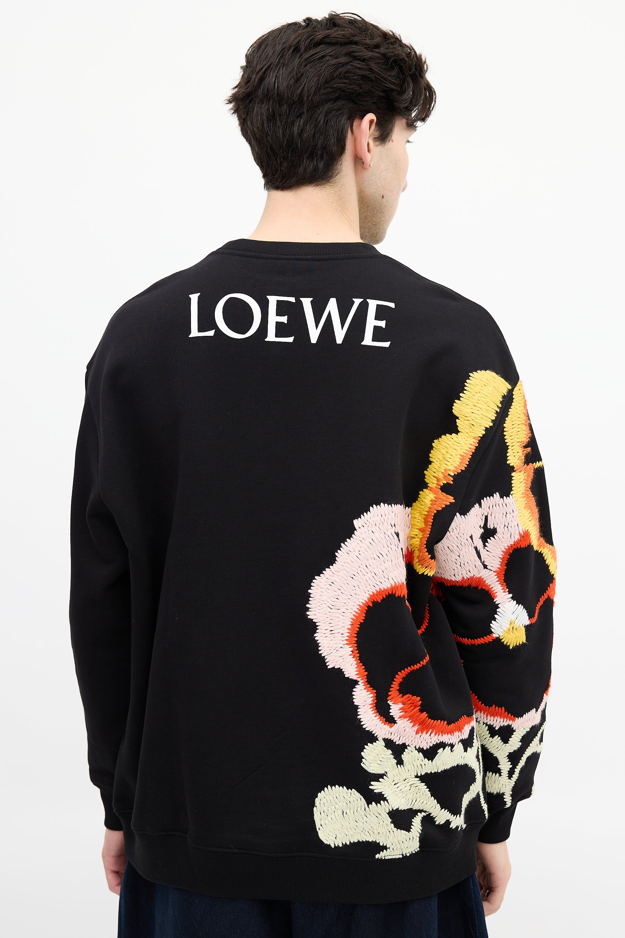 Pre-owned Loewe black sweatshirt featuring a crew neck, multicolour embroidered Pansies motif, printed logo across upper back, and ribbed neck, hem, and cuffs.