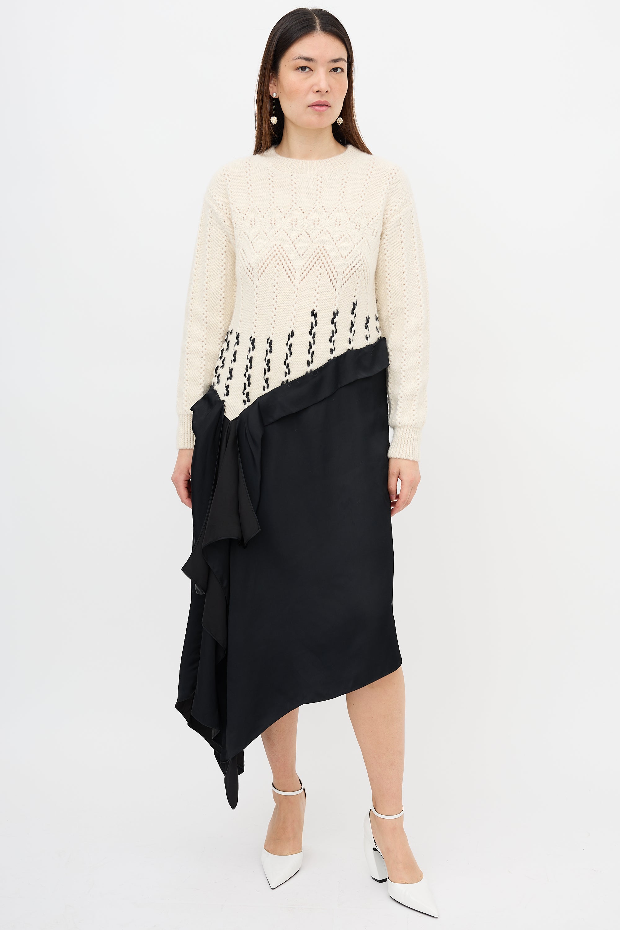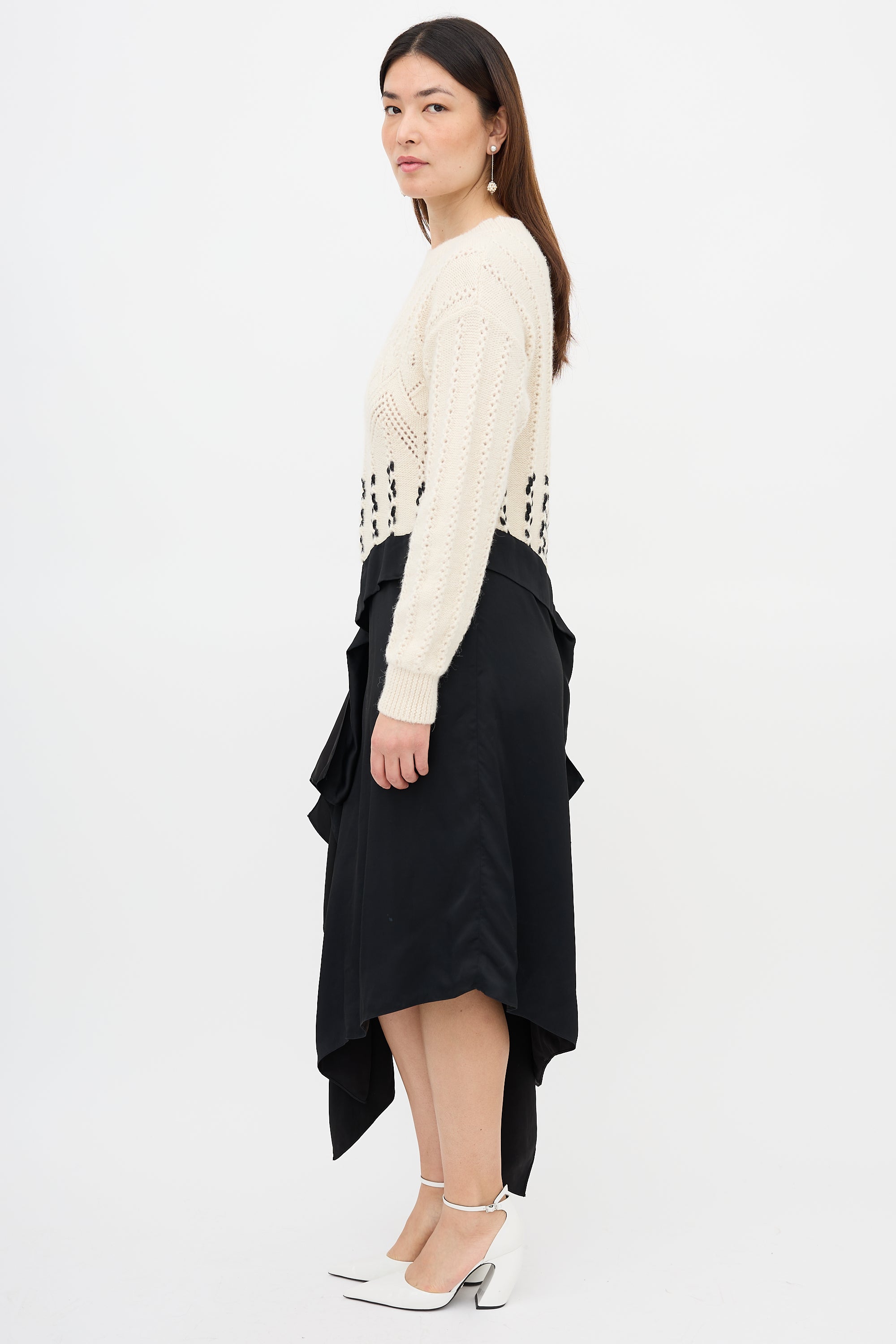 Pre-owned Loewe cream and black long dress featuring a wool cable knit top with a crew neckline, ribbed cuffs, satin skirt with draped styling, and an asymmetrical hem.