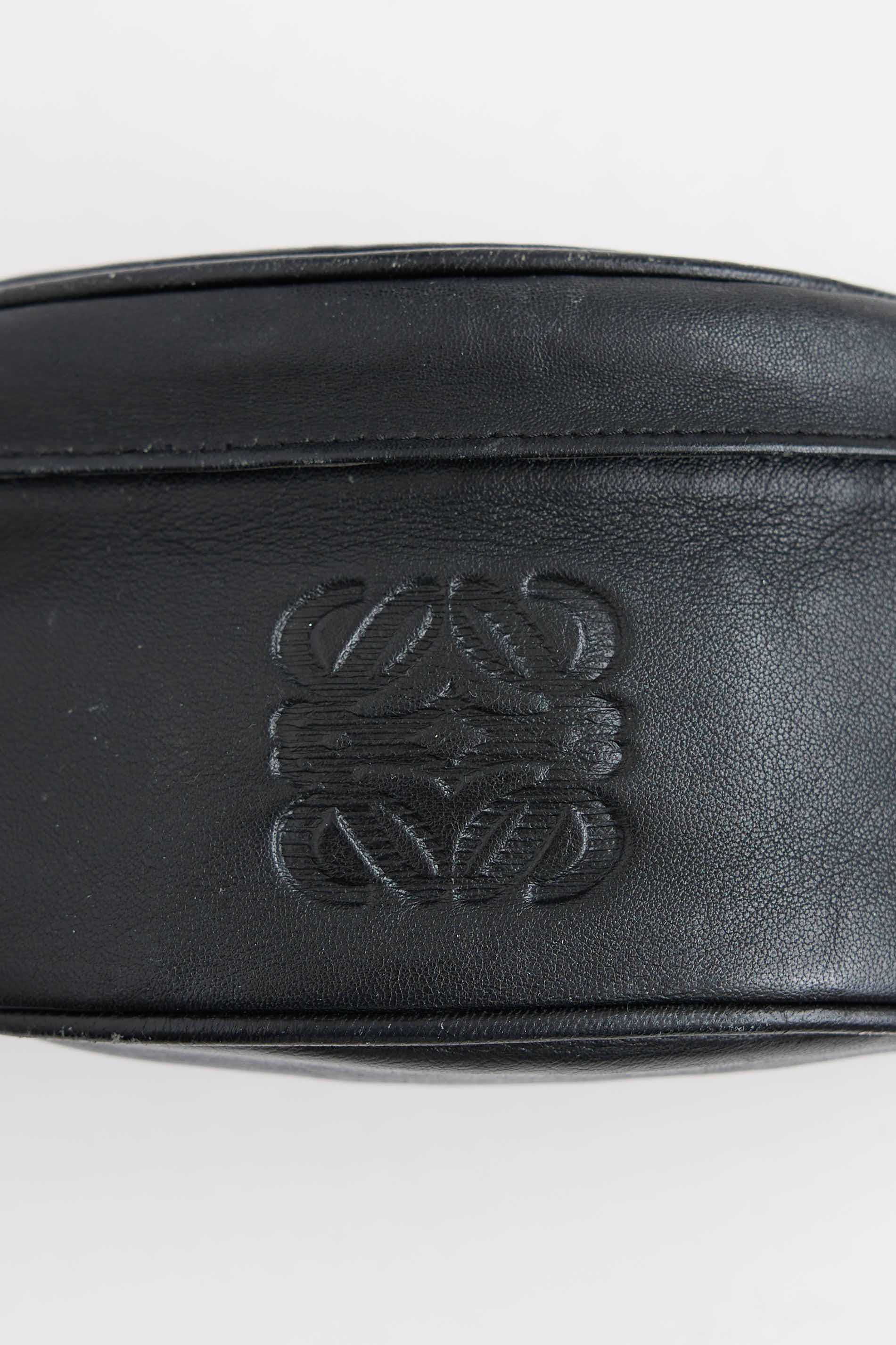 Pre-owned Loewe black leather Anagram belt bag featuring adjustable strap, gold tone hardware, top zip closure, debossed Anagram at front, and top zip closure with one main compartment.