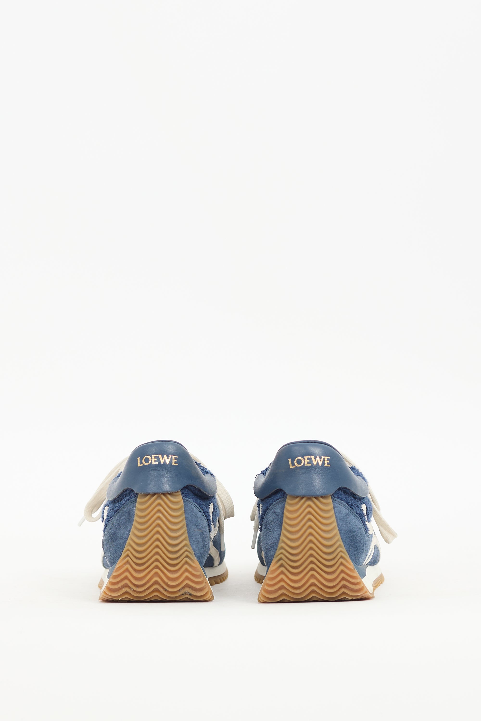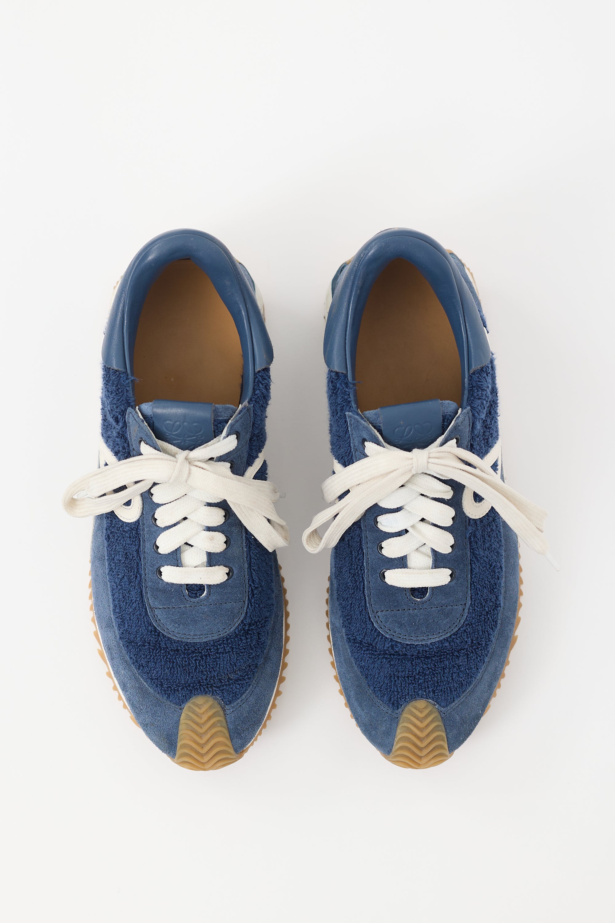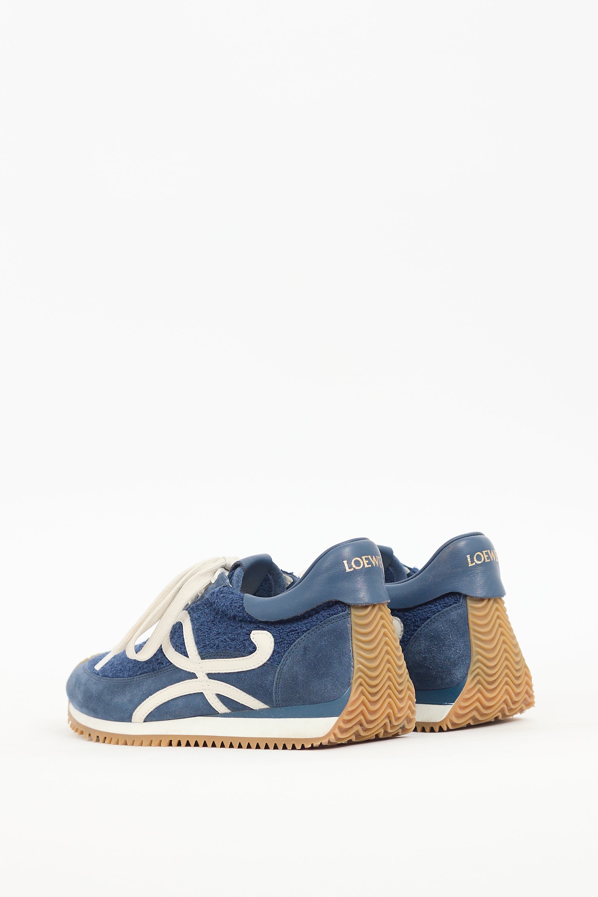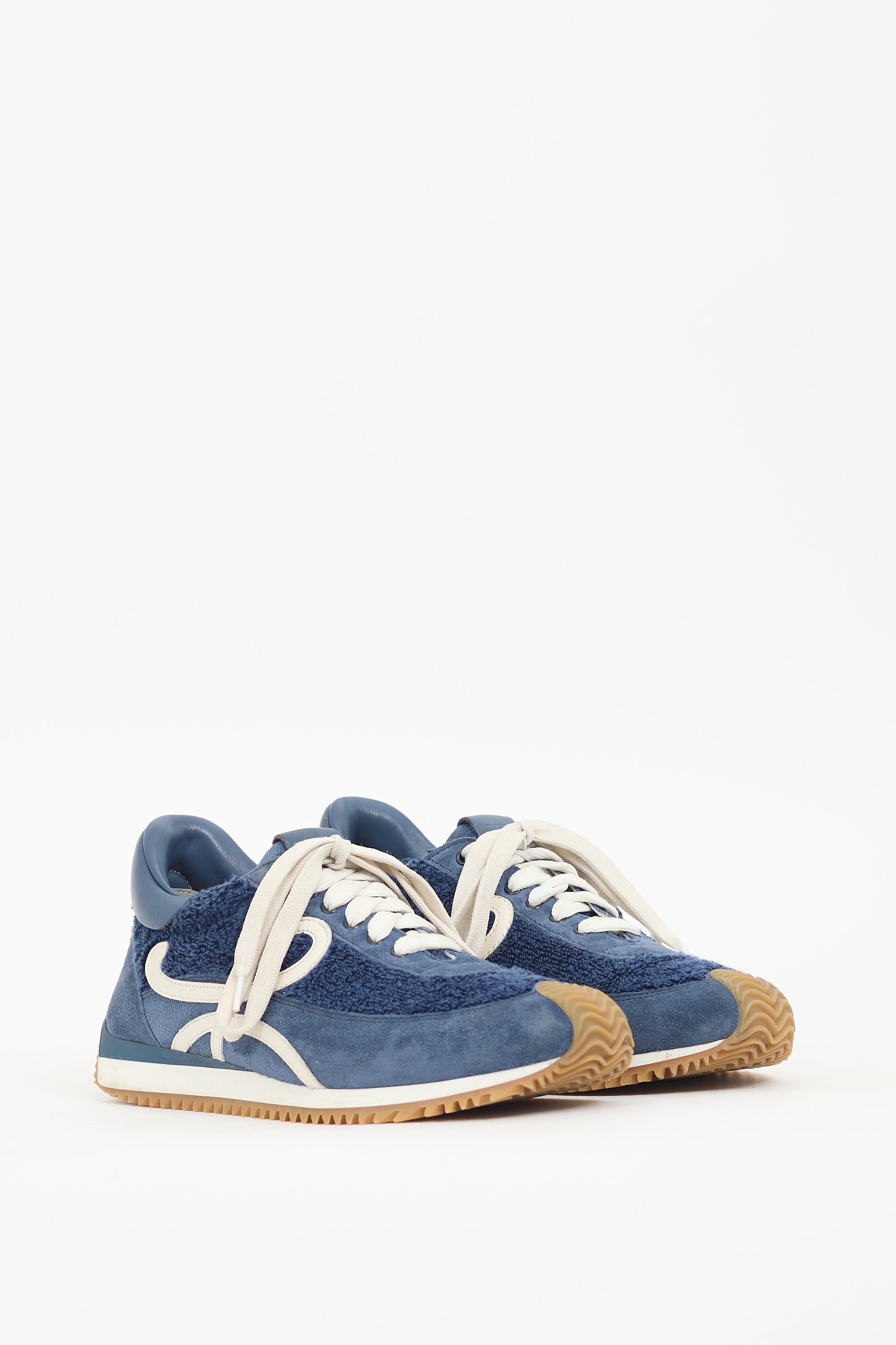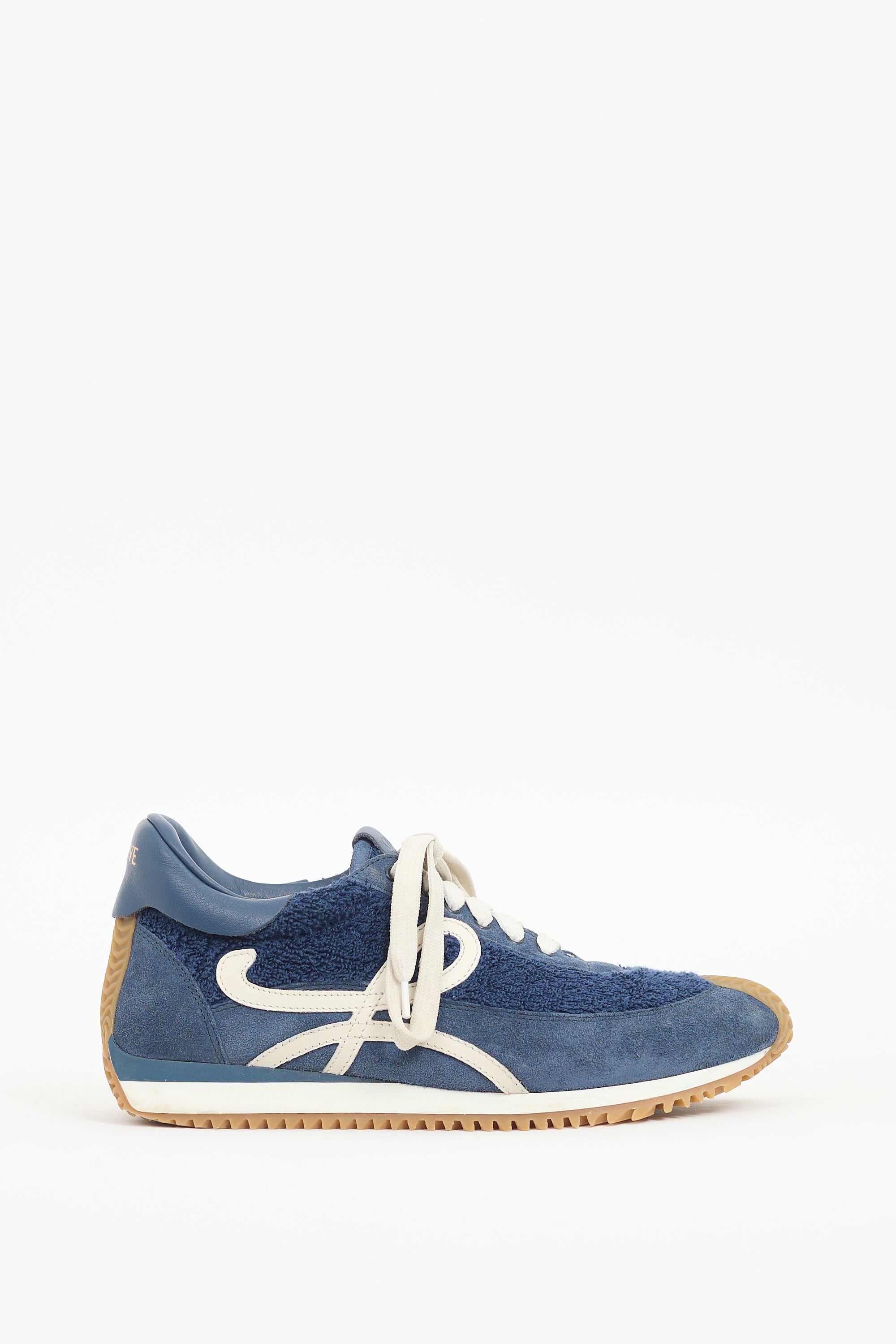 Pre-owned Loewe navy suede and terry cloth Flow sneakers featuring rounded toe, logo embossed sides, lace up front, leather logo patch at tongue, stamped logo at counter, and rubber outsole. Comes with original dust bags.