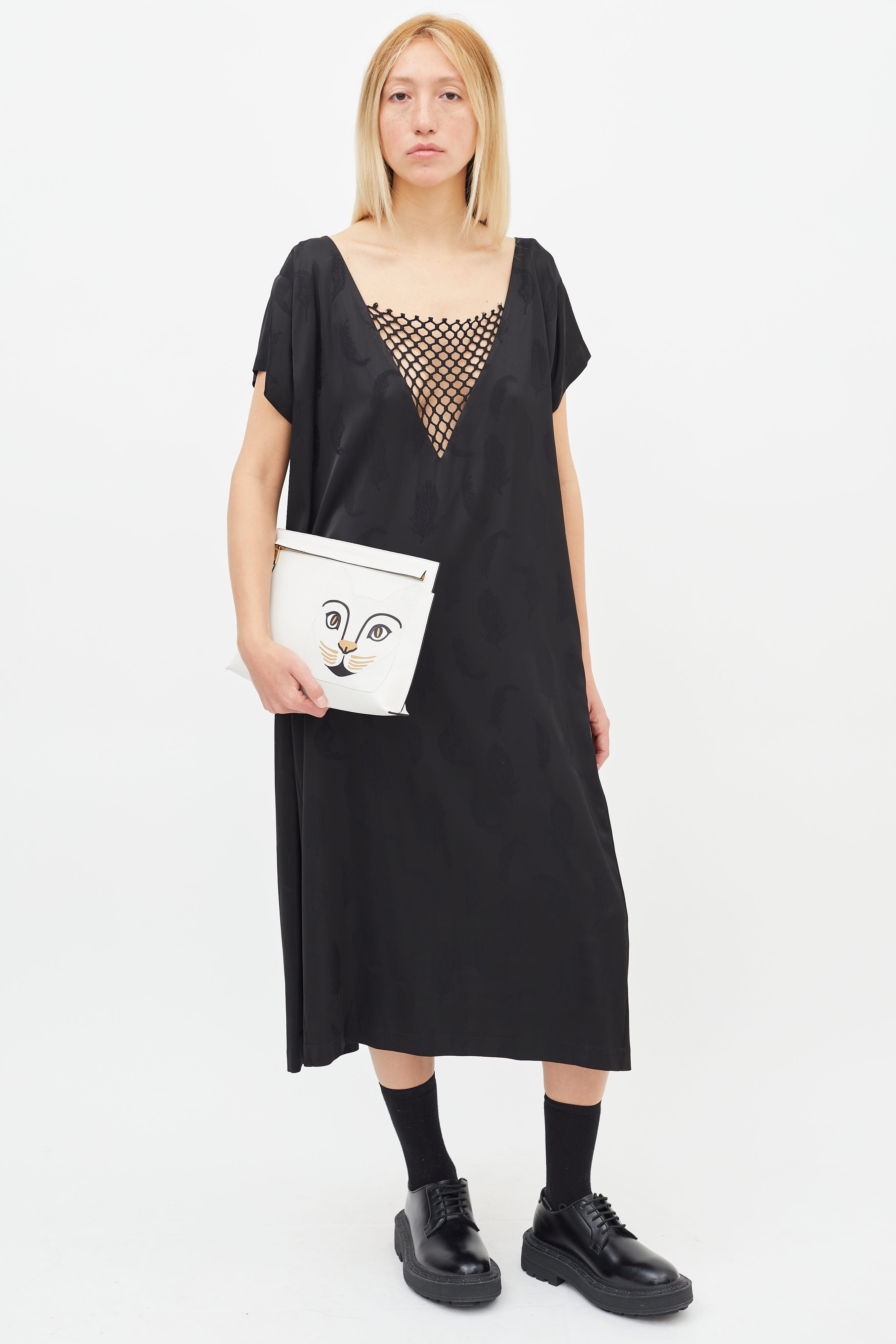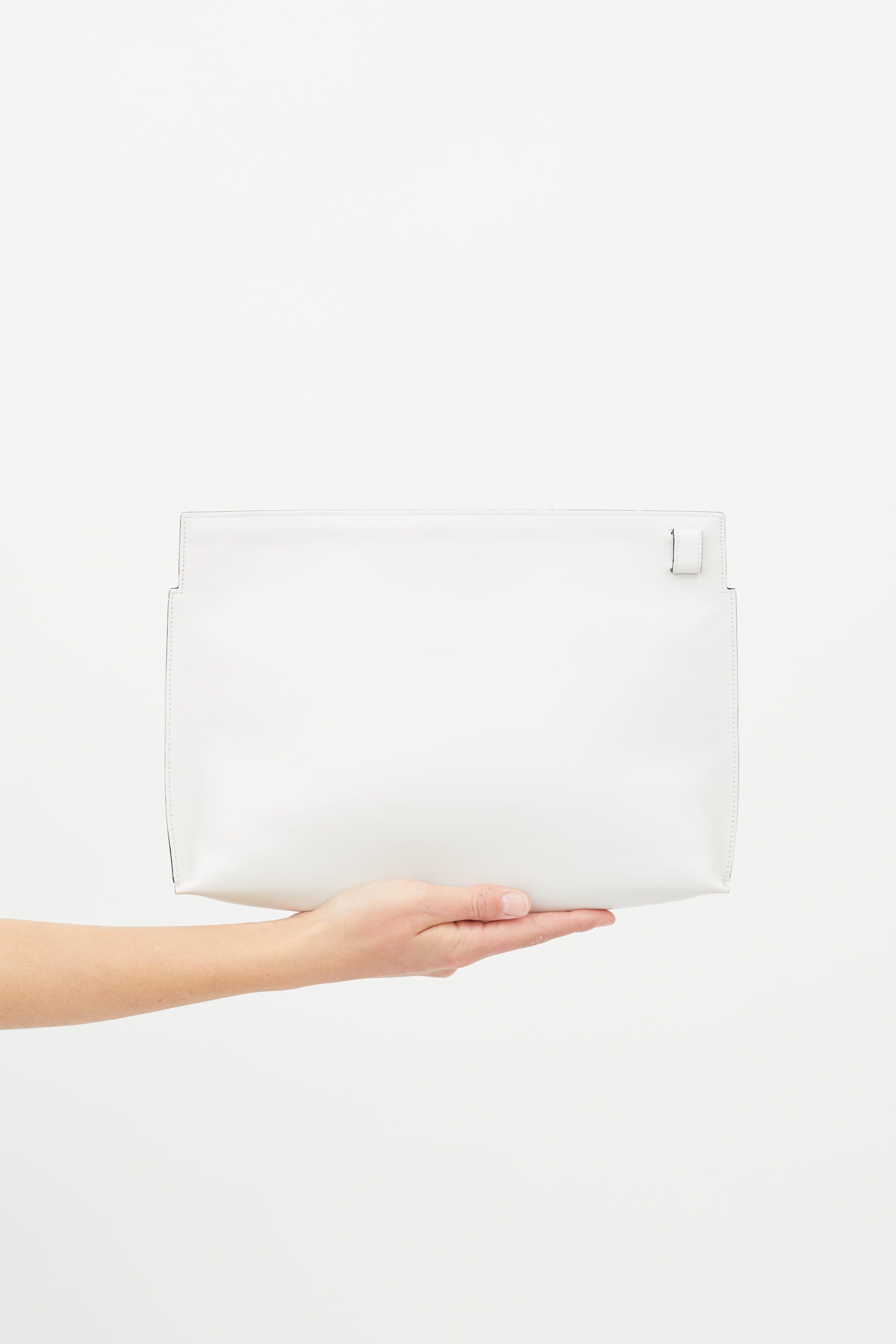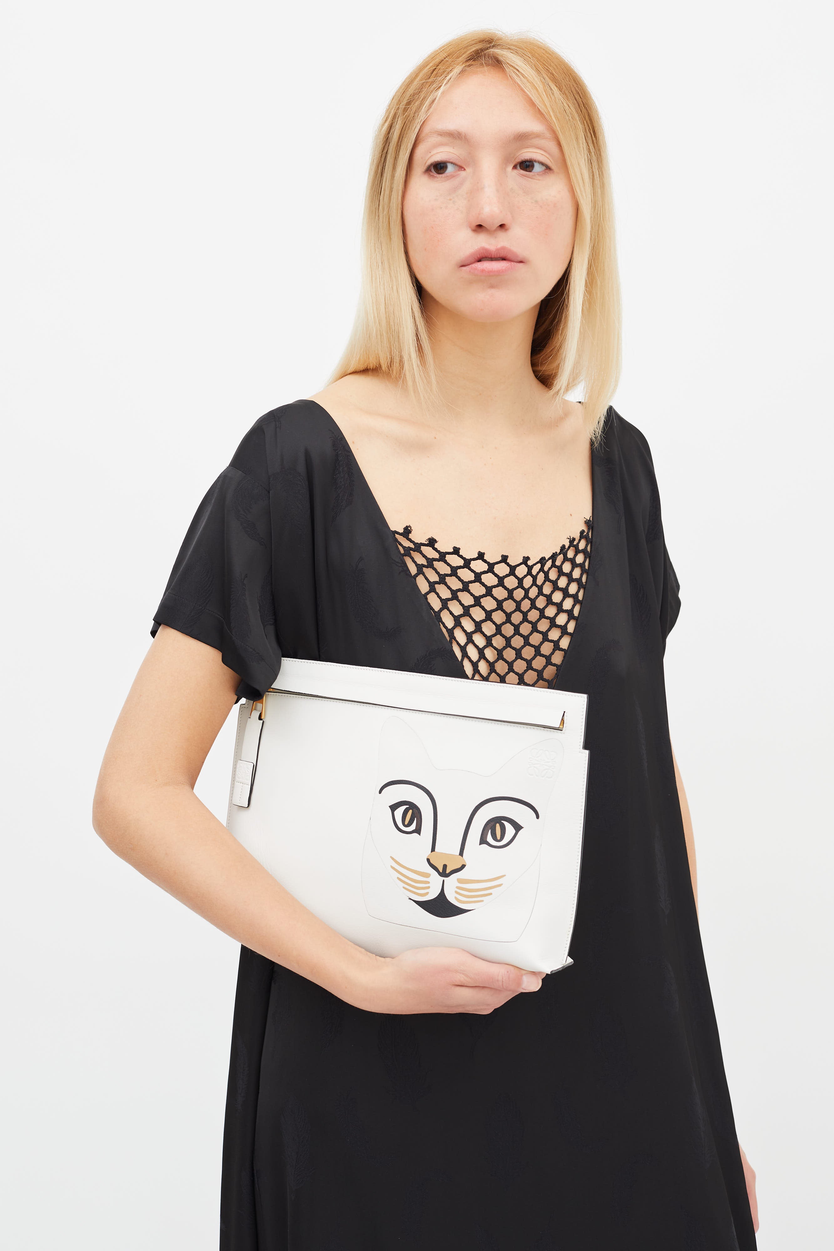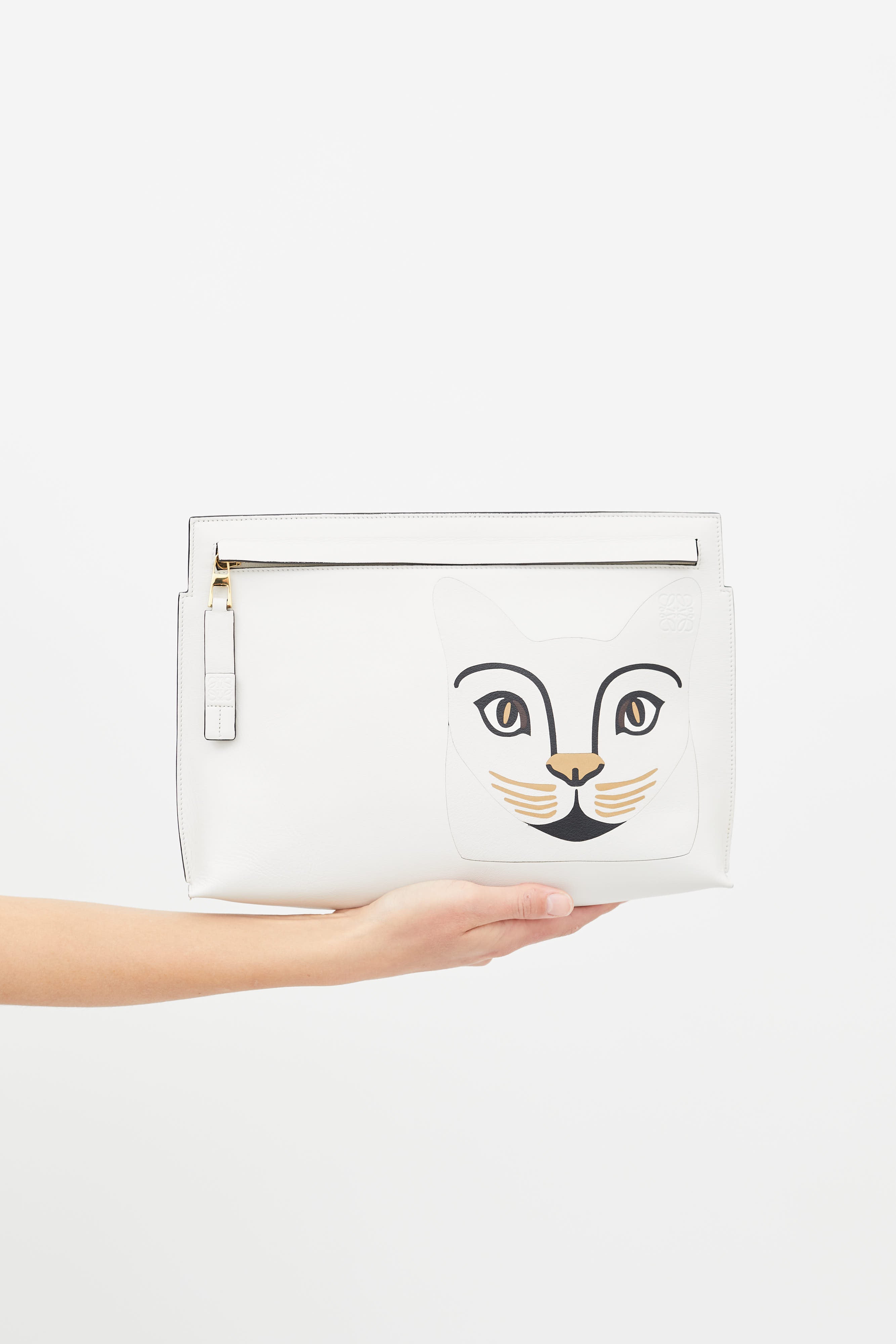 Pre-owned Loewe T Pouch in white featuring gold-tone zip closure, cat print at face, embossed logo at side, lined main compartment, interior slip pocket, and logo leather patch inside.