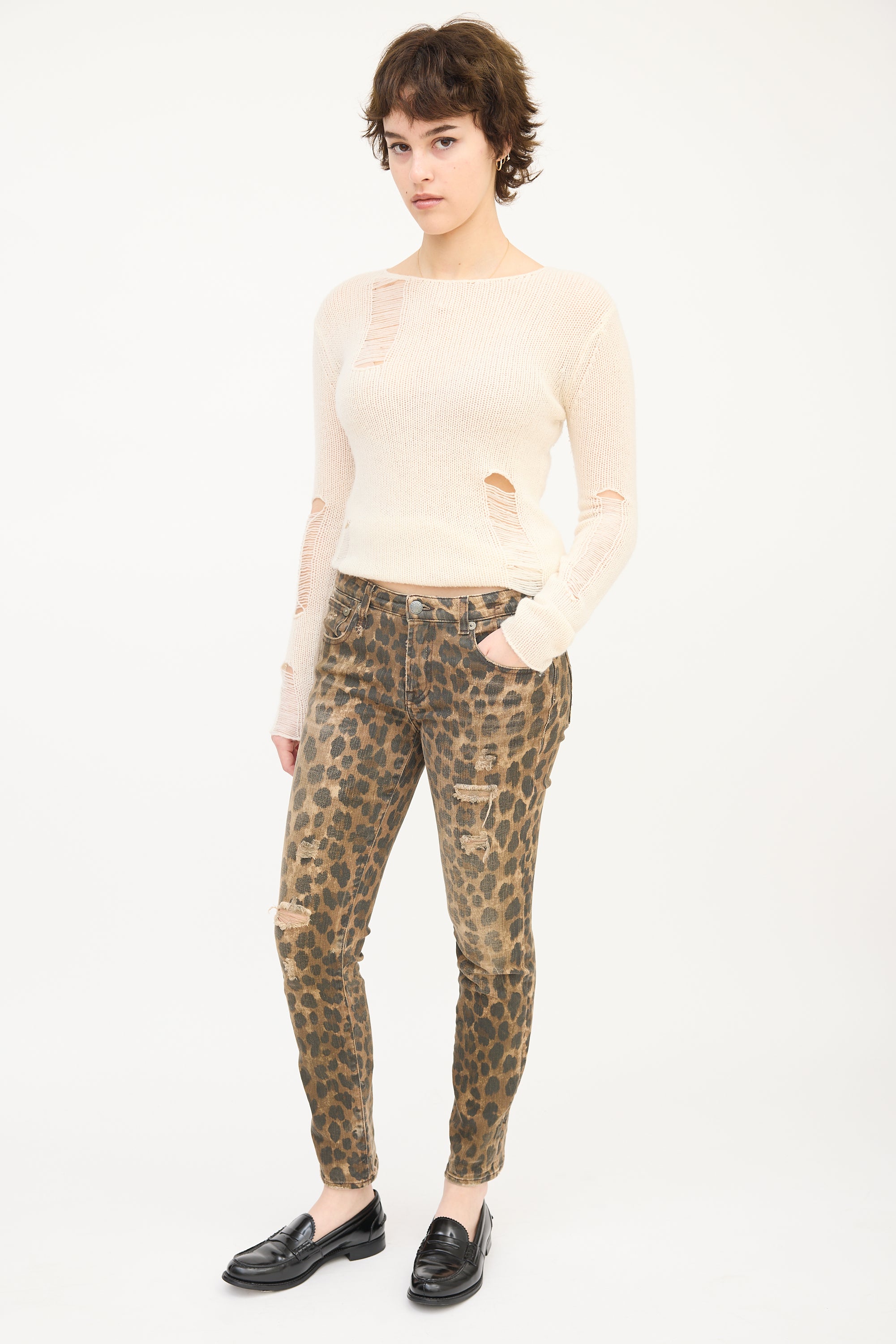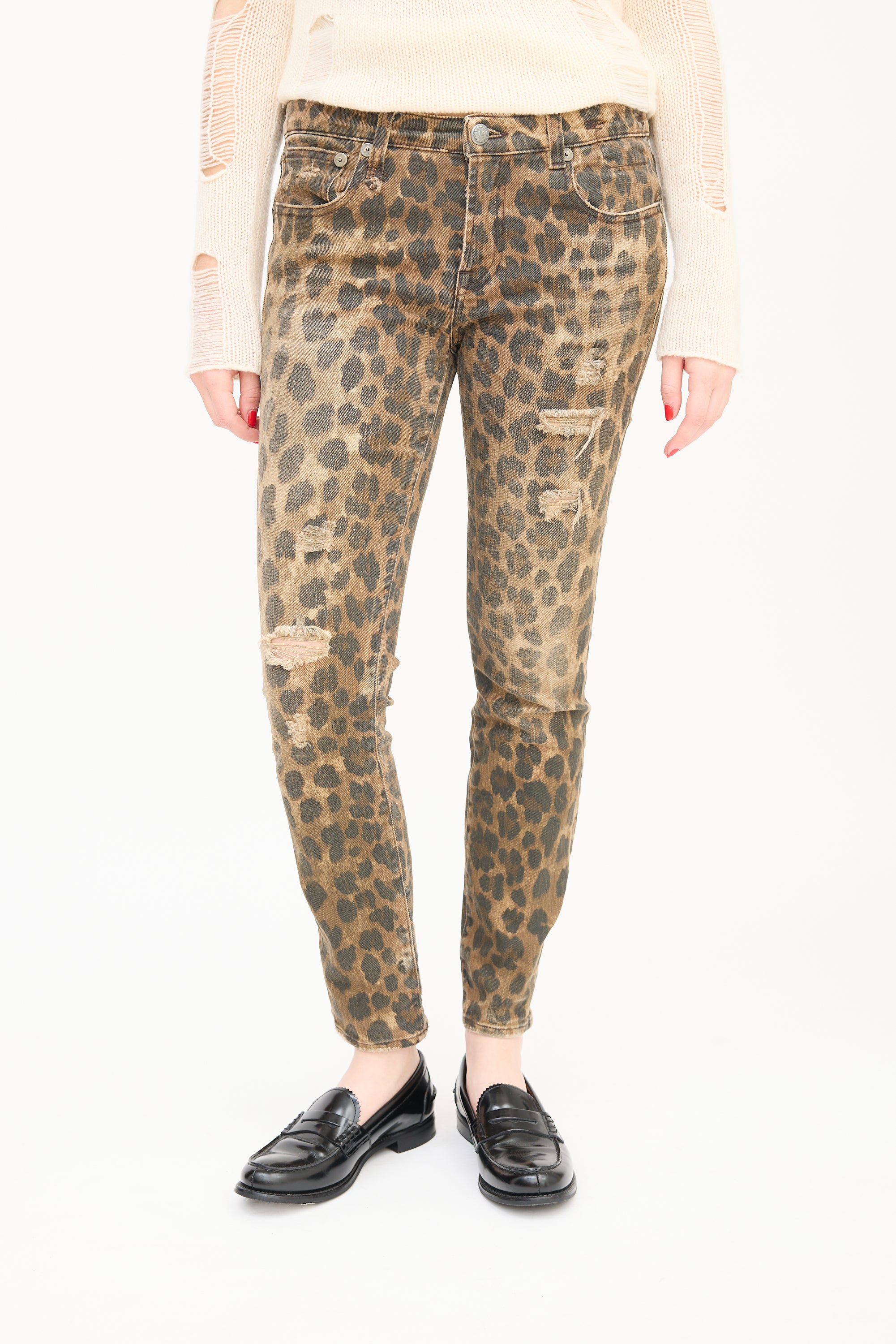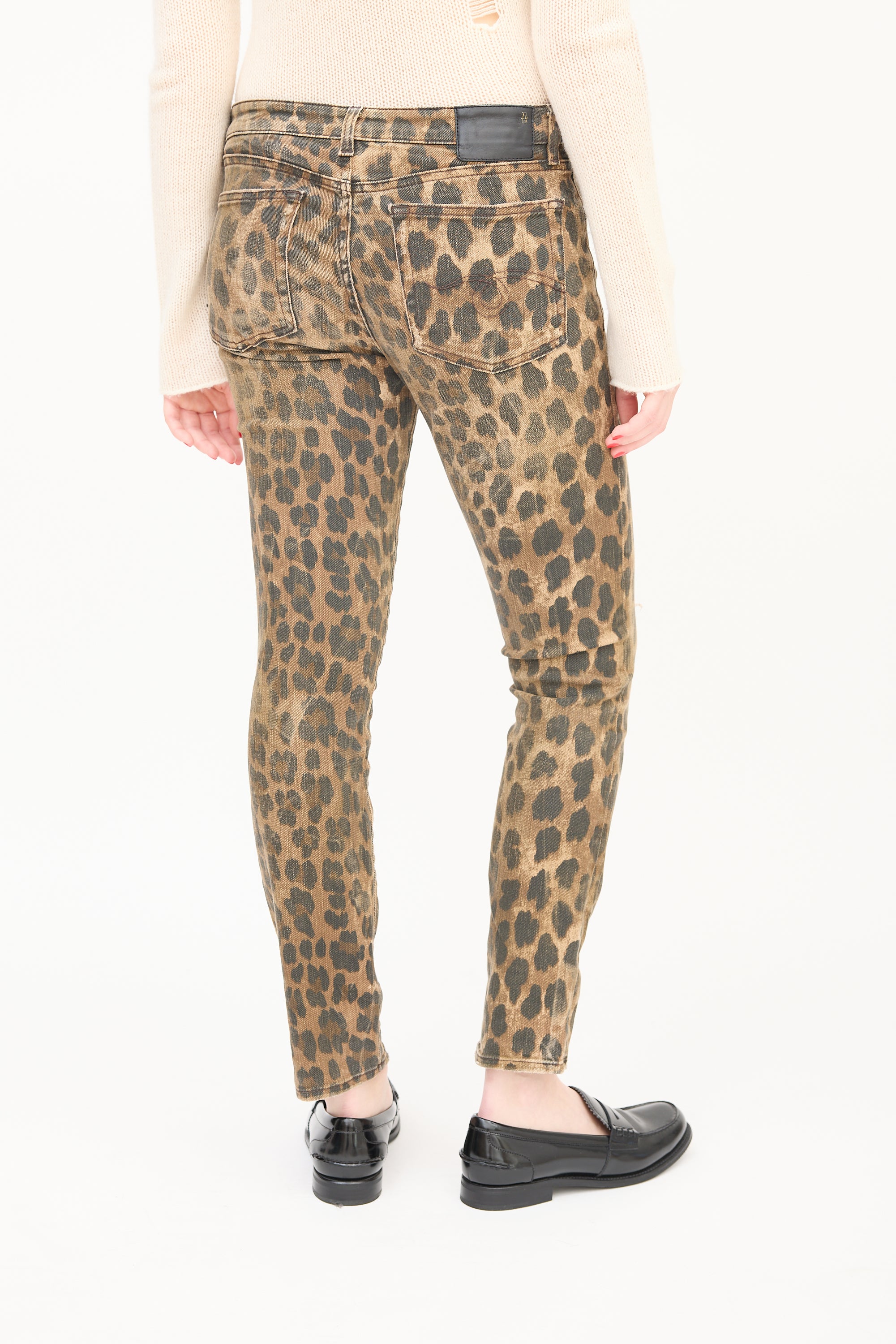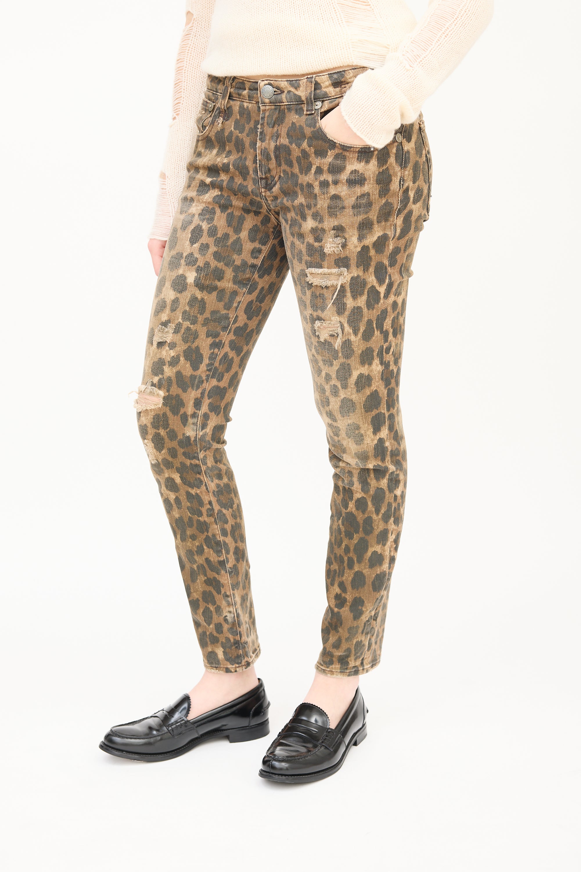 Pre-owned R13 brown and black Kate Skinny jeans featuring a low rise, skinny leg, leopard print and distressing throughout, five pocket styling, black leather Jacron patch, and zip fly.