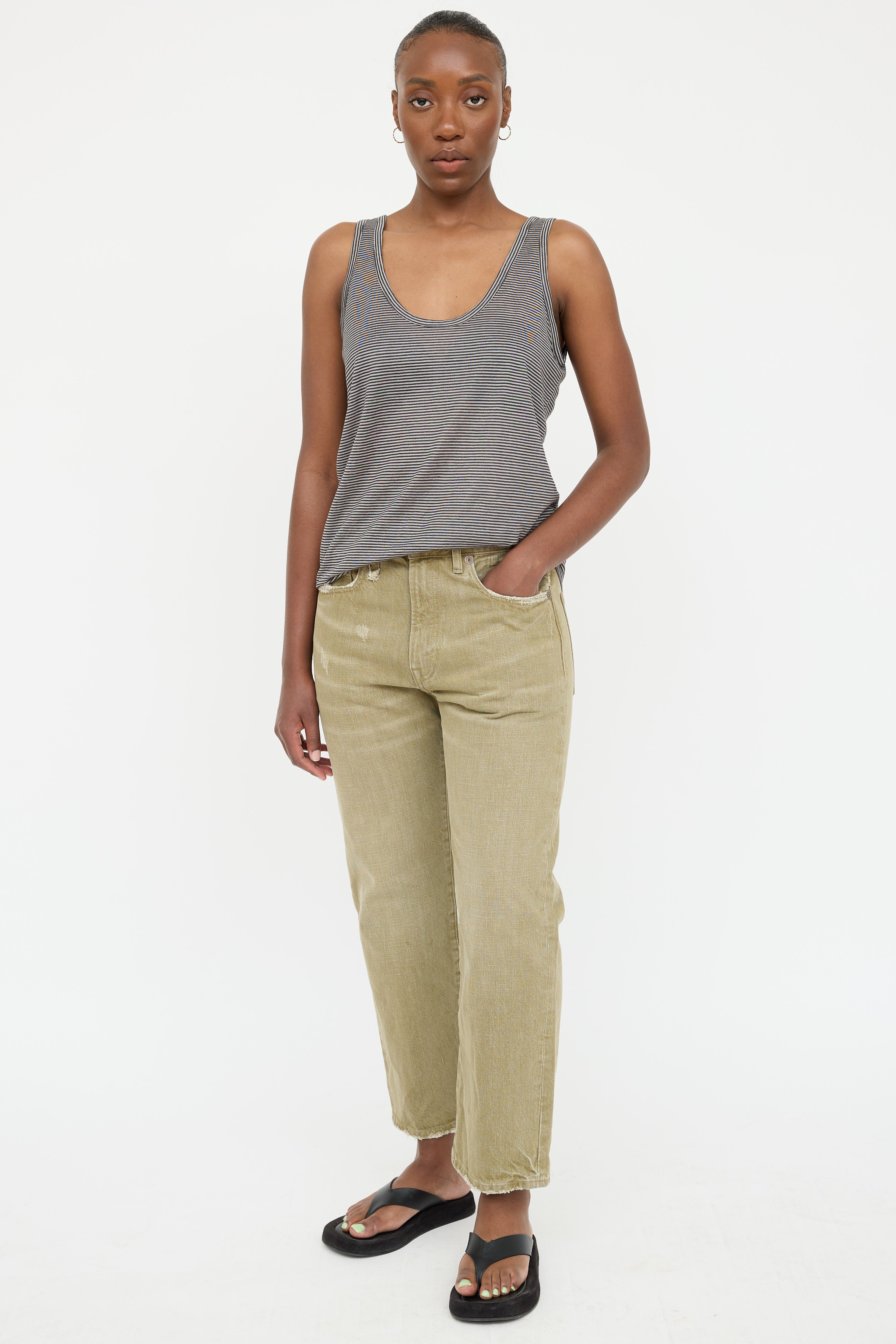 Pre-owned R13 green boyfriend jean featuring button closure, belt loops, five pocket styling, leather logo patch pocket at back, raw hemline and distressing throughout.