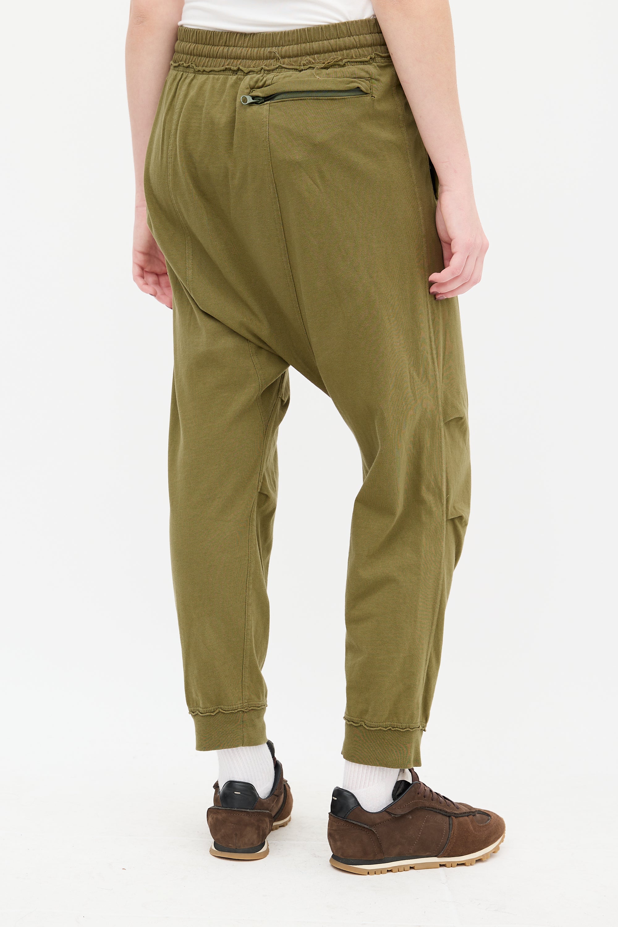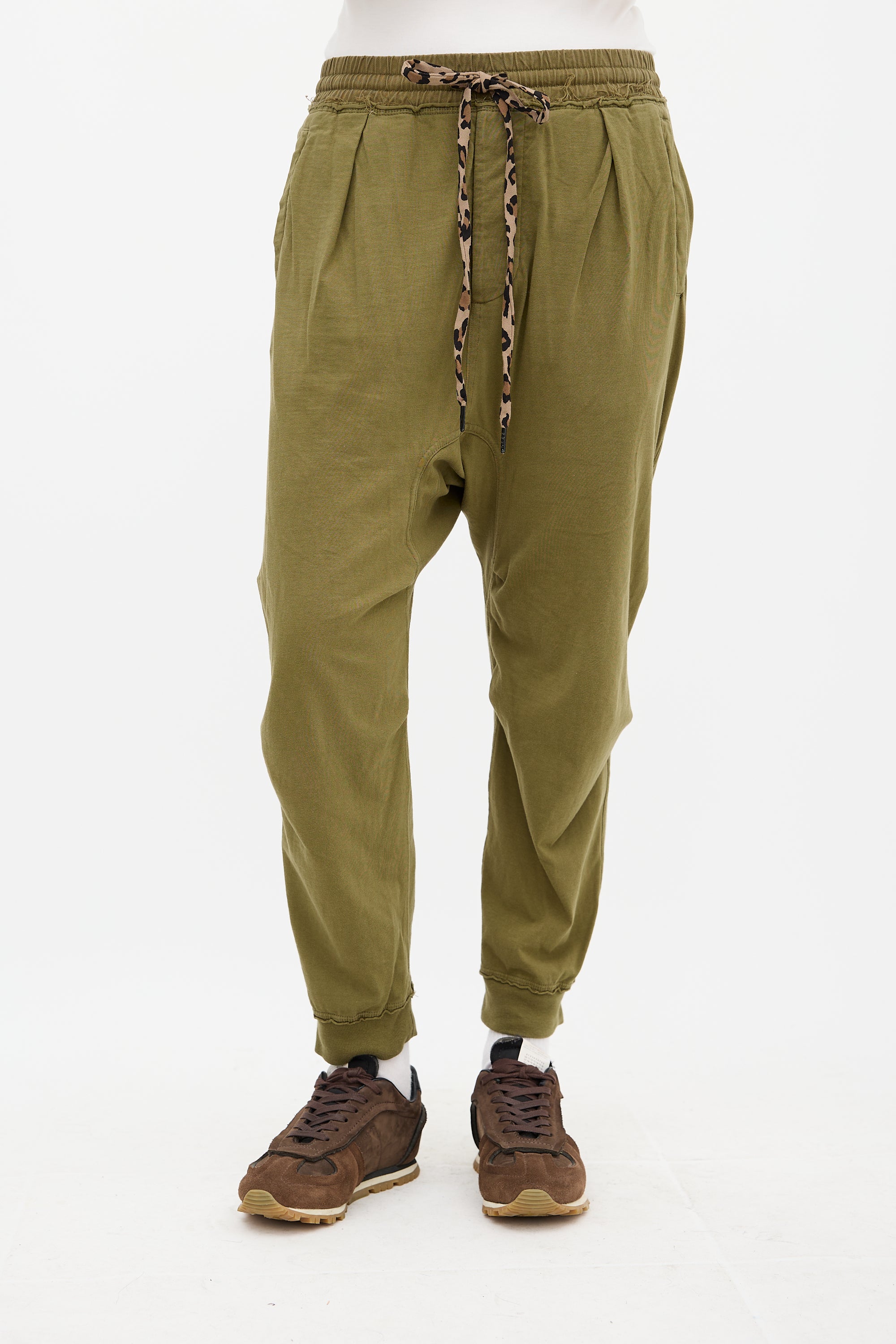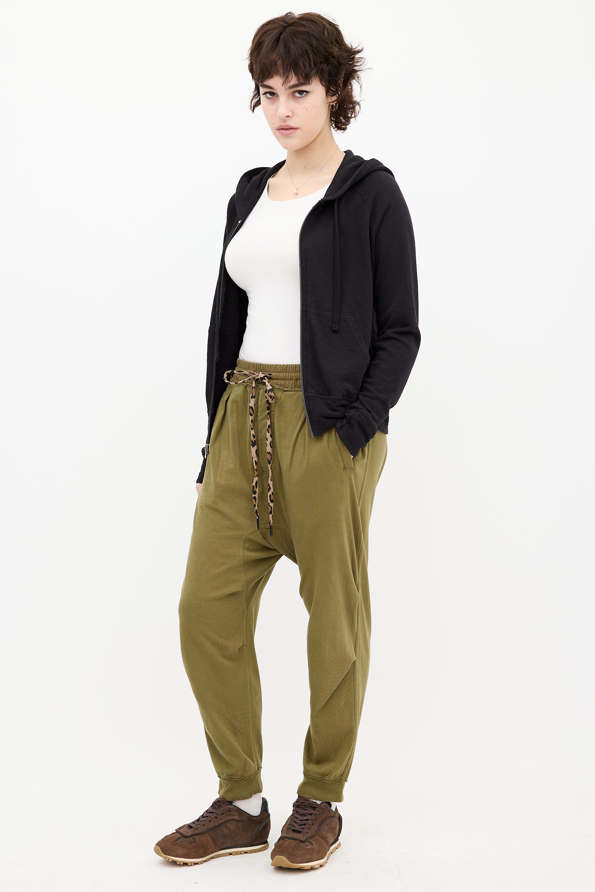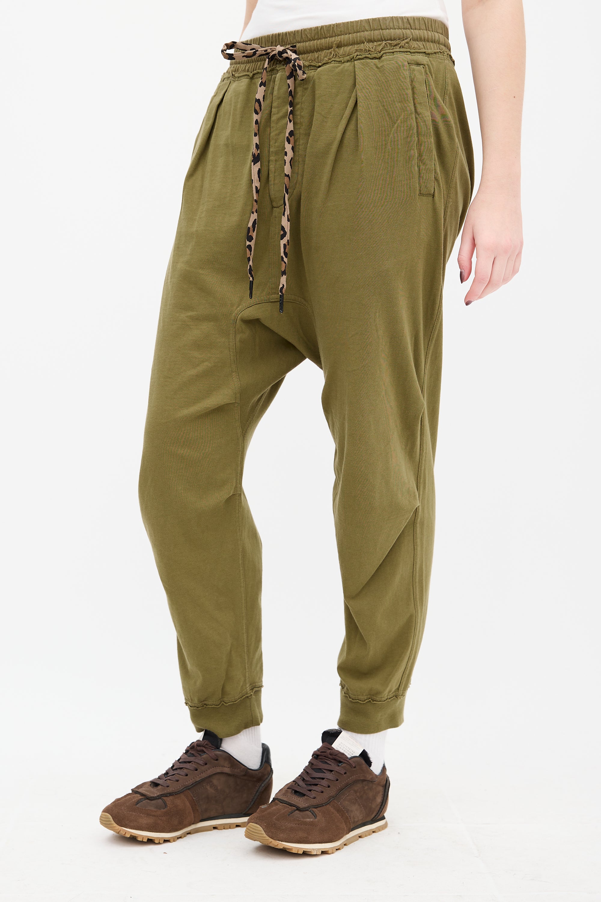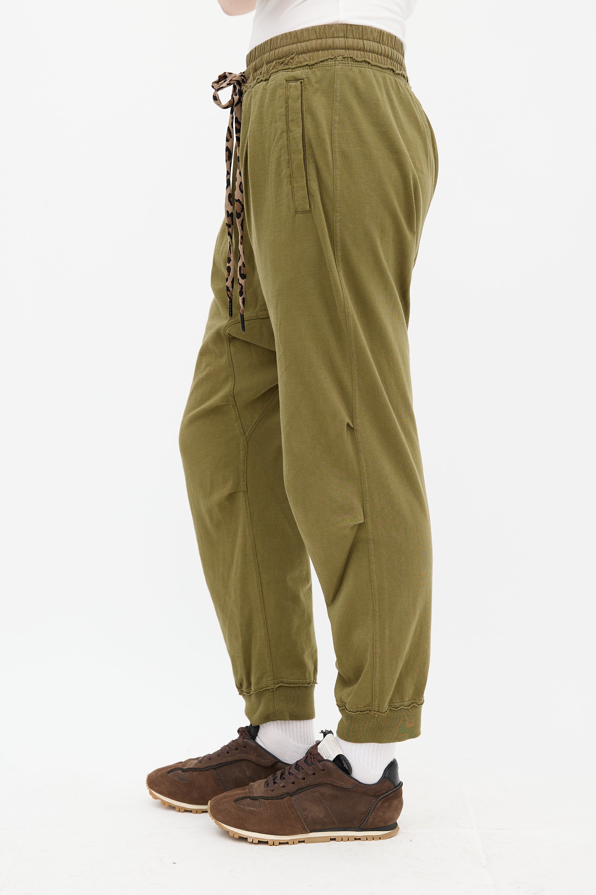 Pre-owned R13 green jogger featuring elasticized waistband with leopard print drawstring, button fly, drop seat with inseam paneling, two slash pockets at hips, one zip pocket at back, tapered crop legs with elasticized cuffs, and distressing throughout.