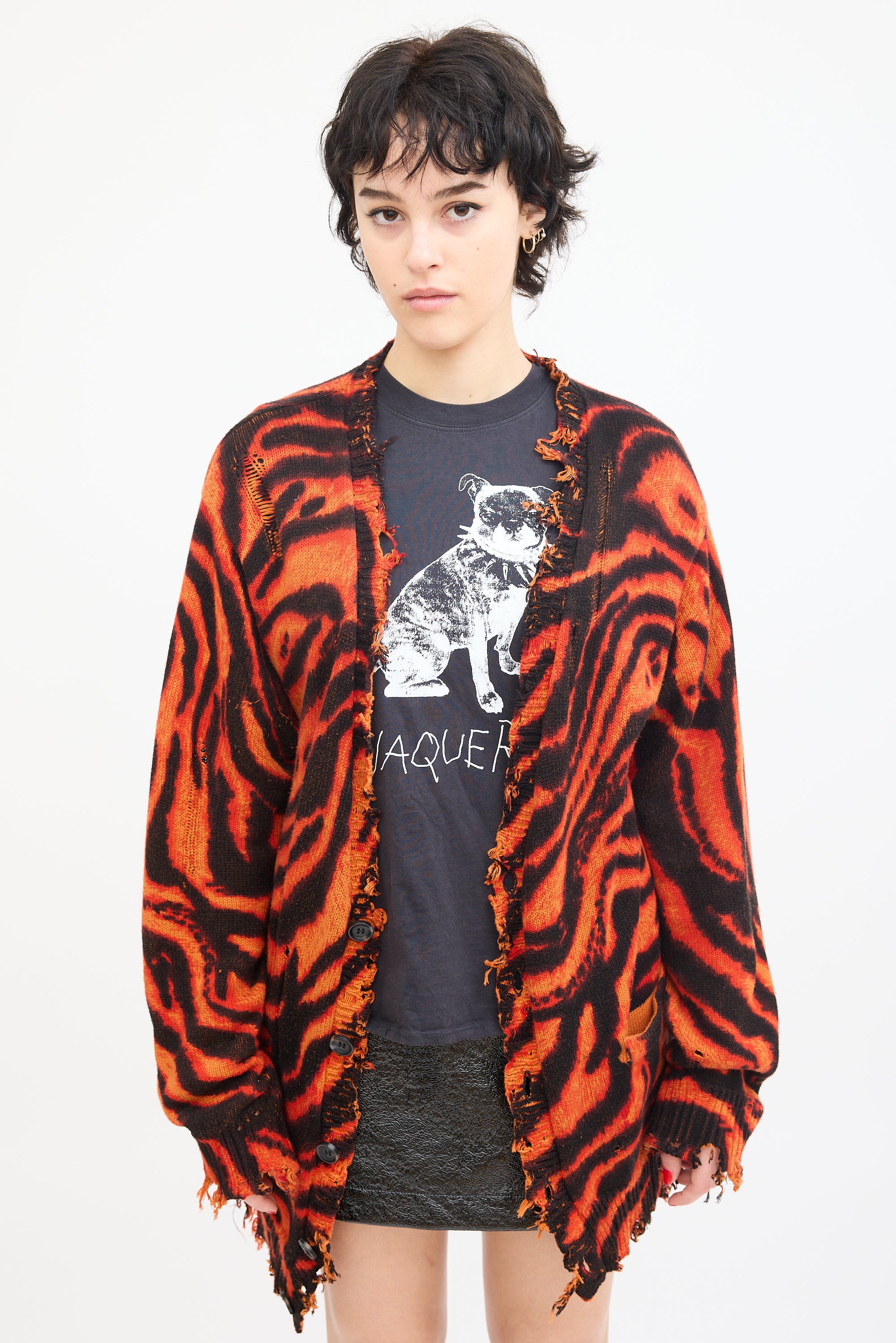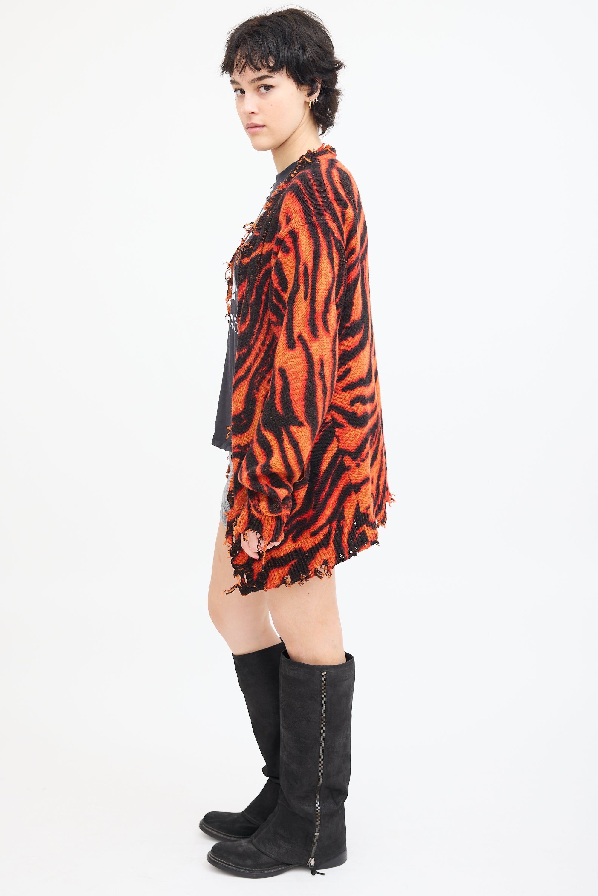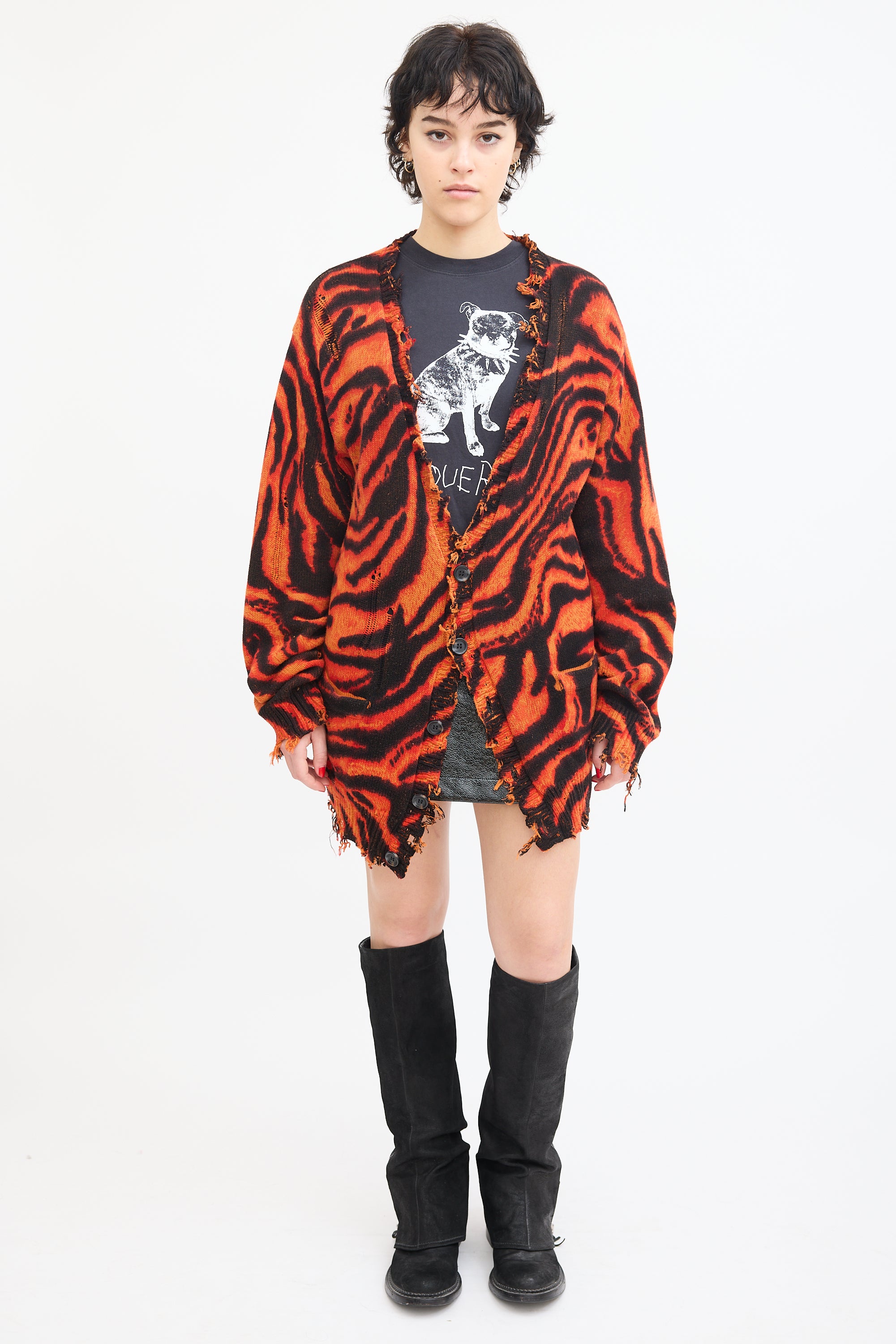 Pre-owned R13 orange and black cardigan featuring V-neckline, button up front, tiger striped print, two front slip pockets, dropped shoulders, long sleeves, intentional distressing throughout, and distressed ribbing trim.